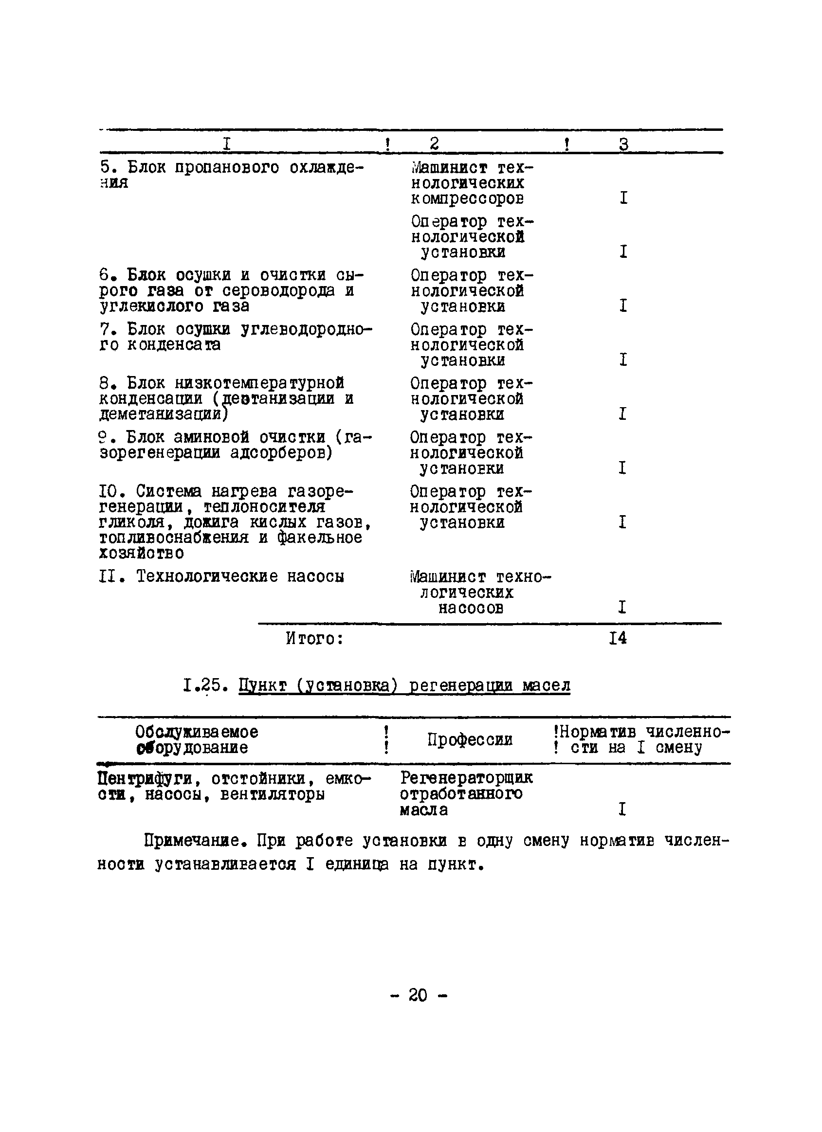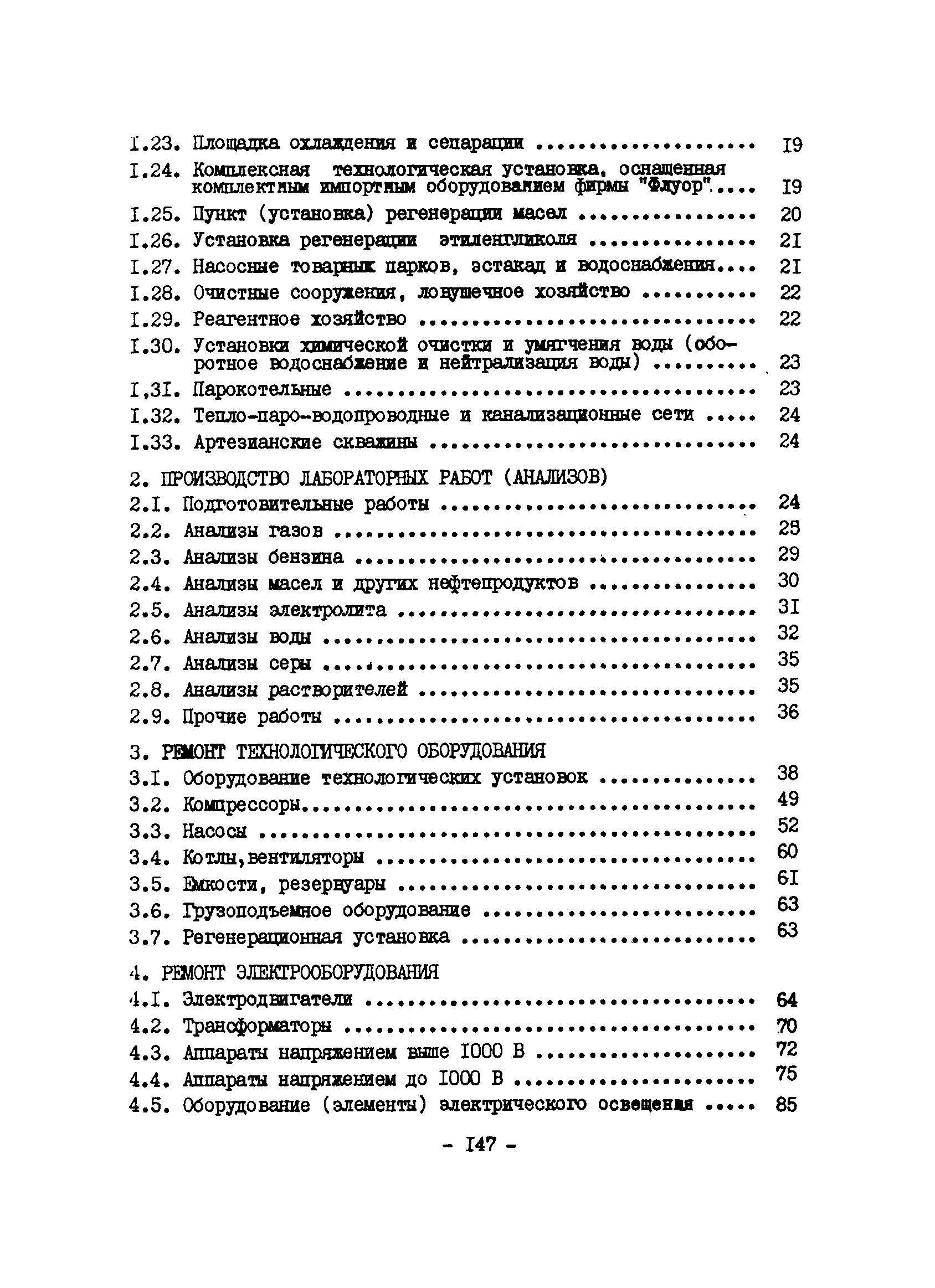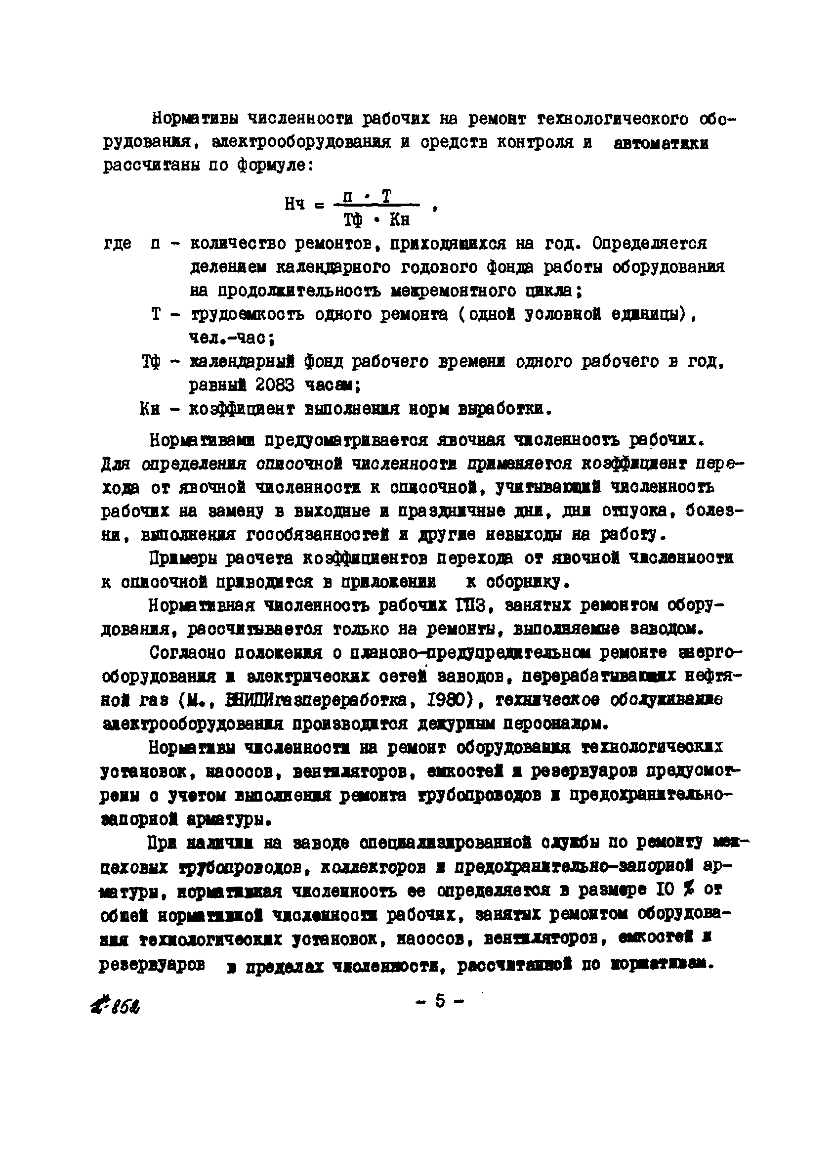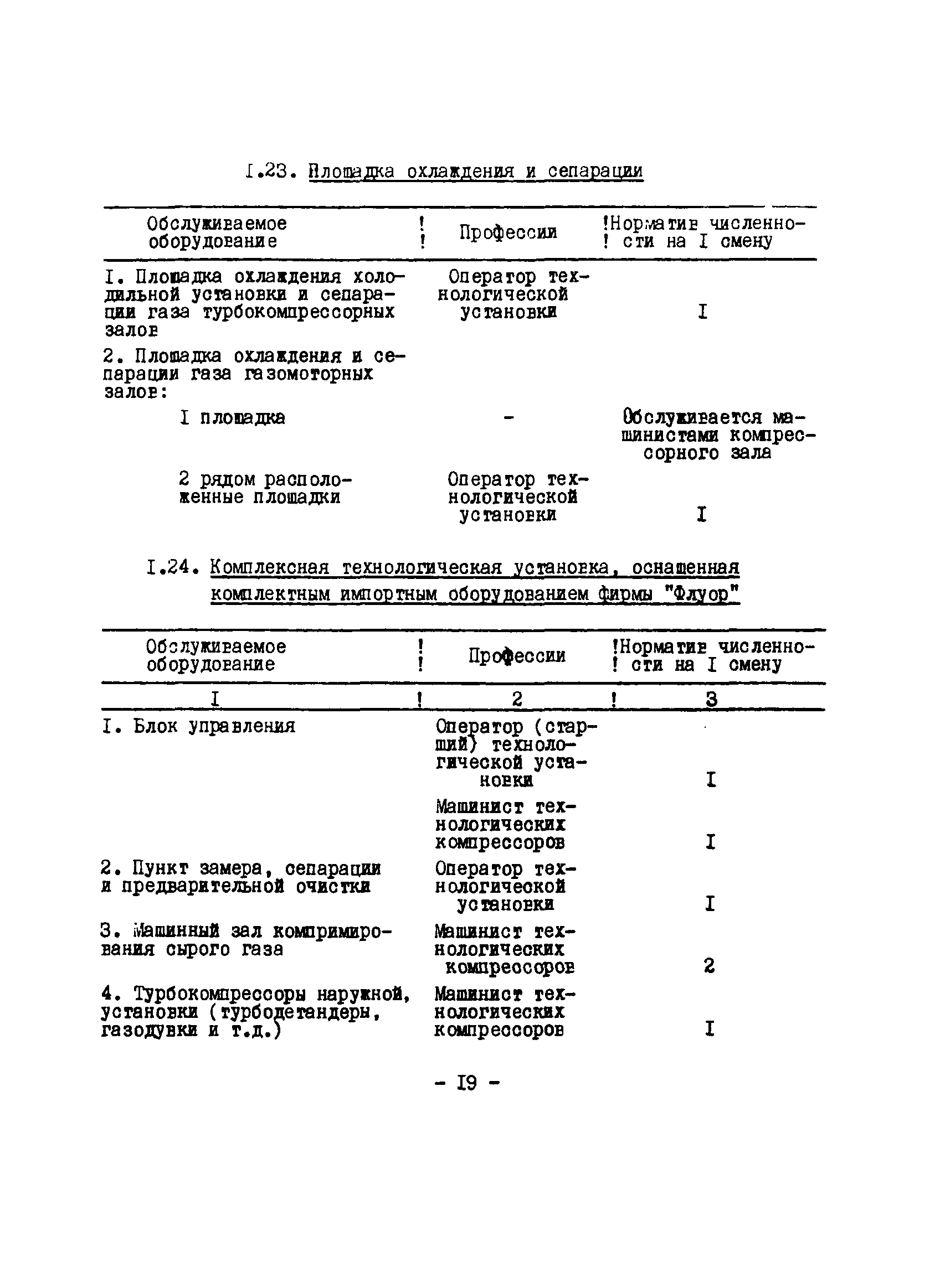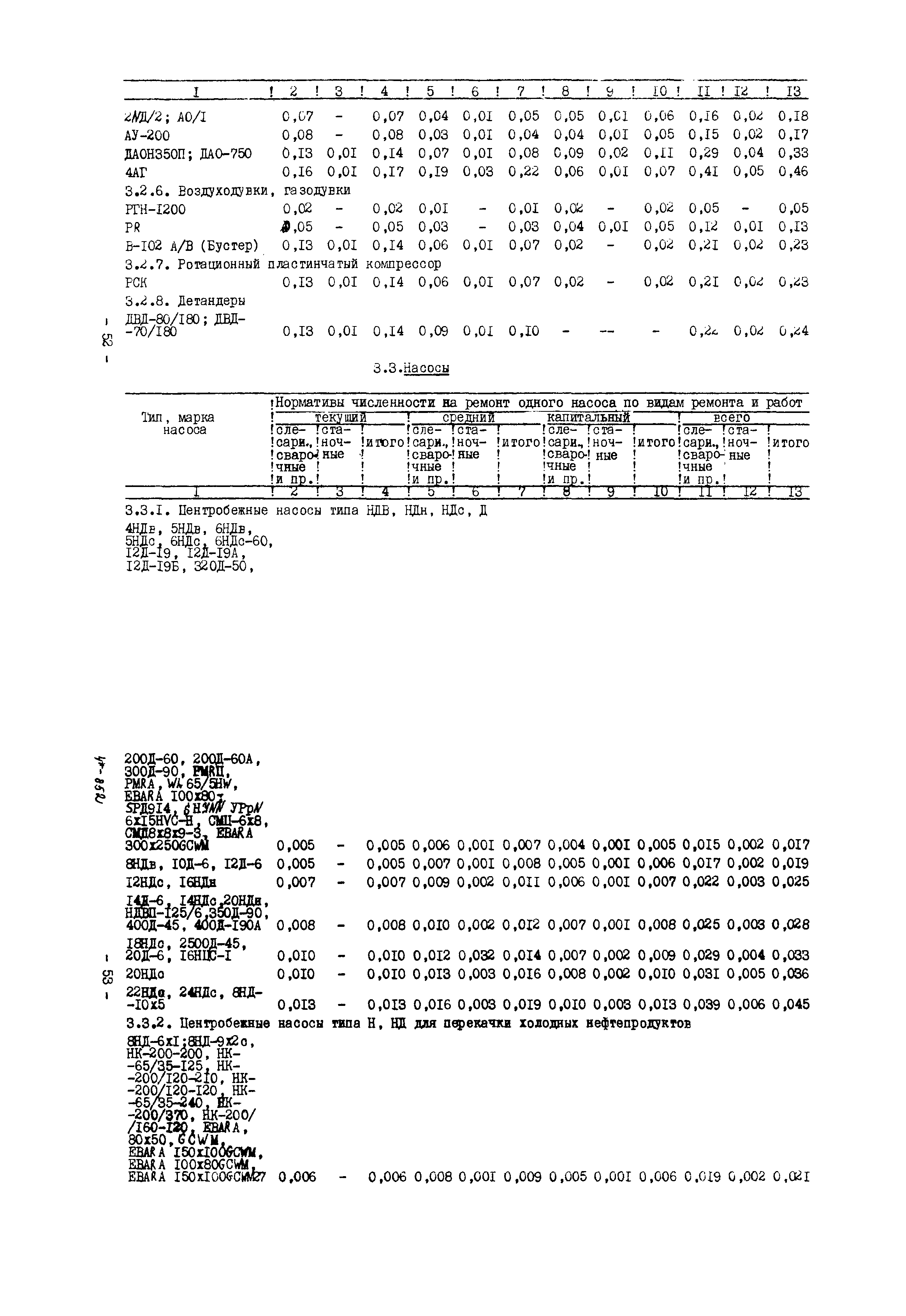 Нормативы численности рабочих газоперерабатывающих заводов нефтяной промышленности| Статус: | не действует | | Название рус.: | Нормативы численности рабочих газоперерабатывающих заводов нефтяной промышленности | | Дата добавления в базу: | 01.09.2013 | | Дата актуализации: | 01.01.2021 | | Область применения: | Нормативы численности предназначены для определения потребной численности и расстановки рабочих по рабочим местам на предприятиях ВПО “Союзнефтегазпереработка” Министерства нефтяной промышленности. | | Оглавление: | Общая часть 1. 0бслуживание технологического и вспомогательного оборудования 1.1. Установка по осушке и очистке газа 1.2. Установка низкотемпературной конденсации и осушке газа 1.3. Установка низкотемпературной конденсации и ректификация газа 1.4.Устаковка деэтанизации газа 1.5. Установка получения этана 1.6. Установка серочистки 1.7. Установка по выработке элементарной серы 1.8. Установка по переработке газового конденсата 1.9. Комбинированная установка комплексной подготовки нефти и газа 1.10. Маслоабсорбционная установка (МАУ) 1.11. Газофракционирующая установка (ГФУ) 1.12. Абсорбционно-газофракционирующая установка (АГФУ) 1.13.Уставовка по выработке гелия 1.14. Пропано-холодильная установка 1.15. Холодильная установка каскадного типа 1.16. Азотно-кислородная установка, станция 1.17. Аммиачно-холодильная установка 1.18. Установка получения пентана 1.19. Газораспределительные и газозамерные пункты 1.20. Товарные и сырьевые парки 1.21. Сливно-наливная эстакада 1.22. Компрессорные 1.23. Площадка охлаждения и сепарации 1.24. Комплексная технологическая установка, оснащенная комплексным импортным оборудованием фирмы «Флуор» 1.25. Пункт (установка) регенерации масел 1.26. Установка регенерации этиленгликоля 1.27. Насосные товарных парков, эстакад и водоснабжения 1.28. Очистные сооружения, ловушечное хозяйство 1.29. Реагентное хозяйство 1.30. Установки химической очистки и умягчение воды (оборотное водоснабжение и нейтрализация воды) 1.31. Парокотельные 1.32. Тепло-паро-водопроводные и канализационные сети 1.33. Артезианские скважины 2. Производство лабораторных работ (анализов) 2.1. Подготовительные работы 2.2. Анализы газов 2.3. Анализы бензина 2.4. Анализы масел и других нефтепродуктов 2.5. Анализы электролита 2.6. Анализы воды 2.7. Анализы серы 2.8. Анализы растворителей 2.9. Прочие работы 3 Ремонт технологического оборудования 3.1. Оборудование технологических установок 3.2. Компрессоры 3.3. Насосы 3.4. Котлы, вентиляторы 3.5. Емкости, резервуары 3.6. Грузоподъемное оборудование 3.7.Регенерационная установка 4 Ремонт оборудования 4.1. Электродвигатели 4.2. Трансформаторы 4.3. Аппараты напряжением выше 1000 В 4.4. Аппараты напряжением до 1000 В 4.5. Оборудование (элементы) электрического освещения 4.6. Электротехнологическое оборудование 4.7. Установки конденсаторные 4.8. Батареи аккумуляторные 4.9. Релейная защита, электроавтоматика и вторичные цепи 4.10. Электрические сети 4.11. Заземляющие устройства 4.12. Испытание защитных средств 4.13. Обслуживание электрооборудования технологических установок и объектов 5. Обслуживание и ремонт средств контроля и автоматики 5.1. Приборы системы «АУС» и «СТАРТ» 5.2. Приборы для измерения температуры 5.3. Приборы расхода и уровня, диафрагмы, регуляторы 5.4. Приборы для измерения давления, регуляторы давления 5.5. Приборы качества, газосигнализаторы 5.6. Исполнительные мех