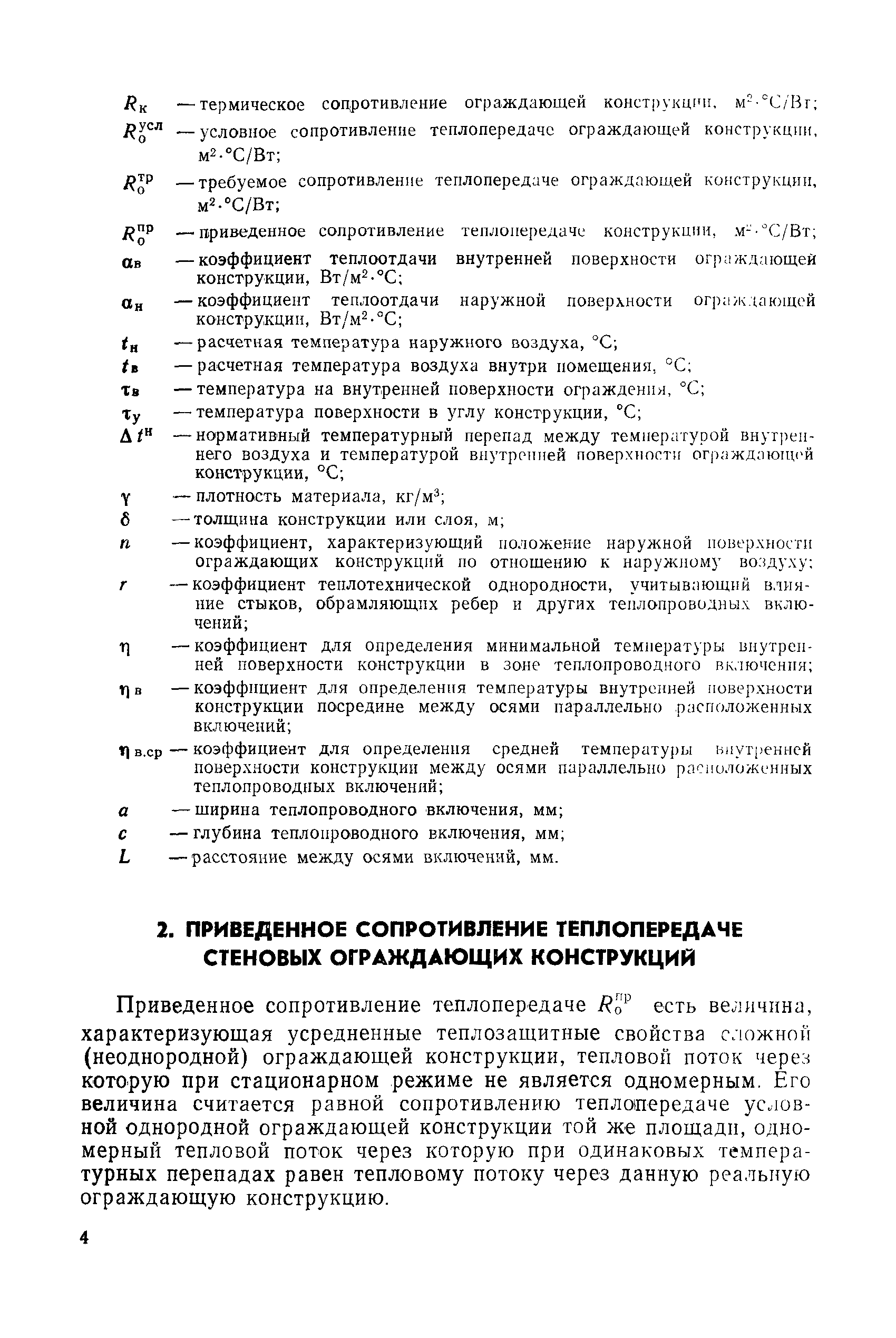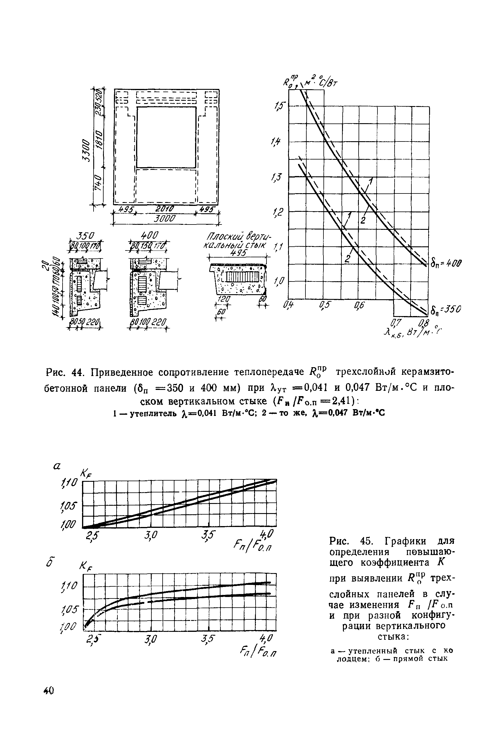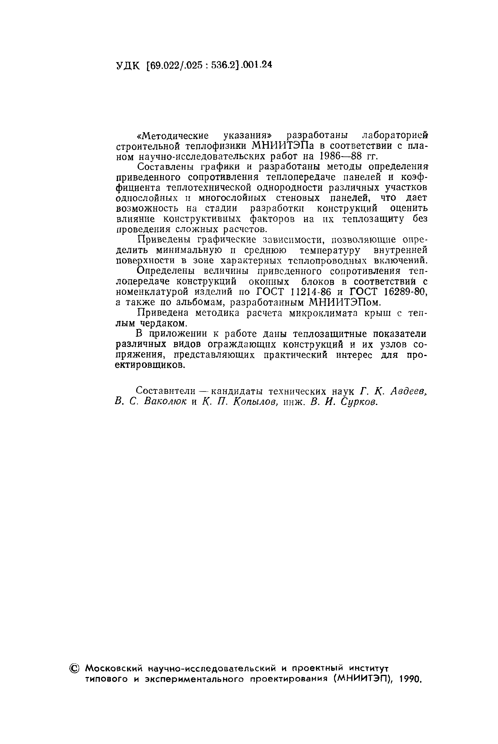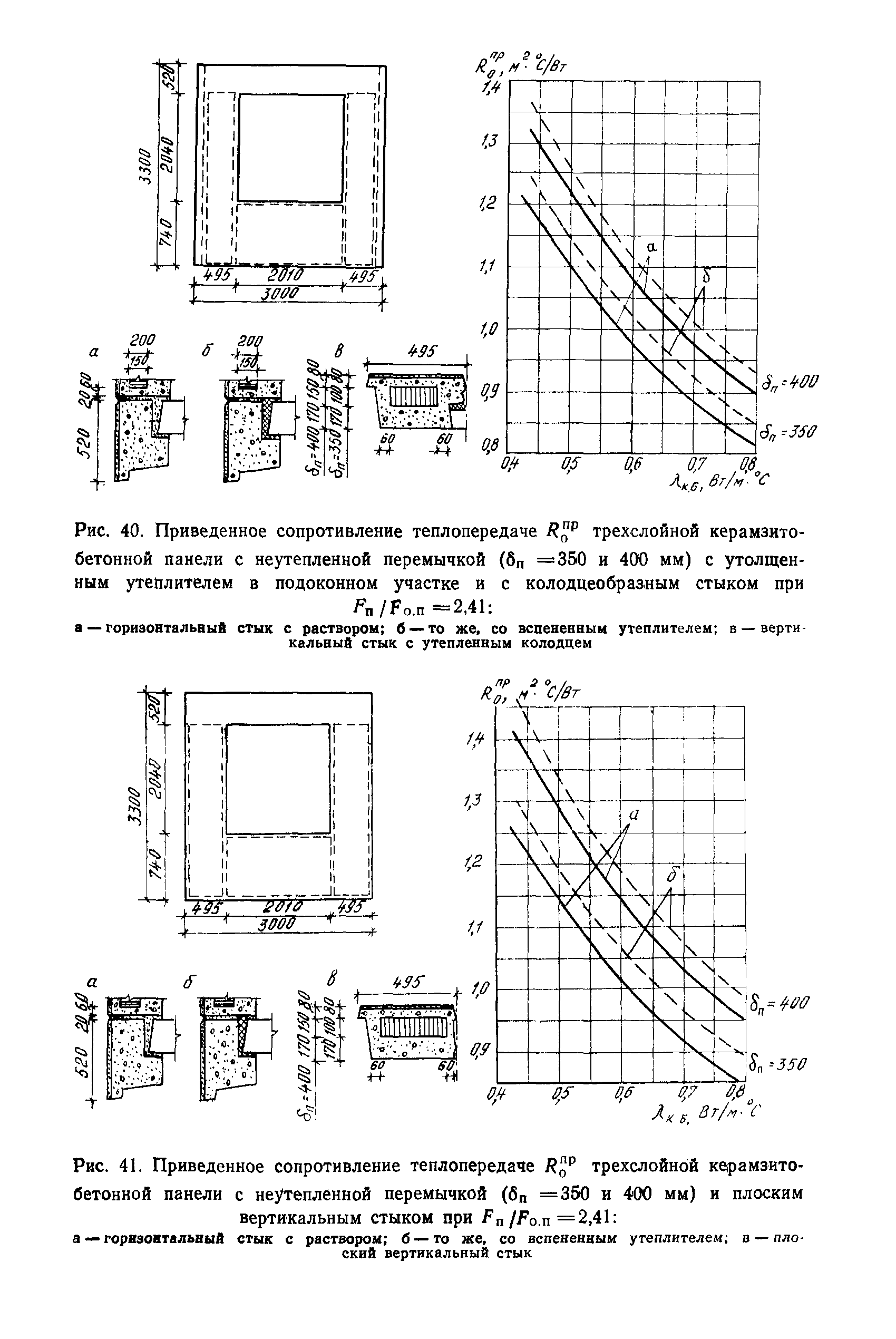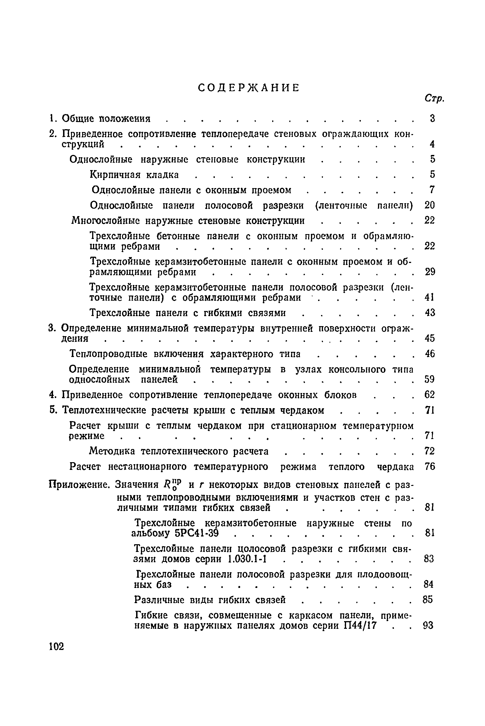 | Оглавление: | 1. Общие положения 2. Приведенное сопротивление теплопередаче стеновых ограждающих конструкций Однослойные наружные стеновые конструкции Кирпичная кладка Однослойные панели с оконным проемом Однослойные панели полосовой разрезки (ленточные панели) Многослойные наружные стеновые конструкции Трехслойные бетонные панели с оконным проемом и обрамляющими ребрами Трехслойные керамзитобетонные панели с оконным проемом и обрамляющими ребрами Трехслойные керамзитобетонные панели полосовой разрезки (ленточные панели) с обрамляющими ребрами Трехслойные панели с гибкими связями 3. Определение минимальной температуры внутренней поверхности ограждения Теплопроводные включения характерного типа Определение минимальной температуры в узлах консольного типа однослойных панелей 4. Приведенное сопротивление теплопередаче оконных блоков 5. Теплотехнические расчеты крыши с теплым чердаком Расчет крыши с теплым чердаком при стационарном температурном режиме Методика теплотехнического расчета Расчет нестационарного температурного режима теплого чердака Приложение. Значения R и r некоторых видов стеновых панелей с разными теплопроводным включениями и участков стен с различными типами гибких связей Трехслойные керамзитобетонные наружные стены по альбому 5РС41-39 Трехслойные панели полосовой разрезки с гибкими связями домов серии 1.030.1-1 Трехслойные панели полосовой разрезки для плодоовощных баз Различные виды гибких связей Гибкие связи, совмещенные с каркасом панели, применяемые в наружных панелях домов серии П44/17 |