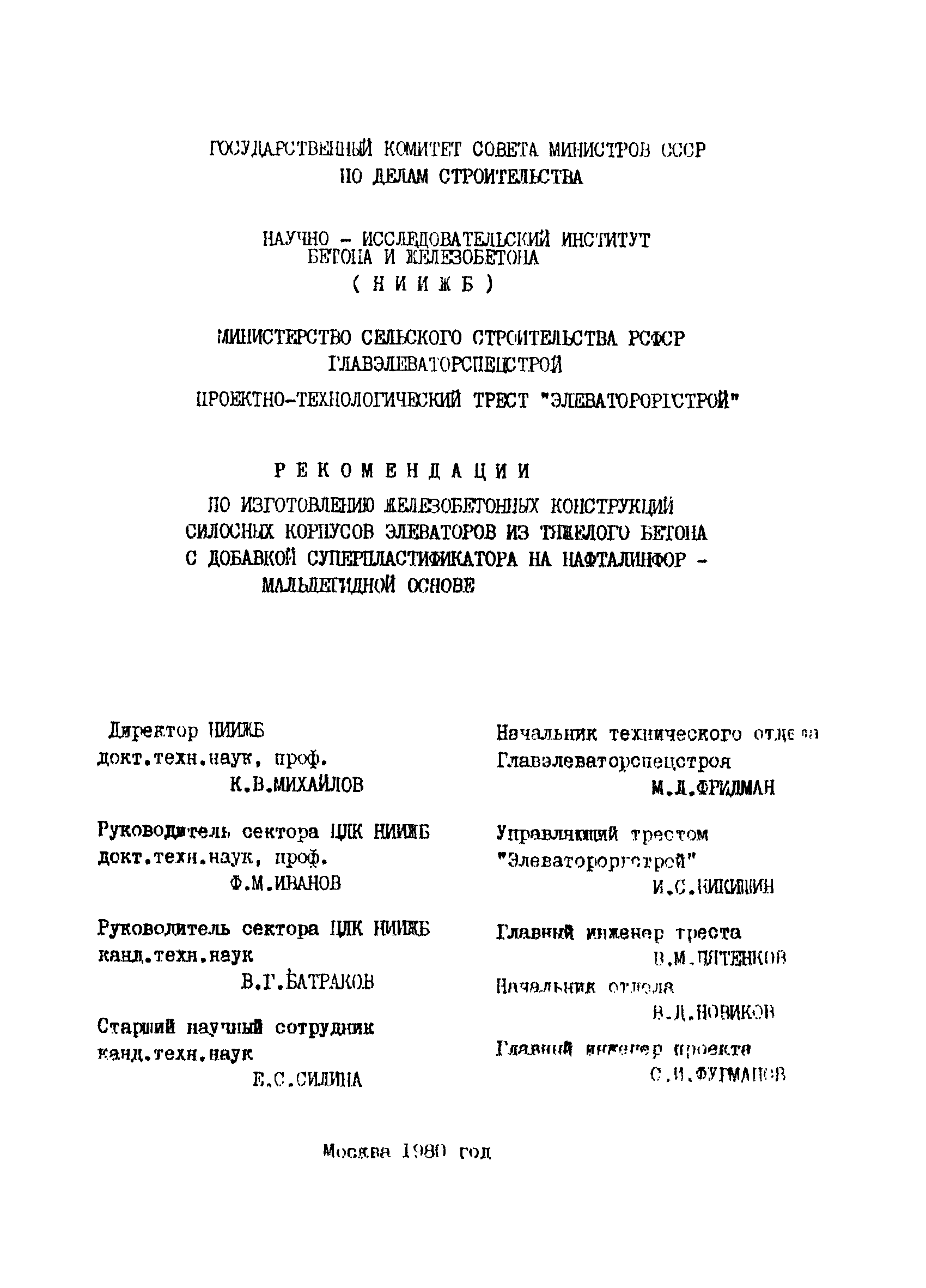 | Область применения: | Рекомендации распространяются на изготовление сборных железобетонных конструкций силосных сооружений элеваторов, в том числе и тонкостенных элементов силосов, в условиях заводов железобетонных конструкций системы Главэлеваторспецстроя Минсельстроя РСФСР. |