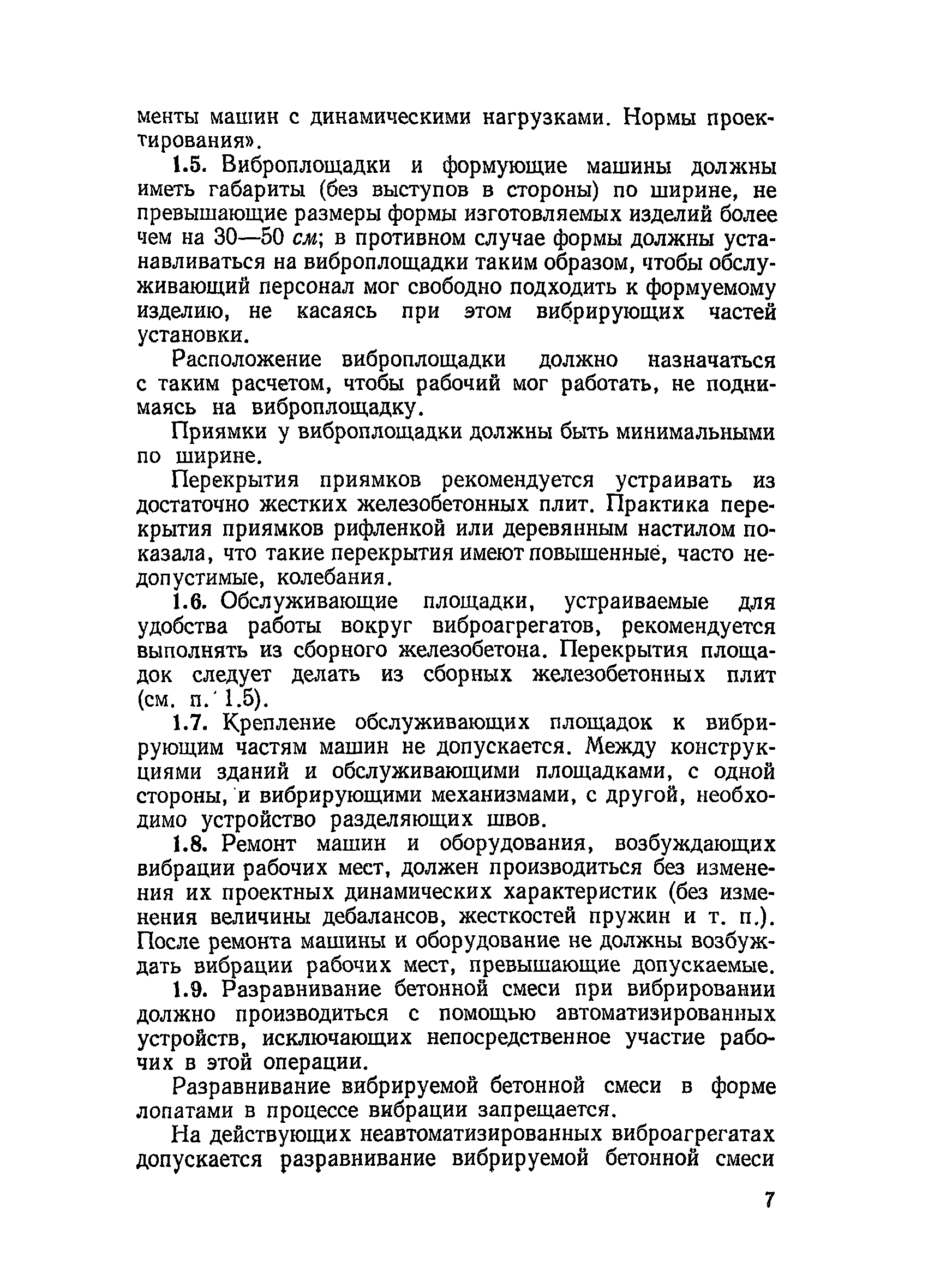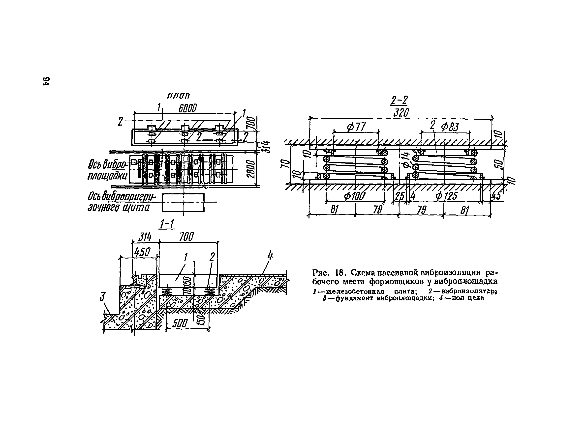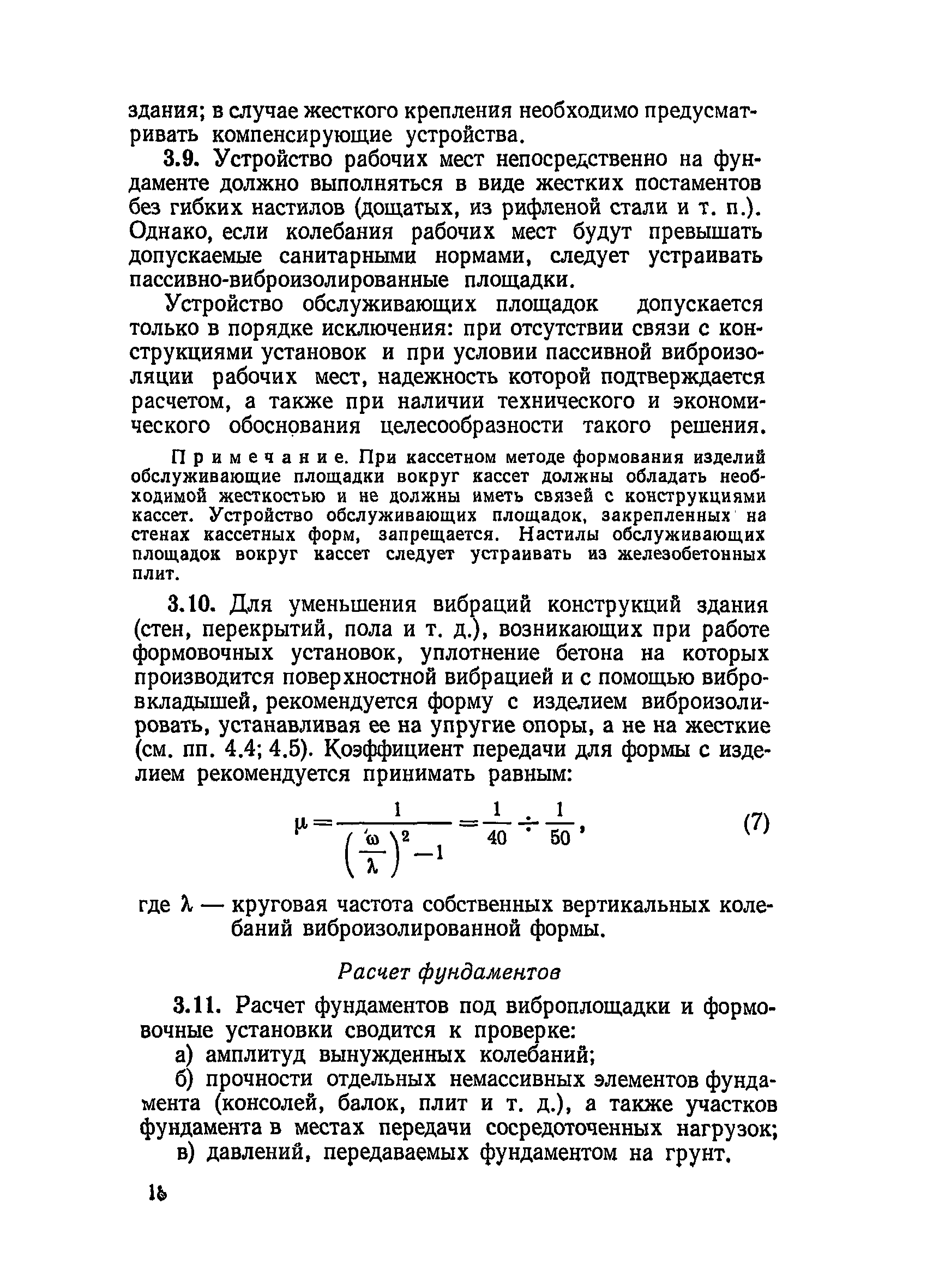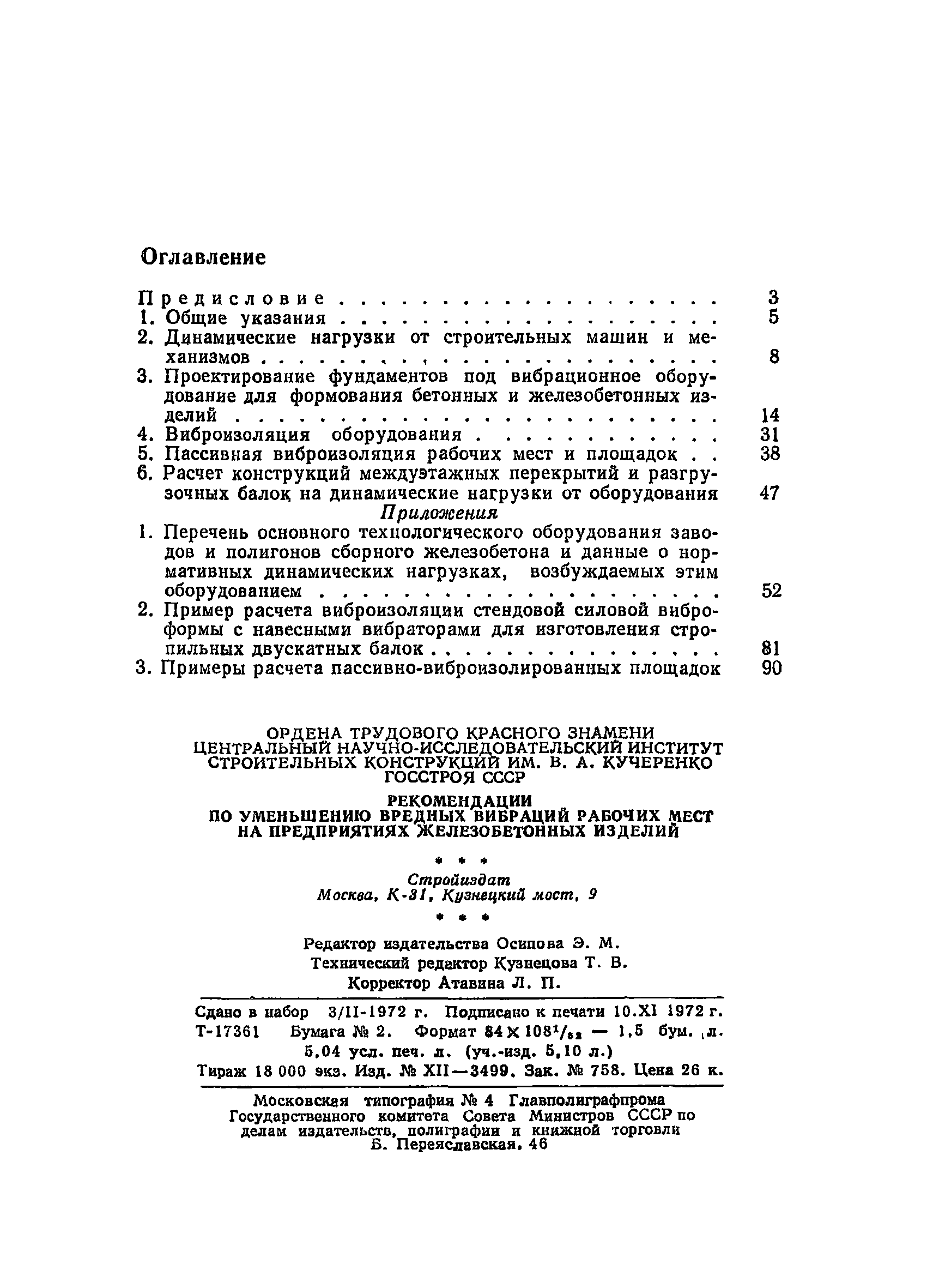 | Оглавление: | Предисловие 1. Общие указания 2. Динамические нагрузки от строительных машин и механизмов 3. Проектирование фундаментов под вибрационное оборудование для формования бетонных и железобетонных изделий 4. Виброиволяция оборудования 5. Пассивная виброизоляция рабочих мест и площадок 6. Расчет конструкций междуэтажных перекрытий и разгрузочных балок на динамические нагрузки от оборудования Приложения 1. Перечень основного технологического оборудования заводов и полигонов сборного железобетона и данные о нормативных динамических нагрузках, возбуждаемых этим оборудованием 2. Пример расчета виброизоляции стендовой силовой виброформы с навесными вибраторами для изготовления стропильных двускатных балок 3. Примеры расчета пассивно-виброизолированных площадок |