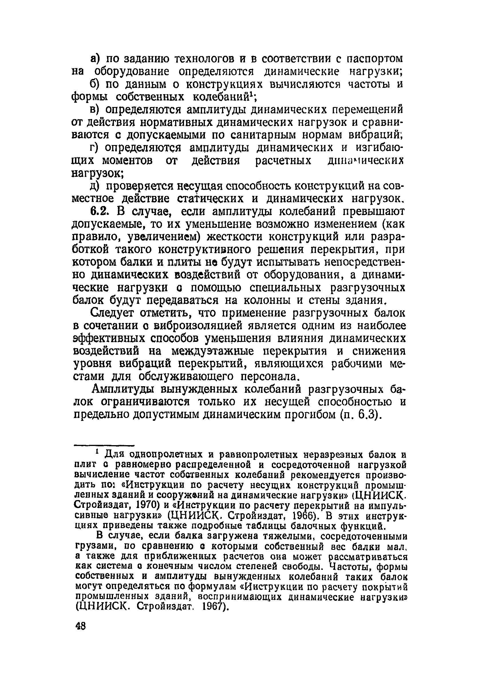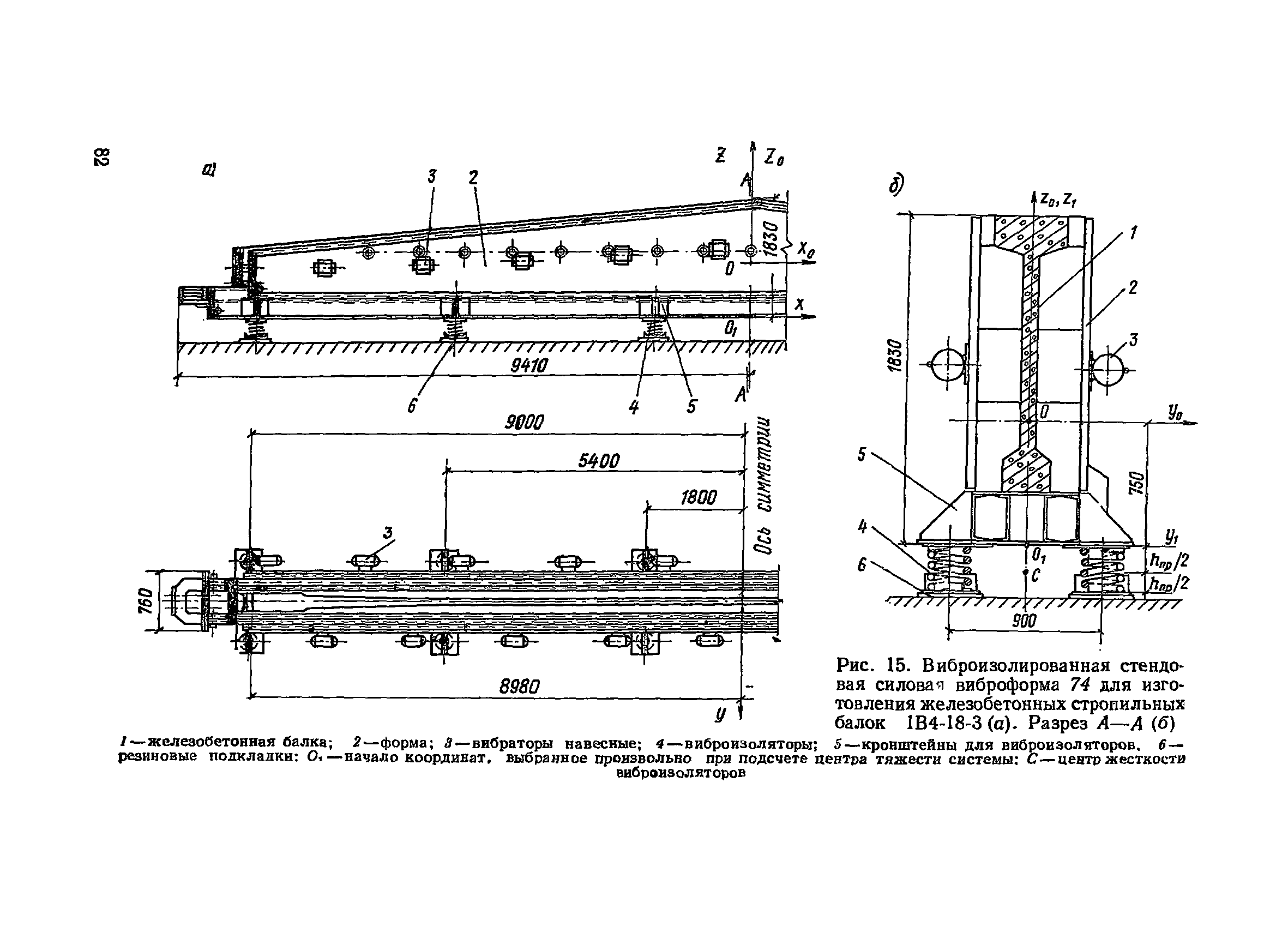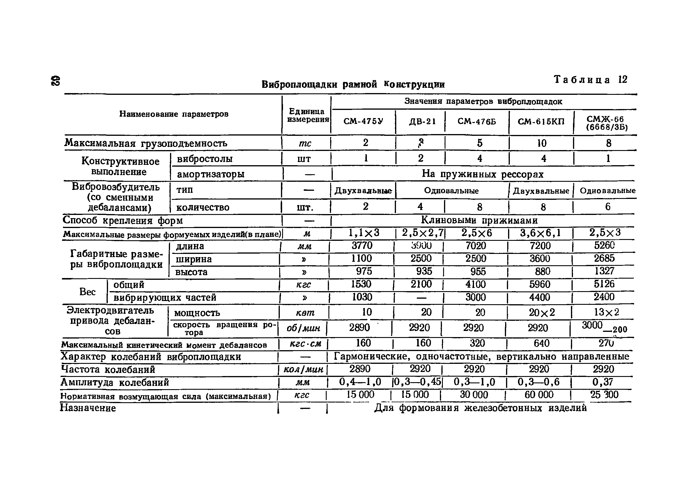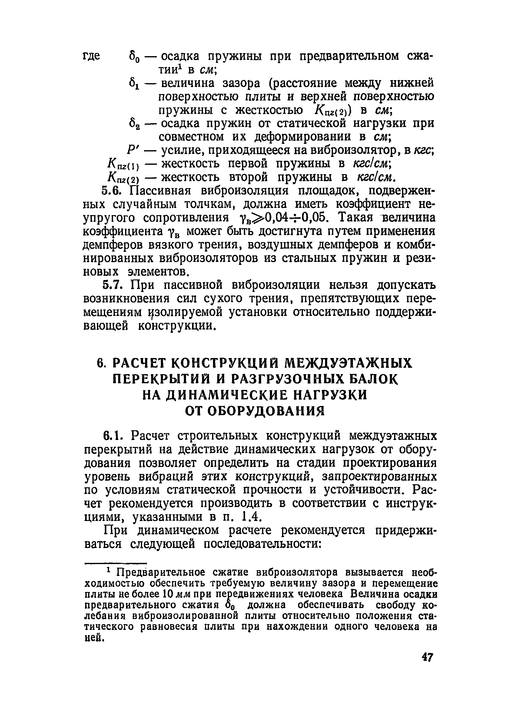 | Оглавление: | Предисловие 1. Общие указания 2. Динамические нагрузки от строительных машин и механизмов 3. Проектирование фундаментов под вибрационное оборудование для формования бетонных и железобетонных изделий 4. Виброиволяция оборудования 5. Пассивная виброизоляция рабочих мест и площадок 6. Расчет конструкций междуэтажных перекрытий и разгрузочных балок на динамические нагрузки от оборудования Приложения 1. Перечень основного технологического оборудования заводов и полигонов сборного железобетона и данные о нормативных динамических нагрузках, возбуждаемых этим оборудованием 2. Пример расчета виброизоляции стендовой силовой виброформы с навесными вибраторами для изготовления стропильных двускатных балок 3. Примеры расчета пассивно-виброизолированных площадок |