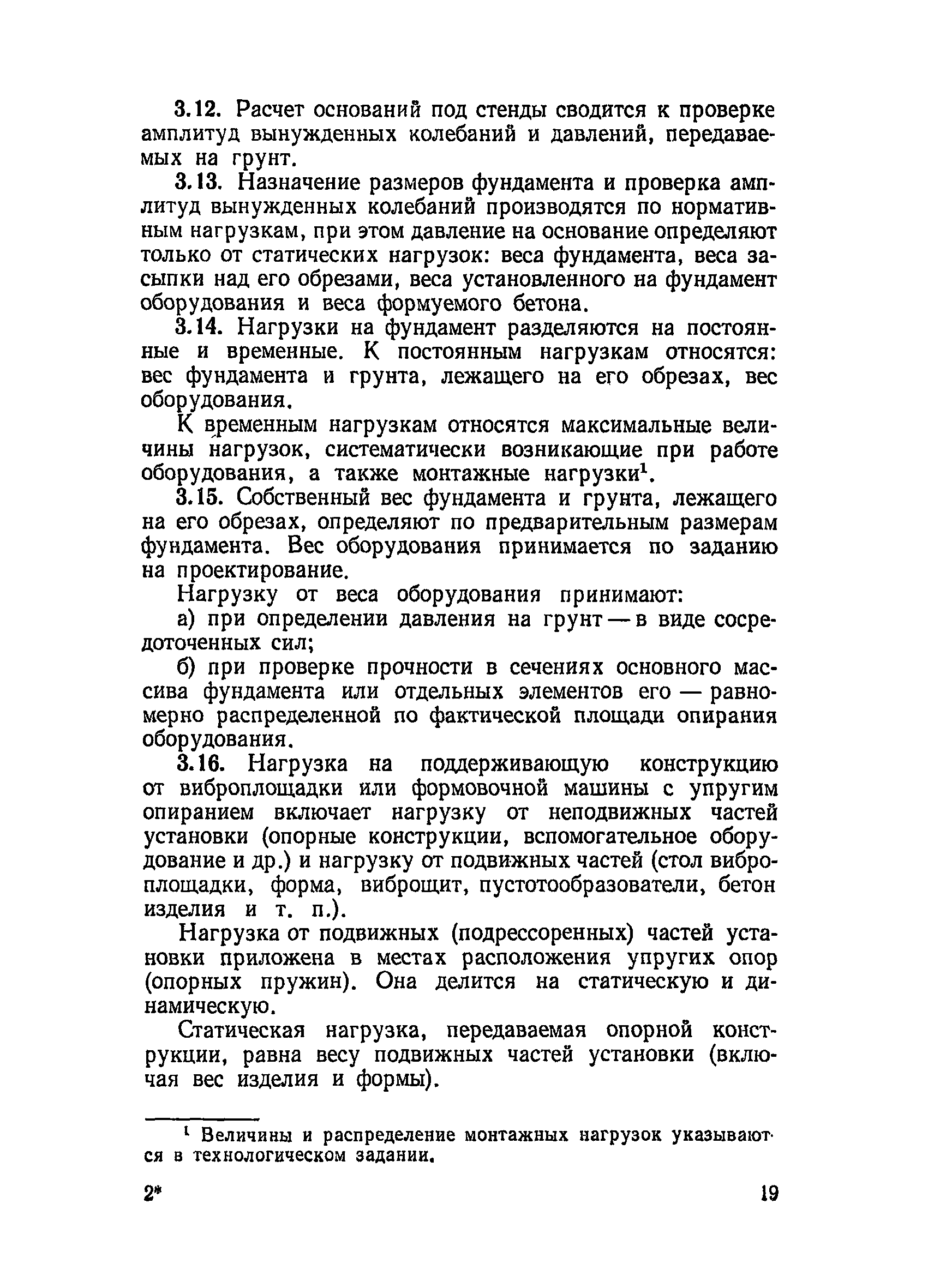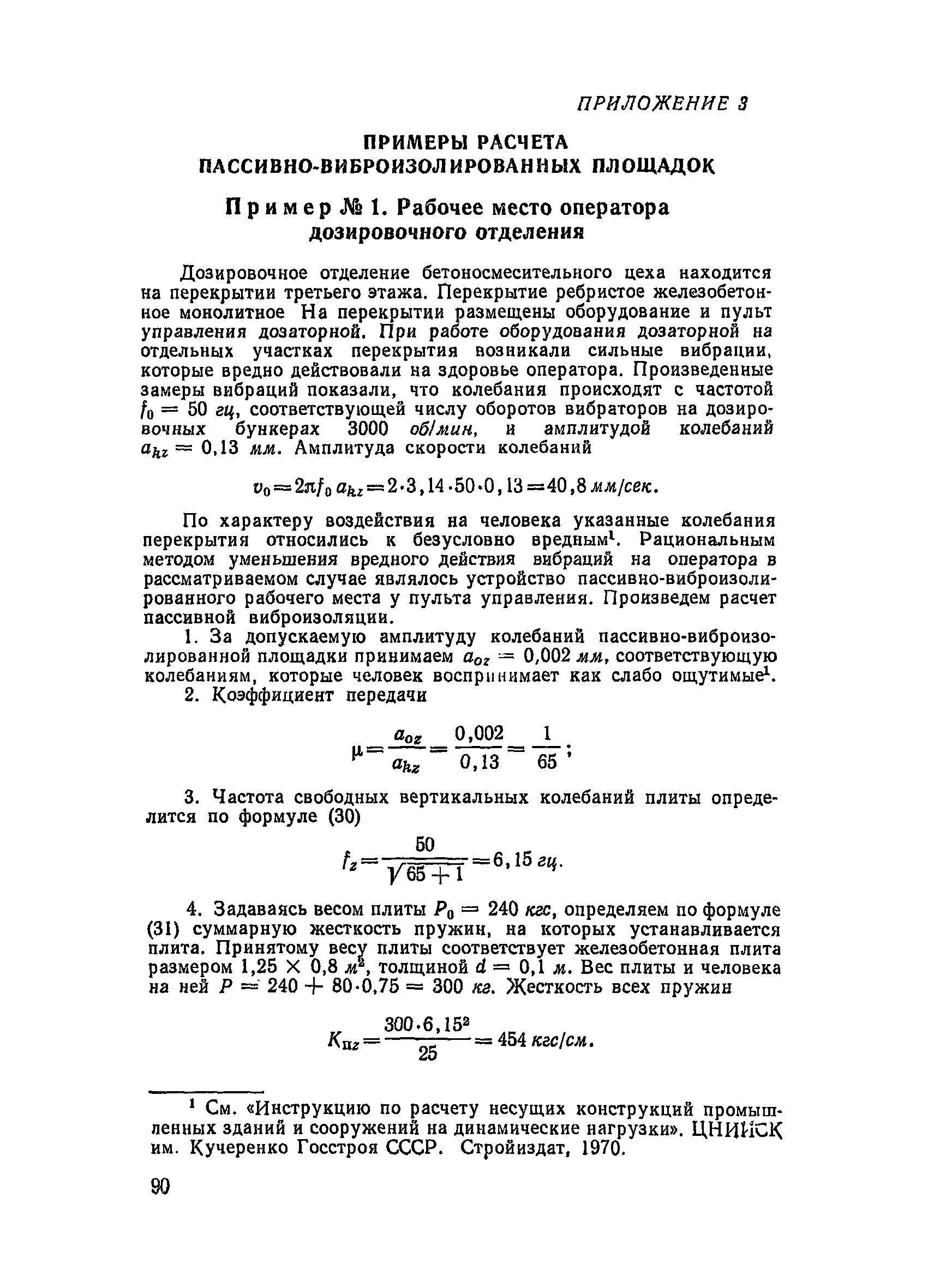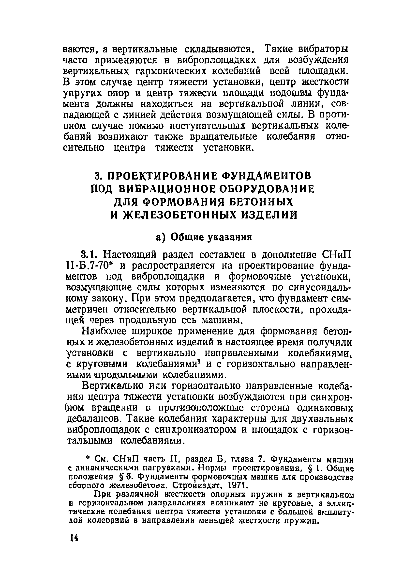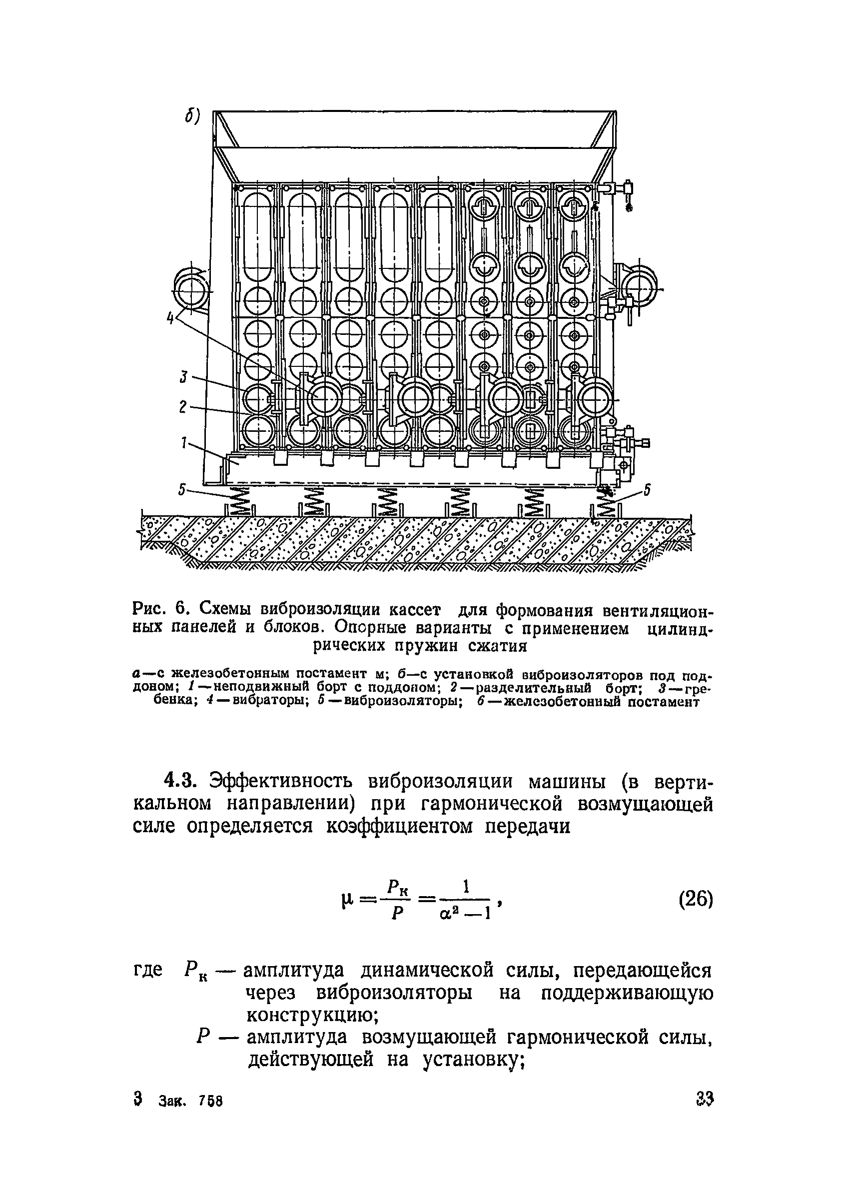 | Оглавление: | Предисловие 1. Общие указания 2. Динамические нагрузки от строительных машин и механизмов 3. Проектирование фундаментов под вибрационное оборудование для формования бетонных и железобетонных изделий 4. Виброиволяция оборудования 5. Пассивная виброизоляция рабочих мест и площадок 6. Расчет конструкций междуэтажных перекрытий и разгрузочных балок на динамические нагрузки от оборудования Приложения 1. Перечень основного технологического оборудования заводов и полигонов сборного железобетона и данные о нормативных динамических нагрузках, возбуждаемых этим оборудованием 2. Пример расчета виброизоляции стендовой силовой виброформы с навесными вибраторами для изготовления стропильных двускатных балок 3. Примеры расчета пассивно-виброизолированных площадок |