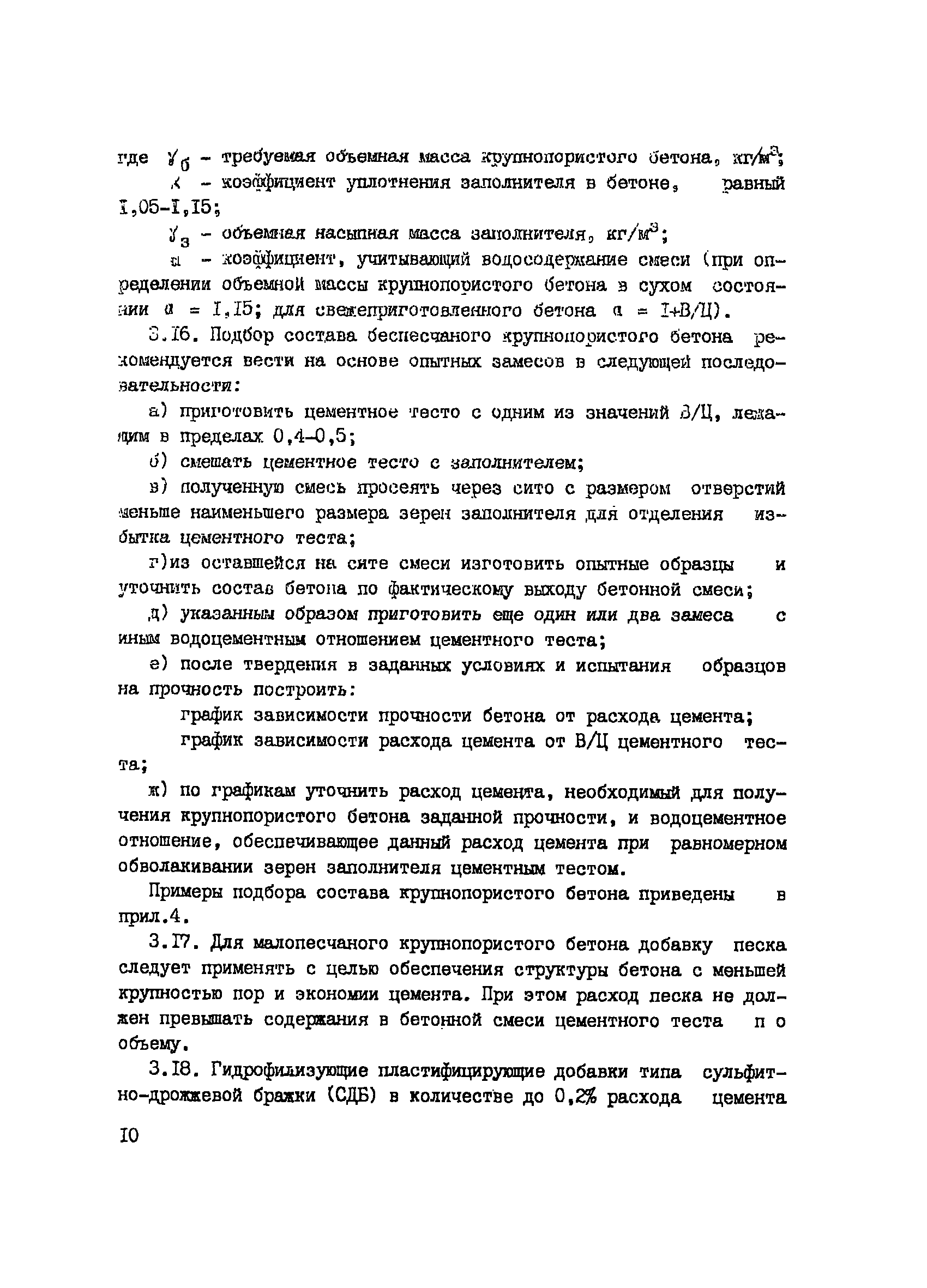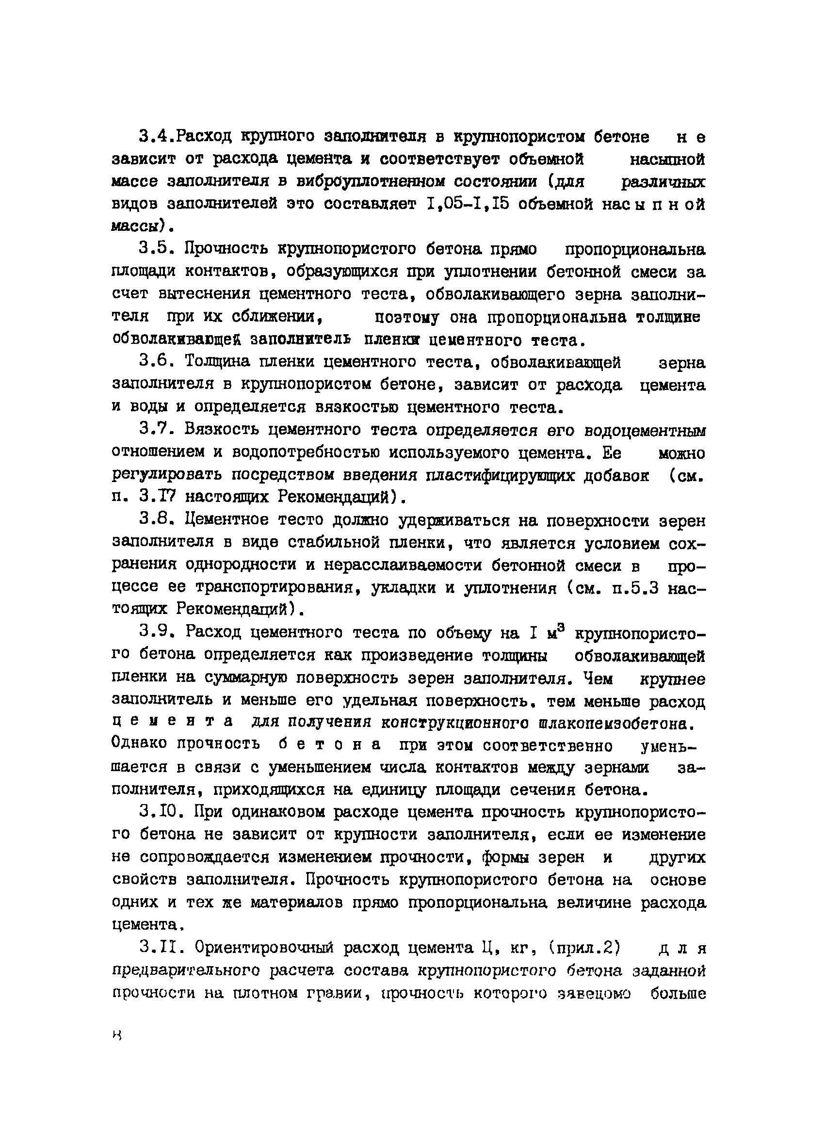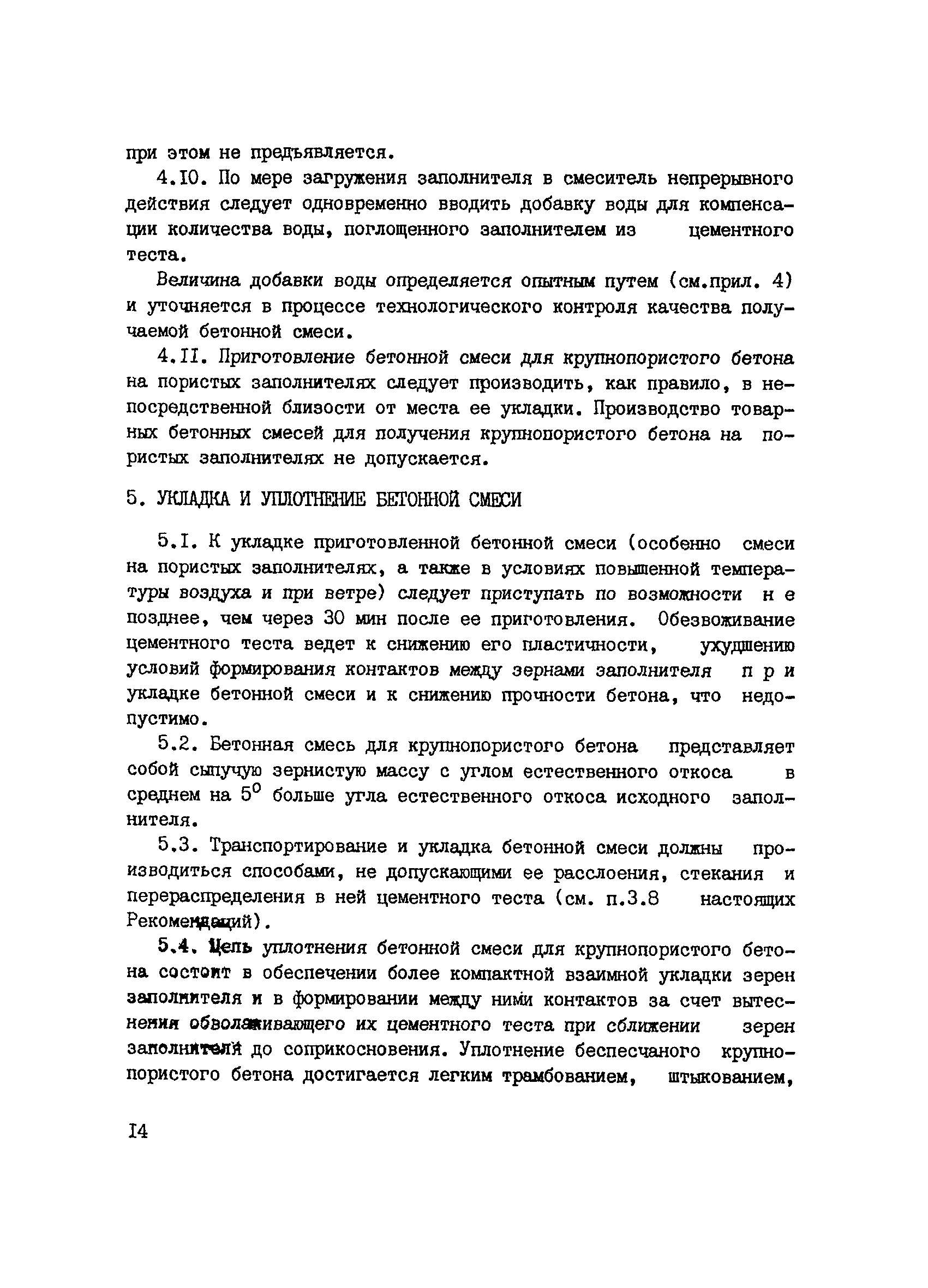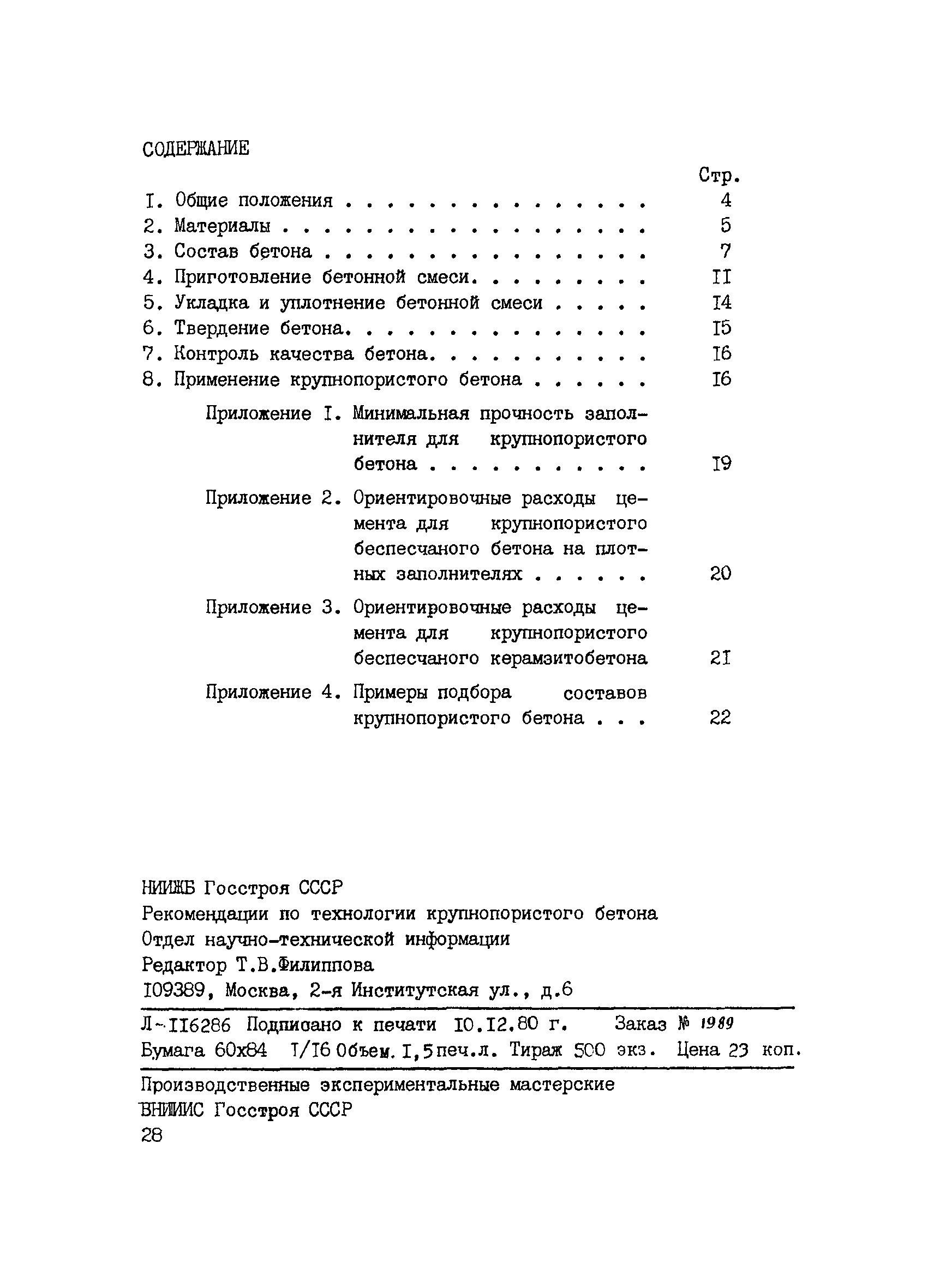 | Оглавление: | 1. Общие положения 2. Материалы 3. Состав бетона 4. Приготовление бетонной смеси 5. Укладка и уплотнение бетонной смеси 6. Твердение бетона 7. Контроль качества бетона 8. Применение крупнопористого бетона Приложение I. Минимальная прочность заполнителя для крупнопористого бетона Приложение 2. Ориентировочные расходы цемента для крупнопористого беспесчаного бетона на плотных заполнителях Приложение 3. Ориентировочные расходы цемента для крупнопористого беспесчаного керамзитобетона Приложение 4. Примеры подбора составов крупнопористого бетона |