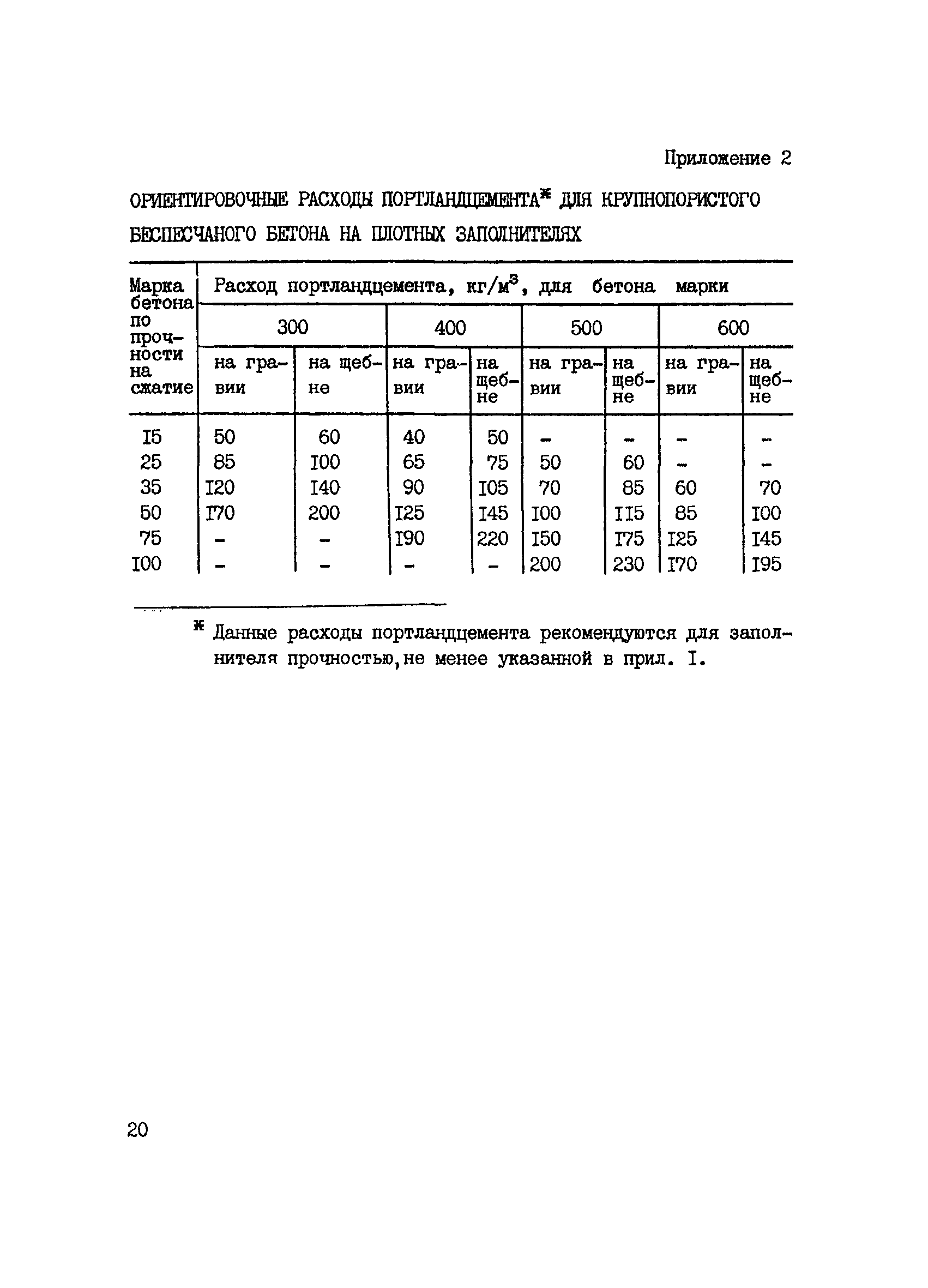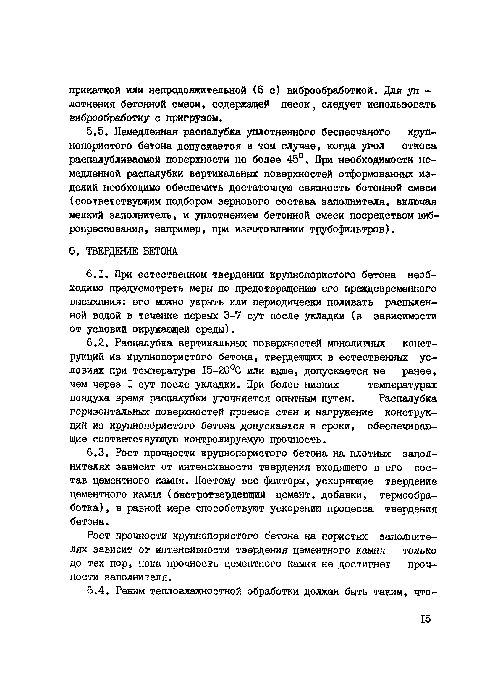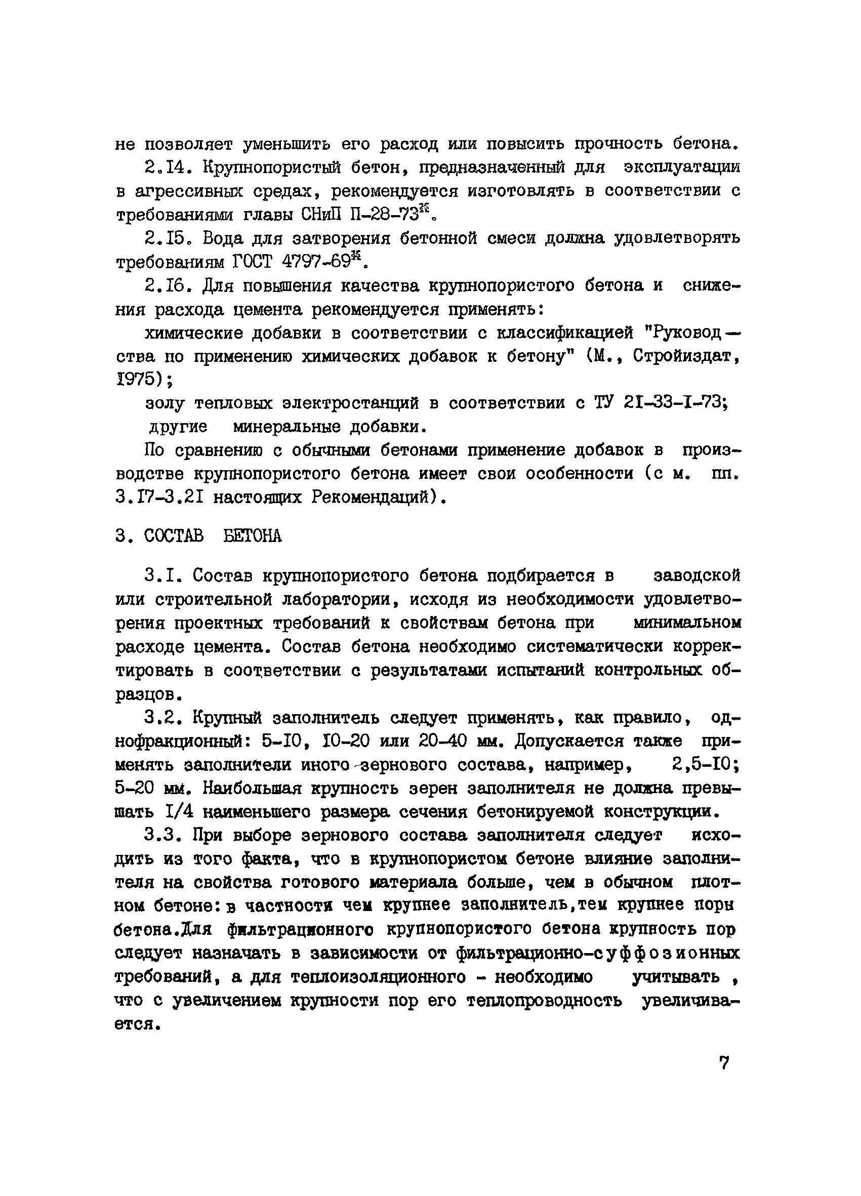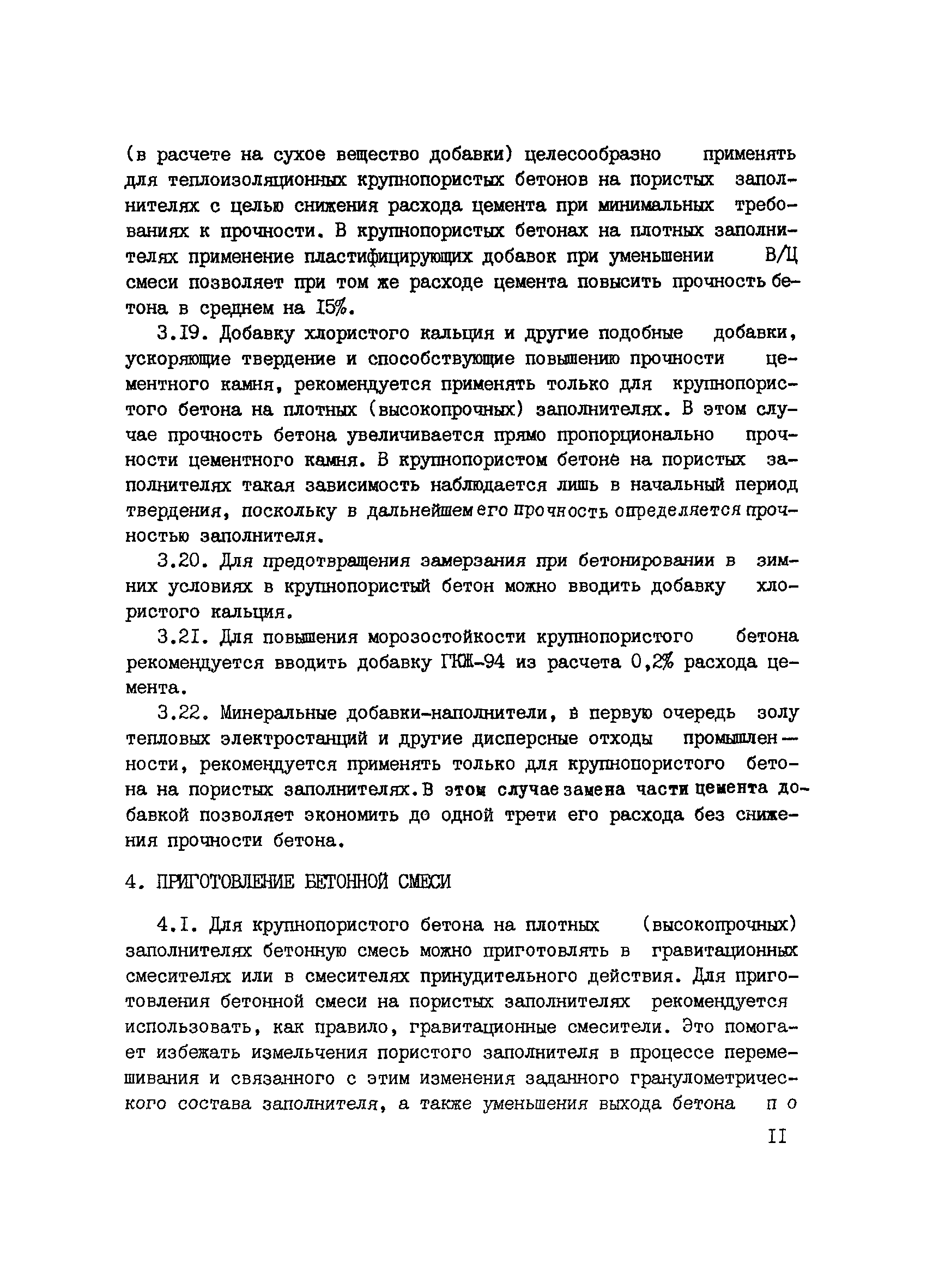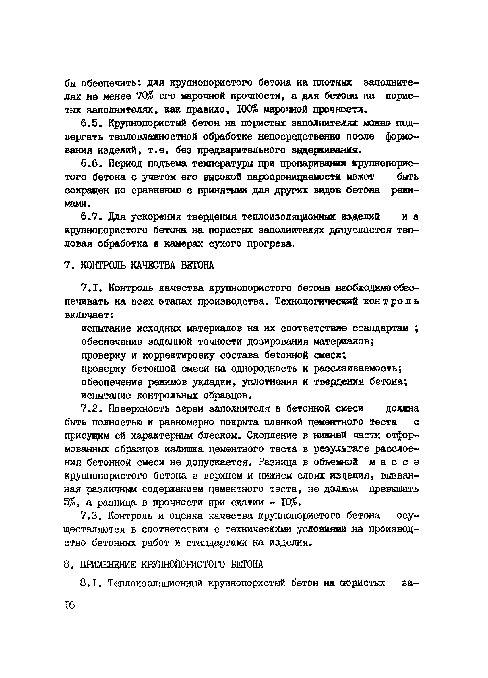 | Оглавление: | 1. Общие положения 2. Материалы 3. Состав бетона 4. Приготовление бетонной смеси 5. Укладка и уплотнение бетонной смеси 6. Твердение бетона 7. Контроль качества бетона 8. Применение крупнопористого бетона Приложение I. Минимальная прочность заполнителя для крупнопористого бетона Приложение 2. Ориентировочные расходы цемента для крупнопористого беспесчаного бетона на плотных заполнителях Приложение 3. Ориентировочные расходы цемента для крупнопористого беспесчаного керамзитобетона Приложение 4. Примеры подбора составов крупнопористого бетона |