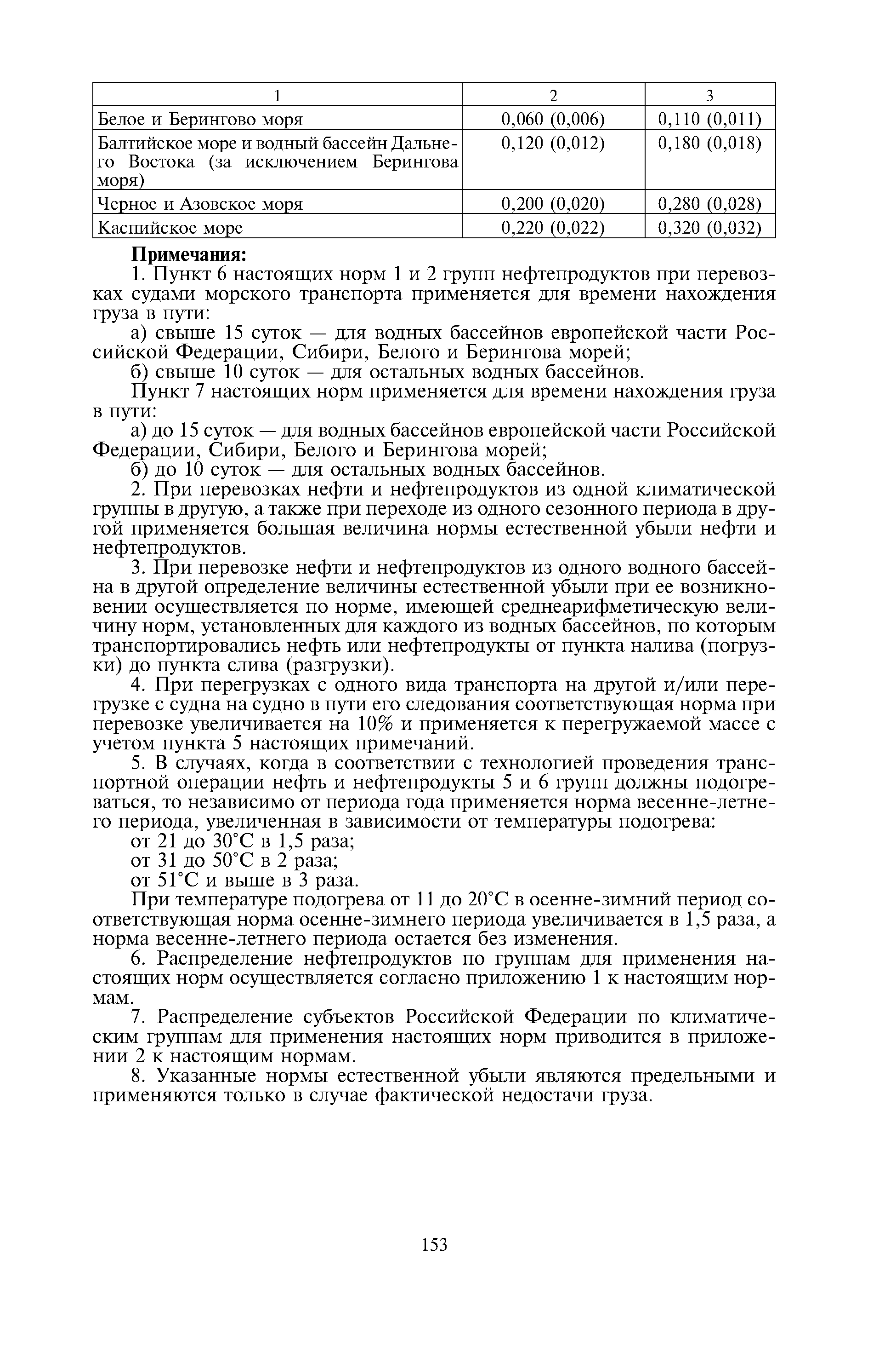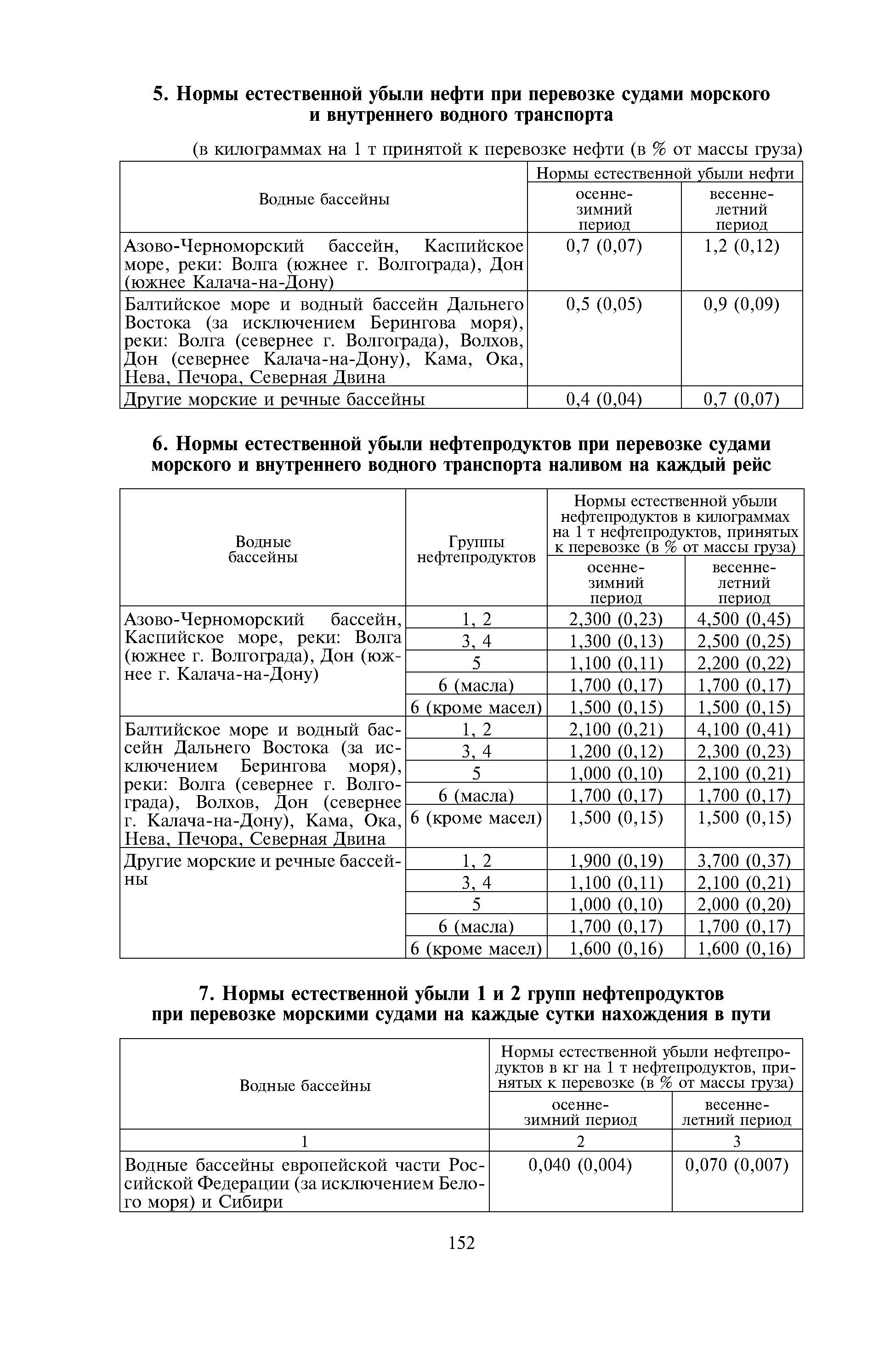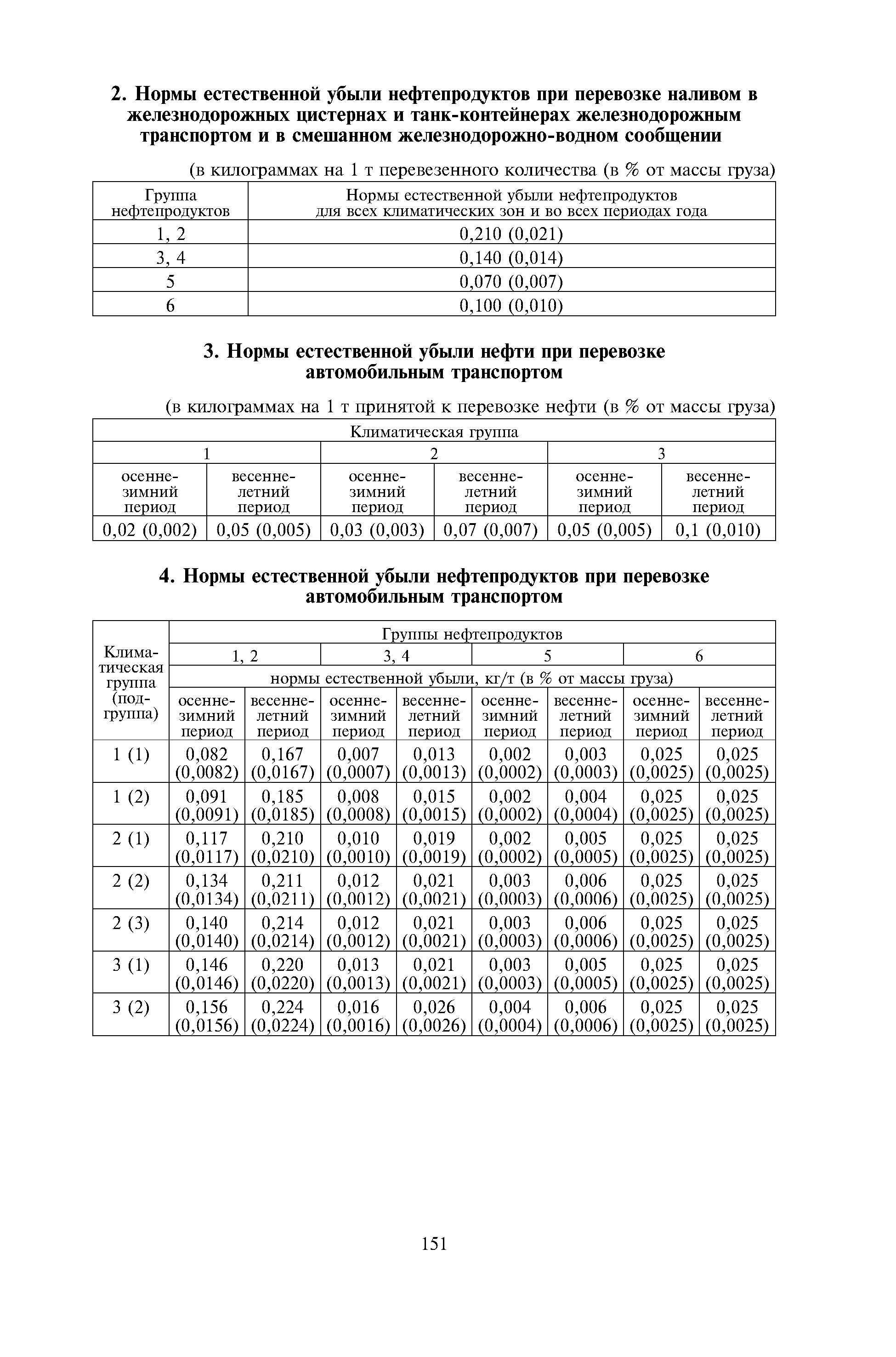 Нормы естественной убыли нефти и нефтепродуктов при перевозке железнодорожным, автомобильным, водным видами транспорта и в смешанном железнодорожно-водном сообщении| Статус: | утратил силу | | Название рус.: | Нормы естественной убыли нефти и нефтепродуктов при перевозке железнодорожным, автомобильным, водным видами транспорта и в смешанном железнодорожно-водном сообщении | | Дата добавления в базу: | 01.09.2013 | | Дата актуализации: | 01.01.2021 | | Дата введения: | 28.01.2011 | | Дата окончания срока действия: | 15.06.2019 | | Оглавление: | 1. Нормы естественной убыли нефти при перевозке наливом в железнодорожных цистернах и танк-контейнерах железнодорожным транспортом и в смешанном железнодорожно-водном сообщении 2. Нормы естественной убыли нефтепродуктов при перевозке наливом в железнодорожных цистернах и танк-контейнерах железнодорожным транспортом и в смешанном железнодорожно-водном сообщении 3. Нормы естественной убыли нефти при перевозке автомобильным транспортом 4. Нормы естественной убыли нефтепродуктов при перевозке автомобильным транспортом 5. Нормы естественной убыли нефти при перевозке судами морского и внутреннего водного транспорта 6. Нормы естественной убыли нефтепродуктов при перевозке судами морского и внутреннего водного транспорта наливом на каждый рейс 7. Нормы естественной убыли 1 и 2 группы нефтепродуктов при перевозке морскими судами на каждые сутки нахождения в пути Приложение 1. Распределение нефтепродуктов по группам Приложение 2. Распределение субъектов Российской Федерации по климатическим группам (подгруппам) для применения норм естественной убыли | | Утверждён: | 01.11.2010 Министерство энергетики РФ (Russian Federation Ministry of Energy 527/236) Минтранс России (Russian Federation Mintrans )