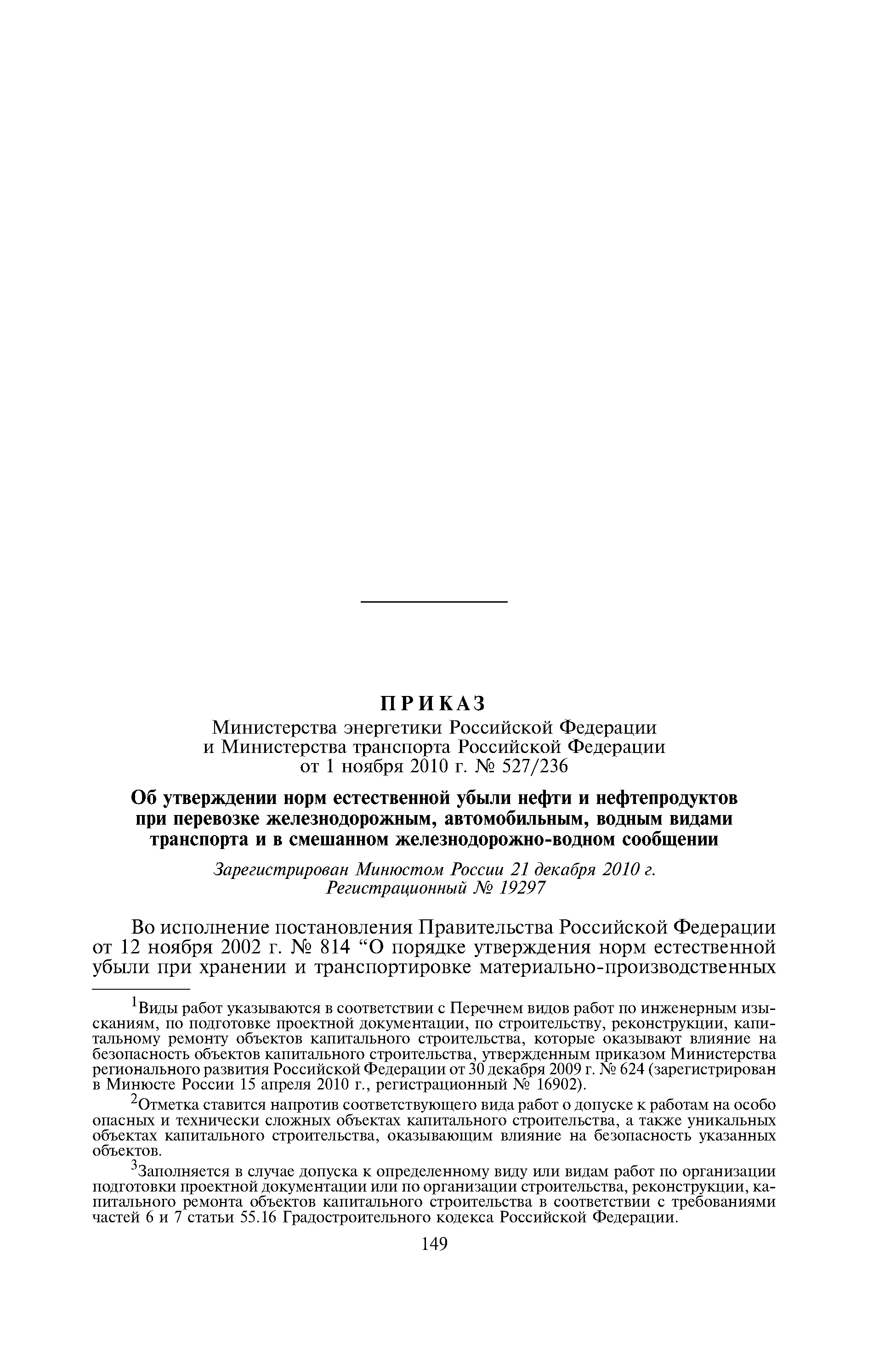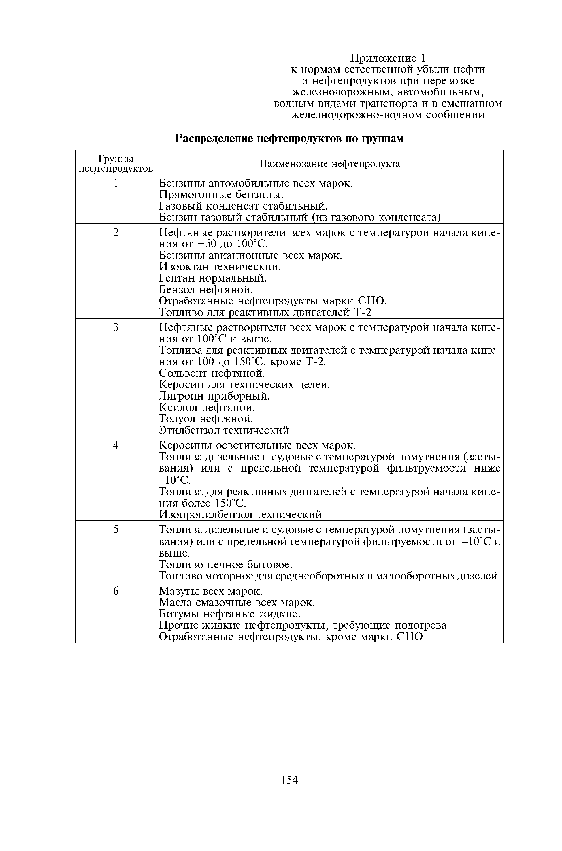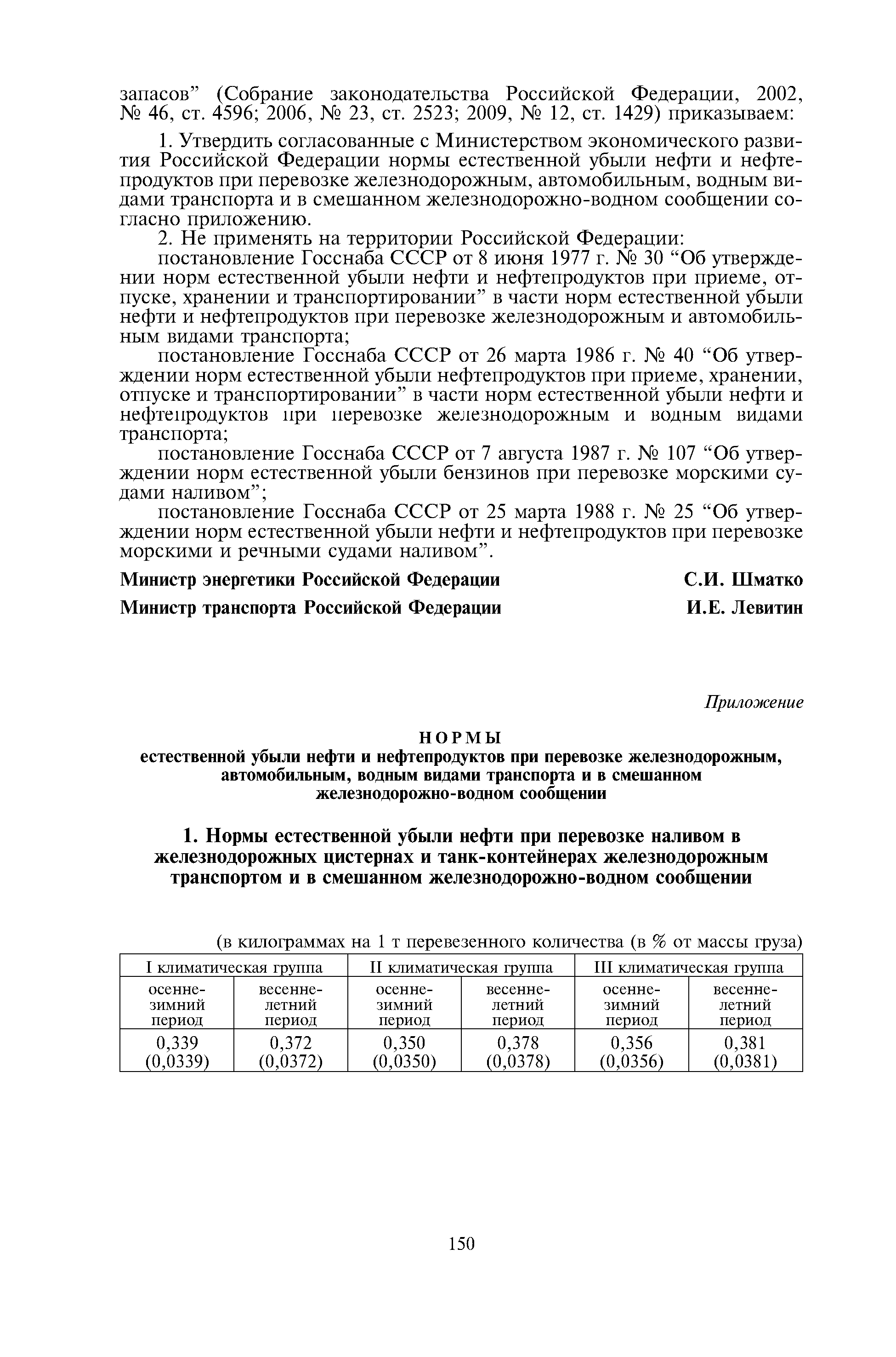 Нормы естественной убыли нефти и нефтепродуктов при перевозке железнодорожным, автомобильным, водным видами транспорта и в смешанном железнодорожно-водном сообщении| Статус: | утратил силу | | Название рус.: | Нормы естественной убыли нефти и нефтепродуктов при перевозке железнодорожным, автомобильным, водным видами транспорта и в смешанном железнодорожно-водном сообщении | | Дата добавления в базу: | 01.09.2013 | | Дата актуализации: | 01.01.2021 | | Дата введения: | 28.01.2011 | | Дата окончания срока действия: | 15.06.2019 | | Оглавление: | 1. Нормы естественной убыли нефти при перевозке наливом в железнодорожных цистернах и танк-контейнерах железнодорожным транспортом и в смешанном железнодорожно-водном сообщении 2. Нормы естественной убыли нефтепродуктов при перевозке наливом в железнодорожных цистернах и танк-контейнерах железнодорожным транспортом и в смешанном железнодорожно-водном сообщении 3. Нормы естественной убыли нефти при перевозке автомобильным транспортом 4. Нормы естественной убыли нефтепродуктов при перевозке автомобильным транспортом 5. Нормы естественной убыли нефти при перевозке судами морского и внутреннего водного транспорта 6. Нормы естественной убыли нефтепродуктов при перевозке судами морского и внутреннего водного транспорта наливом на каждый рейс 7. Нормы естественной убыли 1 и 2 группы нефтепродуктов при перевозке морскими судами на каждые сутки нахождения в пути Приложение 1. Распределение нефтепродуктов по группам Приложение 2. Распределение субъектов Российской Федерации по климатическим группам (подгруппам) для применения норм естественной убыли | | Утверждён: | 01.11.2010 Министерство энергетики РФ (Russian Federation Ministry of Energy 527/236) Минтранс России (Russian Federation Mintrans )