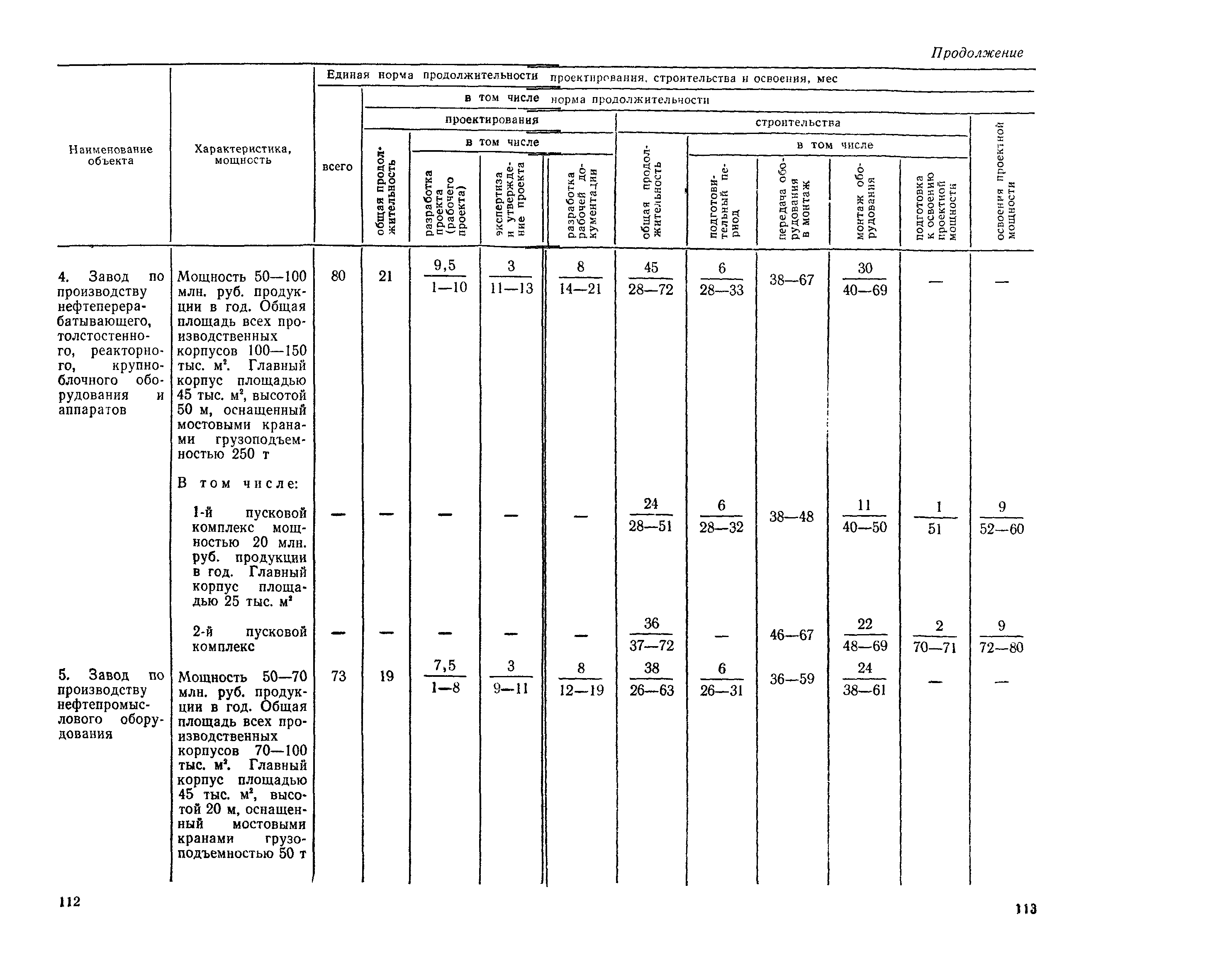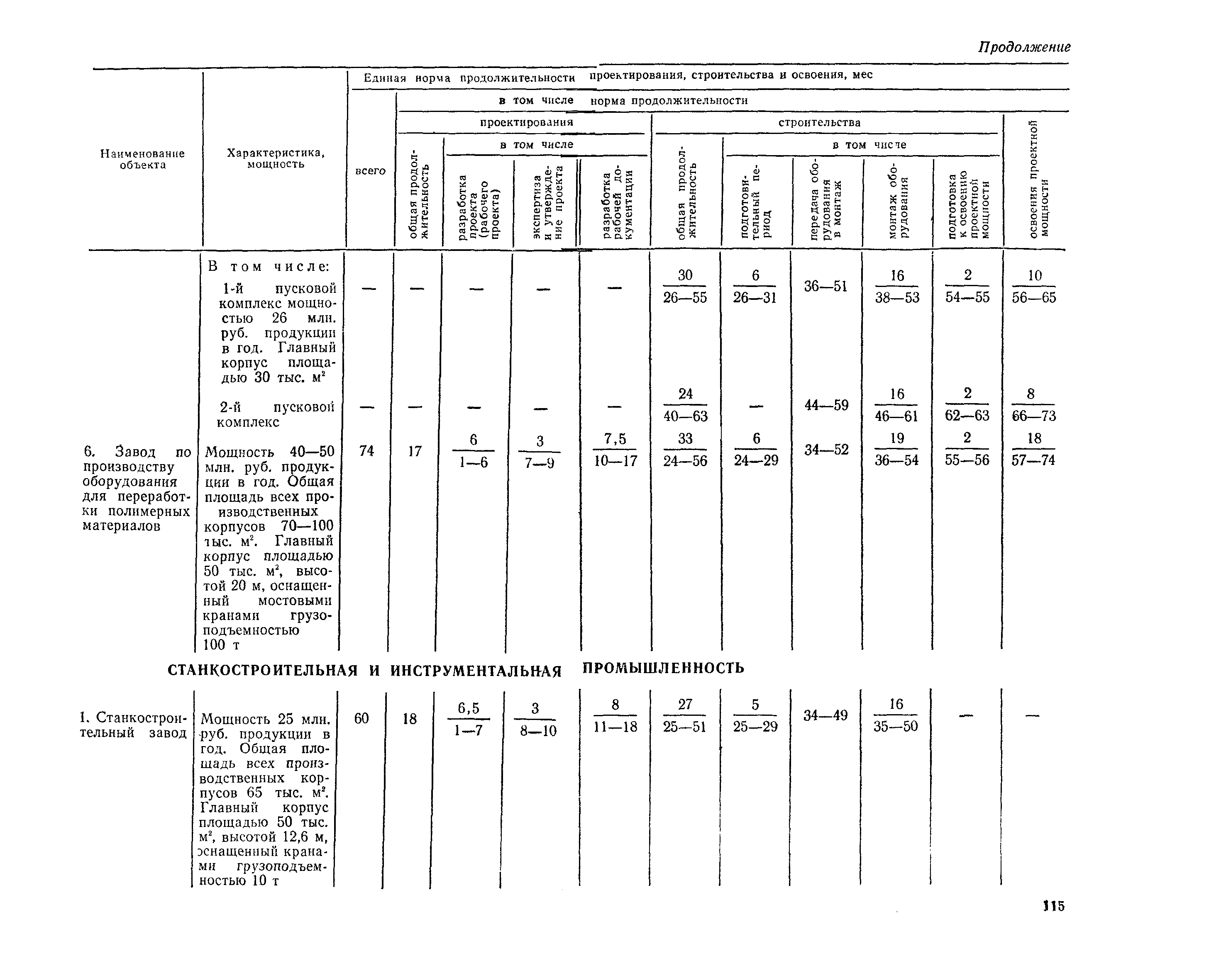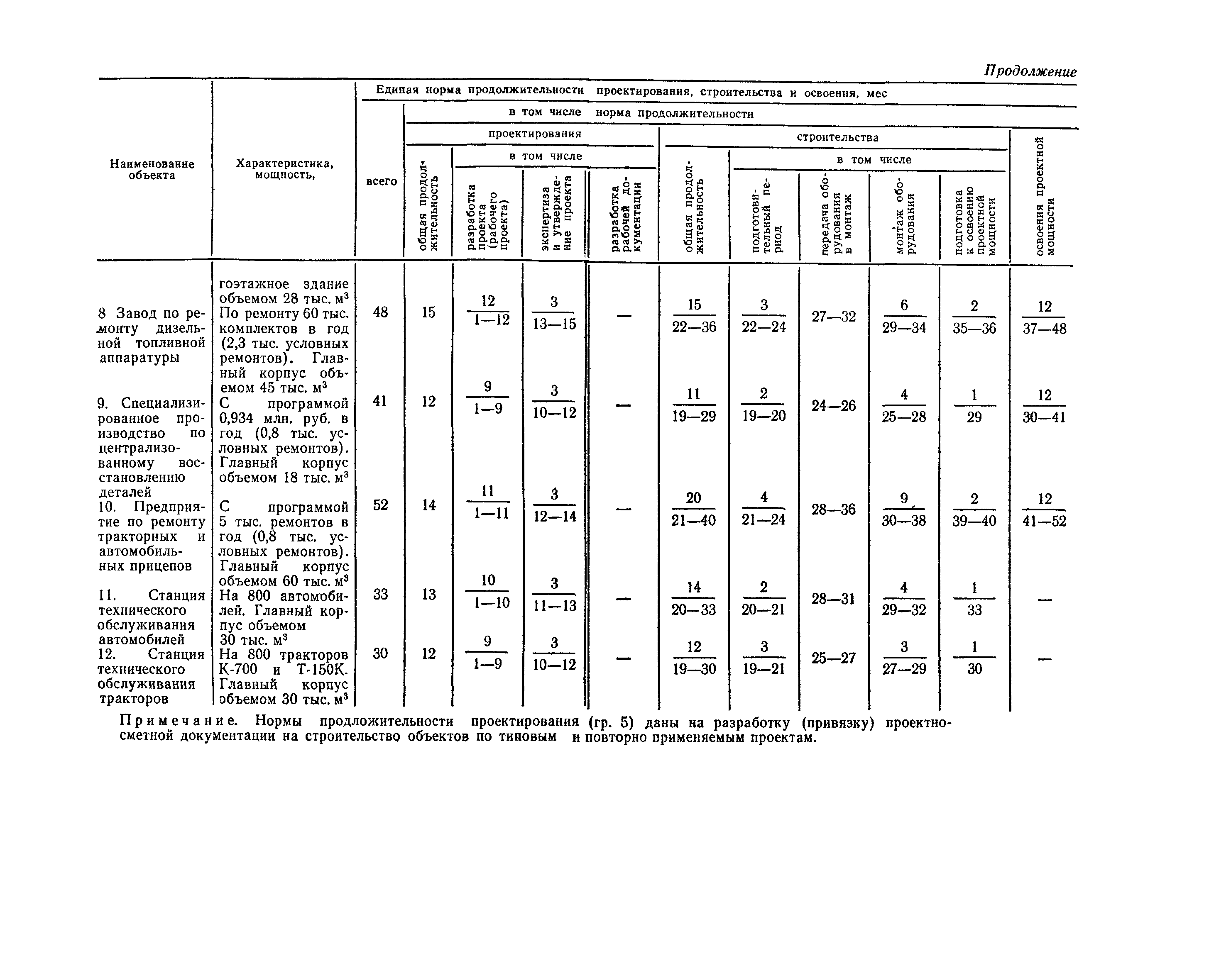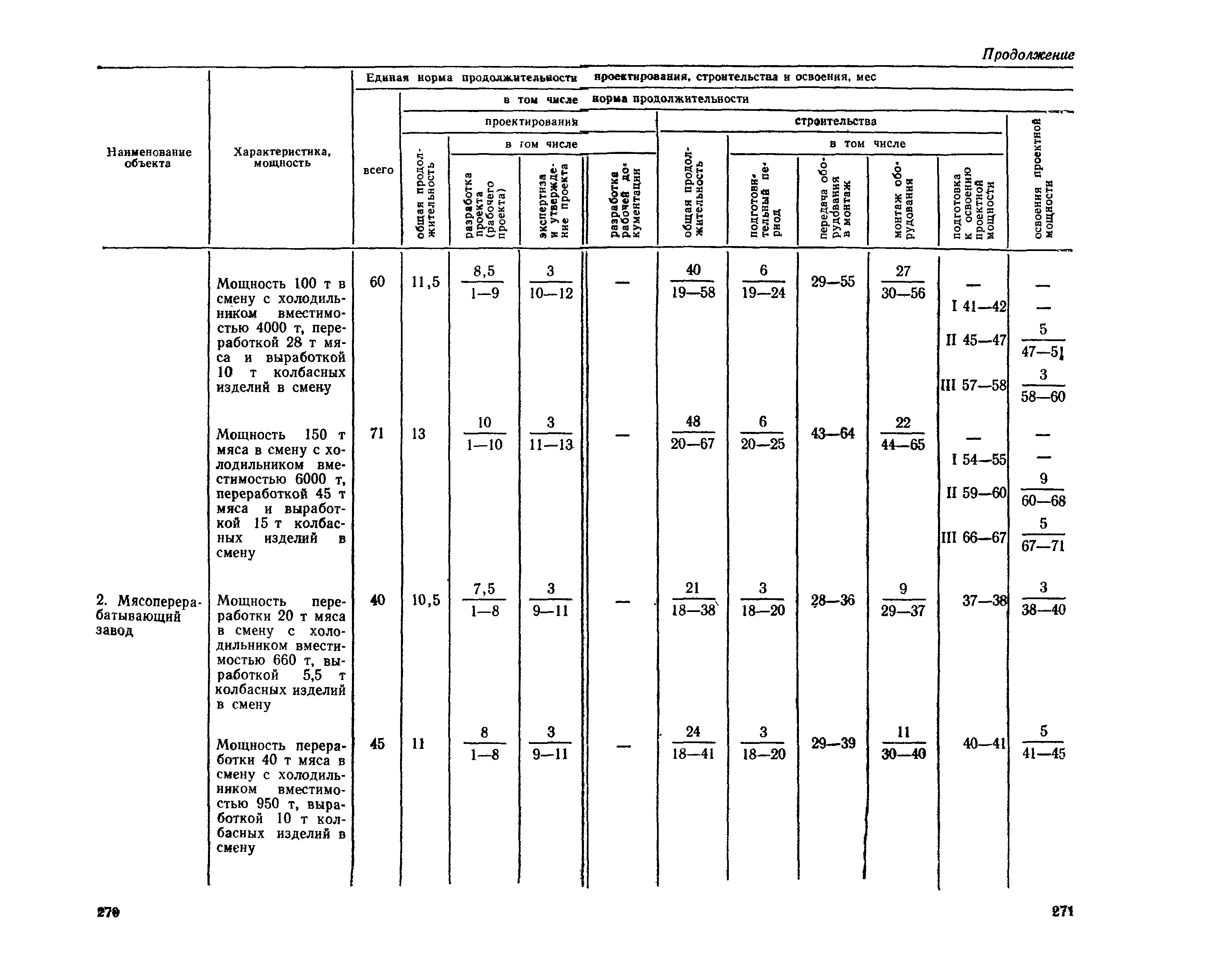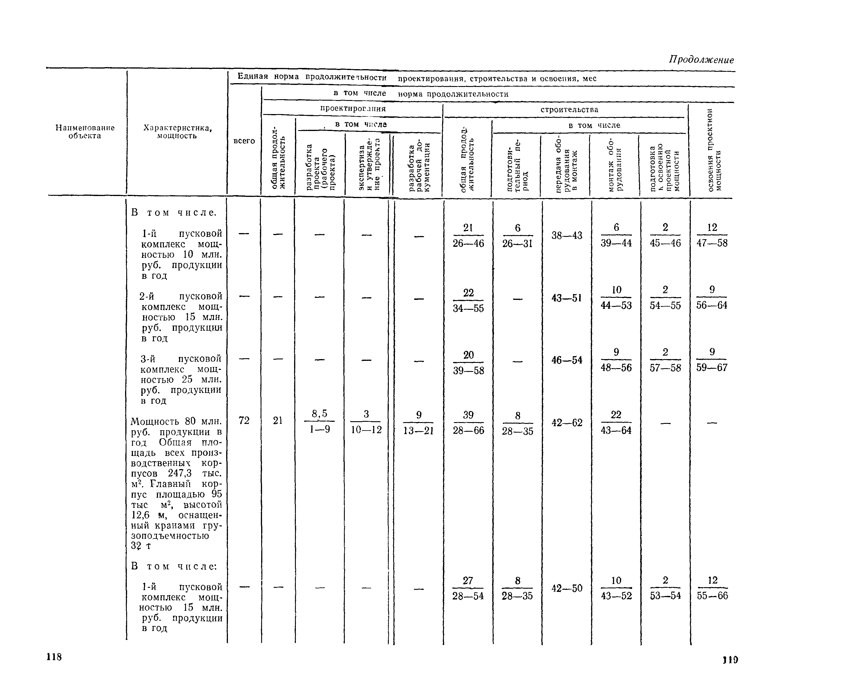 Единые нормы продолжительности проектирования и строительства предприятий, зданий и сооружений и освоения проектных мощностей| Статус: | действует | | Название рус.: | Единые нормы продолжительности проектирования и строительства предприятий, зданий и сооружений и освоения проектных мощностей | | Дата добавления в базу: | 01.09.2013 | | Дата актуализации: | 01.01.2021 | | Дата введения: | 01.07.1983 | | Область применения: | Единые нормы продолжительности проектирования и строительства предприятий, зданий н сооружений и освоения проектных мощностей устанавливают общую продолжительность создания производственных мощностей предприятий, зданий и сооружений. Единые нормы предназначены для составления перспективных планов капитальных вложений, а также схем развития и размещения отраслей народного хозяйства и отраслей промышленности в схем развития и размещения производительных сил по экономическим районам страны и союзным республикам. | | Оглавление: | Общие положения Электроэнергетика Нефтеперерабатывающая и нефтехимическая промышленность Газовая промышленность Угольная и сланцевая промышленность Черная металлургия Цветная металлургия Химическая промышленность Производство минеральных удобрений Машиностроение Тяжелое и транспортное машиностроение Электротехническая промышленность Химическое и нефтяное машиностроение Станкостроительная и инструментальная промышленность Производство продукции общемашиностроительного применения Приборостроение Автомобильная и подшипниковая промышленность Тракторное и сельскохозяйственное машиностроение Машиностроение для животноводства и кормопроизводства Строительное, дорожное и коммунальное машиностроение Машиностроение для легкой и пищевой промышленности и бытовых приборов Судостроительная промышленность и судоремонт Лесная, деревообрабатывающая и целлюлозно-бумажная промышленность Промышленность строительных материалов Промышленность строительных конструкций и деталей Легкая промышленность Пищевая промышленность Мясная промышленность Молочная промышленность Микробиологическая промышленность Мукомольно-крупяная, комбикормовая и элеваторная промышленность Медицинская промышленность Сельскохозяйственное строительство Предприятия сельхозтехники | | Разработан: | ЦНИИпроект Госстроя России ВНИПИнефть ЦНИИОМТП НИИПИН
