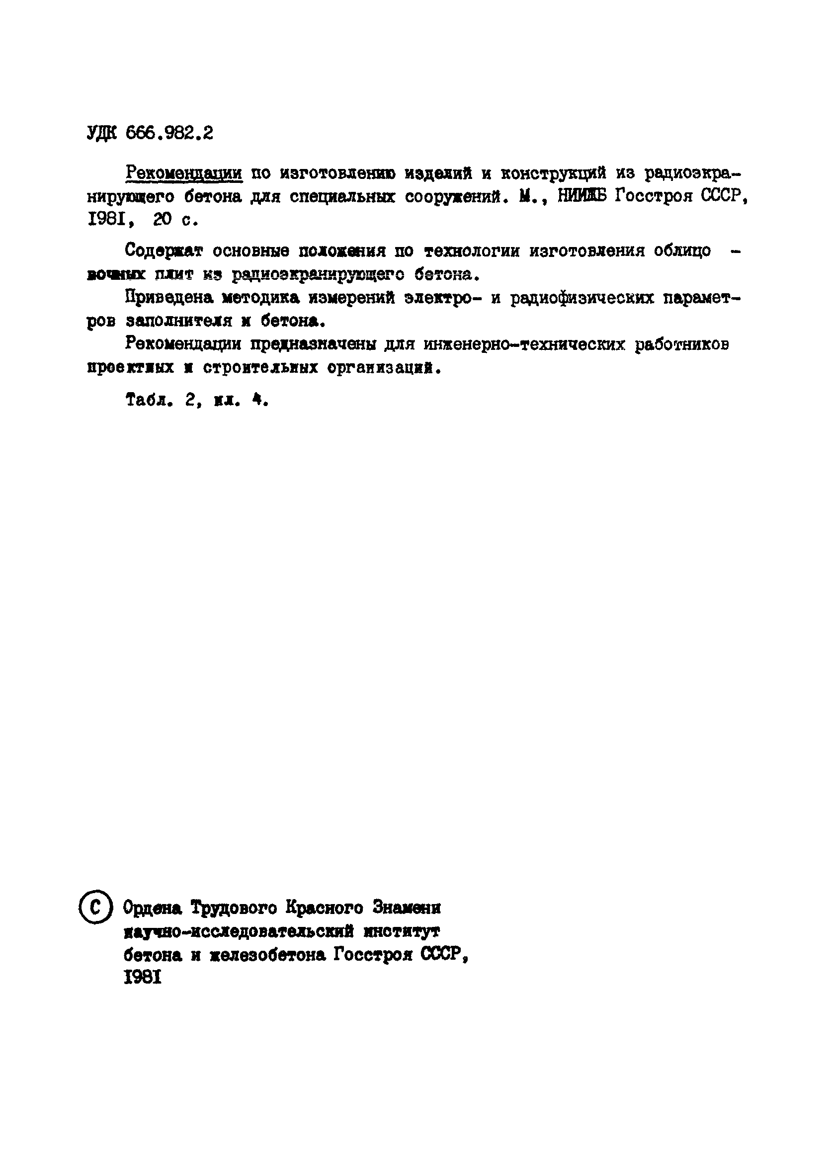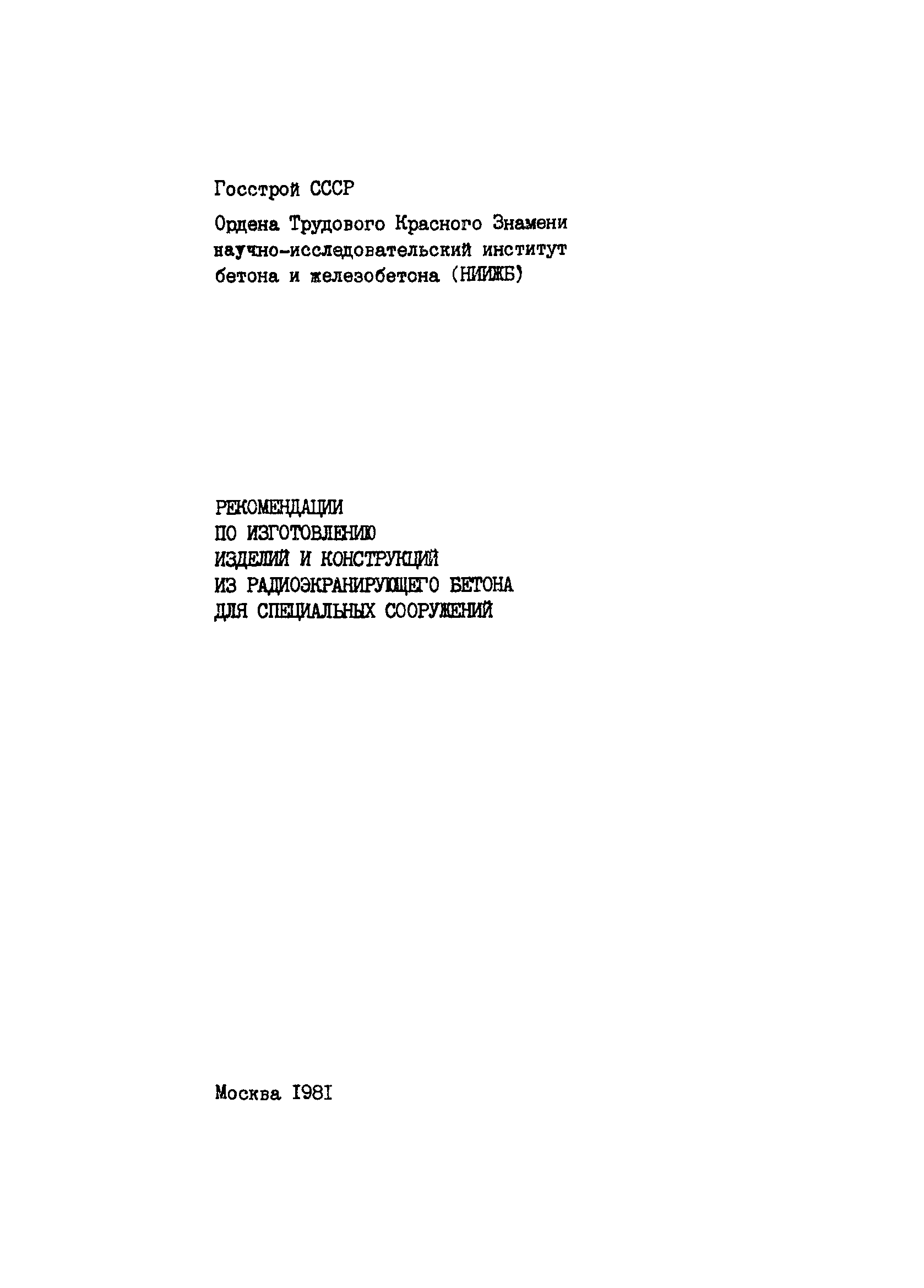 | Название рус.: | Рекомендации по изготовлению изделий и конструкций из радиоэкранирующего бетона для специальных сооружений |
