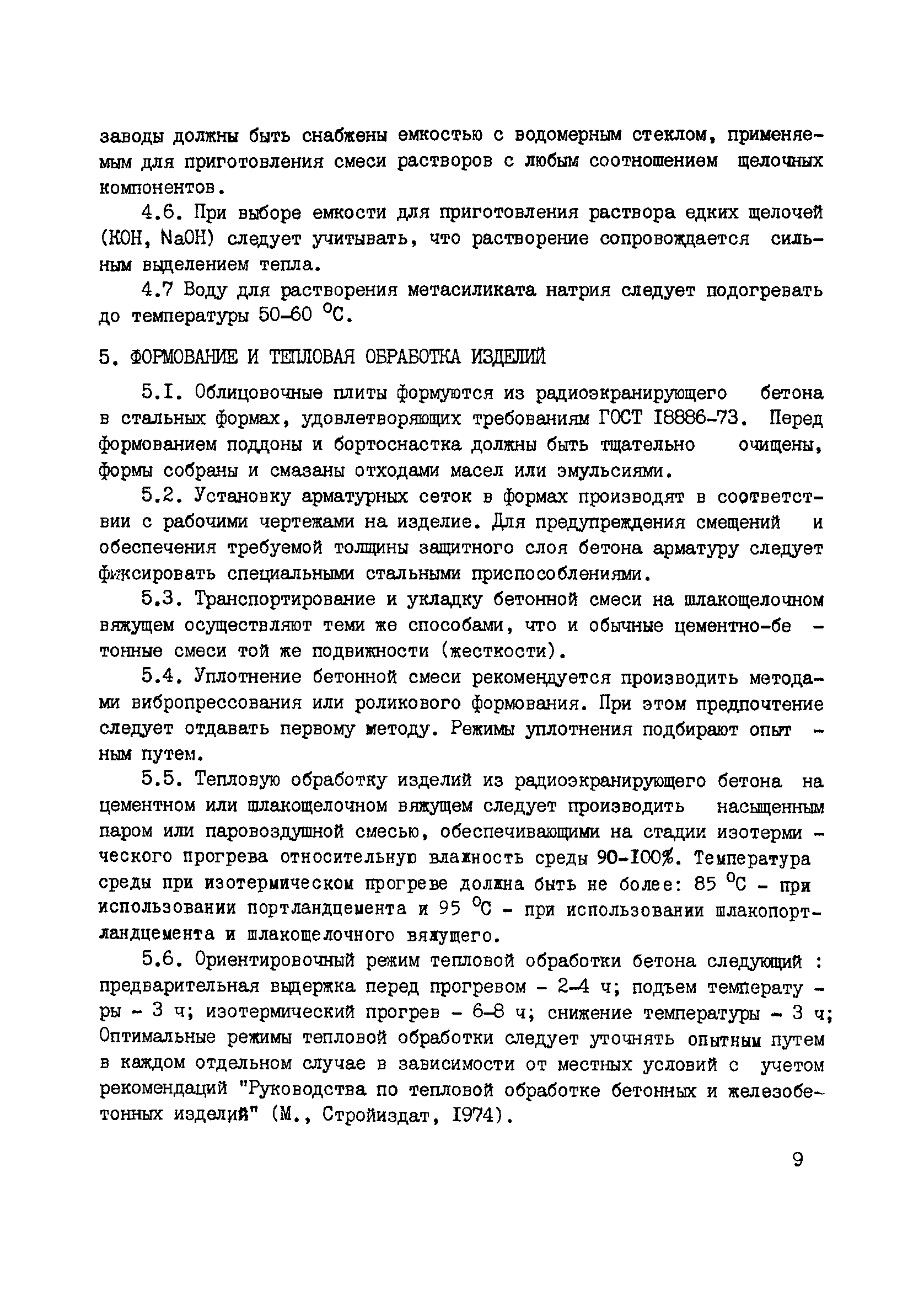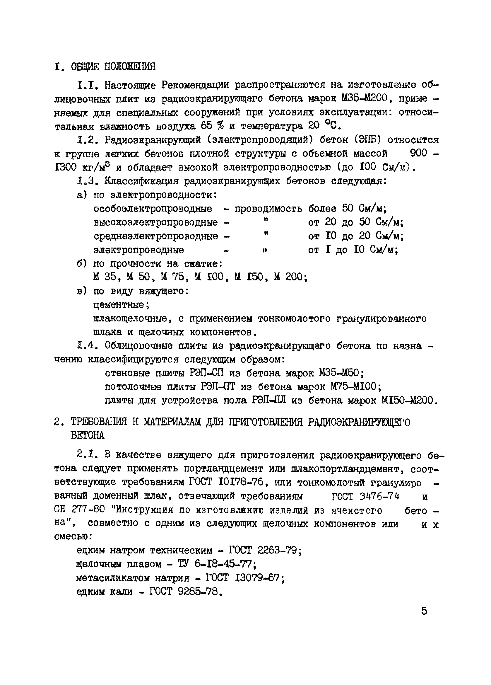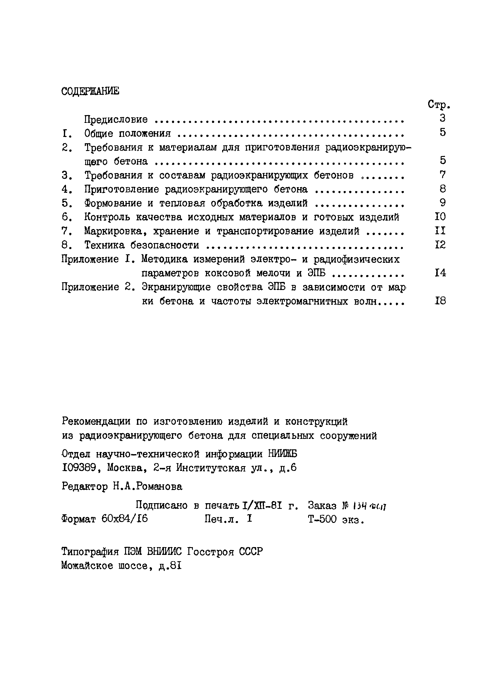 | Оглавление: | Предисловие 1. Общие положения 2. Требования к материалам для приготовления радиоэкранирующего бетона 3. Требования к составам радиоэкранирующих бетонов 4. Приготовление радиэкранирующего бетона 5. Формование и тепловая обработка изделий 6. Контроль качества исходных материалов и готовых изделий 7. Маркировка, хранение и транспортирование изделий 8. Техника безопасности Приложение 1. Методика измерений электро- и радиофизических параметров коксовой мелочи и ЭПБ Приложение 2. Экранирующие свойства ЭПБ в зависимости от марки бетона и частоты электромагнитных волн |