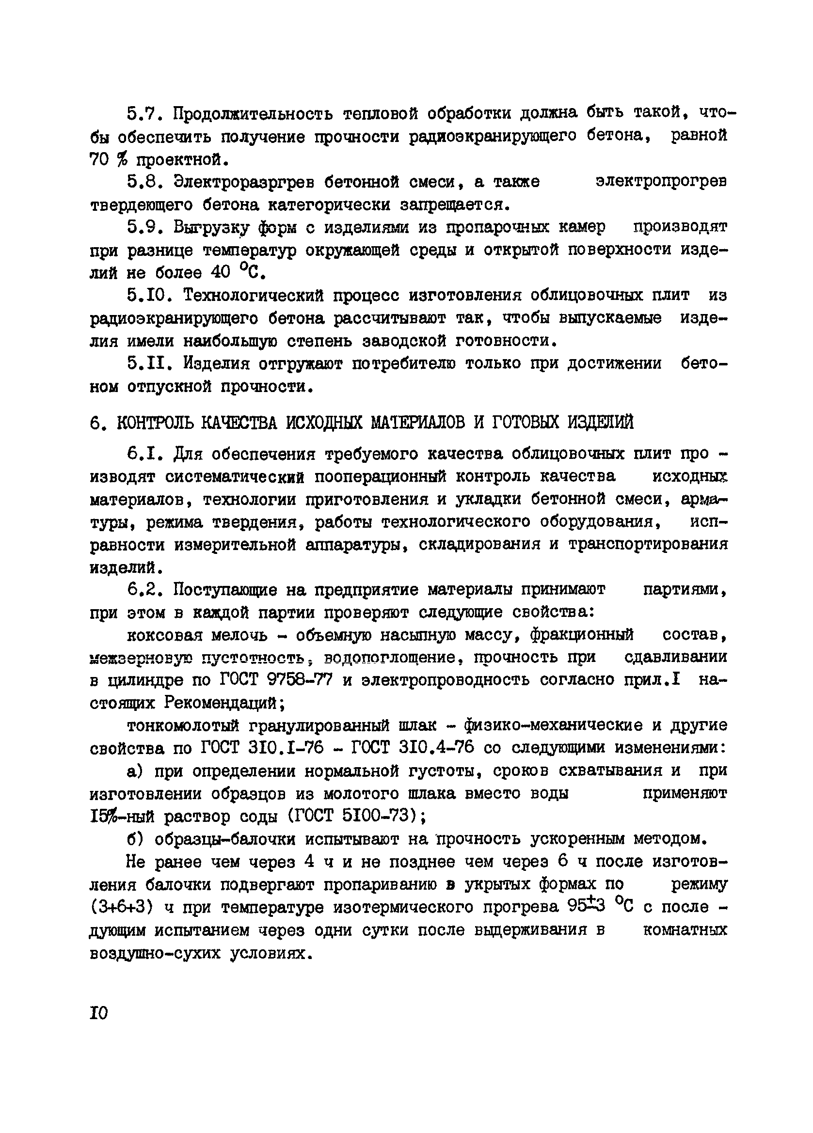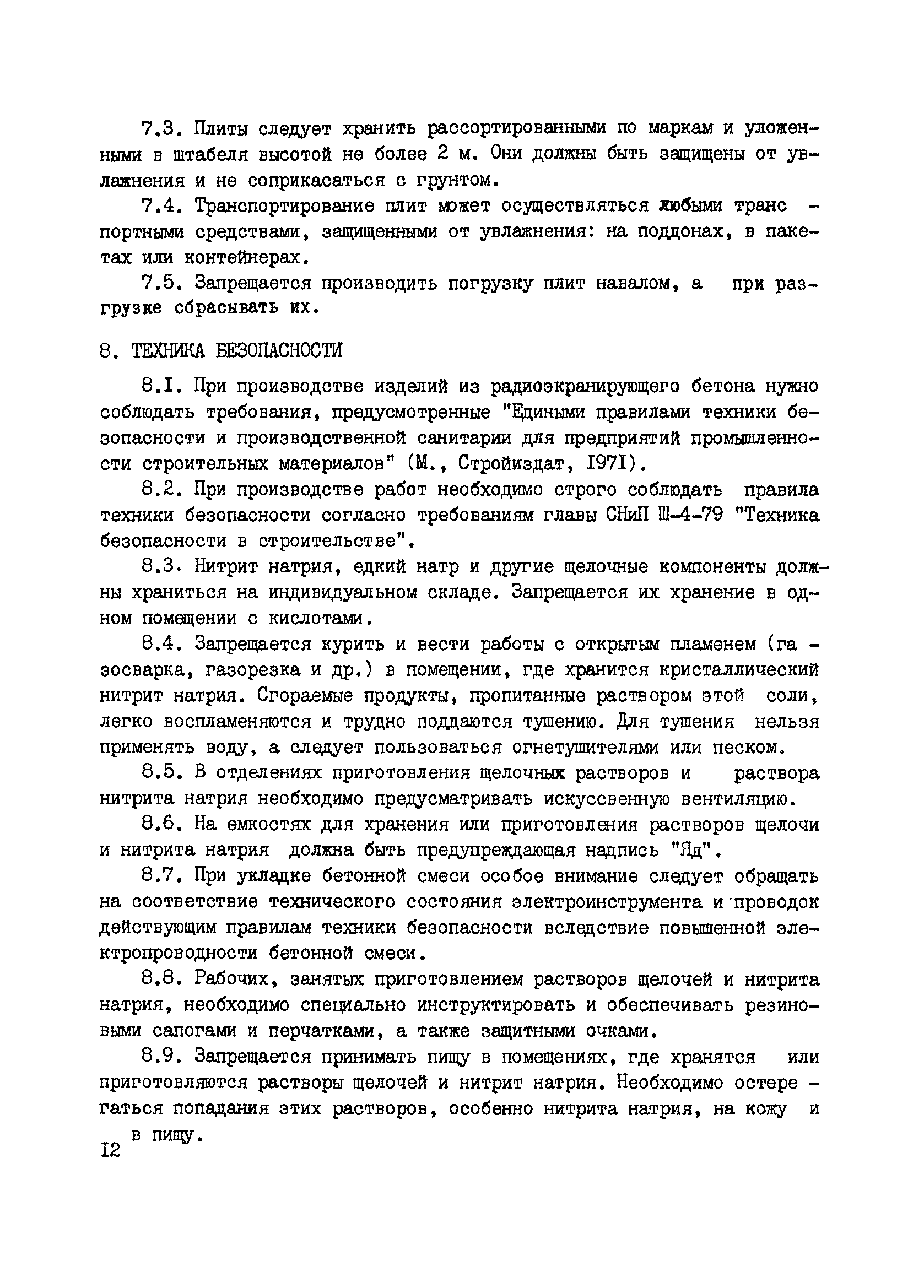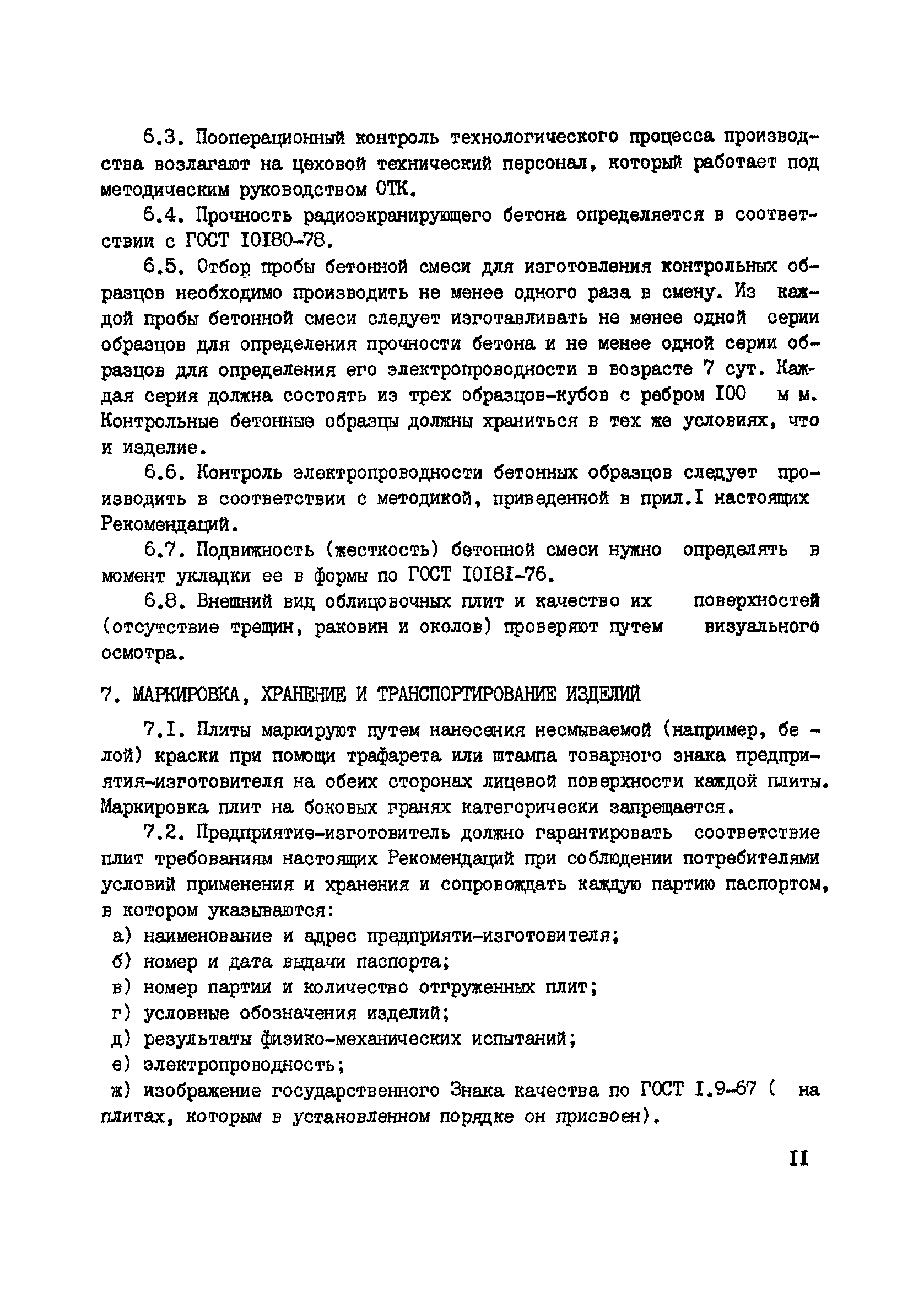 | Оглавление: | Предисловие 1. Общие положения 2. Требования к материалам для приготовления радиоэкранирующего бетона 3. Требования к составам радиоэкранирующих бетонов 4. Приготовление радиэкранирующего бетона 5. Формование и тепловая обработка изделий 6. Контроль качества исходных материалов и готовых изделий 7. Маркировка, хранение и транспортирование изделий 8. Техника безопасности Приложение 1. Методика измерений электро- и радиофизических параметров коксовой мелочи и ЭПБ Приложение 2. Экранирующие свойства ЭПБ в зависимости от марки бетона и частоты электромагнитных волн |