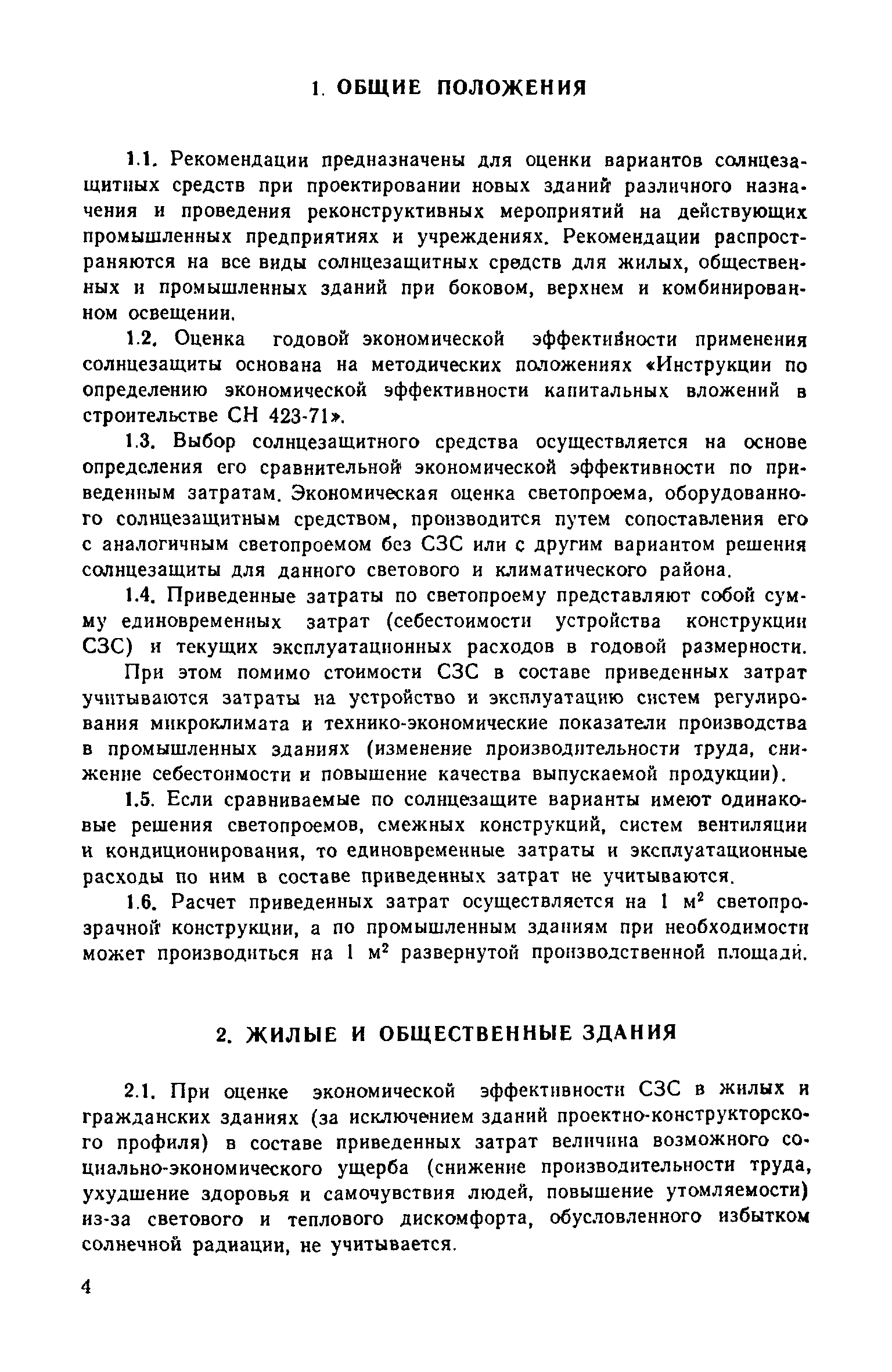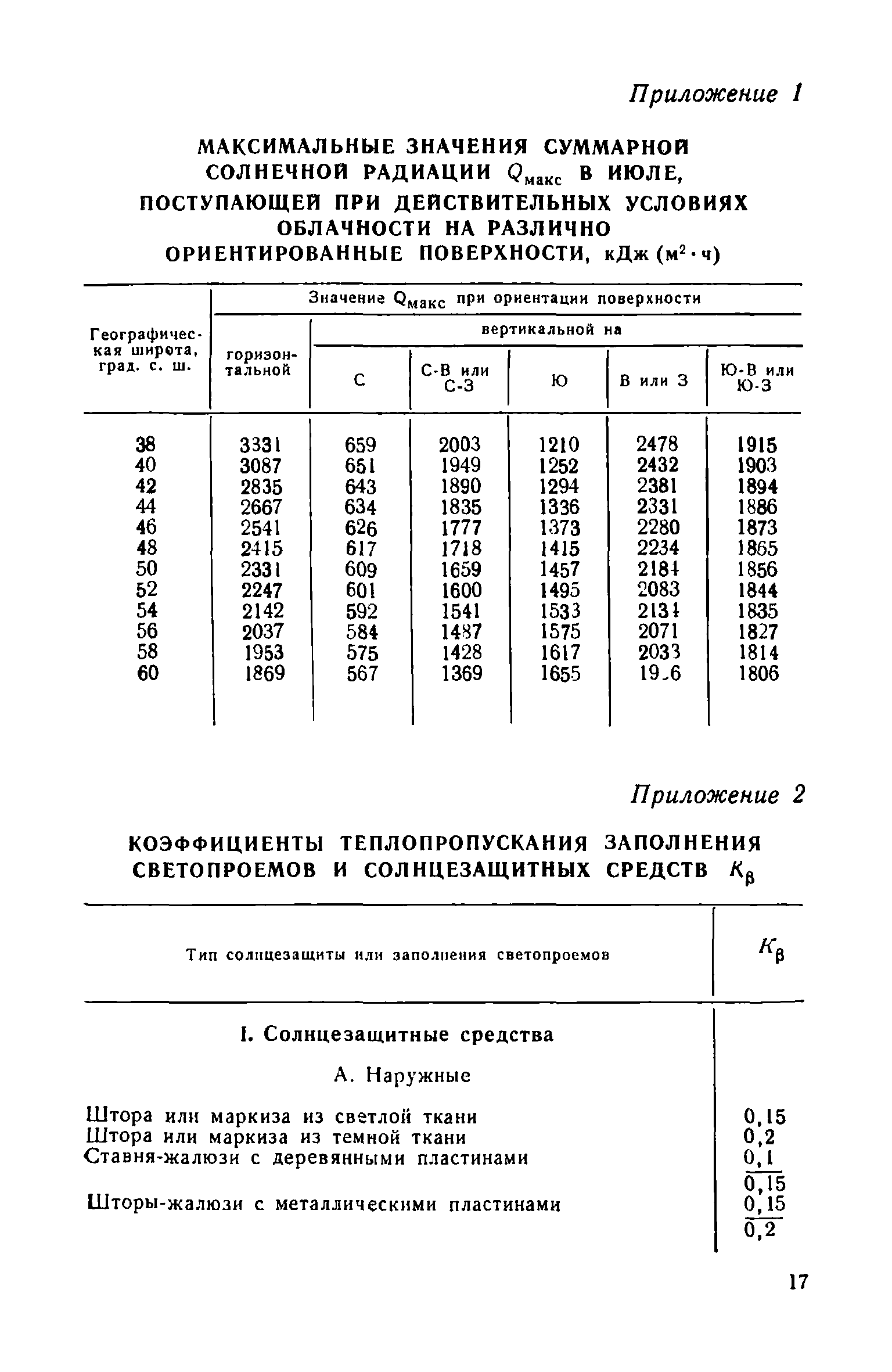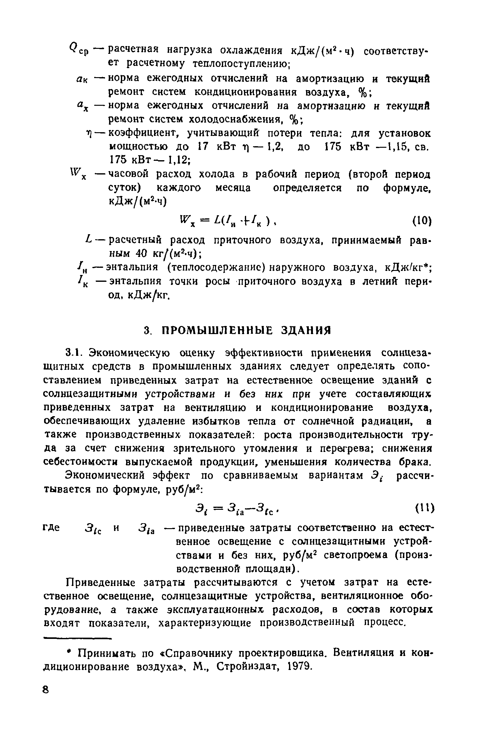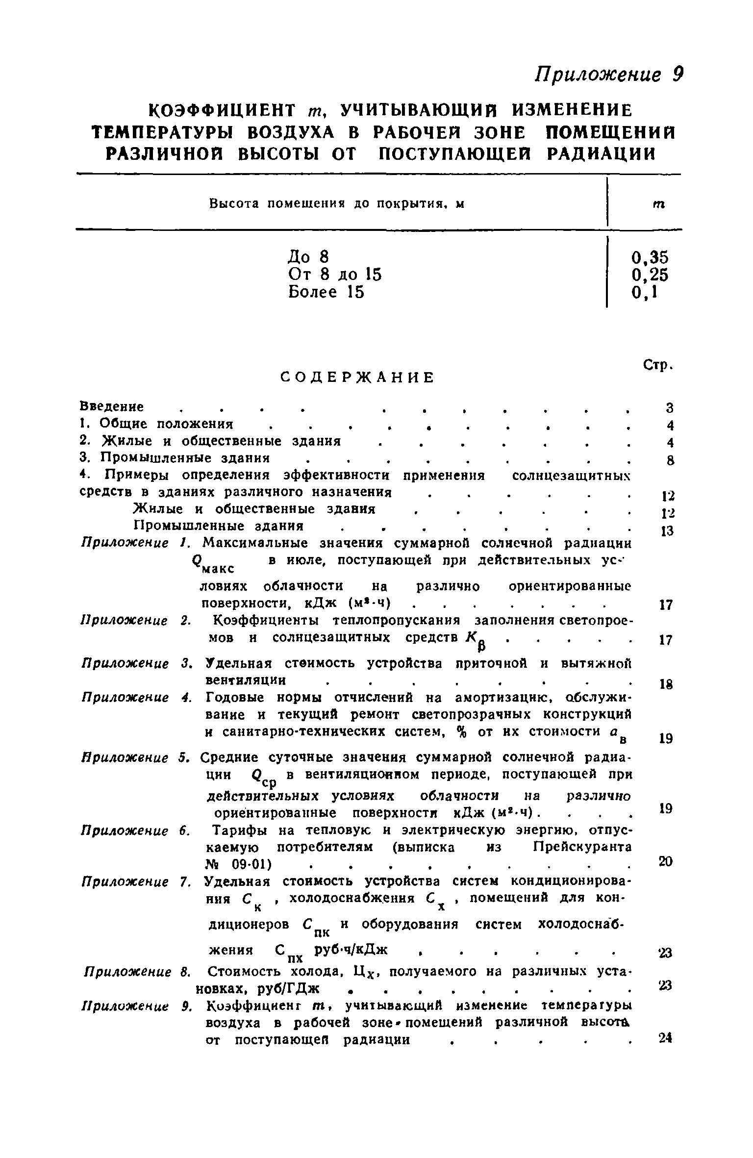 Рекомендации по технико-экономической оценке солнцезащитных средств в зданиях различного назначения| Статус: | действует | | Название рус.: | Рекомендации по технико-экономической оценке солнцезащитных средств в зданиях различного назначения | | Дата добавления в базу: | 01.09.2013 | | Дата актуализации: | 01.01.2021 | | Область применения: | В документе изложены методические рекомендации по технико-экономическому обоснованию применения солнцезащитных средств в жилых, общественных и промышленных зданиях. | | Оглавление: | Введение 1. Общие положения 2. Жилые и общественные здания 3. Промышленные здания 4. Примеры определения эффективности применения солнцезащитных средств в зданиях различного назначения Жилые и общественные здания Промышленные здания Приложение 1. Максимальные значения суммарной солнечной радиации Qмакс в июле, поступающей при действительных условиях облачности на различно ориентированные поверхности, кДж (м2.ч) Приложение 2. Коэффициенты теплопропускания заполнения светопроемов и солнцезащитных средств Положение 3. Удельная стоимость устройства приточной и вытяжной вентиляции Приложение 4. Годовые нормы отчислений на амортизацию, обслуживание и текущий ремонт светопрозрачных конструкций и санитарно-технических систем, % от их стоимости Приложение 5. Средние суточные значения суммарной солнечной радиации Qср в вентиляционном периоде, поступающей при действительных условиях облачности на различно ориентированные поверхностях кДж (м2.ч) Приложение 6. Тарифы на тепловую и электрическую энергию, отпускаемую потребителям (выписка из Прейскуранта № 09-01) Приложение 7. Удельная стоимость устройства систем кондиционирования Ск, холодоснабжения Сх, помещений для кондиционеров Спк и оборудования систем холодоснабжения Спх руб.ч/кДж Приложение 8. Стоимость холода Цх, получаемого на различных установках, руб/ГДж Приложение 9. Коэффициент m. Учитывающий изменение температуры воздуха в рабочей зоне- помещений различной высотs от поступающей радиации | | Разработан: | НИИСФ Госстроя СССР
