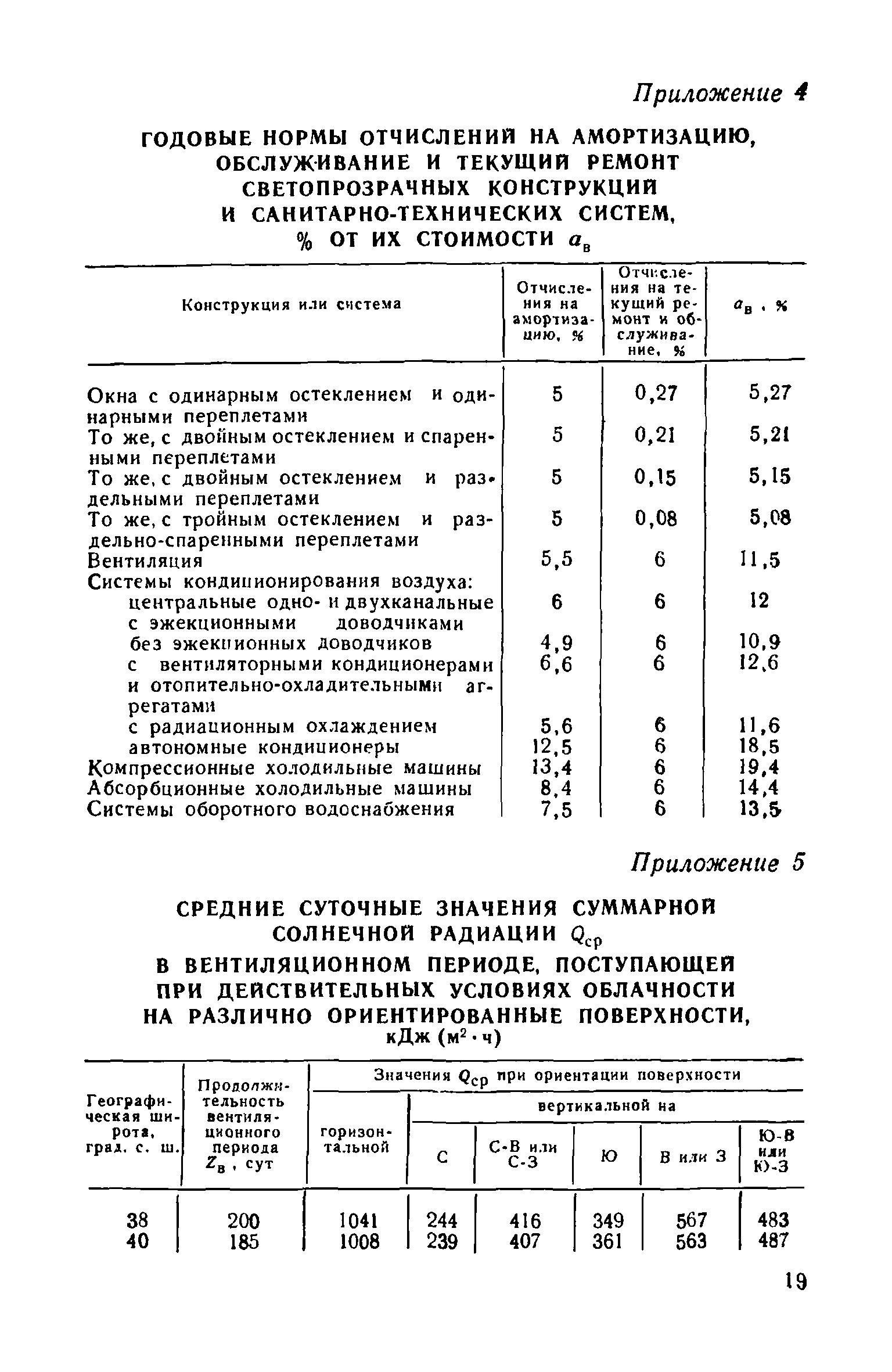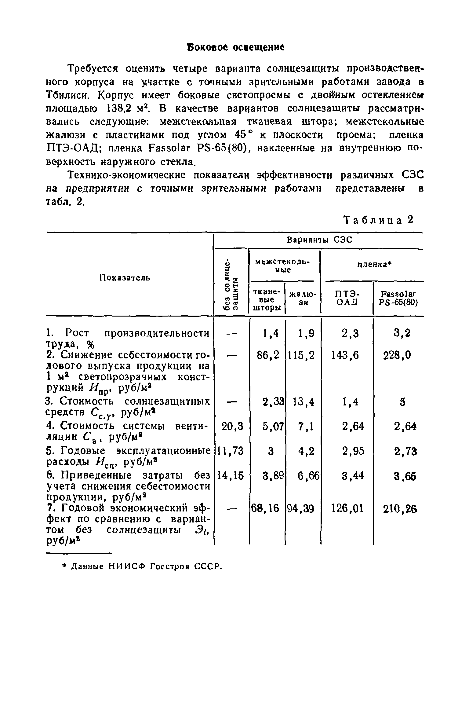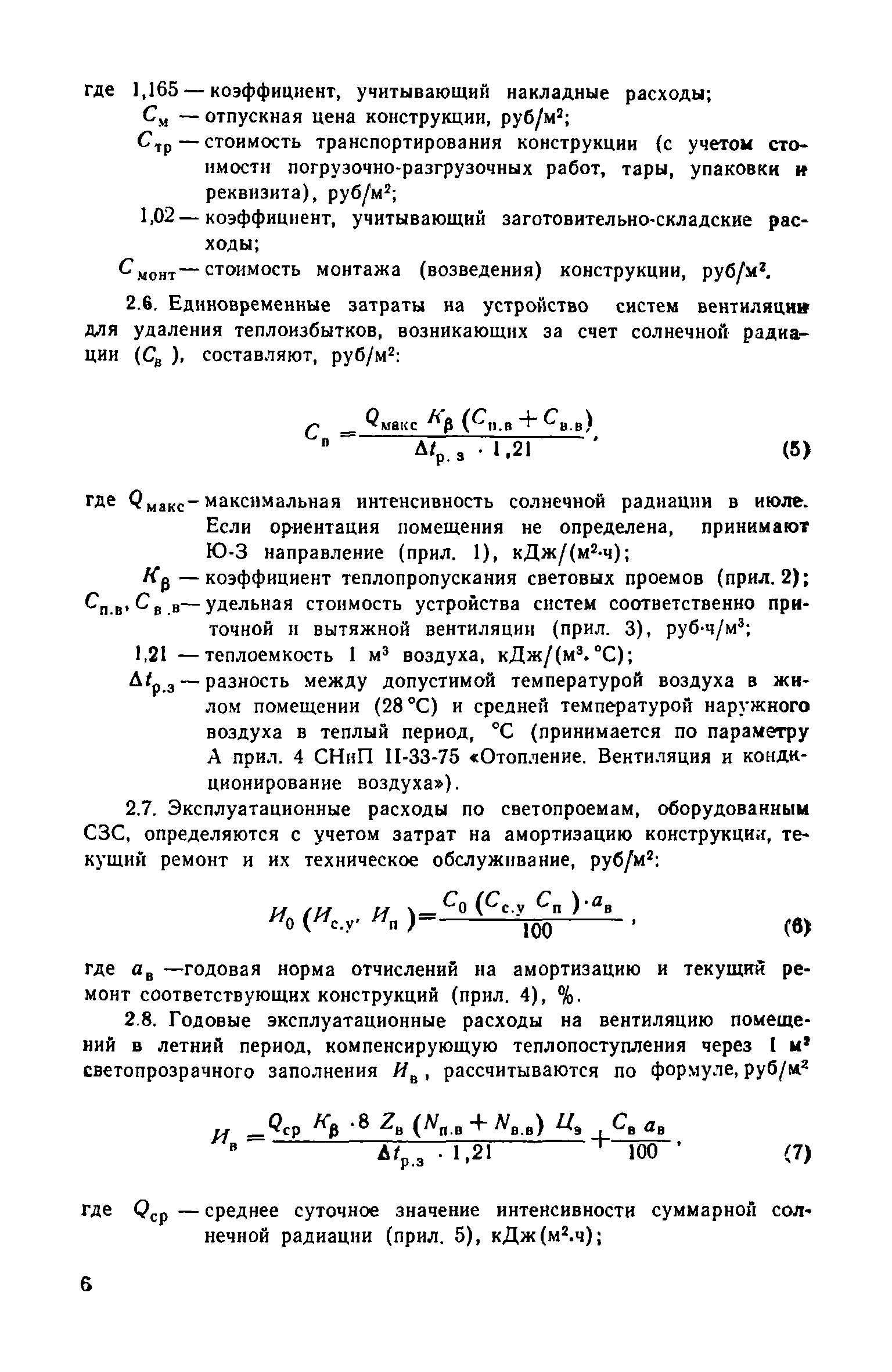 Рекомендации по технико-экономической оценке солнцезащитных средств в зданиях различного назначения| Статус: | действует | | Название рус.: | Рекомендации по технико-экономической оценке солнцезащитных средств в зданиях различного назначения | | Дата добавления в базу: | 01.09.2013 | | Дата актуализации: | 01.01.2021 | | Область применения: | В документе изложены методические рекомендации по технико-экономическому обоснованию применения солнцезащитных средств в жилых, общественных и промышленных зданиях. | | Оглавление: | Введение 1. Общие положения 2. Жилые и общественные здания 3. Промышленные здания 4. Примеры определения эффективности применения солнцезащитных средств в зданиях различного назначения Жилые и общественные здания Промышленные здания Приложение 1. Максимальные значения суммарной солнечной радиации Qмакс в июле, поступающей при действительных условиях облачности на различно ориентированные поверхности, кДж (м2.ч) Приложение 2. Коэффициенты теплопропускания заполнения светопроемов и солнцезащитных средств Положение 3. Удельная стоимость устройства приточной и вытяжной вентиляции Приложение 4. Годовые нормы отчислений на амортизацию, обслуживание и текущий ремонт светопрозрачных конструкций и санитарно-технических систем, % от их стоимости Приложение 5. Средние суточные значения суммарной солнечной радиации Qср в вентиляционном периоде, поступающей при действительных условиях облачности на различно ориентированные поверхностях кДж (м2.ч) Приложение 6. Тарифы на тепловую и электрическую энергию, отпускаемую потребителям (выписка из Прейскуранта № 09-01) Приложение 7. Удельная стоимость устройства систем кондиционирования Ск, холодоснабжения Сх, помещений для кондиционеров Спк и оборудования систем холодоснабжения Спх руб.ч/кДж Приложение 8. Стоимость холода Цх, получаемого на различных установках, руб/ГДж Приложение 9. Коэффициент m. Учитывающий изменение температуры воздуха в рабочей зоне- помещений различной высотs от поступающей радиации | | Разработан: | НИИСФ Госстроя СССР