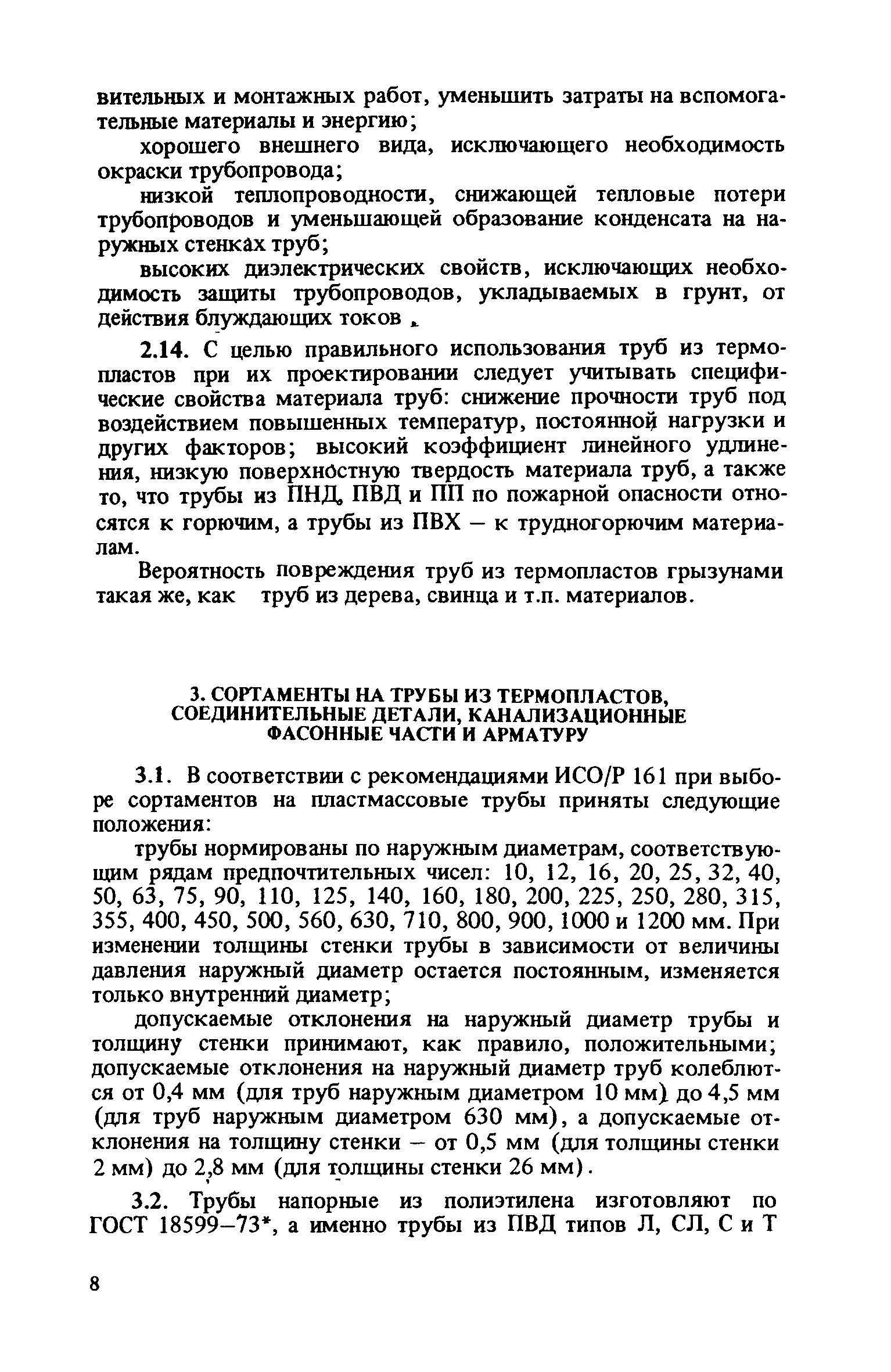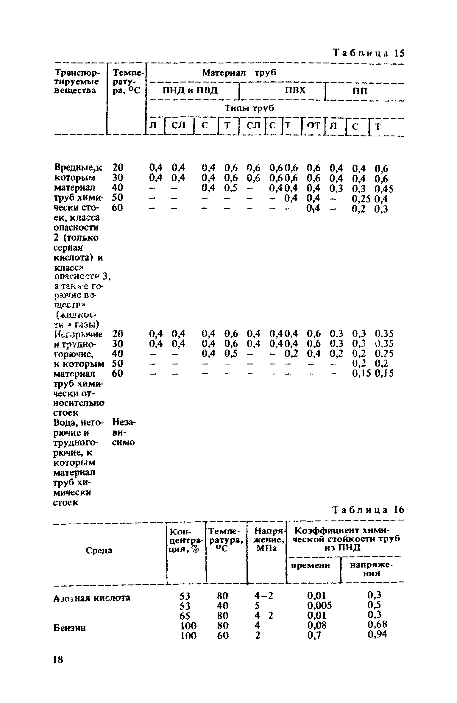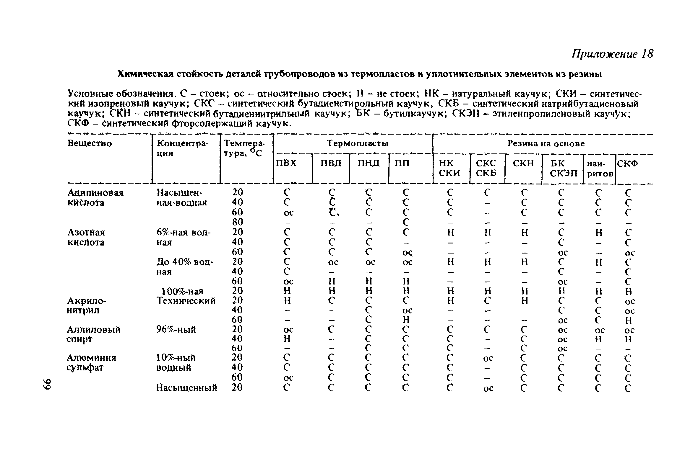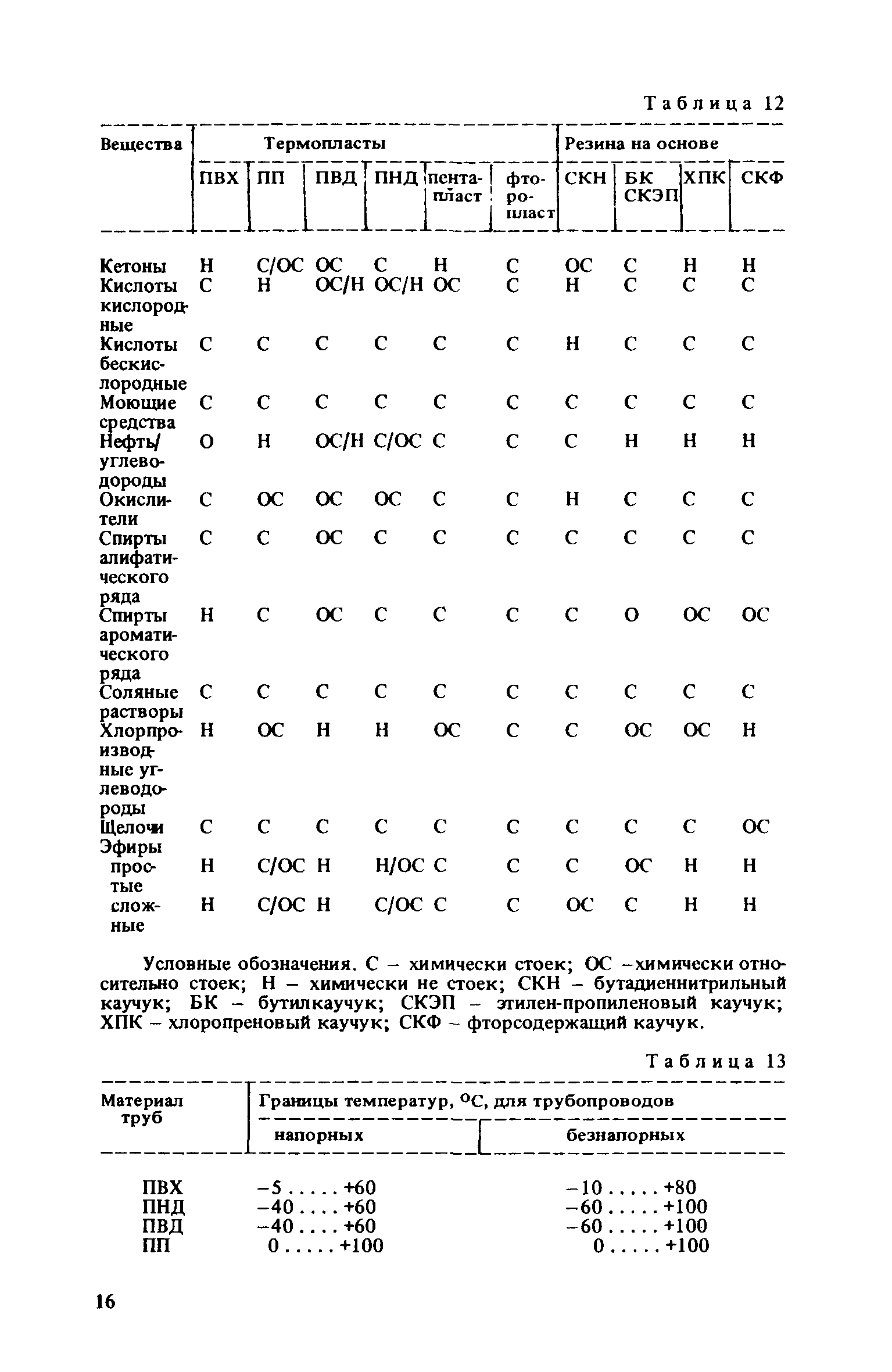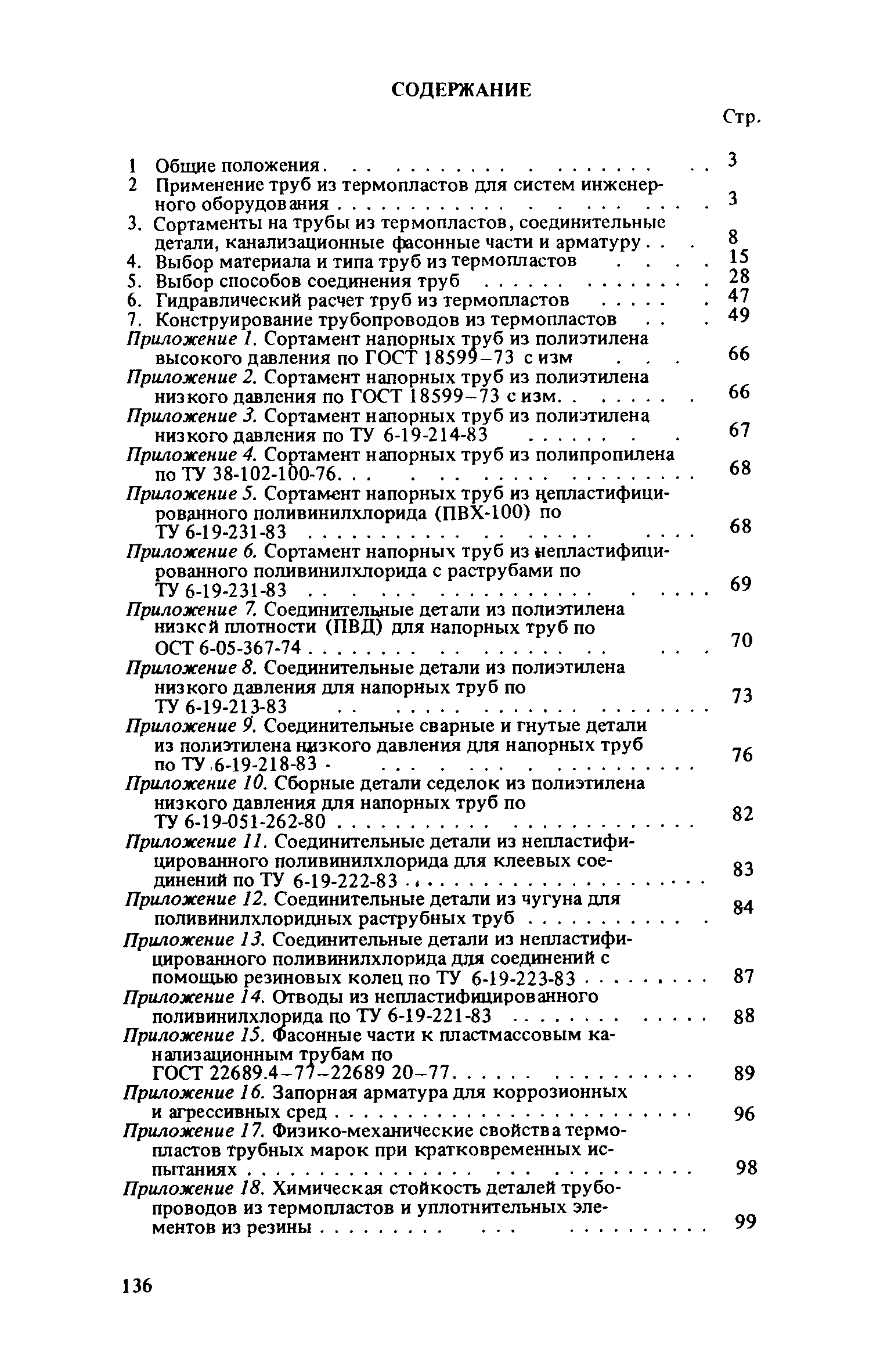 | Оглавление: | 1. Общие положения 2. Применение труб из термопластов для систем инженерного оборудования 3. Сортаменты на трубы из термопластов, соединительные детали, канализационные фасонные части и арматуру 4. Выбор материала и типа труб из термопластов 5. Выбор способов соединения труб 6. Гидравлический расчет труб из термопластов 7. Конструирование трубопроводов из термопластов Приложение 1. Сортамент напорных труб из полиэтилена высокого давления по ГОСТ 18599-73 с изменениями Приложение 2. Сортамент напорных труб из полиэтилена низкого давления по ГОСТ 18599-73 с изменениями Приложение 3. Сортамент напорных труб из полиэтилена низкого давления по ТУ 6-19-214-83 Приложение 4. Сортамент напорных труб из полипропилена по ТУ 38-102-100-76 Приложение 5. Сортамент напорных труб из непластифицированного поливинилхлорида (ПВХ-100) по ТУ 6-19-231-83 Приложение 6. Сортамент напорных труб из непластифицированного поливинилхлорида с раструбами по ТУ 6-19-231-83 Приложение 7. Соединительные детали из полиэтилена низкой плотности (ПВД) для напорных труб по ОСТ 6-05-367-74 Приложение 8. Соединительные детали из полиэтилена низкого давления для напорных труб по ТУ 6-19-213-83 Приложение 9. Соединительные сварные и гнутые детали из полиэтилена низкого давления для напорных труб по ТУ 6-19-218-83 Приложение 10. Сборные детали седелок из полиэтилена низкого давления для напорных труб по ТУ 6-19-051-262-80 Приложение 11. Соединительные детали из непластифицированного поливинилхлорида для клеевых соединений по ТУ 6-19-222-83 Приложение 12. Соединительные детали из чугуна для поливинилхлоридных раструбных труб Приложение 13. Соединительные детали из непластифицированного поливинилхлорида для соединений с помощью резиновых колец по ТУ 6-19-223-83 Приложение 14. Отводы из непластифицированного поливинилхлорида по ТУ 6-19-221-83 Приложение 15. Фасонные части к пластмассовым канализационным трубам по ГОСТ 22689.4-77-22689 20-77 Приложение 16. Запорная арматура для коррозионных и агрессивных сред Приложение 17. Физико-механические свойства термопластов трубных марок при кратковременных испытаниях Приложение 18. Химическая стойкость деталей трубопроводов из термопластов и уплотнительных элементов из резины |