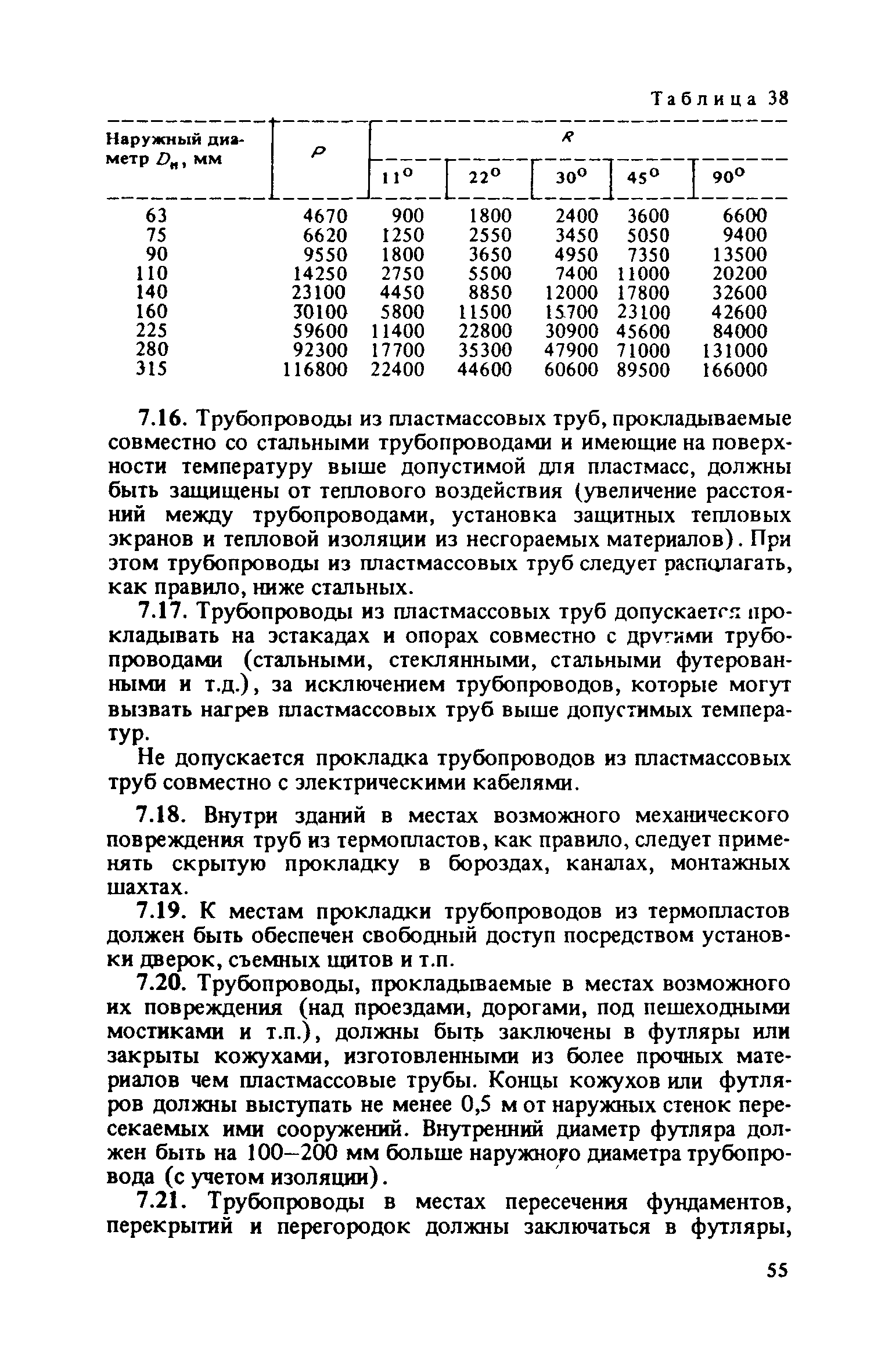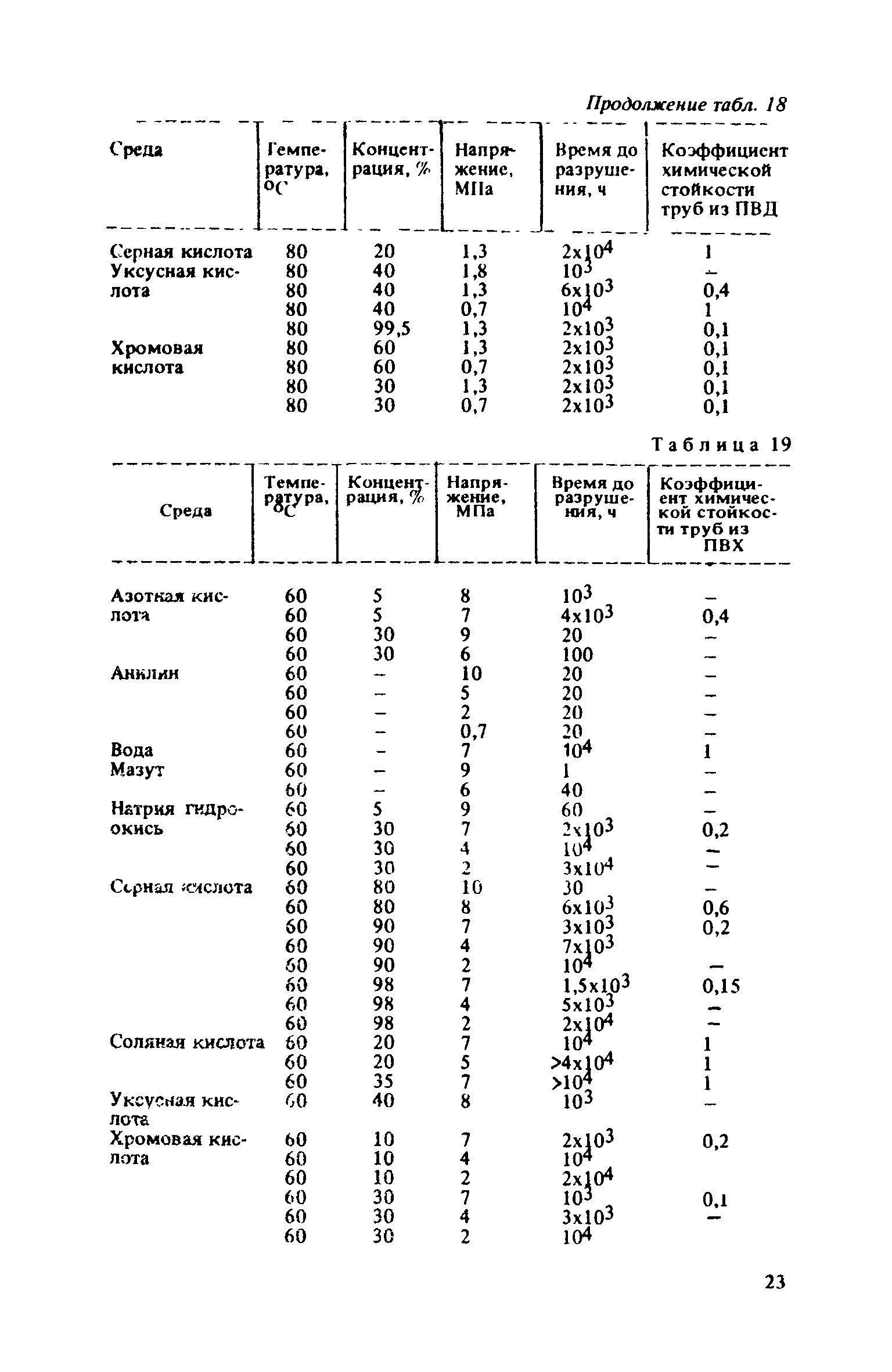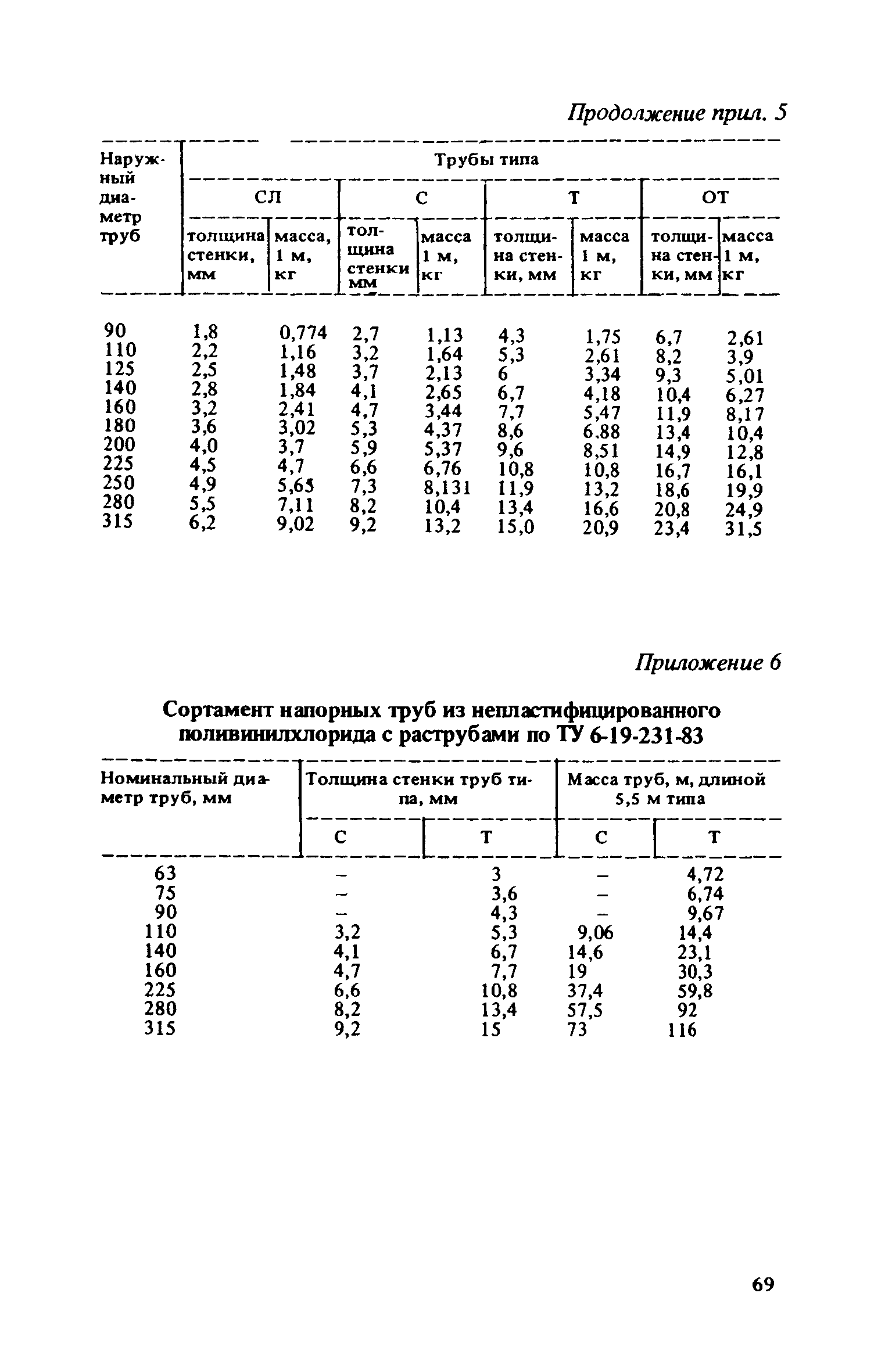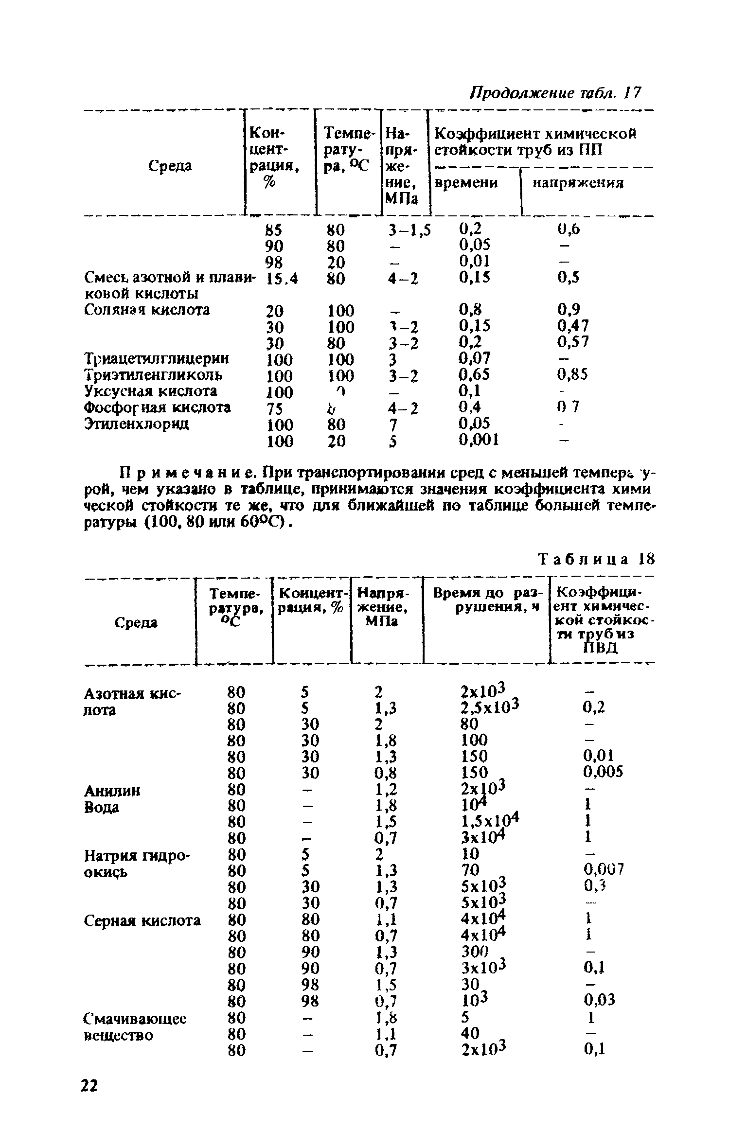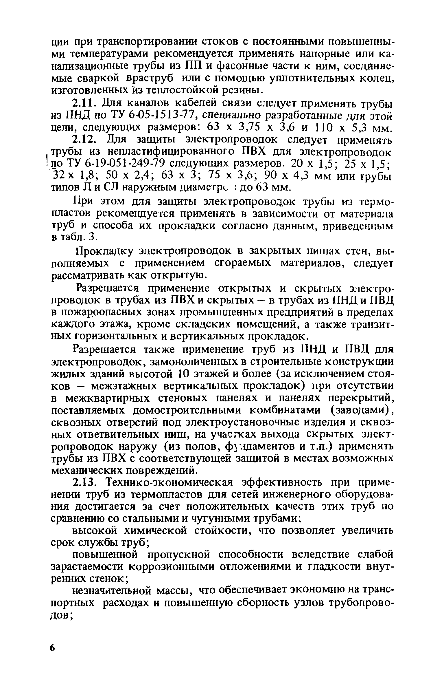 | Оглавление: | 1. Общие положения 2. Применение труб из термопластов для систем инженерного оборудования 3. Сортаменты на трубы из термопластов, соединительные детали, канализационные фасонные части и арматуру 4. Выбор материала и типа труб из термопластов 5. Выбор способов соединения труб 6. Гидравлический расчет труб из термопластов 7. Конструирование трубопроводов из термопластов Приложение 1. Сортамент напорных труб из полиэтилена высокого давления по ГОСТ 18599-73 с изменениями Приложение 2. Сортамент напорных труб из полиэтилена низкого давления по ГОСТ 18599-73 с изменениями Приложение 3. Сортамент напорных труб из полиэтилена низкого давления по ТУ 6-19-214-83 Приложение 4. Сортамент напорных труб из полипропилена по ТУ 38-102-100-76 Приложение 5. Сортамент напорных труб из непластифицированного поливинилхлорида (ПВХ-100) по ТУ 6-19-231-83 Приложение 6. Сортамент напорных труб из непластифицированного поливинилхлорида с раструбами по ТУ 6-19-231-83 Приложение 7. Соединительные детали из полиэтилена низкой плотности (ПВД) для напорных труб по ОСТ 6-05-367-74 Приложение 8. Соединительные детали из полиэтилена низкого давления для напорных труб по ТУ 6-19-213-83 Приложение 9. Соединительные сварные и гнутые детали из полиэтилена низкого давления для напорных труб по ТУ 6-19-218-83 Приложение 10. Сборные детали седелок из полиэтилена низкого давления для напорных труб по ТУ 6-19-051-262-80 Приложение 11. Соединительные детали из непластифицированного поливинилхлорида для клеевых соединений по ТУ 6-19-222-83 Приложение 12. Соединительные детали из чугуна для поливинилхлоридных раструбных труб Приложение 13. Соединительные детали из непластифицированного поливинилхлорида для соединений с помощью резиновых колец по ТУ 6-19-223-83 Приложение 14. Отводы из непластифицированного поливинилхлорида по ТУ 6-19-221-83 Приложение 15. Фасонные части к пластмассовым канализационным трубам по ГОСТ 22689.4-77-22689 20-77 Приложение 16. Запорная арматура для коррозионных и агрессивных сред Приложение 17. Физико-механические свойства термопластов трубных марок при кратковременных испытаниях Приложение 18. Химическая стойкость деталей трубопроводов из термопластов и уплотнительных элементов из резины |