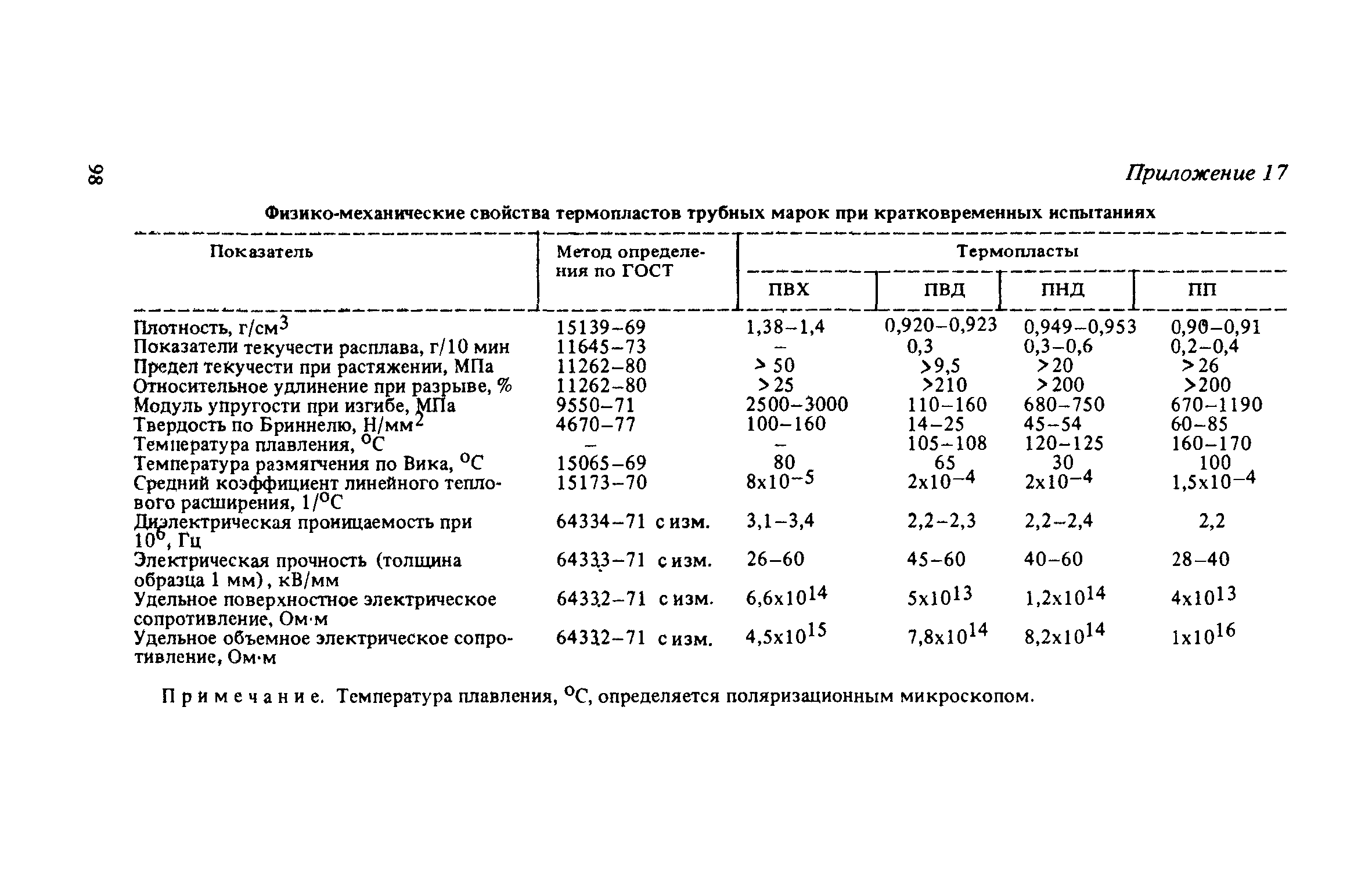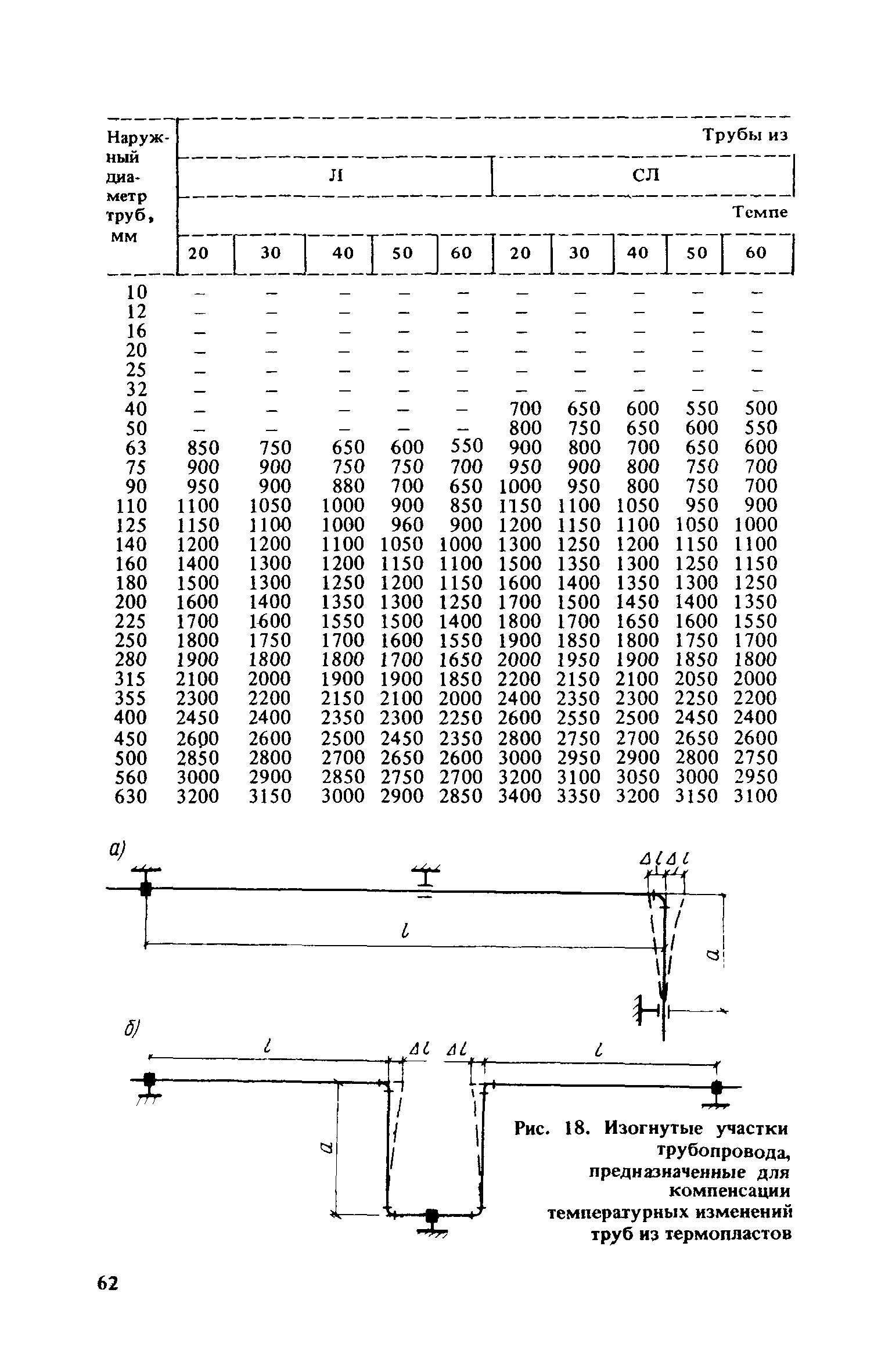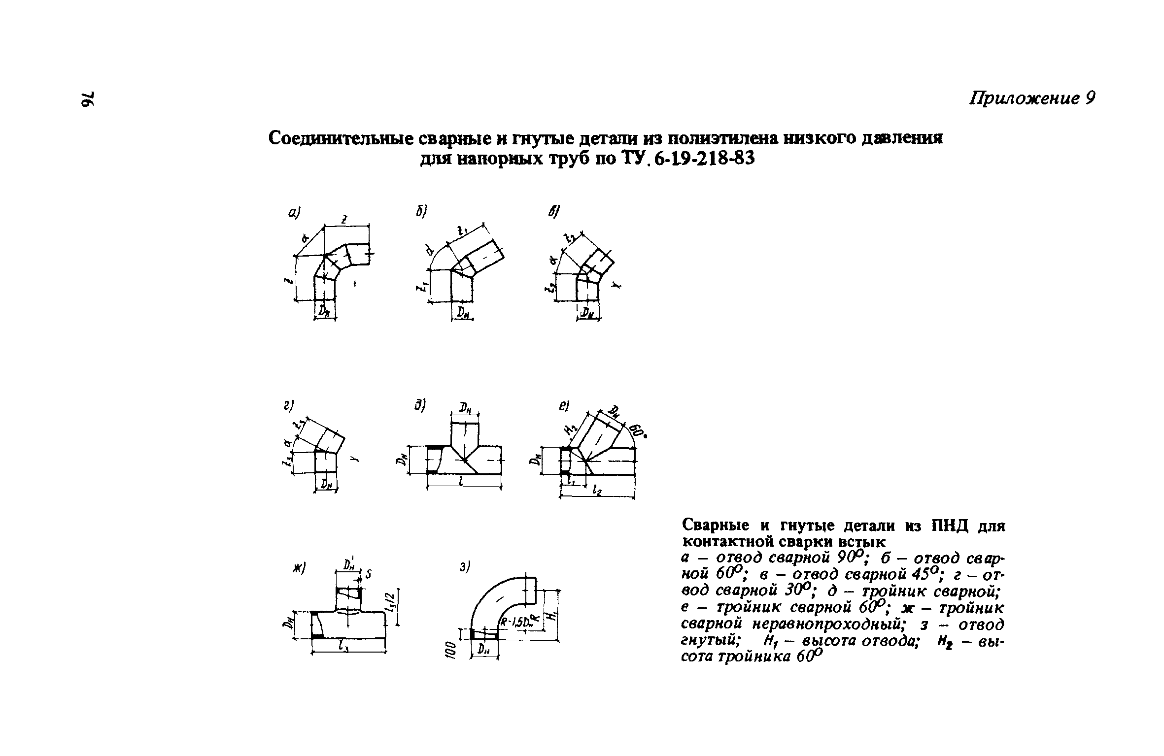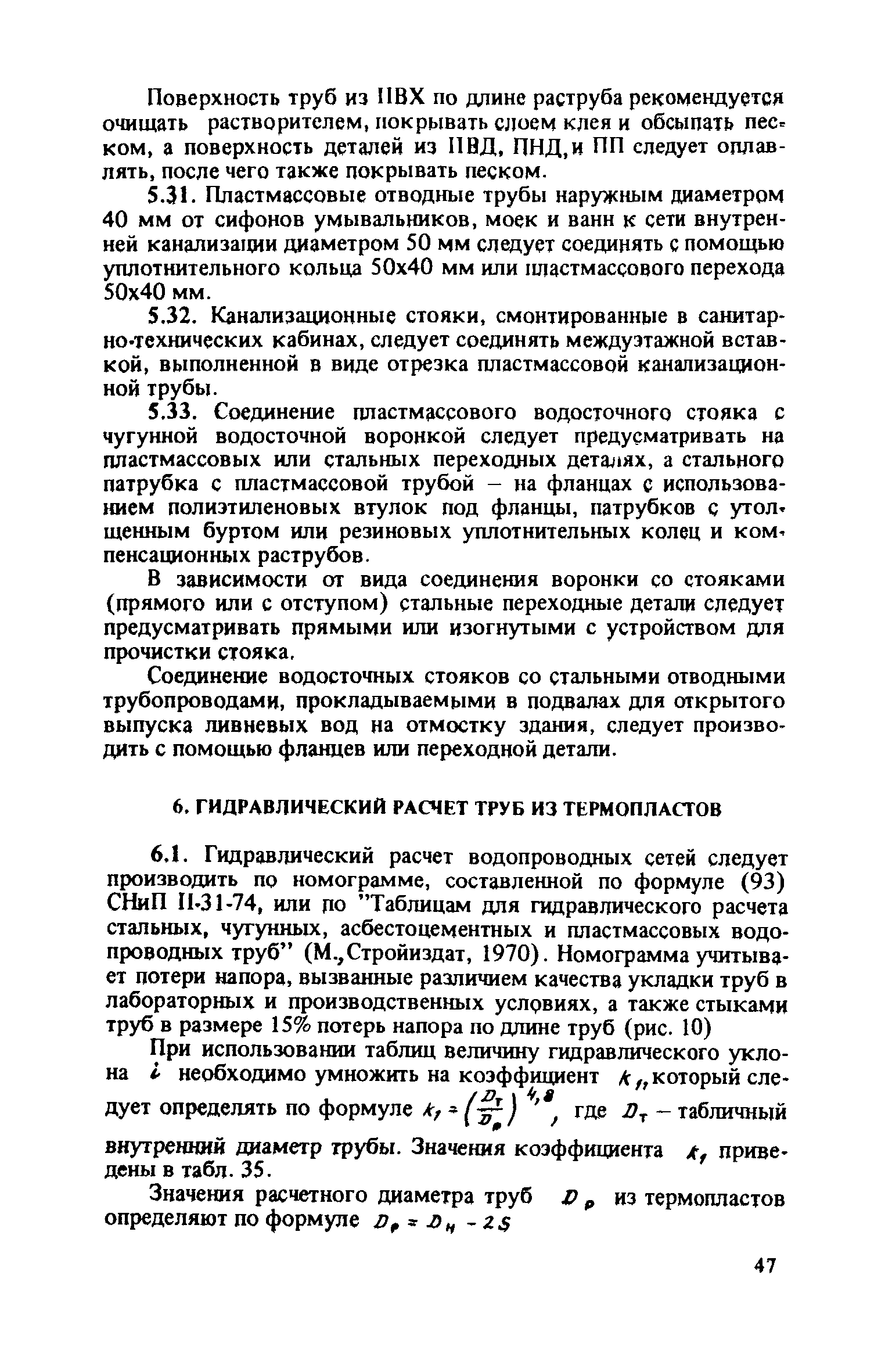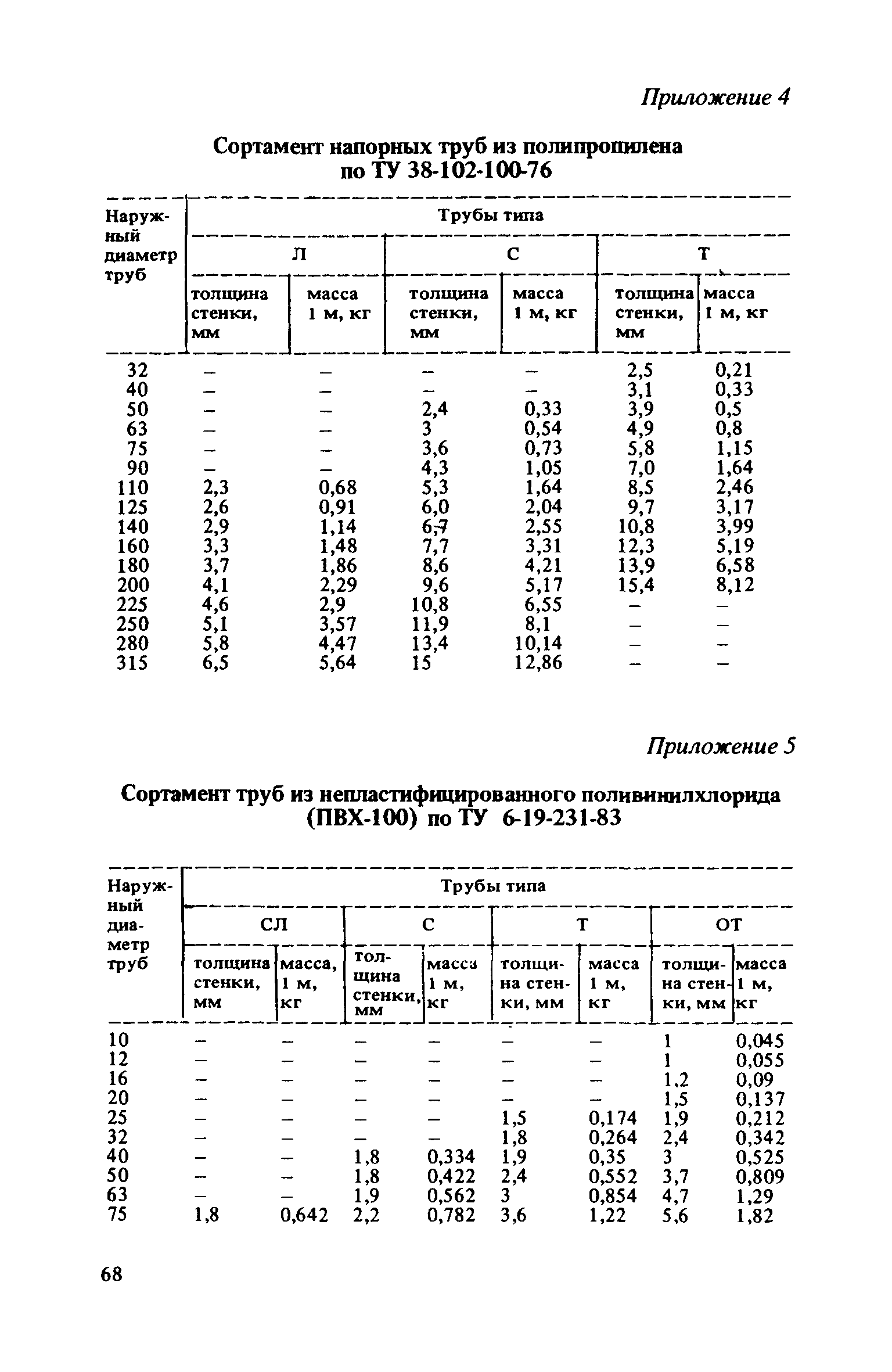 | Оглавление: | 1. Общие положения 2. Применение труб из термопластов для систем инженерного оборудования 3. Сортаменты на трубы из термопластов, соединительные детали, канализационные фасонные части и арматуру 4. Выбор материала и типа труб из термопластов 5. Выбор способов соединения труб 6. Гидравлический расчет труб из термопластов 7. Конструирование трубопроводов из термопластов Приложение 1. Сортамент напорных труб из полиэтилена высокого давления по ГОСТ 18599-73 с изменениями Приложение 2. Сортамент напорных труб из полиэтилена низкого давления по ГОСТ 18599-73 с изменениями Приложение 3. Сортамент напорных труб из полиэтилена низкого давления по ТУ 6-19-214-83 Приложение 4. Сортамент напорных труб из полипропилена по ТУ 38-102-100-76 Приложение 5. Сортамент напорных труб из непластифицированного поливинилхлорида (ПВХ-100) по ТУ 6-19-231-83 Приложение 6. Сортамент напорных труб из непластифицированного поливинилхлорида с раструбами по ТУ 6-19-231-83 Приложение 7. Соединительные детали из полиэтилена низкой плотности (ПВД) для напорных труб по ОСТ 6-05-367-74 Приложение 8. Соединительные детали из полиэтилена низкого давления для напорных труб по ТУ 6-19-213-83 Приложение 9. Соединительные сварные и гнутые детали из полиэтилена низкого давления для напорных труб по ТУ 6-19-218-83 Приложение 10. Сборные детали седелок из полиэтилена низкого давления для напорных труб по ТУ 6-19-051-262-80 Приложение 11. Соединительные детали из непластифицированного поливинилхлорида для клеевых соединений по ТУ 6-19-222-83 Приложение 12. Соединительные детали из чугуна для поливинилхлоридных раструбных труб Приложение 13. Соединительные детали из непластифицированного поливинилхлорида для соединений с помощью резиновых колец по ТУ 6-19-223-83 Приложение 14. Отводы из непластифицированного поливинилхлорида по ТУ 6-19-221-83 Приложение 15. Фасонные части к пластмассовым канализационным трубам по ГОСТ 22689.4-77-22689 20-77 Приложение 16. Запорная арматура для коррозионных и агрессивных сред Приложение 17. Физико-механические свойства термопластов трубных марок при кратковременных испытаниях Приложение 18. Химическая стойкость деталей трубопроводов из термопластов и уплотнительных элементов из резины |