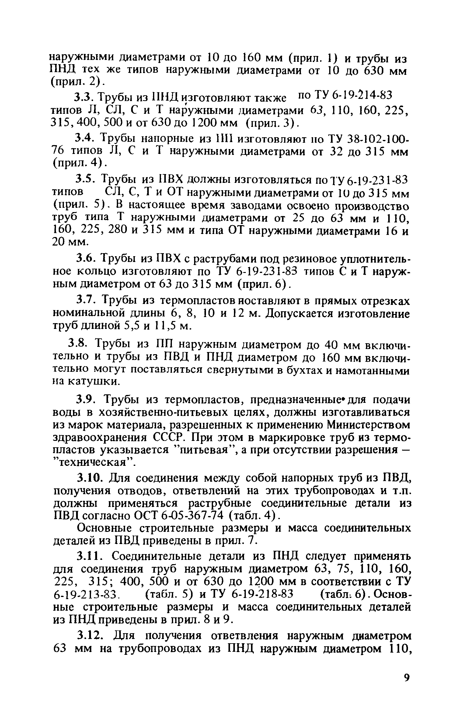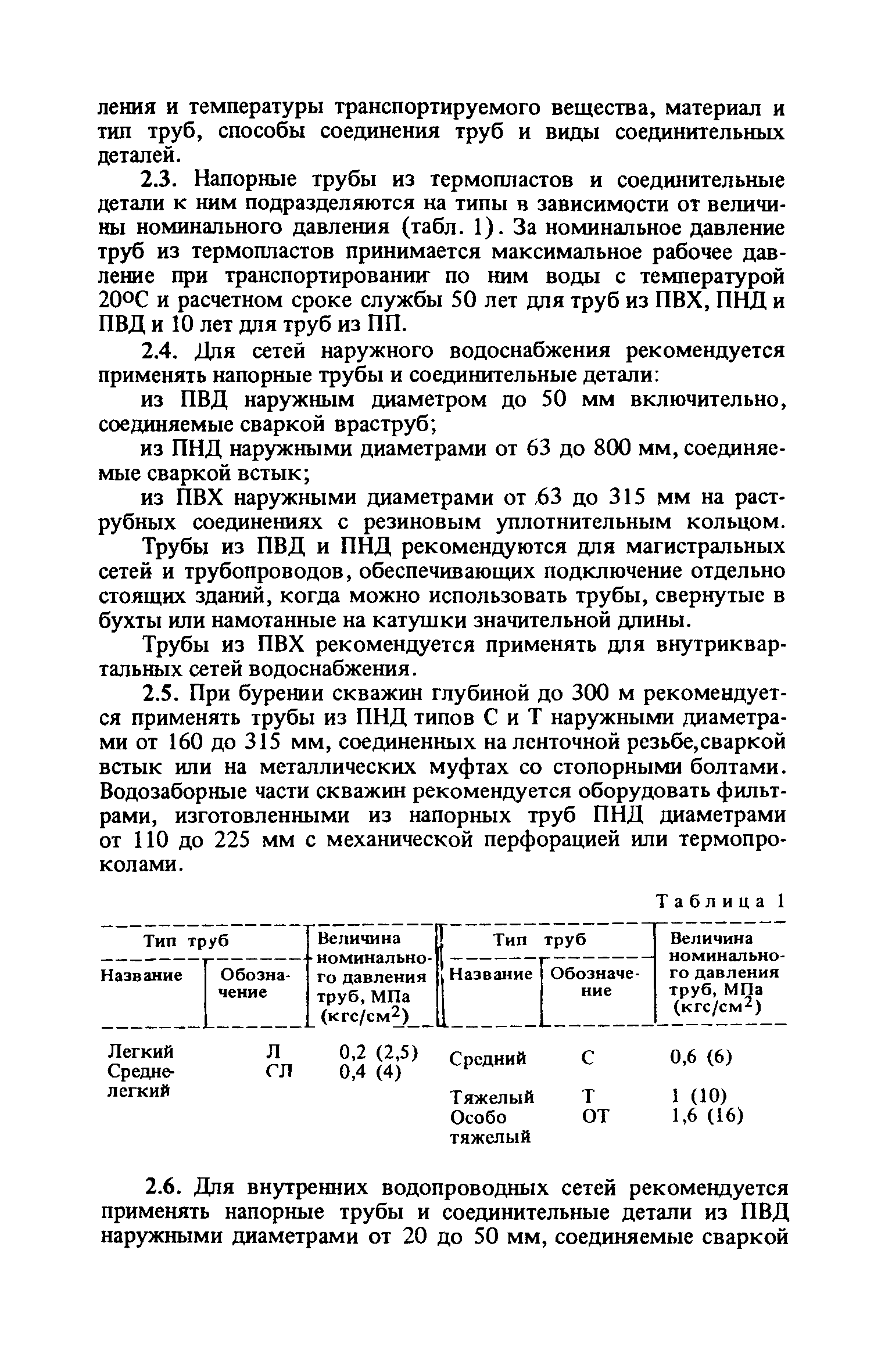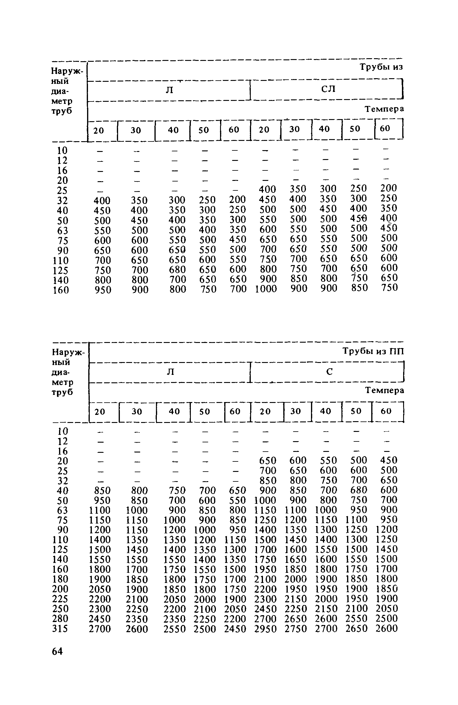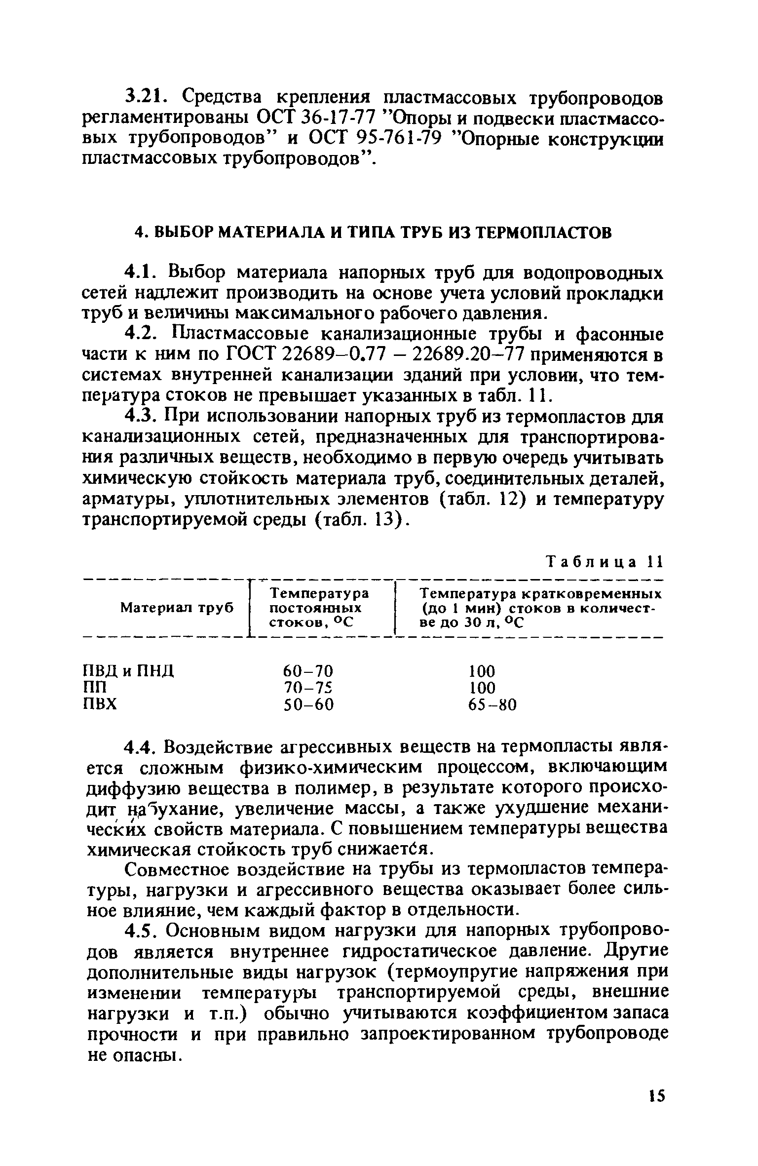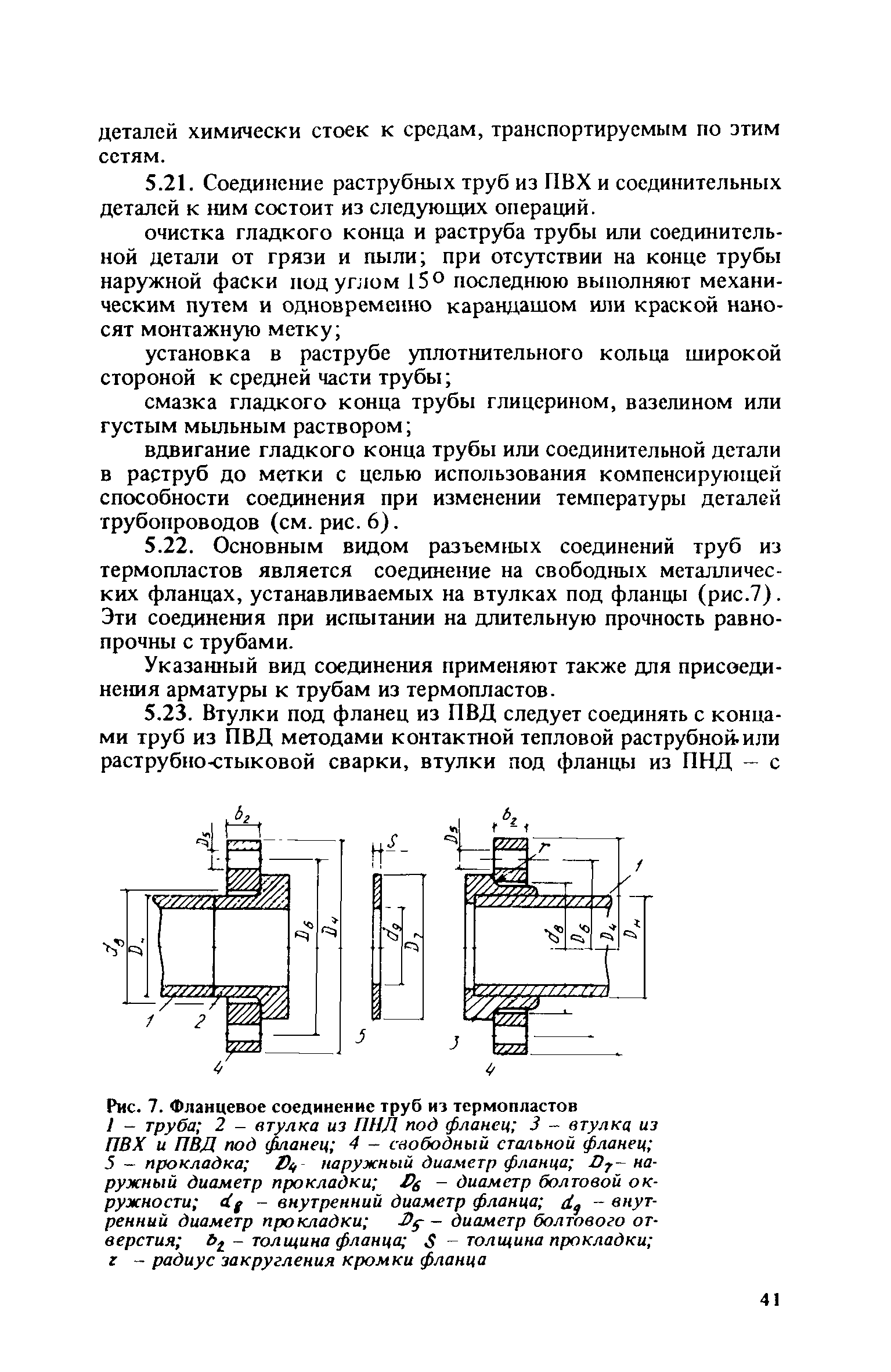| Оглавление: | 1. Общие положения 2. Применение труб из термопластов для систем инженерного оборудования 3. Сортаменты на трубы из термопластов, соединительные детали, канализационные фасонные части и арматуру 4. Выбор материала и типа труб из термопластов 5. Выбор способов соединения труб 6. Гидравлический расчет труб из термопластов 7. Конструирование трубопроводов из термопластов Приложение 1. Сортамент напорных труб из полиэтилена высокого давления по ГОСТ 18599-73 с изменениями Приложение 2. Сортамент напорных труб из полиэтилена низкого давления по ГОСТ 18599-73 с изменениями Приложение 3. Сортамент напорных труб из полиэтилена низкого давления по ТУ 6-19-214-83 Приложение 4. Сортамент напорных труб из полипропилена по ТУ 38-102-100-76 Приложение 5. Сортамент напорных труб из непластифицированного поливинилхлорида (ПВХ-100) по ТУ 6-19-231-83 Приложение 6. Сортамент напорных труб из непластифицированного поливинилхлорида с раструбами по ТУ 6-19-231-83 Приложение 7. Соединительные детали из полиэтилена низкой плотности (ПВД) для напорных труб по ОСТ 6-05-367-74 Приложение 8. Соединительные детали из полиэтилена низкого давления для напорных труб по ТУ 6-19-213-83 Приложение 9. Соединительные сварные и гнутые детали из полиэтилена низкого давления для напорных труб по ТУ 6-19-218-83 Приложение 10. Сборные детали седелок из полиэтилена низкого давления для напорных труб по ТУ 6-19-051-262-80 Приложение 11. Соединительные детали из непластифицированного поливинилхлорида для клеевых соединений по ТУ 6-19-222-83 Приложение 12. Соединительные детали из чугуна для поливинилхлоридных раструбных труб Приложение 13. Соединительные детали из непластифицированного поливинилхлорида для соединений с помощью резиновых колец по ТУ 6-19-223-83 Приложение 14. Отводы из непластифицированного поливинилхлорида по ТУ 6-19-221-83 Приложение 15. Фасонные части к пластмассовым канализационным трубам по ГОСТ 22689.4-77-22689 20-77 Приложение 16. Запорная арматура для коррозионных и агрессивных сред Приложение 17. Физико-механические свойства термопластов трубных марок при кратковременных испытаниях Приложение 18. Химическая стойкость деталей трубопроводов из термопластов и уплотнительных элементов из резины |