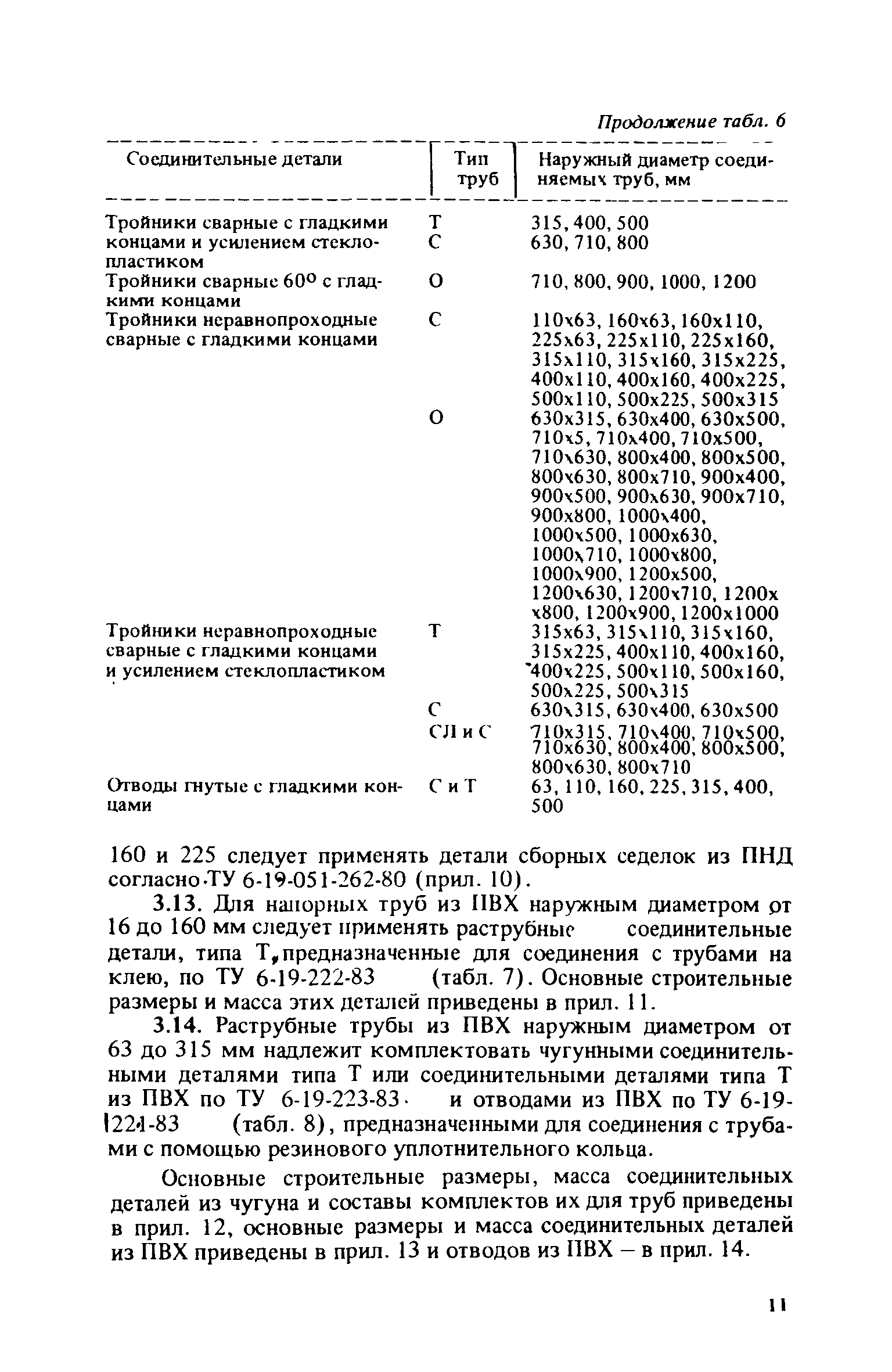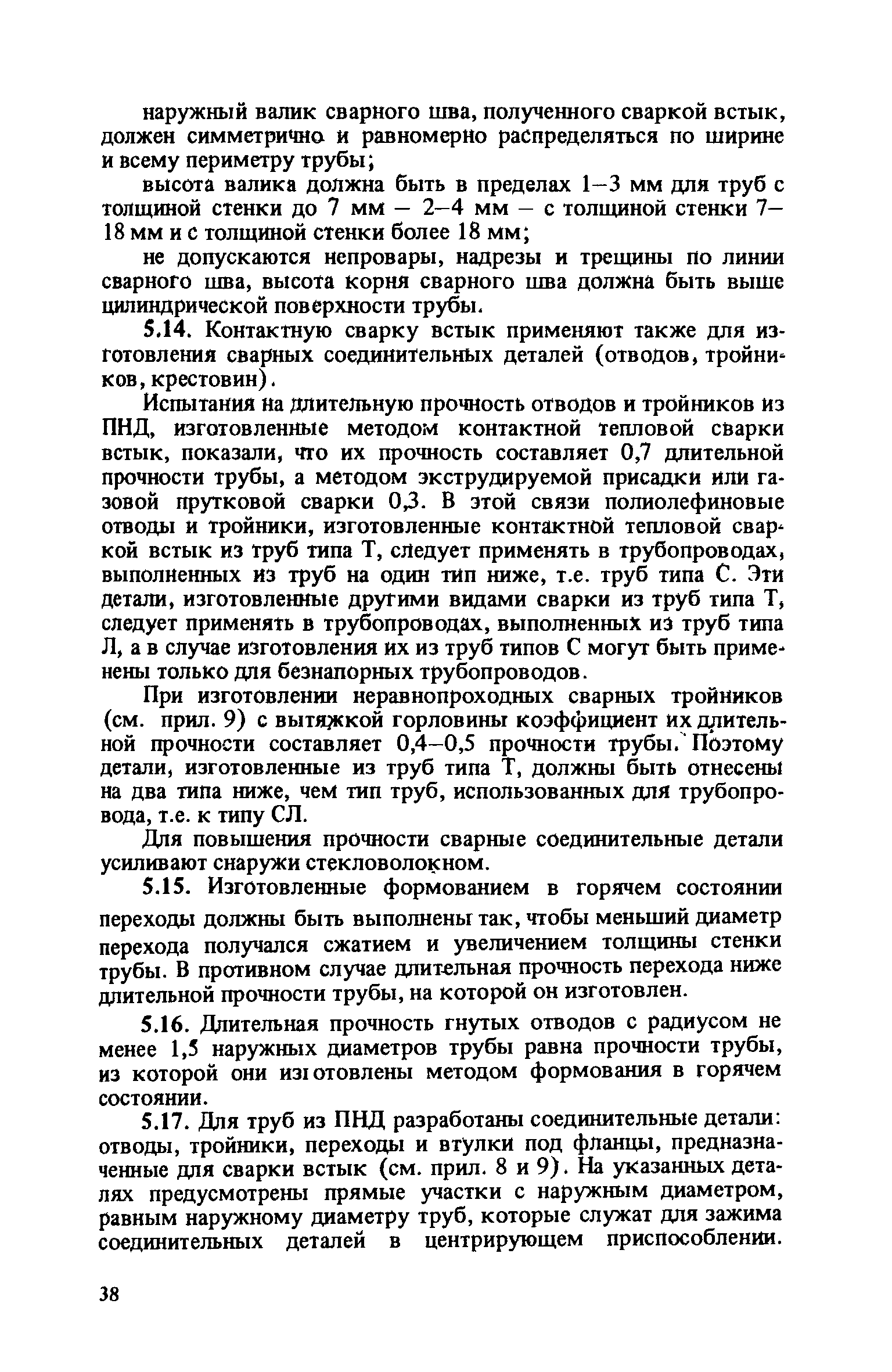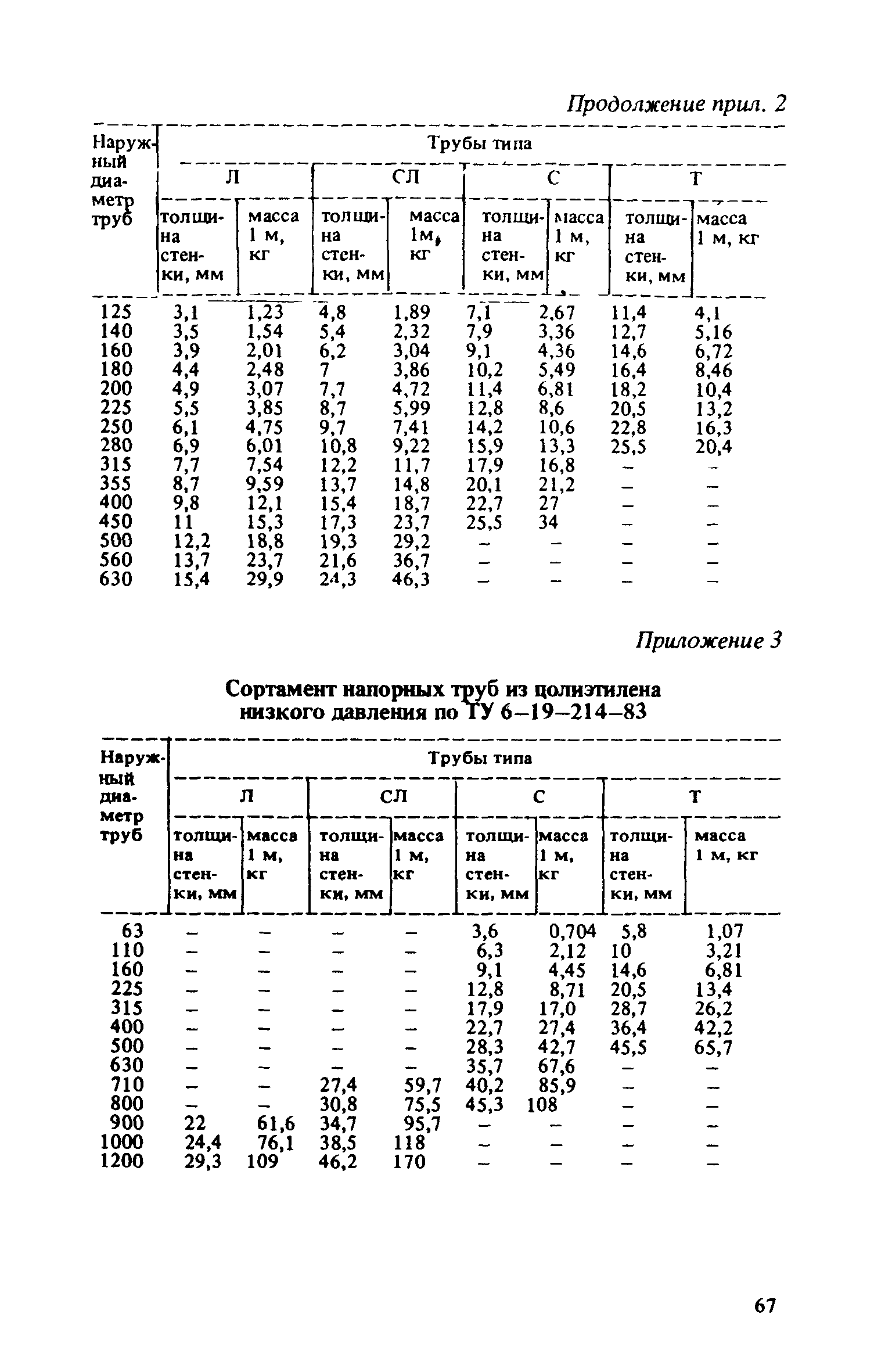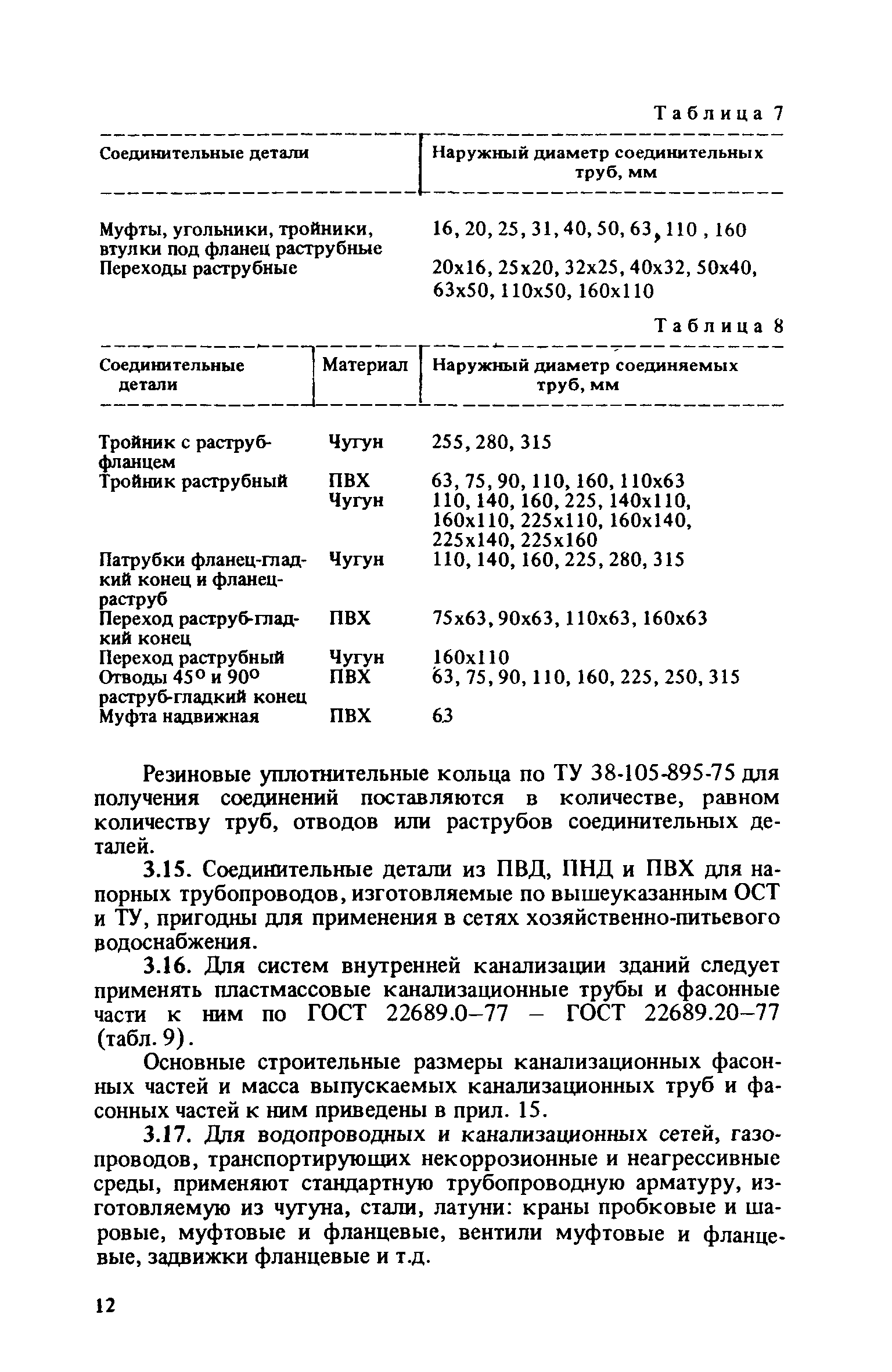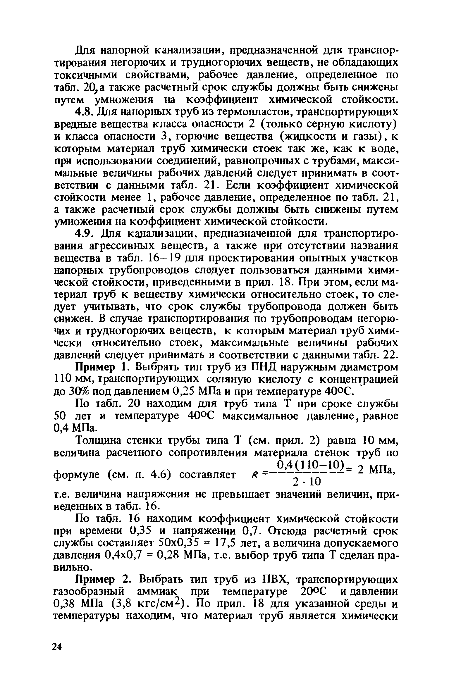 | Оглавление: | 1. Общие положения 2. Применение труб из термопластов для систем инженерного оборудования 3. Сортаменты на трубы из термопластов, соединительные детали, канализационные фасонные части и арматуру 4. Выбор материала и типа труб из термопластов 5. Выбор способов соединения труб 6. Гидравлический расчет труб из термопластов 7. Конструирование трубопроводов из термопластов Приложение 1. Сортамент напорных труб из полиэтилена высокого давления по ГОСТ 18599-73 с изменениями Приложение 2. Сортамент напорных труб из полиэтилена низкого давления по ГОСТ 18599-73 с изменениями Приложение 3. Сортамент напорных труб из полиэтилена низкого давления по ТУ 6-19-214-83 Приложение 4. Сортамент напорных труб из полипропилена по ТУ 38-102-100-76 Приложение 5. Сортамент напорных труб из непластифицированного поливинилхлорида (ПВХ-100) по ТУ 6-19-231-83 Приложение 6. Сортамент напорных труб из непластифицированного поливинилхлорида с раструбами по ТУ 6-19-231-83 Приложение 7. Соединительные детали из полиэтилена низкой плотности (ПВД) для напорных труб по ОСТ 6-05-367-74 Приложение 8. Соединительные детали из полиэтилена низкого давления для напорных труб по ТУ 6-19-213-83 Приложение 9. Соединительные сварные и гнутые детали из полиэтилена низкого давления для напорных труб по ТУ 6-19-218-83 Приложение 10. Сборные детали седелок из полиэтилена низкого давления для напорных труб по ТУ 6-19-051-262-80 Приложение 11. Соединительные детали из непластифицированного поливинилхлорида для клеевых соединений по ТУ 6-19-222-83 Приложение 12. Соединительные детали из чугуна для поливинилхлоридных раструбных труб Приложение 13. Соединительные детали из непластифицированного поливинилхлорида для соединений с помощью резиновых колец по ТУ 6-19-223-83 Приложение 14. Отводы из непластифицированного поливинилхлорида по ТУ 6-19-221-83 Приложение 15. Фасонные части к пластмассовым канализационным трубам по ГОСТ 22689.4-77-22689 20-77 Приложение 16. Запорная арматура для коррозионных и агрессивных сред Приложение 17. Физико-механические свойства термопластов трубных марок при кратковременных испытаниях Приложение 18. Химическая стойкость деталей трубопроводов из термопластов и уплотнительных элементов из резины |