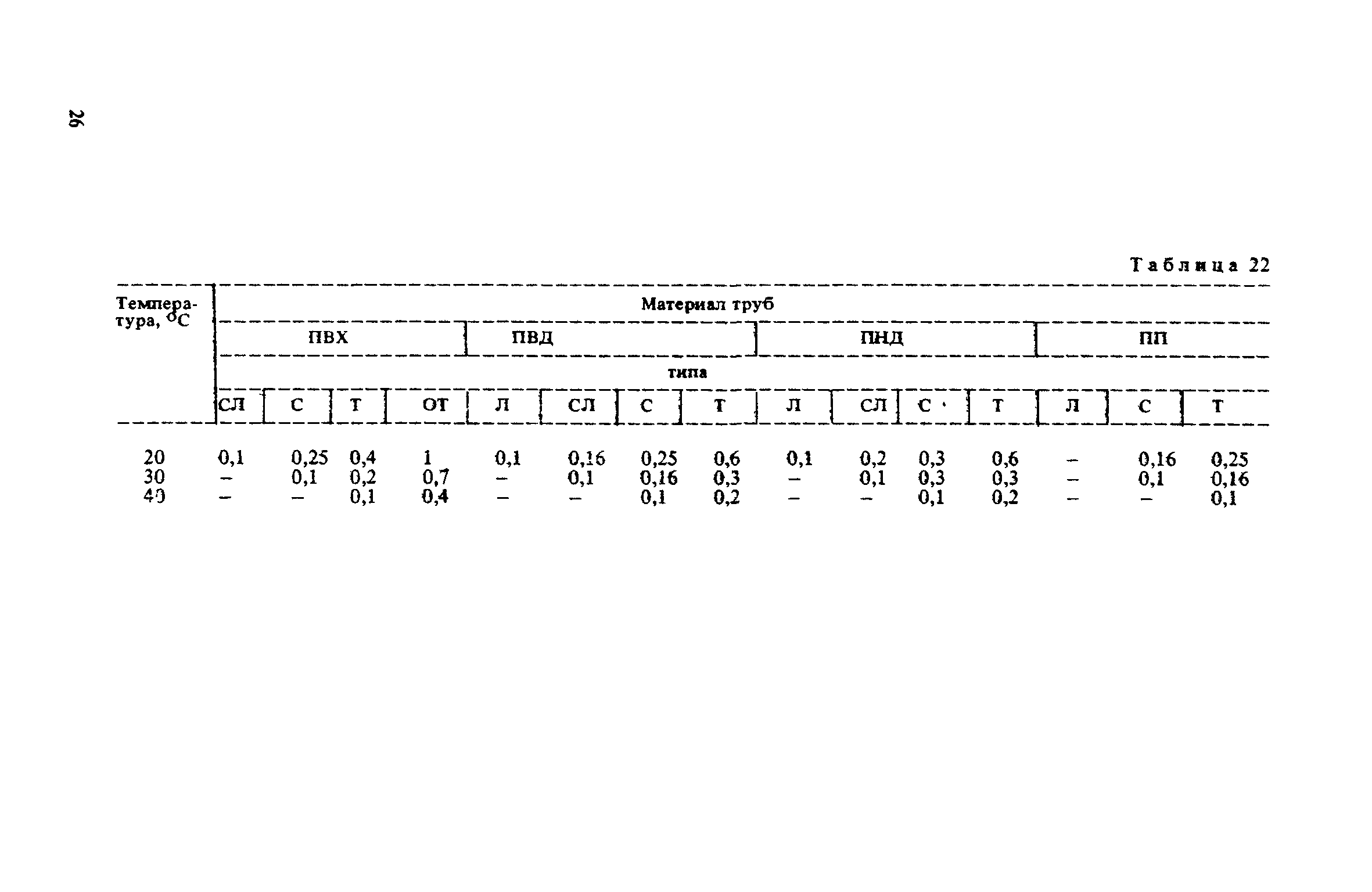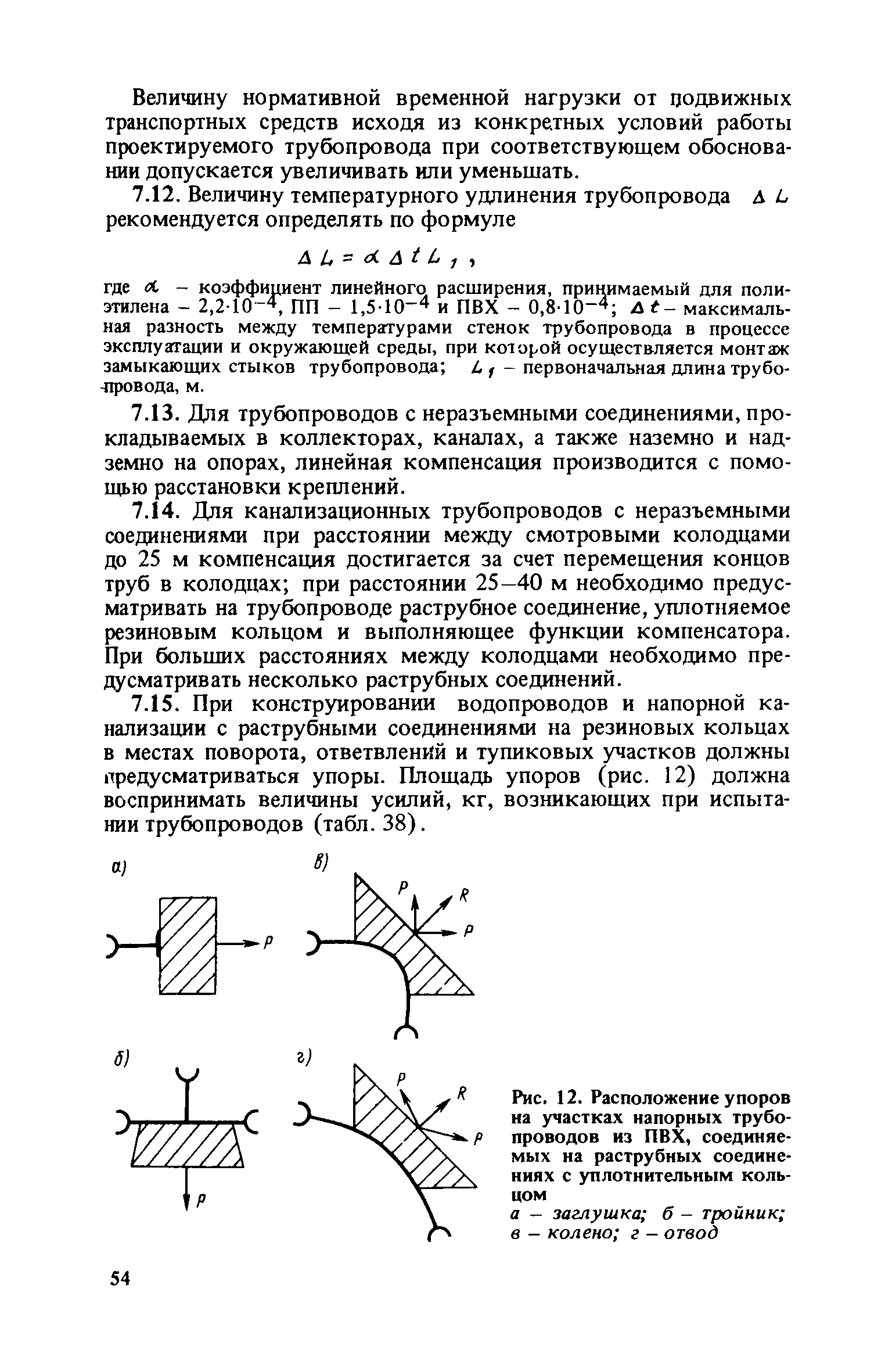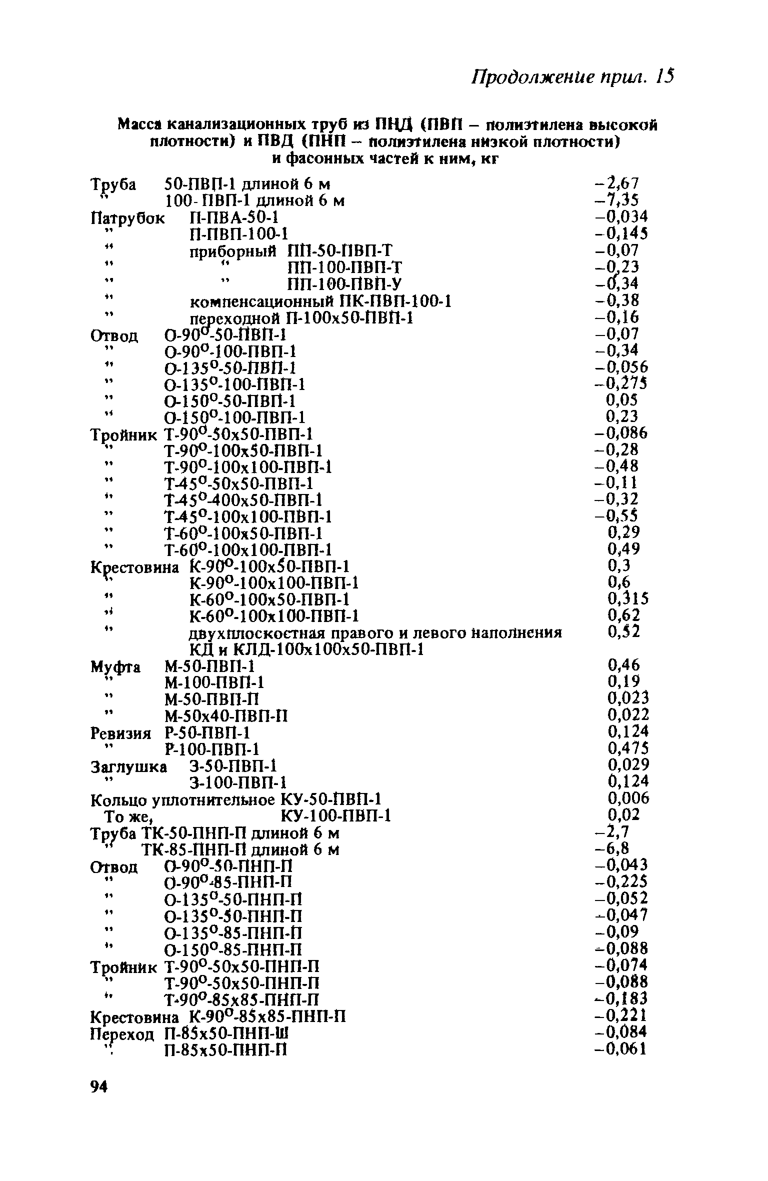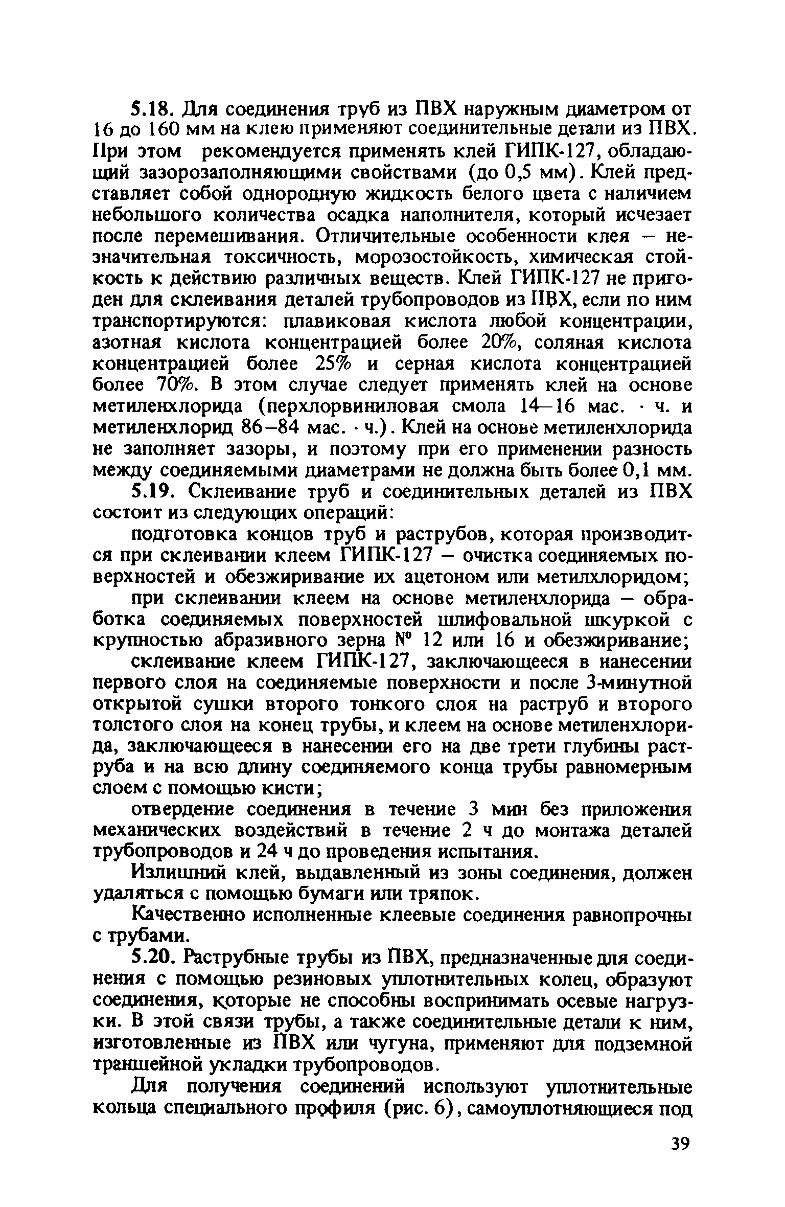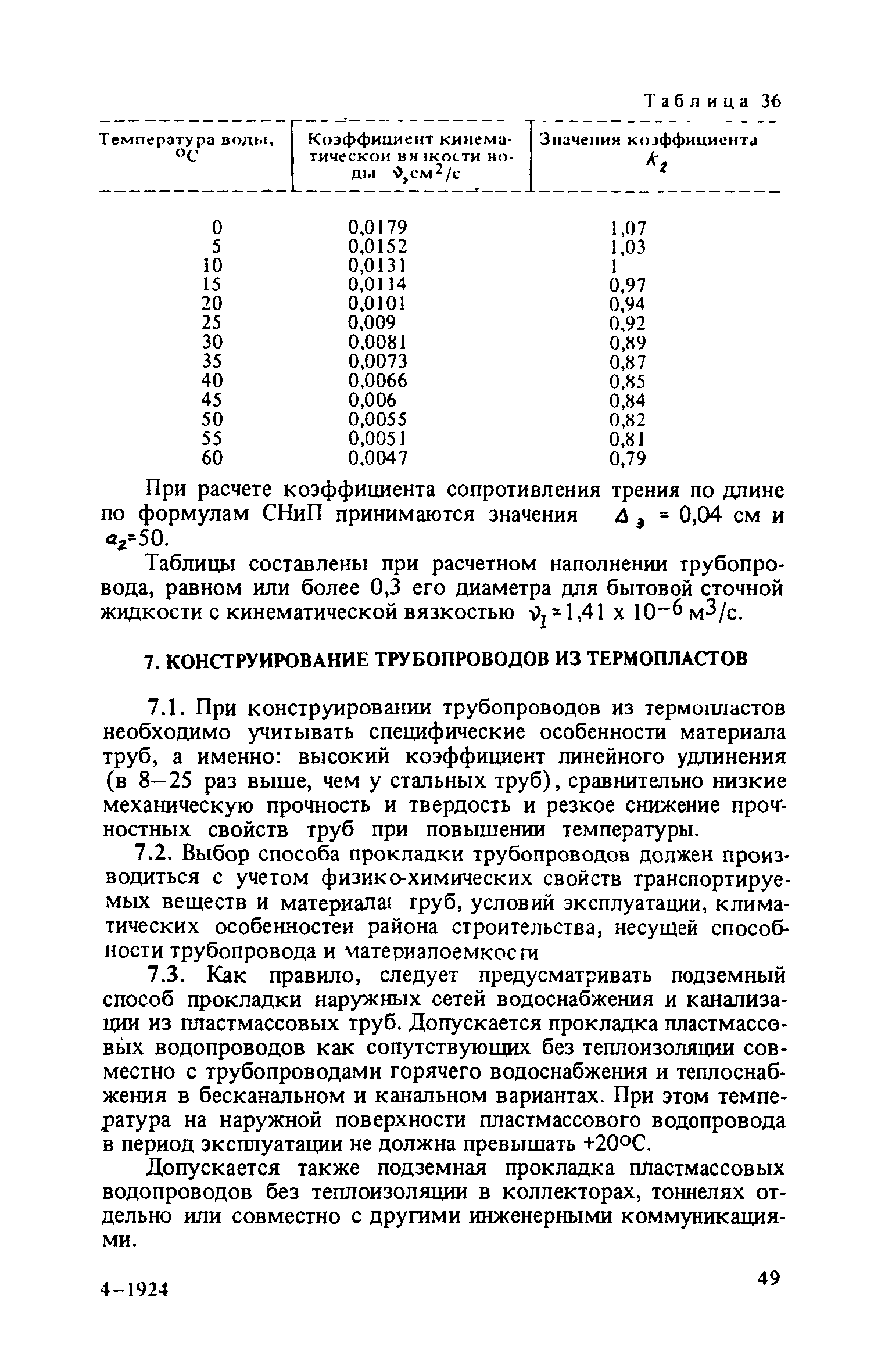 | Оглавление: | 1. Общие положения 2. Применение труб из термопластов для систем инженерного оборудования 3. Сортаменты на трубы из термопластов, соединительные детали, канализационные фасонные части и арматуру 4. Выбор материала и типа труб из термопластов 5. Выбор способов соединения труб 6. Гидравлический расчет труб из термопластов 7. Конструирование трубопроводов из термопластов Приложение 1. Сортамент напорных труб из полиэтилена высокого давления по ГОСТ 18599-73 с изменениями Приложение 2. Сортамент напорных труб из полиэтилена низкого давления по ГОСТ 18599-73 с изменениями Приложение 3. Сортамент напорных труб из полиэтилена низкого давления по ТУ 6-19-214-83 Приложение 4. Сортамент напорных труб из полипропилена по ТУ 38-102-100-76 Приложение 5. Сортамент напорных труб из непластифицированного поливинилхлорида (ПВХ-100) по ТУ 6-19-231-83 Приложение 6. Сортамент напорных труб из непластифицированного поливинилхлорида с раструбами по ТУ 6-19-231-83 Приложение 7. Соединительные детали из полиэтилена низкой плотности (ПВД) для напорных труб по ОСТ 6-05-367-74 Приложение 8. Соединительные детали из полиэтилена низкого давления для напорных труб по ТУ 6-19-213-83 Приложение 9. Соединительные сварные и гнутые детали из полиэтилена низкого давления для напорных труб по ТУ 6-19-218-83 Приложение 10. Сборные детали седелок из полиэтилена низкого давления для напорных труб по ТУ 6-19-051-262-80 Приложение 11. Соединительные детали из непластифицированного поливинилхлорида для клеевых соединений по ТУ 6-19-222-83 Приложение 12. Соединительные детали из чугуна для поливинилхлоридных раструбных труб Приложение 13. Соединительные детали из непластифицированного поливинилхлорида для соединений с помощью резиновых колец по ТУ 6-19-223-83 Приложение 14. Отводы из непластифицированного поливинилхлорида по ТУ 6-19-221-83 Приложение 15. Фасонные части к пластмассовым канализационным трубам по ГОСТ 22689.4-77-22689 20-77 Приложение 16. Запорная арматура для коррозионных и агрессивных сред Приложение 17. Физико-механические свойства термопластов трубных марок при кратковременных испытаниях Приложение 18. Химическая стойкость деталей трубопроводов из термопластов и уплотнительных элементов из резины |