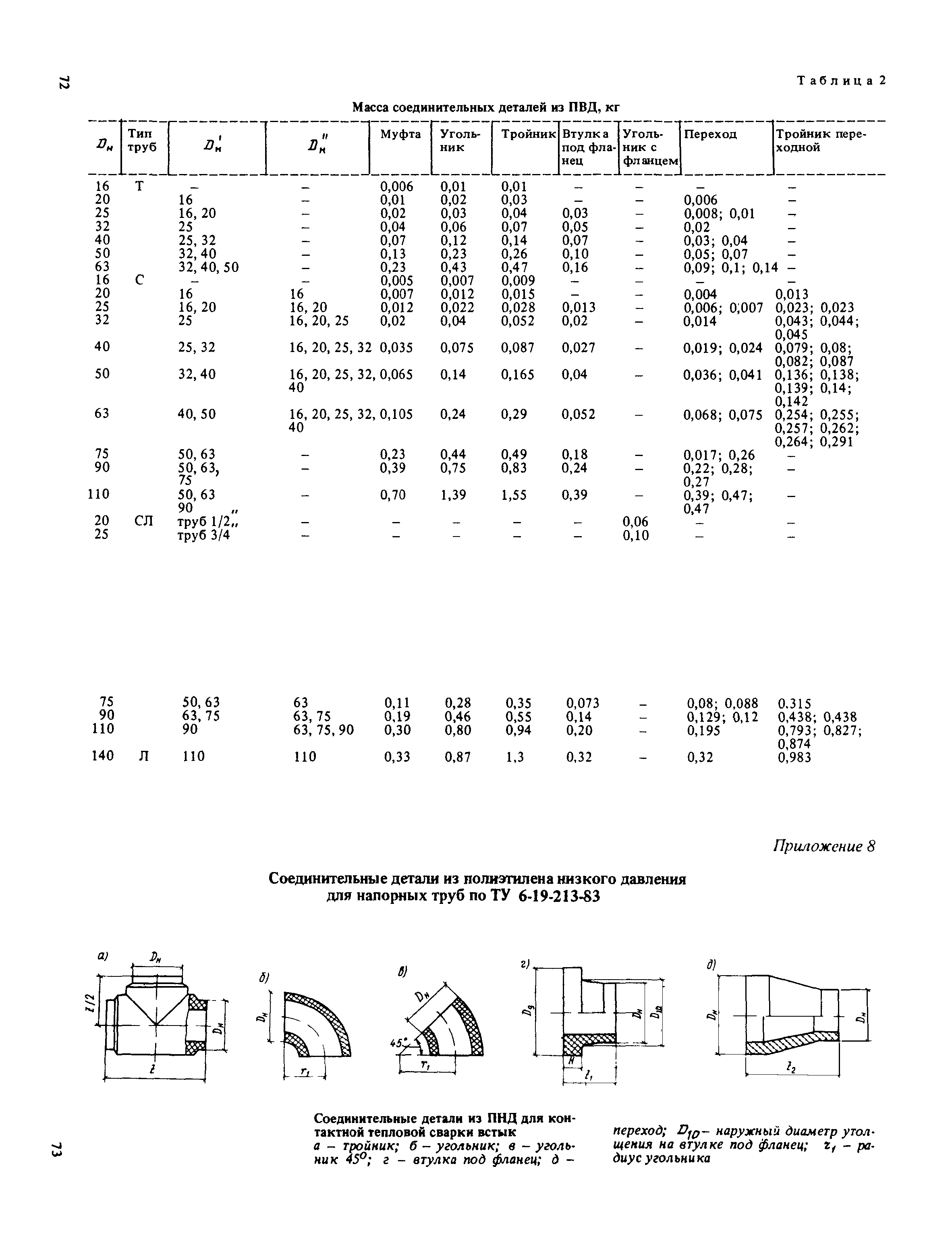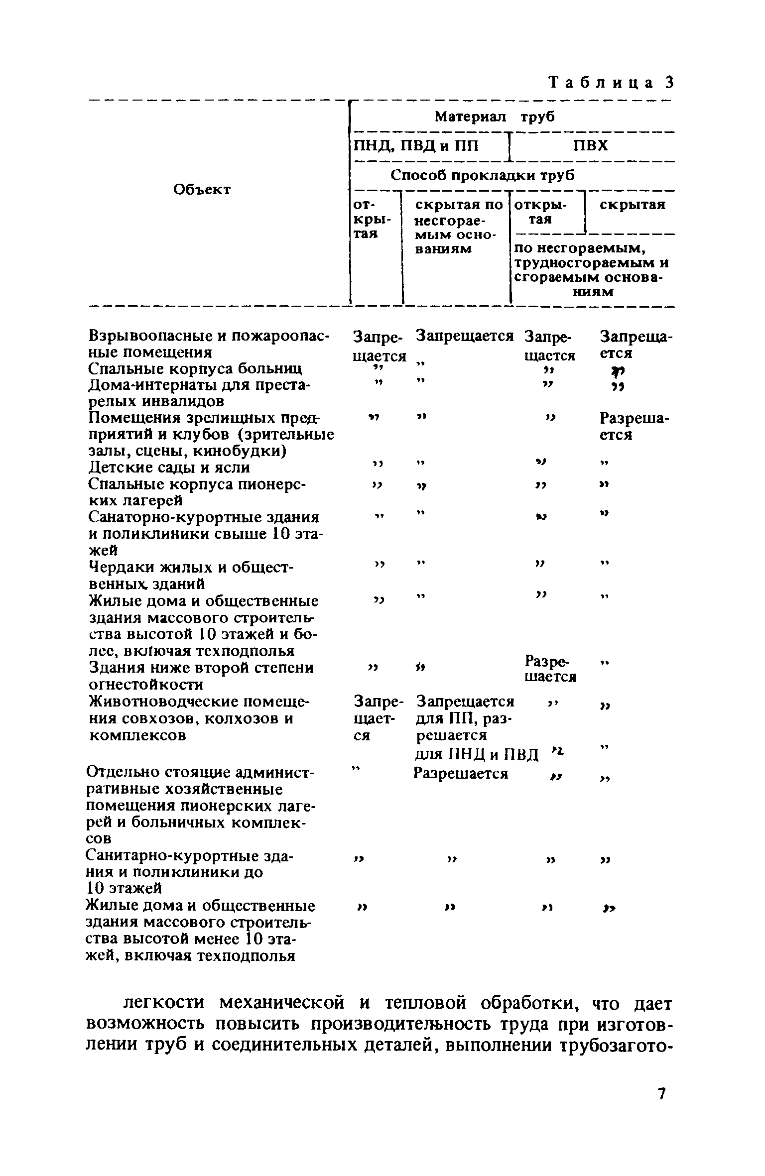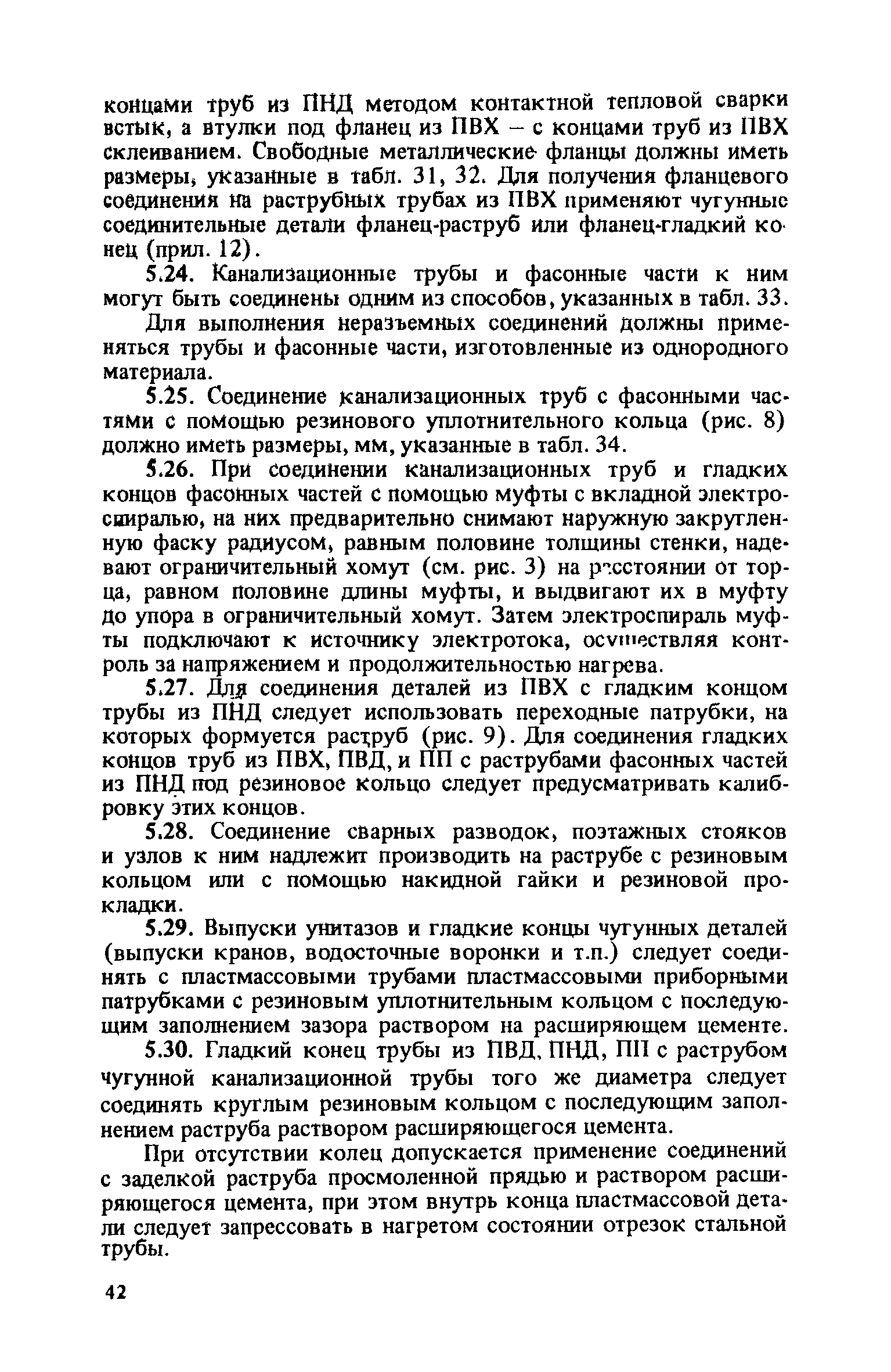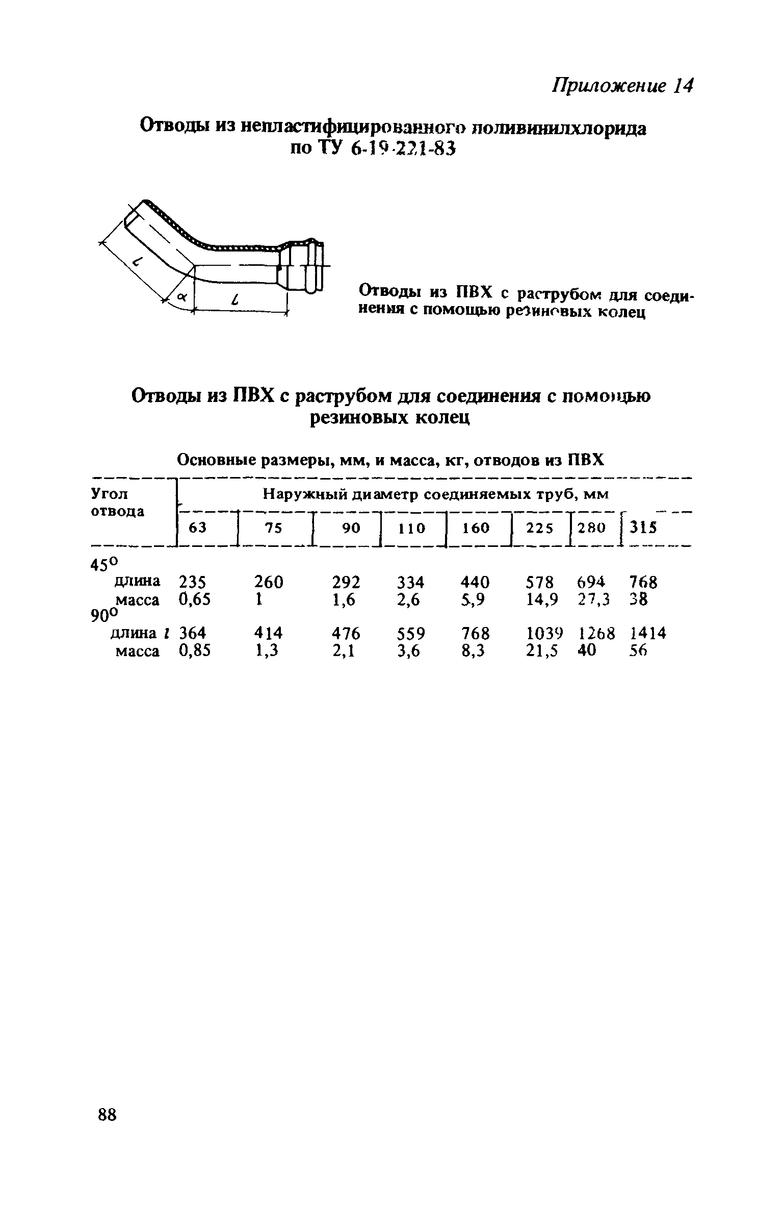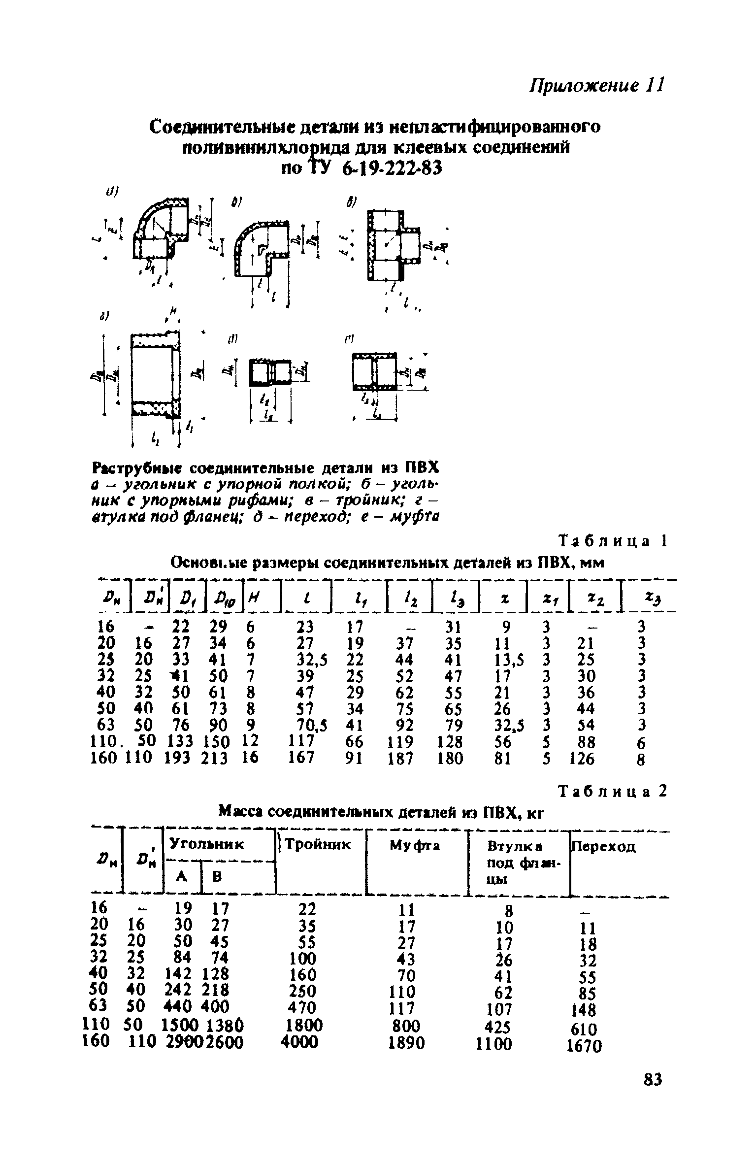 | Оглавление: | 1. Общие положения 2. Применение труб из термопластов для систем инженерного оборудования 3. Сортаменты на трубы из термопластов, соединительные детали, канализационные фасонные части и арматуру 4. Выбор материала и типа труб из термопластов 5. Выбор способов соединения труб 6. Гидравлический расчет труб из термопластов 7. Конструирование трубопроводов из термопластов Приложение 1. Сортамент напорных труб из полиэтилена высокого давления по ГОСТ 18599-73 с изменениями Приложение 2. Сортамент напорных труб из полиэтилена низкого давления по ГОСТ 18599-73 с изменениями Приложение 3. Сортамент напорных труб из полиэтилена низкого давления по ТУ 6-19-214-83 Приложение 4. Сортамент напорных труб из полипропилена по ТУ 38-102-100-76 Приложение 5. Сортамент напорных труб из непластифицированного поливинилхлорида (ПВХ-100) по ТУ 6-19-231-83 Приложение 6. Сортамент напорных труб из непластифицированного поливинилхлорида с раструбами по ТУ 6-19-231-83 Приложение 7. Соединительные детали из полиэтилена низкой плотности (ПВД) для напорных труб по ОСТ 6-05-367-74 Приложение 8. Соединительные детали из полиэтилена низкого давления для напорных труб по ТУ 6-19-213-83 Приложение 9. Соединительные сварные и гнутые детали из полиэтилена низкого давления для напорных труб по ТУ 6-19-218-83 Приложение 10. Сборные детали седелок из полиэтилена низкого давления для напорных труб по ТУ 6-19-051-262-80 Приложение 11. Соединительные детали из непластифицированного поливинилхлорида для клеевых соединений по ТУ 6-19-222-83 Приложение 12. Соединительные детали из чугуна для поливинилхлоридных раструбных труб Приложение 13. Соединительные детали из непластифицированного поливинилхлорида для соединений с помощью резиновых колец по ТУ 6-19-223-83 Приложение 14. Отводы из непластифицированного поливинилхлорида по ТУ 6-19-221-83 Приложение 15. Фасонные части к пластмассовым канализационным трубам по ГОСТ 22689.4-77-22689 20-77 Приложение 16. Запорная арматура для коррозионных и агрессивных сред Приложение 17. Физико-механические свойства термопластов трубных марок при кратковременных испытаниях Приложение 18. Химическая стойкость деталей трубопроводов из термопластов и уплотнительных элементов из резины |