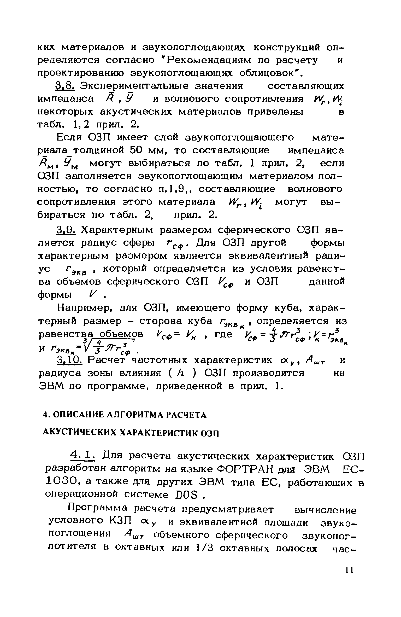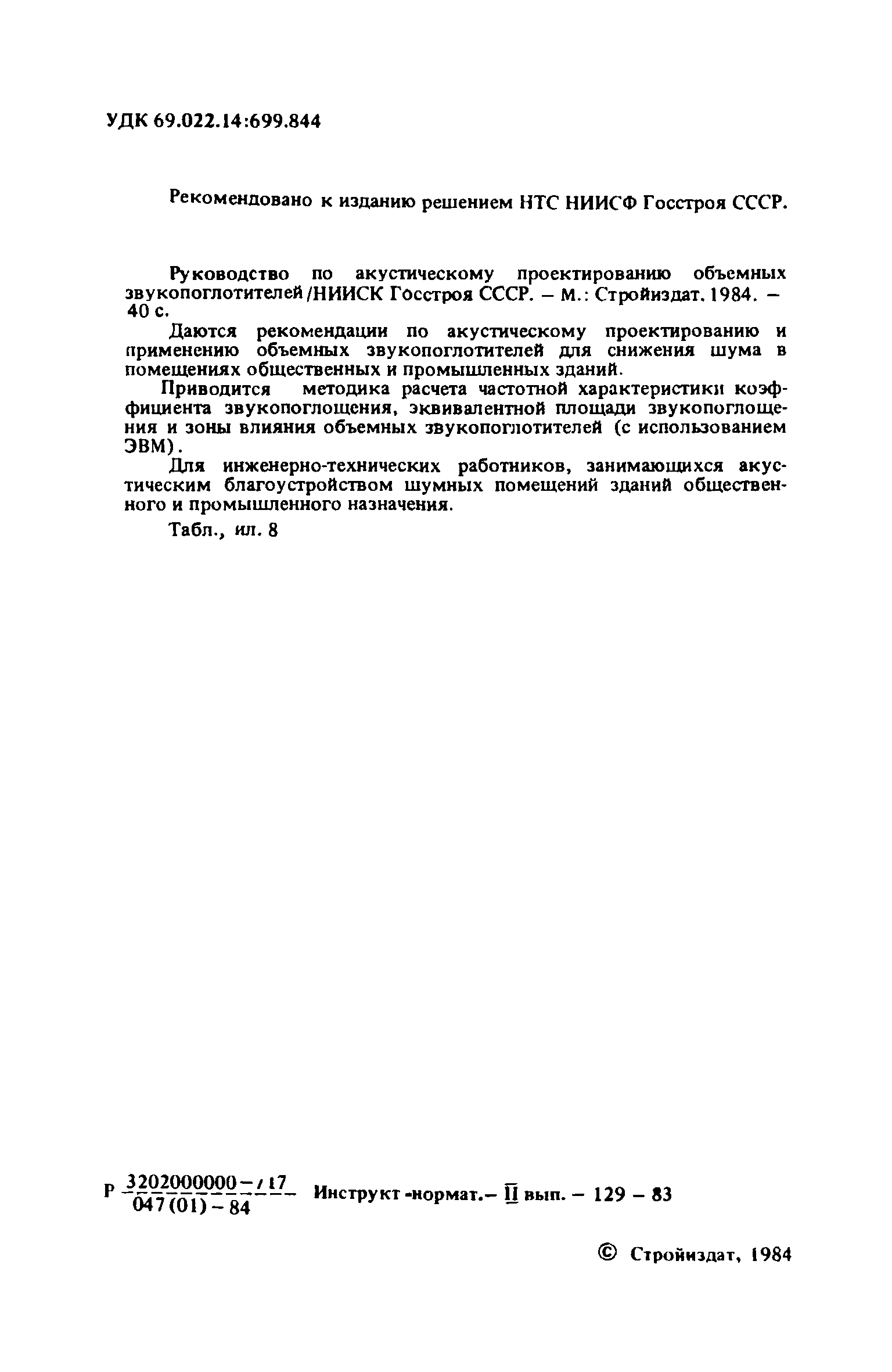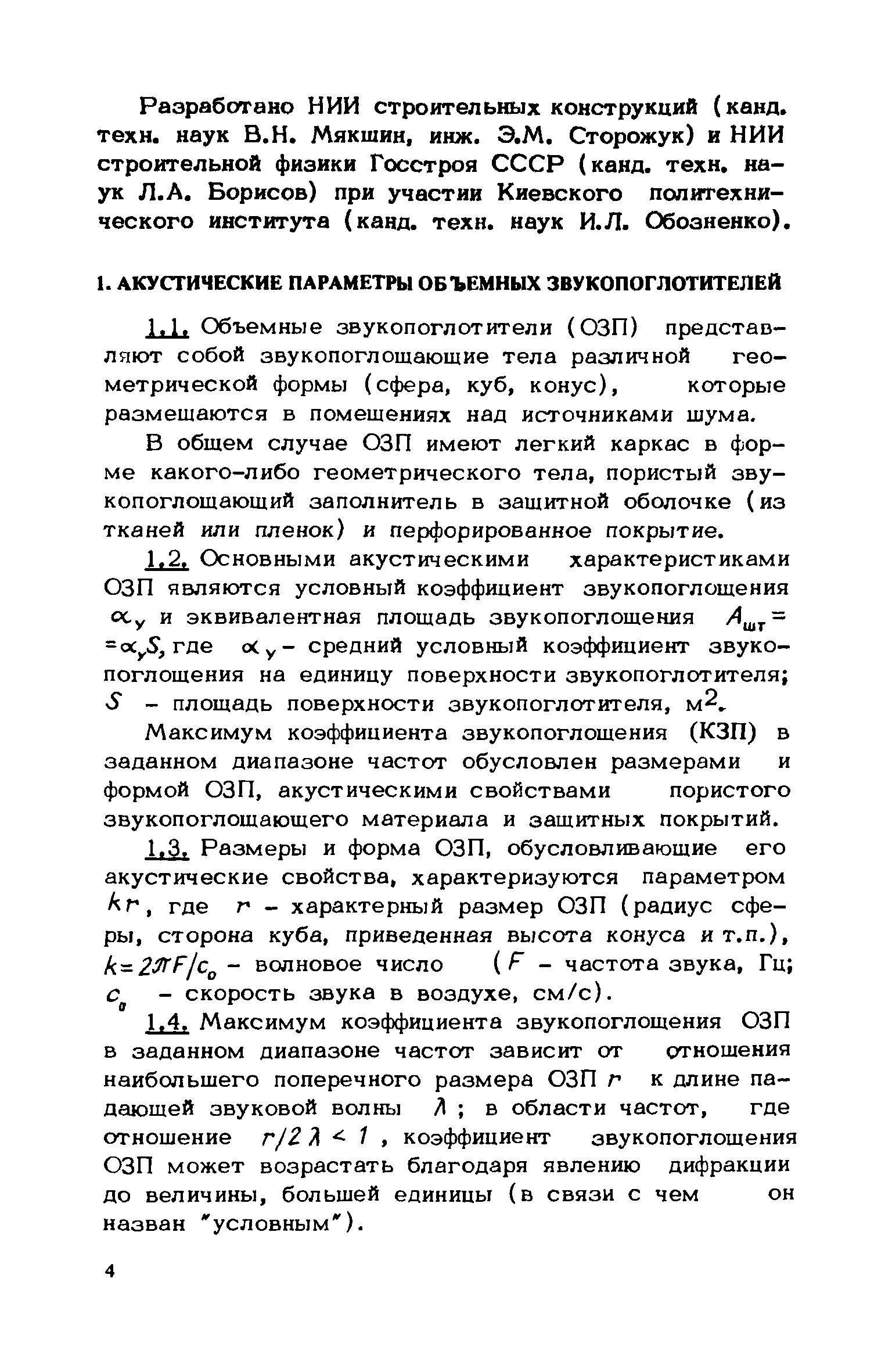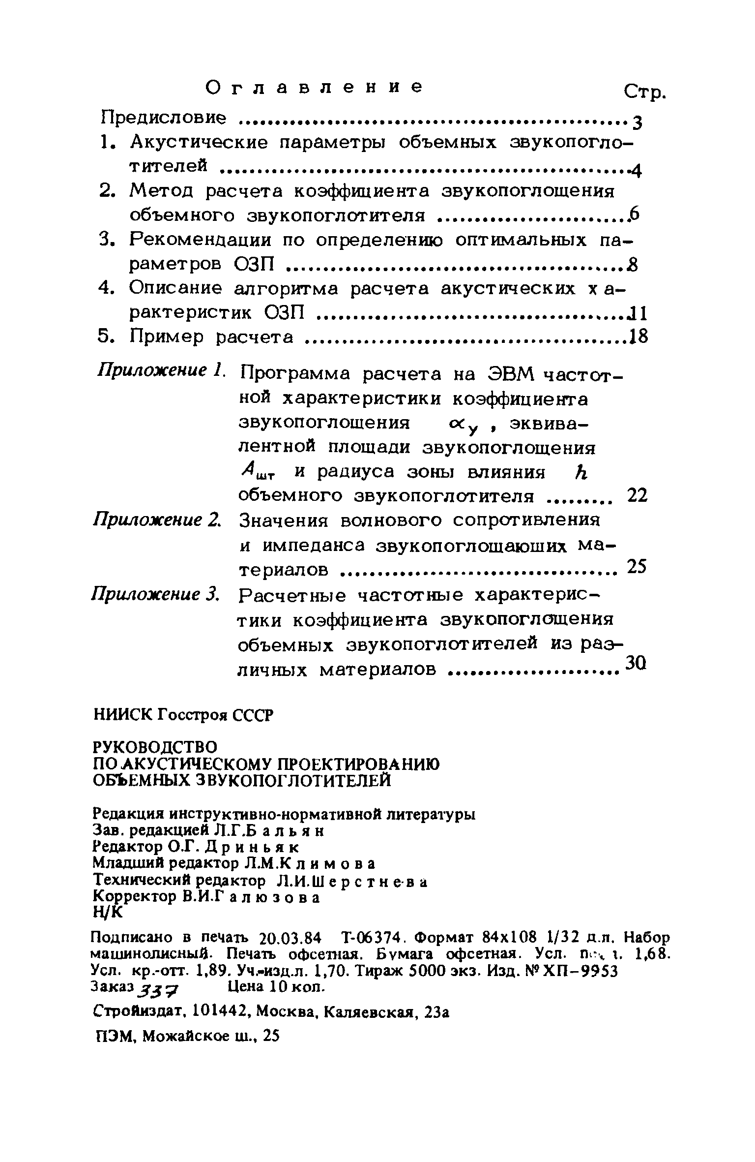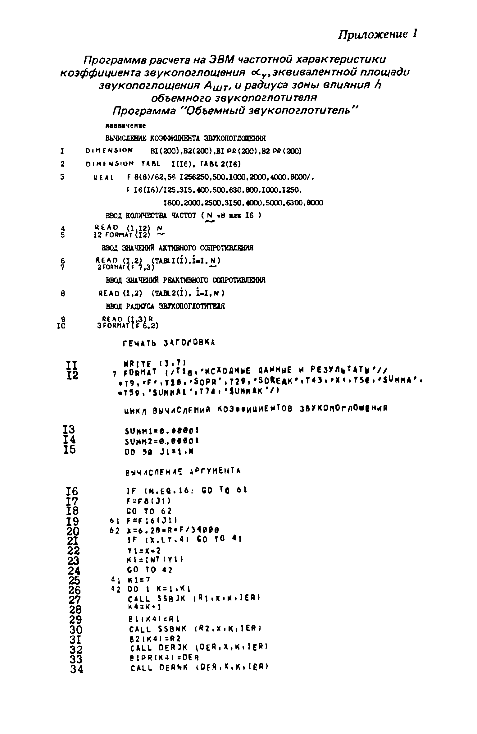 | Оглавление: | Предисловие 1. Акустические параметры объемных звукопоглотителей 2. Метод расчета коэффициента звукопоглощения объемного звукопоглотителя 3. Рекомендации по определению оптимальных параметров ОЗП 4. Описание алгоритмов расчета акустических характеристик ОЗП 5. Пример расчета Приложение 1. Программа расчета на ЭВМ частотной характеристики коэффициента звукопоглощения, эквивалентной площади звукопоглощения и радиуса зоны влияния Приложение 2. Значения волнового сопротивления и импеданса звукопоглощающих материалов Приложение 3. Расчетные частотные характеристики коэффициента звукопоглощения объемных звукопоглотителей из различных материалов |