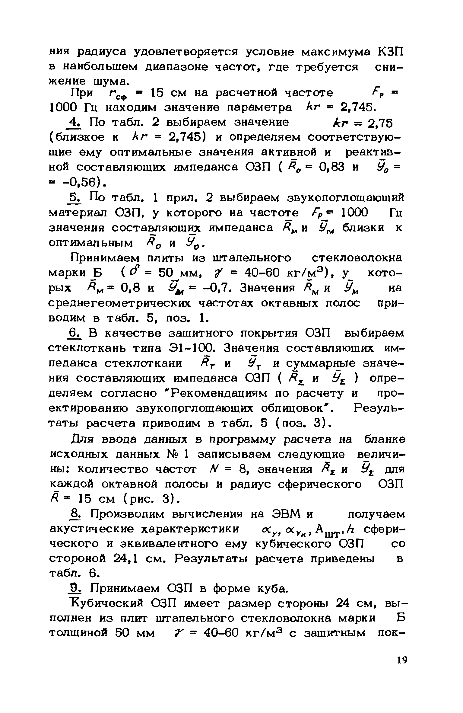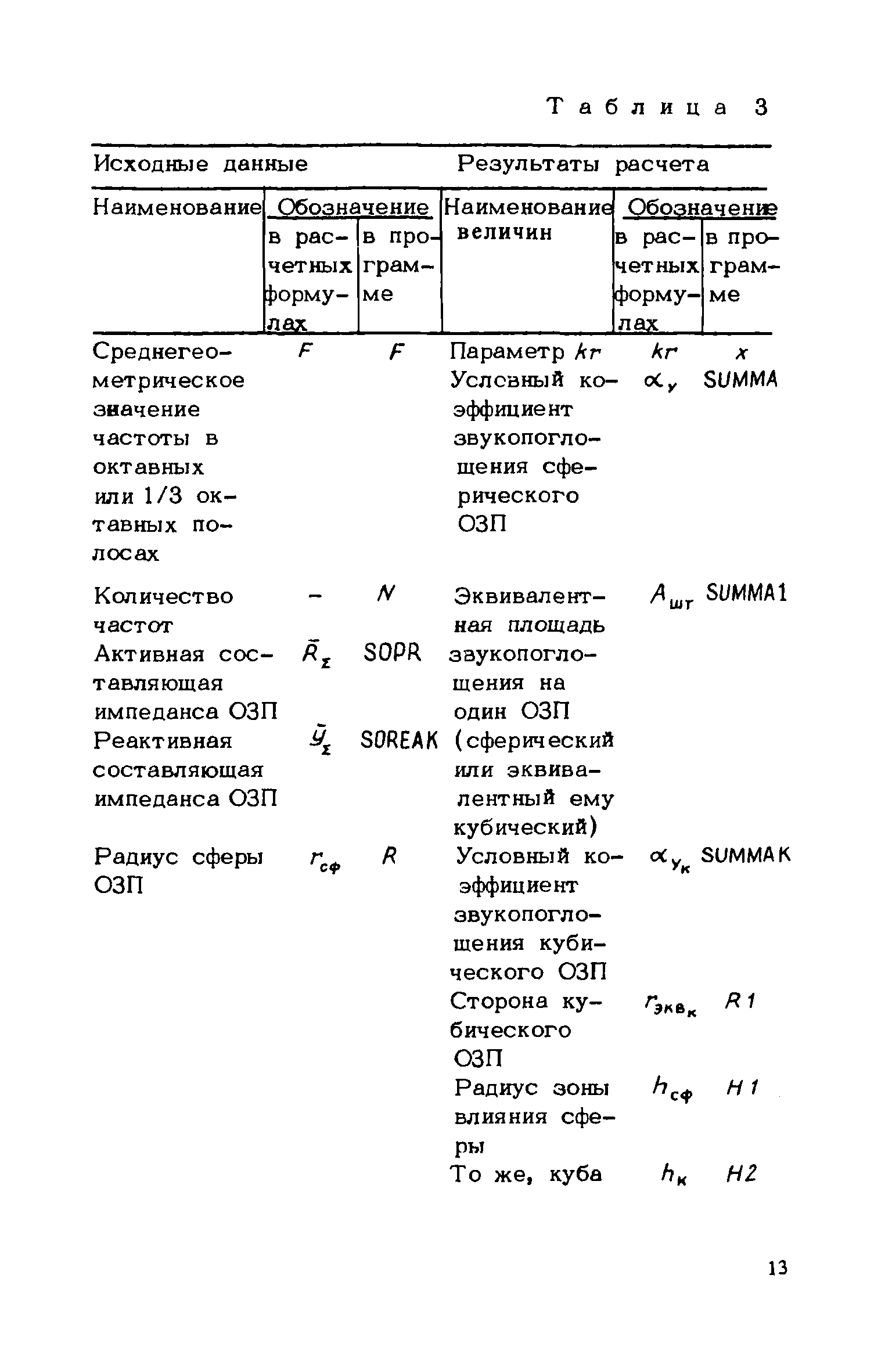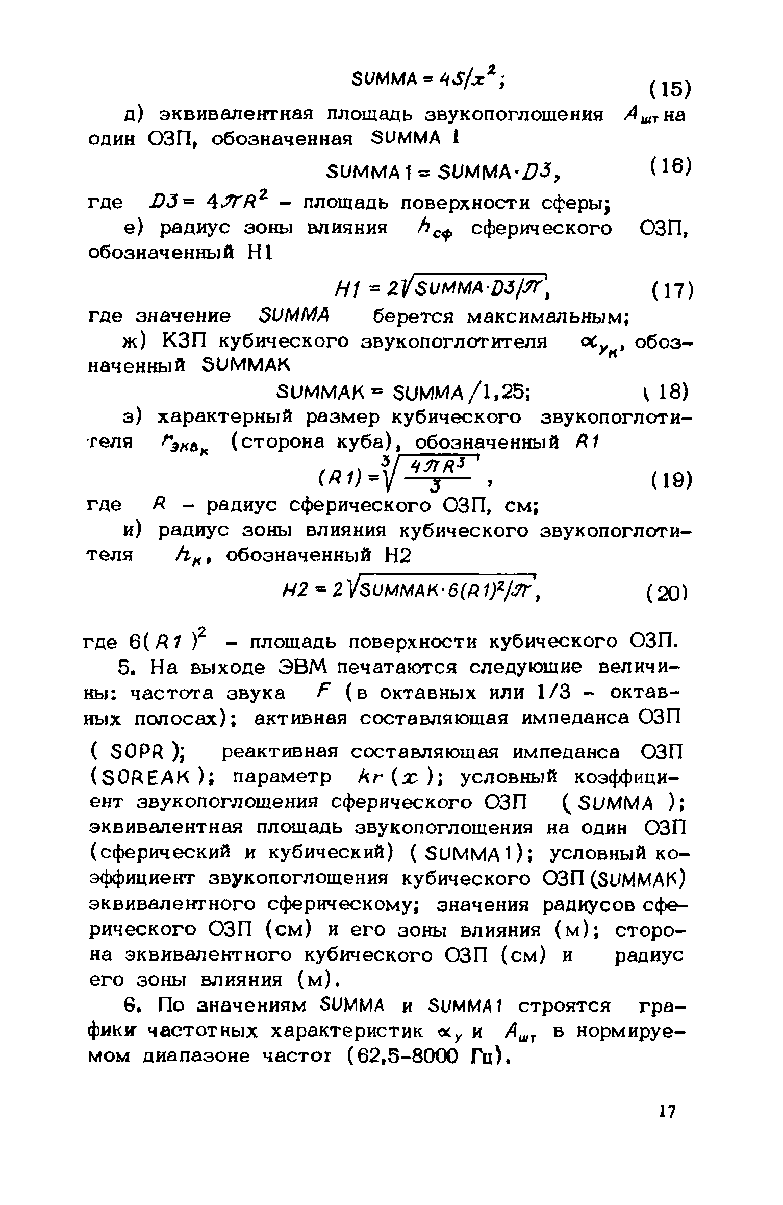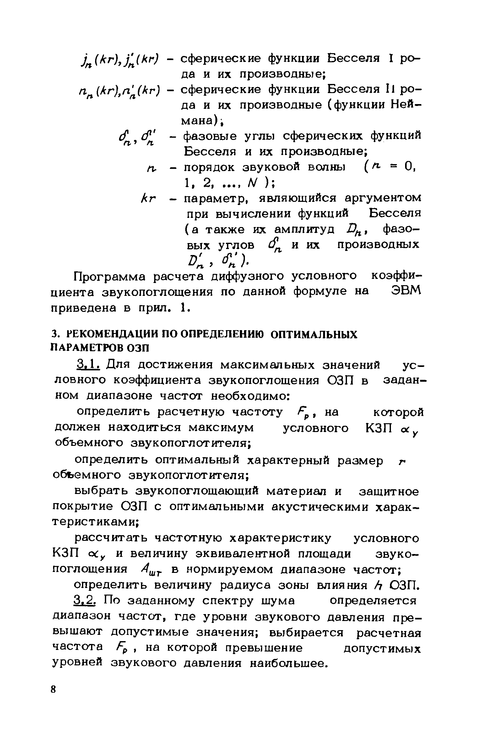 | Оглавление: | Предисловие 1. Акустические параметры объемных звукопоглотителей 2. Метод расчета коэффициента звукопоглощения объемного звукопоглотителя 3. Рекомендации по определению оптимальных параметров ОЗП 4. Описание алгоритмов расчета акустических характеристик ОЗП 5. Пример расчета Приложение 1. Программа расчета на ЭВМ частотной характеристики коэффициента звукопоглощения, эквивалентной площади звукопоглощения и радиуса зоны влияния Приложение 2. Значения волнового сопротивления и импеданса звукопоглощающих материалов Приложение 3. Расчетные частотные характеристики коэффициента звукопоглощения объемных звукопоглотителей из различных материалов |