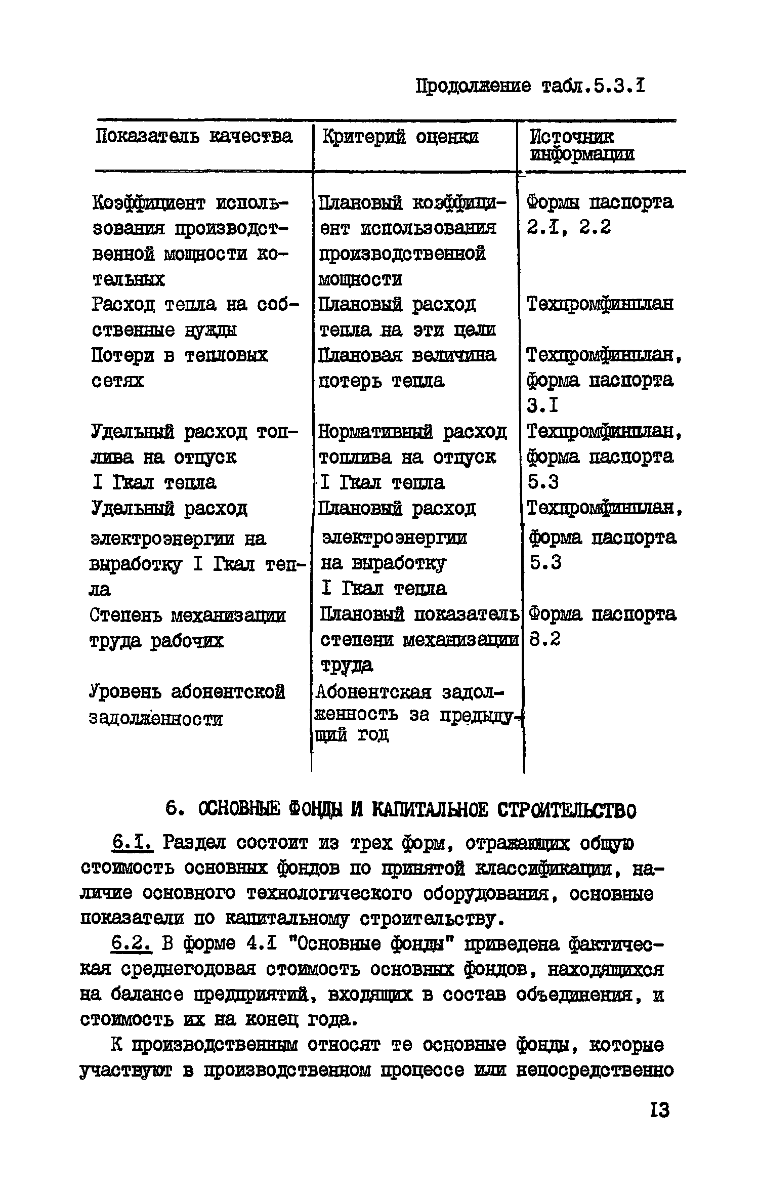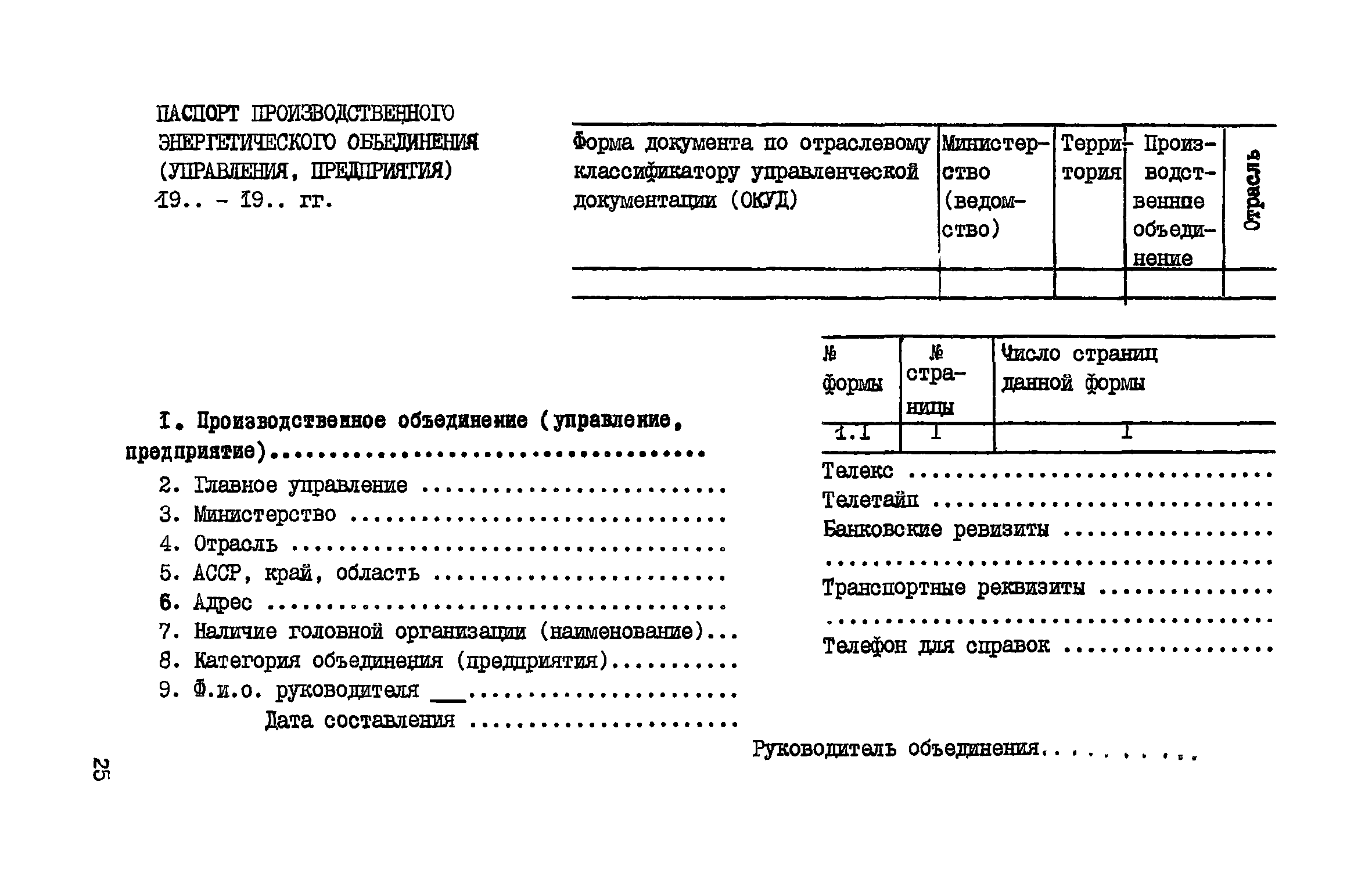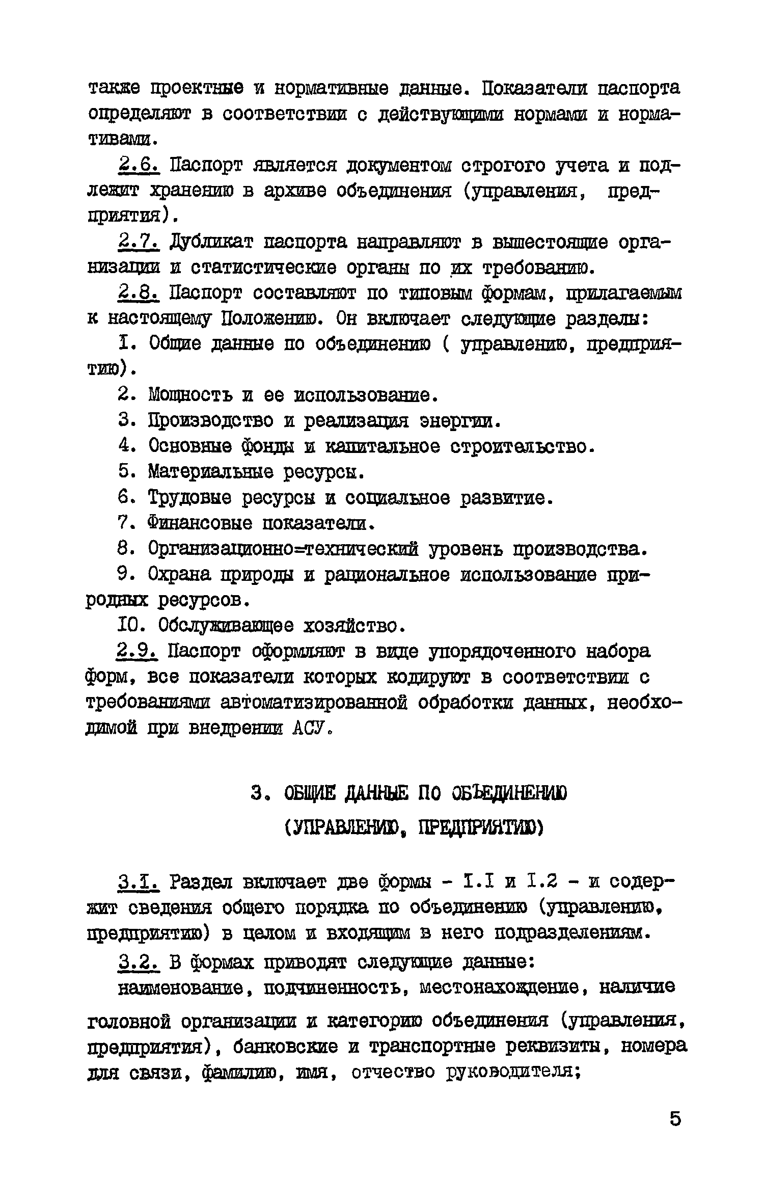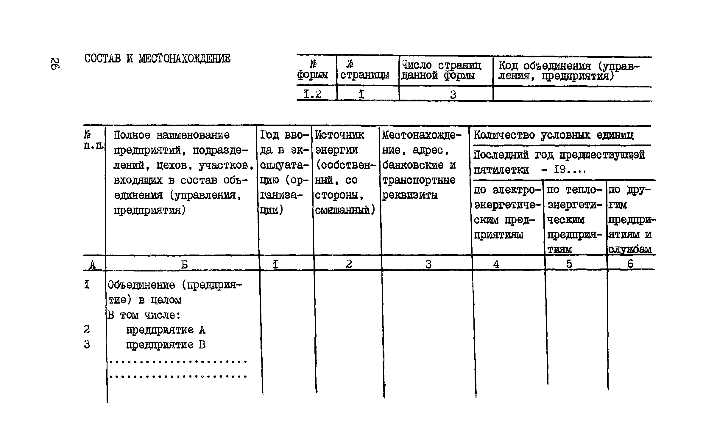 | Оглавление: | 1. Введение 2. Порядок составления паспорта 3. Общие данные по объединению (управлению, предприятию) 4. Мощность и ее использование 5. Производство и реализация энергии 6. Основные фонды и капитальное строительство 7. Материальные ресурсы 8. Трудовые ресурсы и социальное развитие 9. Финансовые показатели 10. Организационно-технический уровень производства 11. Охрана природы и рациональное использование природных ресурсов 12. Обслуживающее хозяйство 13. Приложение. Паспорт предприятия коммунальной энергетики (типовые формы) |