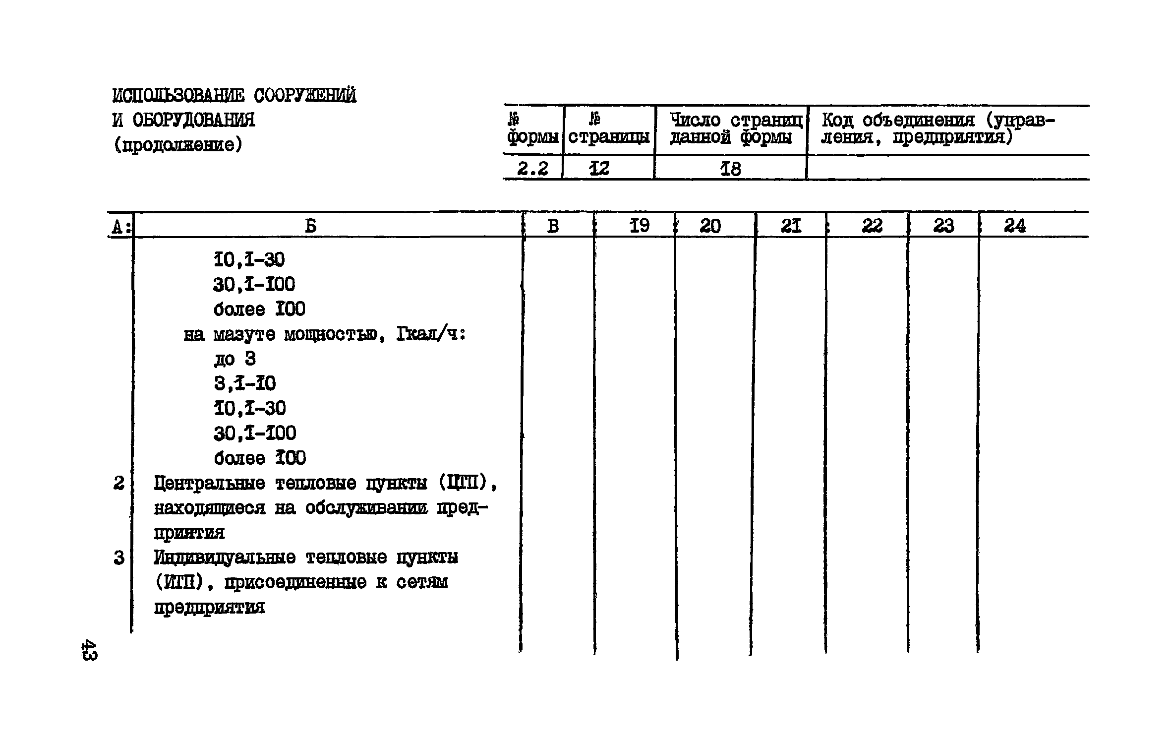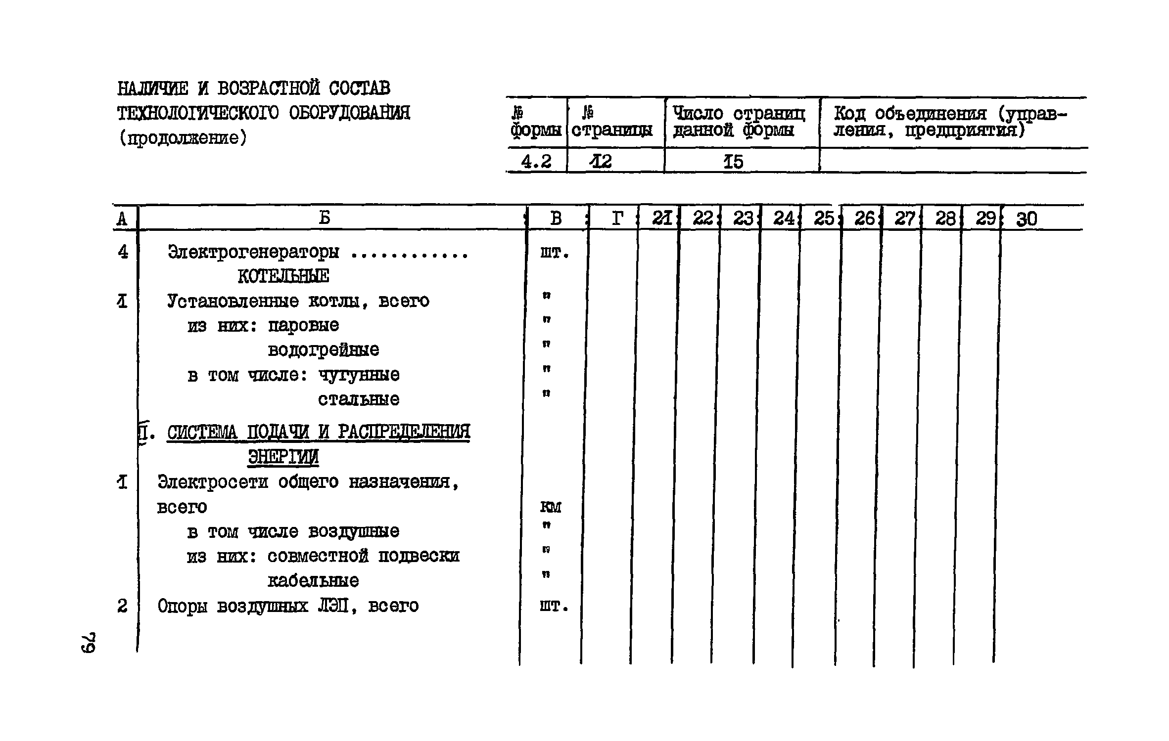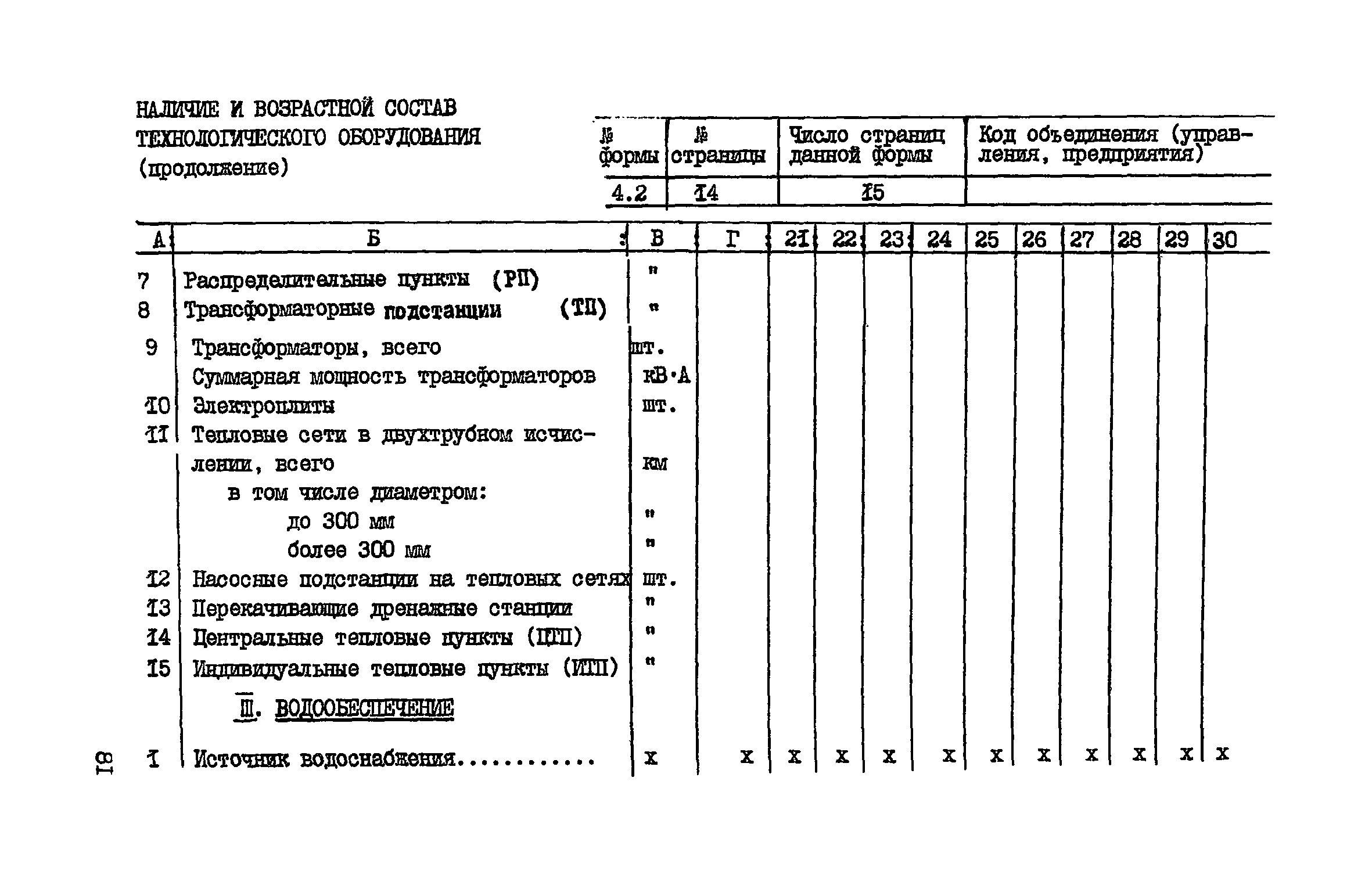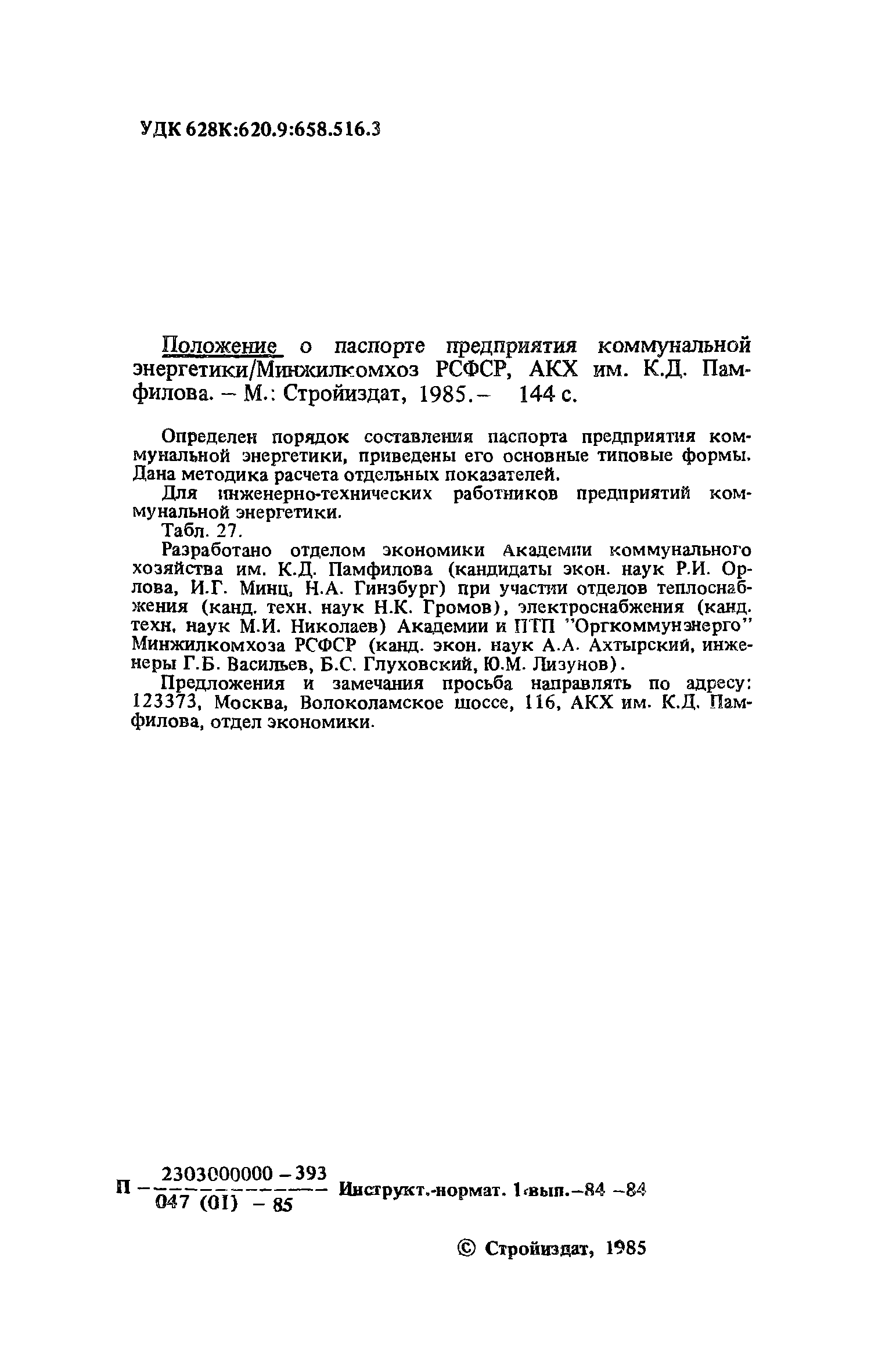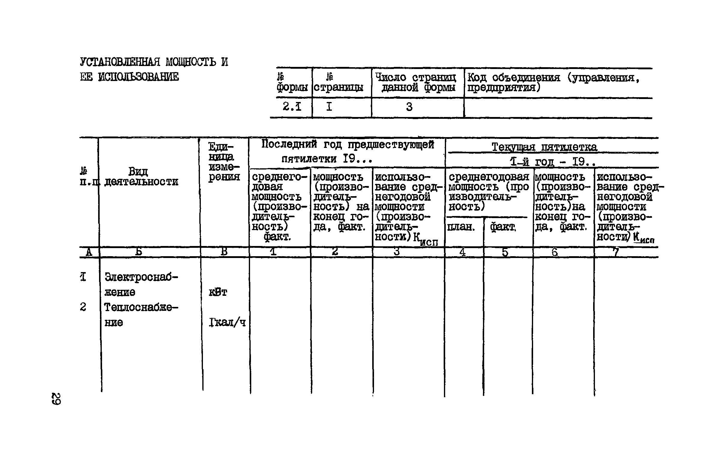 | Оглавление: | 1. Введение 2. Порядок составления паспорта 3. Общие данные по объединению (управлению, предприятию) 4. Мощность и ее использование 5. Производство и реализация энергии 6. Основные фонды и капитальное строительство 7. Материальные ресурсы 8. Трудовые ресурсы и социальное развитие 9. Финансовые показатели 10. Организационно-технический уровень производства 11. Охрана природы и рациональное использование природных ресурсов 12. Обслуживающее хозяйство 13. Приложение. Паспорт предприятия коммунальной энергетики (типовые формы) |