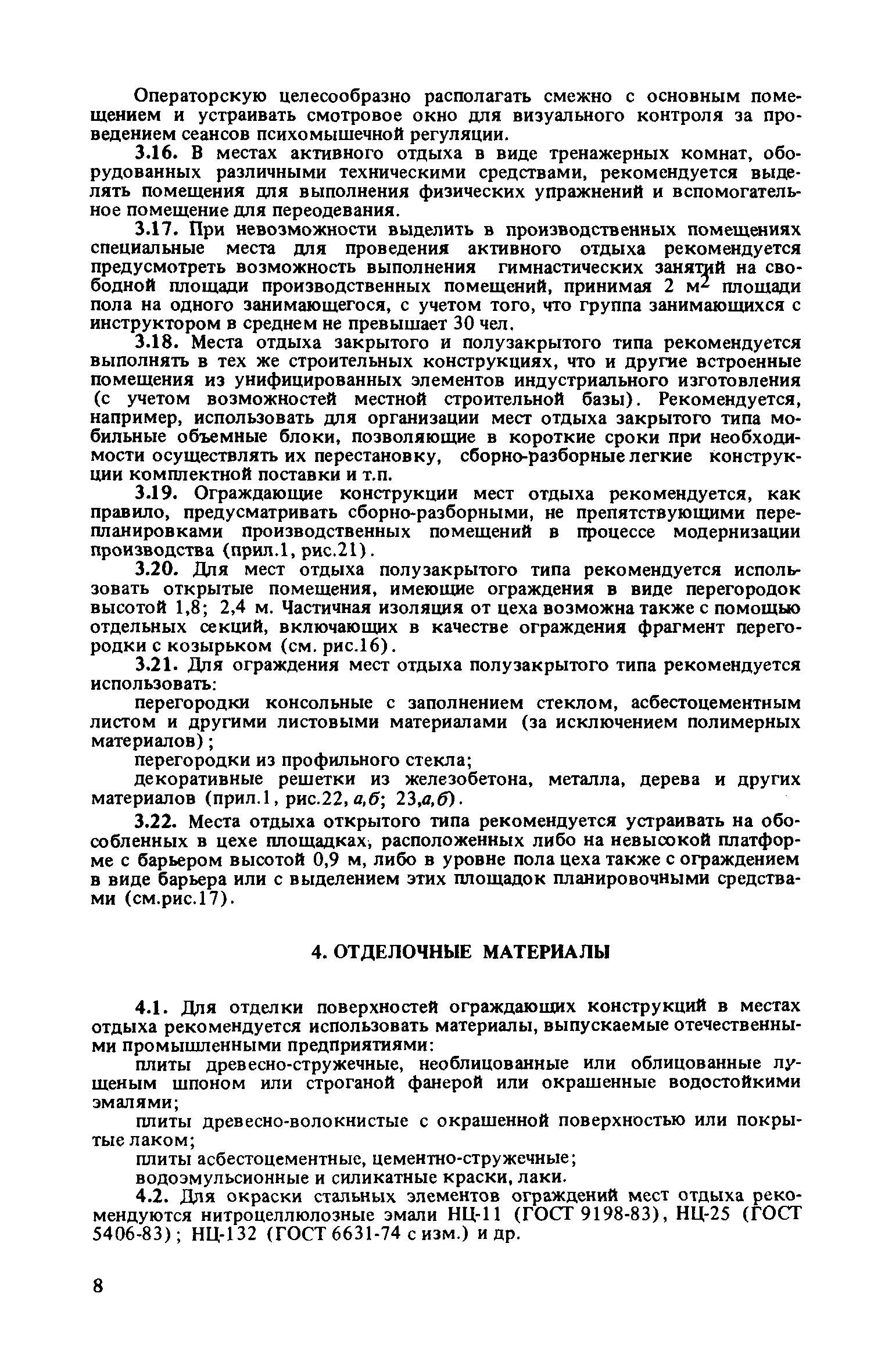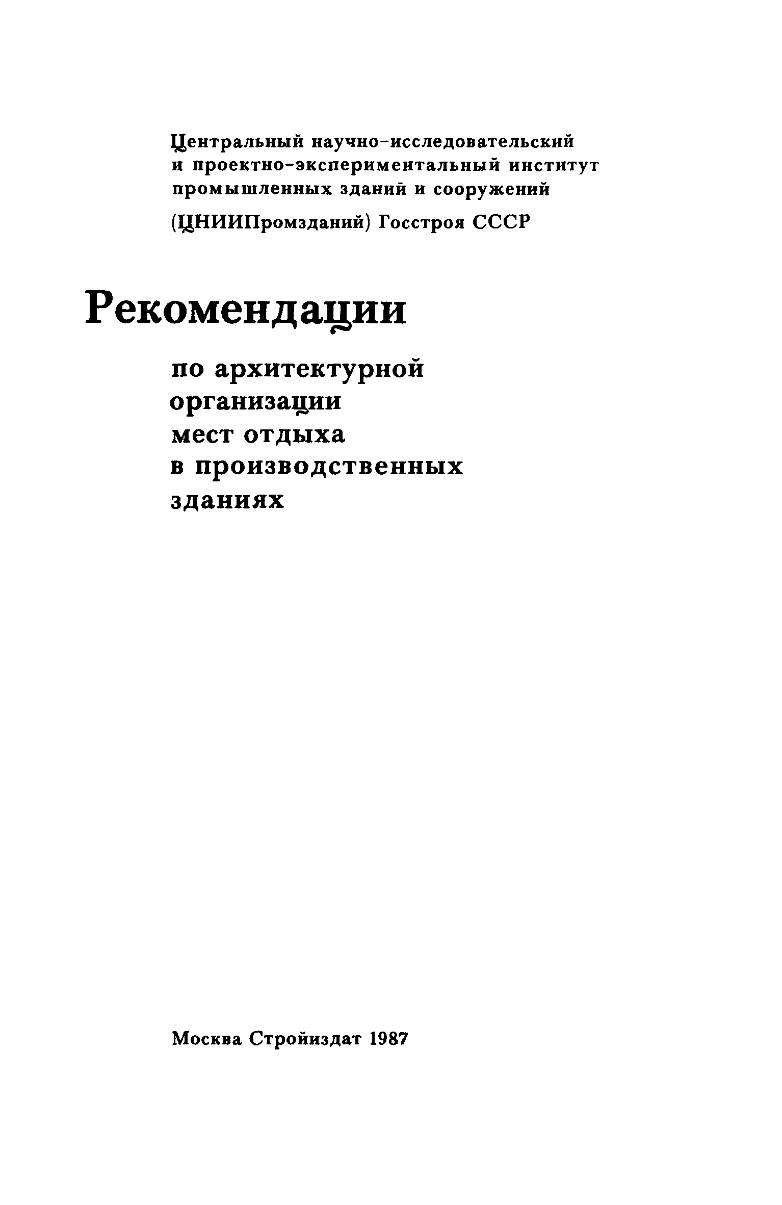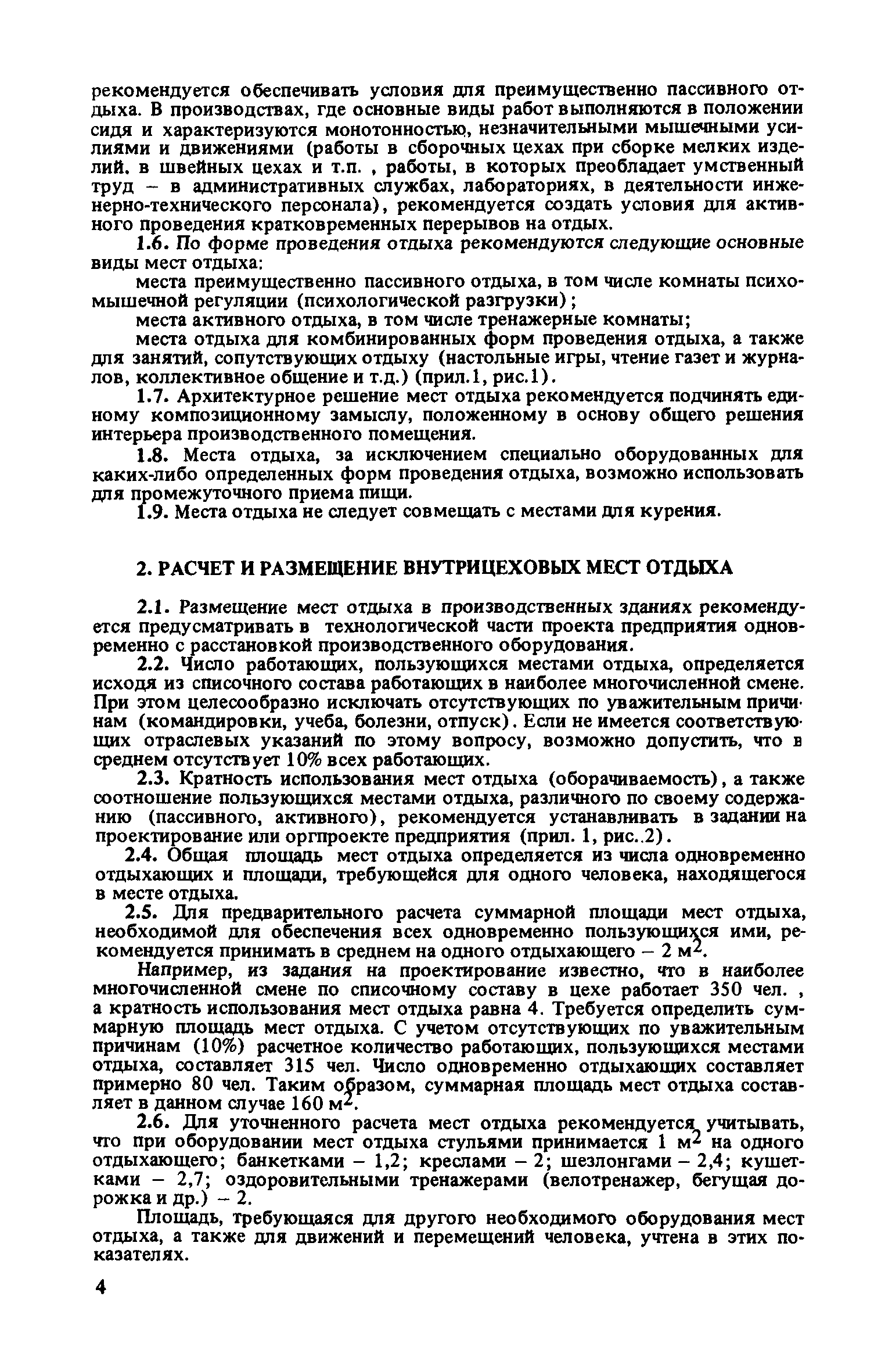 | Область применения: | В документ включены основные положения, связанные с расчетом мест отдыха, размещением их в производственных зданиях, объемно-планировочными решениями, оборудованием в соответствии с формой проведения отдыха, материалами, используемыми для ограждения и отделки, озеленением, применением в устройстве мест отдыха элементов индустриального изготовления, эстетическими требованиями к местам отдыха, являющимися составной частью производственного интерьера. |