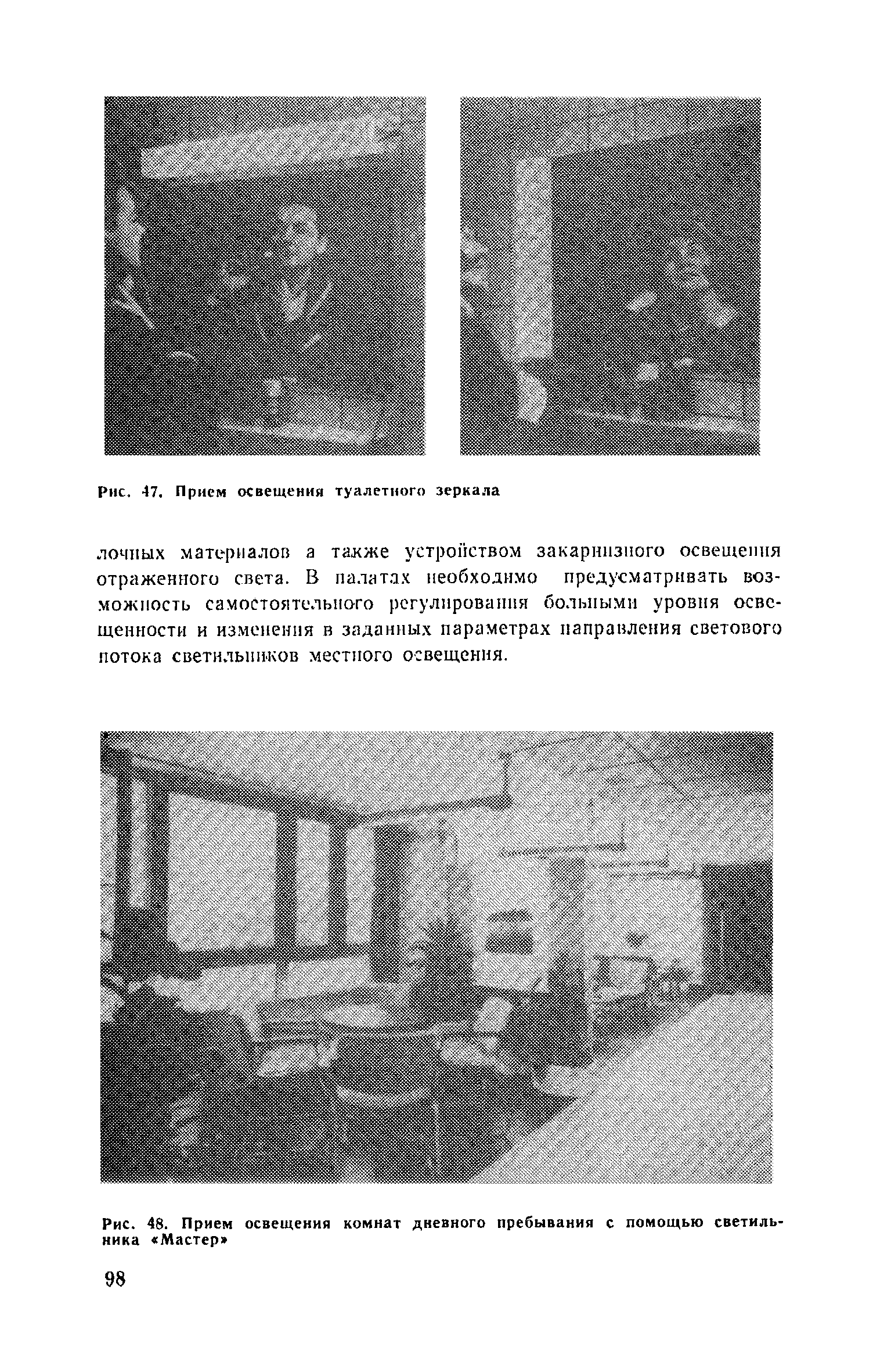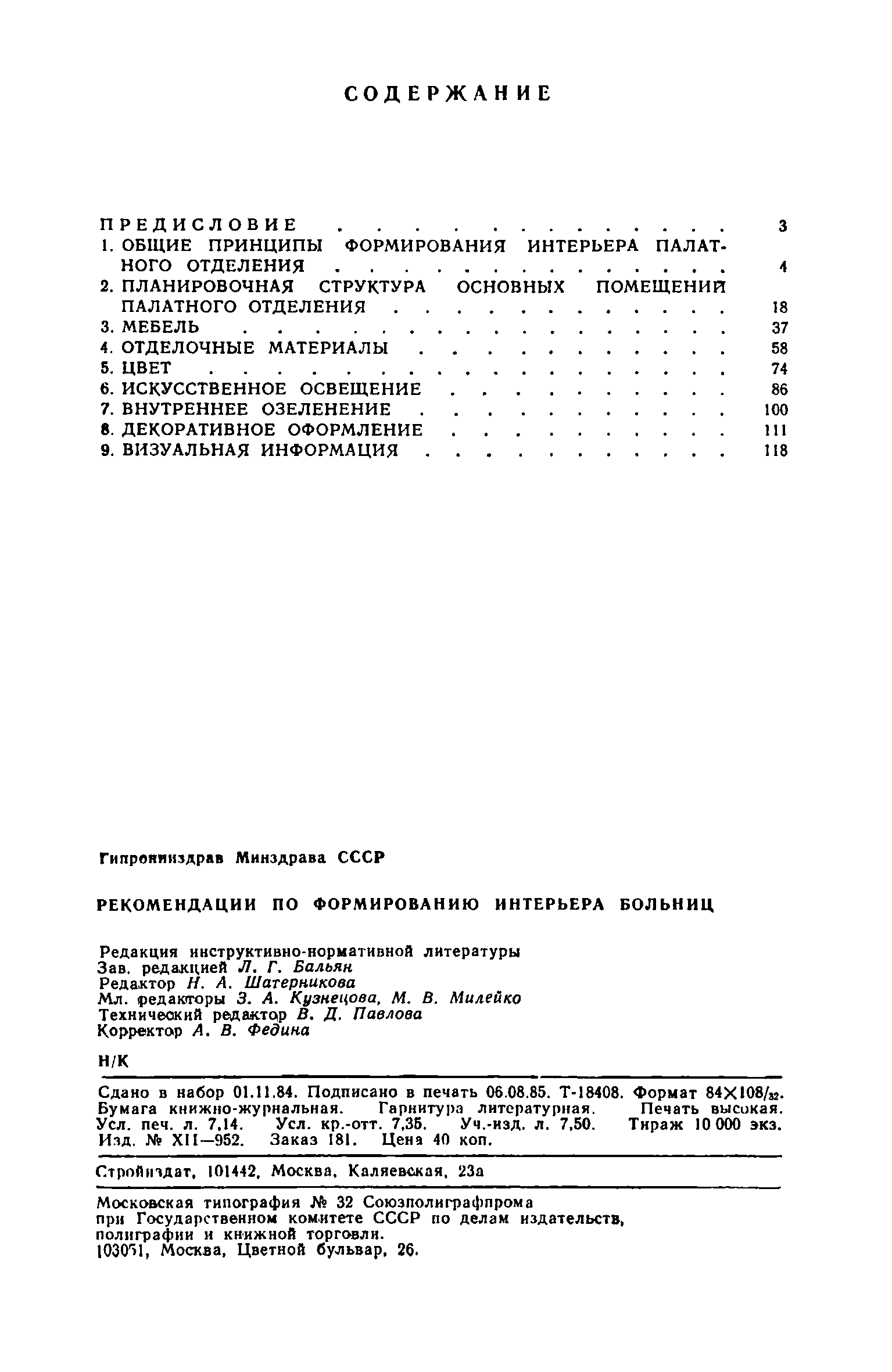 | Оглавление: | Предисловие 1. Общие принципы формирования интерьера палатного отделения 2. Планировочная структура основных помещений палатного отделения 3. Мебель 4. Отделочные материалы 5. Цвет 6. Искусственное освещение 7. Внутреннее озеленение 8. Декоративное оформление 9. Визуальная информация |