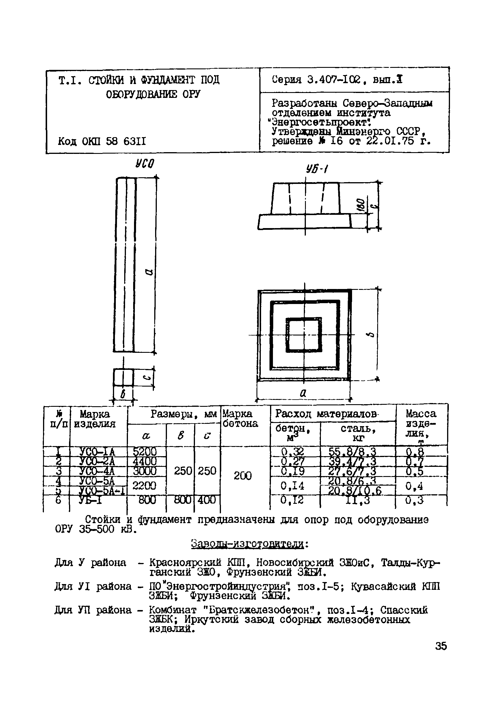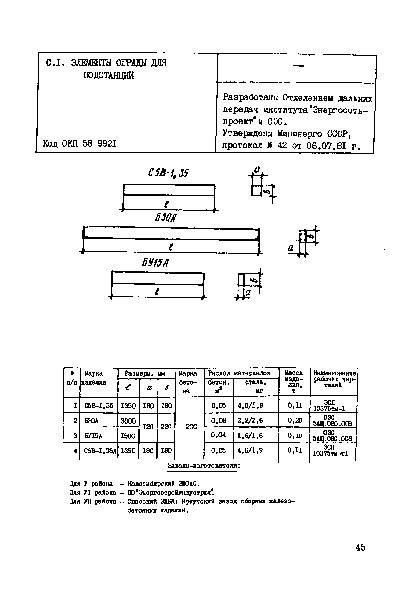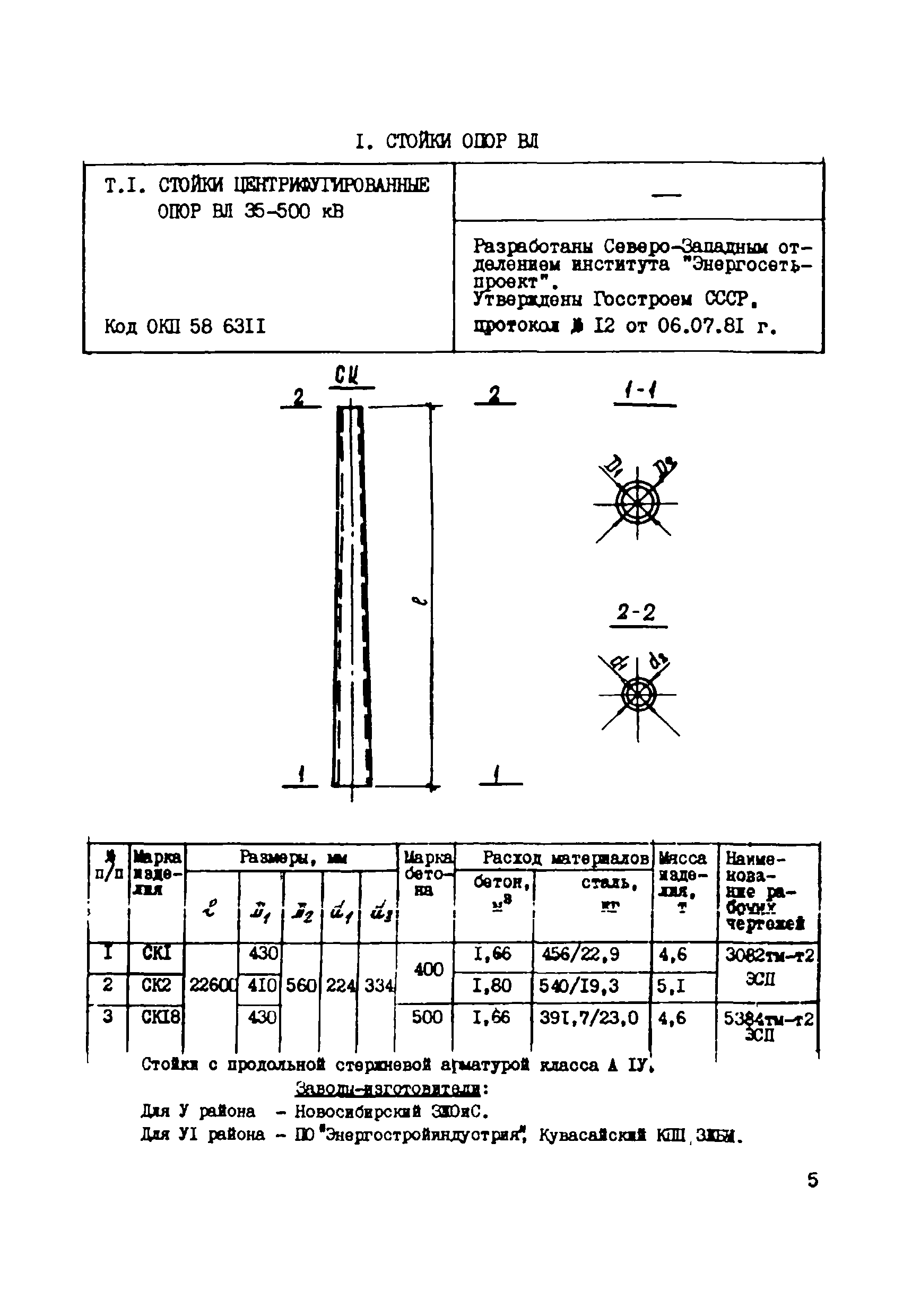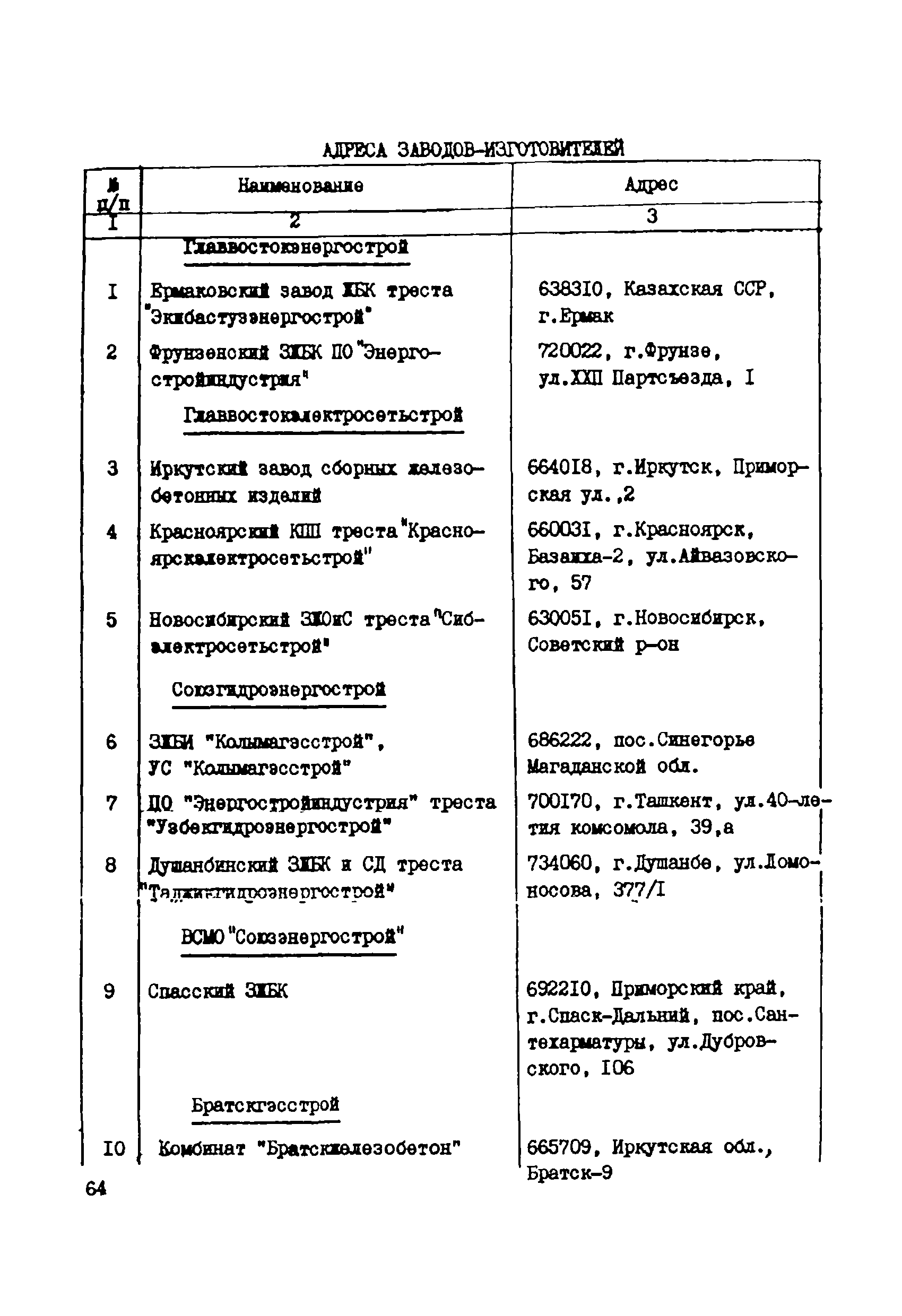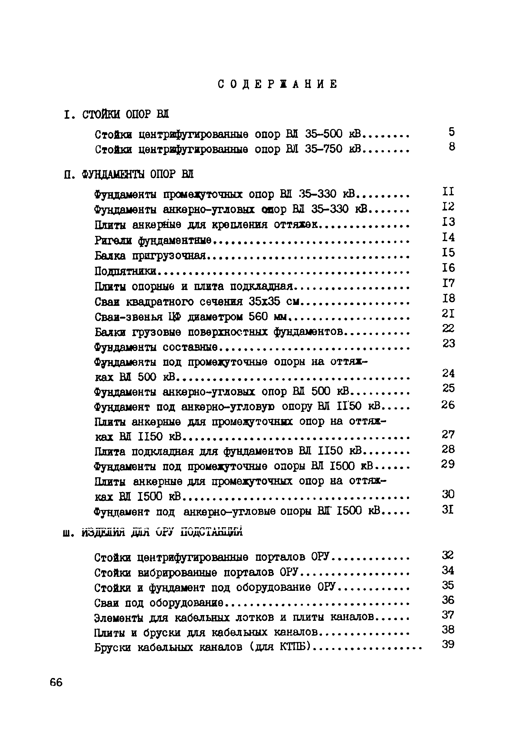 | Оглавление: | I. Стойки опор ВЛ Стойки центрифугированные опор ВЛ 35-500 кВ Стойки центрифугированные опор ВЛ 35-750 кВ II. Фундаменты опор ВЛ Фундаменты промежуточных опор ВЛ 35-330 кВ Фундаменты анкерно-угловых опор ВЛ 35-330 кВ Плиты анкерные для крепления оттяжек Ригели фундаментные Балка пригрузочная Подпятники Плиты опорные и плита подкладная Сваи квадратного сечения 35х35 см Сваи-звенья ЦФ диаметром 560 мм Балки грузовые поверхностных фундаментов Фундаменты составные Фундаменты под промежуточные опоры на оттяжках ВЛ 500 кВ Фундаменты анкерно-угловых опор ВЛ 500 кВ Фундамент под анкерно-угловую опору ВЛ 1150 кВ Плиты анкерные для промежуточных опор на оттяжках ВЛ 1150 кВ Плита подкладная для фундаментов ВЛ 1150 кв Фундаменты под промежуточные опоры ВЛ 1500 кВ Плиты анкерные для промежуточных опор на оттяжках ВЛ 1500 кВ Фундамент под анкерно-угловые опоры ВЛ 1500 кВ III. Изделия для ОРУ подстанций Стойки центрифугированные порталов ОРУ Стойки вибрированные порталов ОРУ Стойки и фундамент под оборудование ОРУ Сваи под оборудование Элементы для кабельных лотков и плиты каналов Плиты и бруски для кабельных каналов Бруски кабельных каналов (для КТПБ) Плиты для КРУНов, ограждения маслосборников и огнезащитной стенки Плиты для укладки железнодорожных путей ОРУ и установки трансформаторов Плита для установки трансформаторов Брусья для перекатки трансформаторов Элементы конструкций КТПБ. Лежни Элементы ограды для подстанций IV. Изделия для быстромонтируемых зданий подстанций Секции быстромонтируемых зданий (БМЗ) Панели кровельные Панели стеновые Панели стеновые с проемами ворот Панели стеновые торца здания Панель карнизная Плита пола Колодцы сборные большого, среднего и малого типов Столбики замерные кабельные V. Изделия для строительства сельских линий и подстанций Стойки для опор ВЛ 0,38 кВ Стойки для опор ВЛ 0,38-10 кВ Стойки для опор ВЛ 6-10 и 35 кВ Приставки для деревянных опор ВЛ 0,38-10 кВ Плиты опорно-анкерные для ВЛ 0,38-10 кВ Анкер для опор ВЛ 10-35 кВ Фундамент под КТП 10/0,38 кВ Адреса заводов-изготовителей |