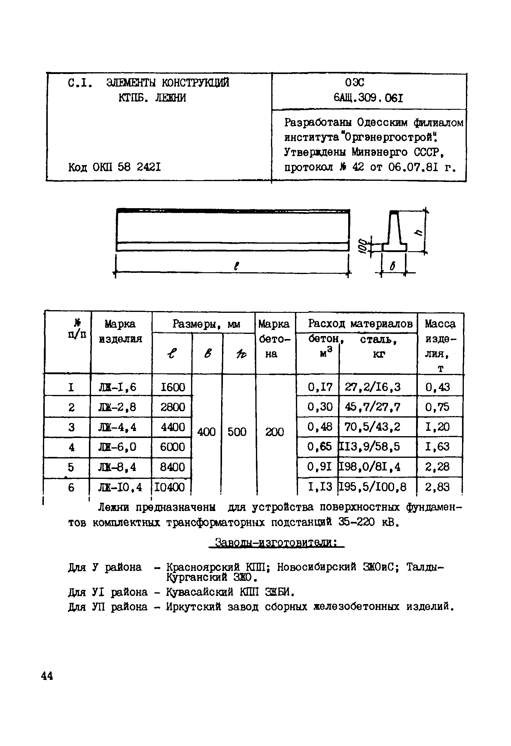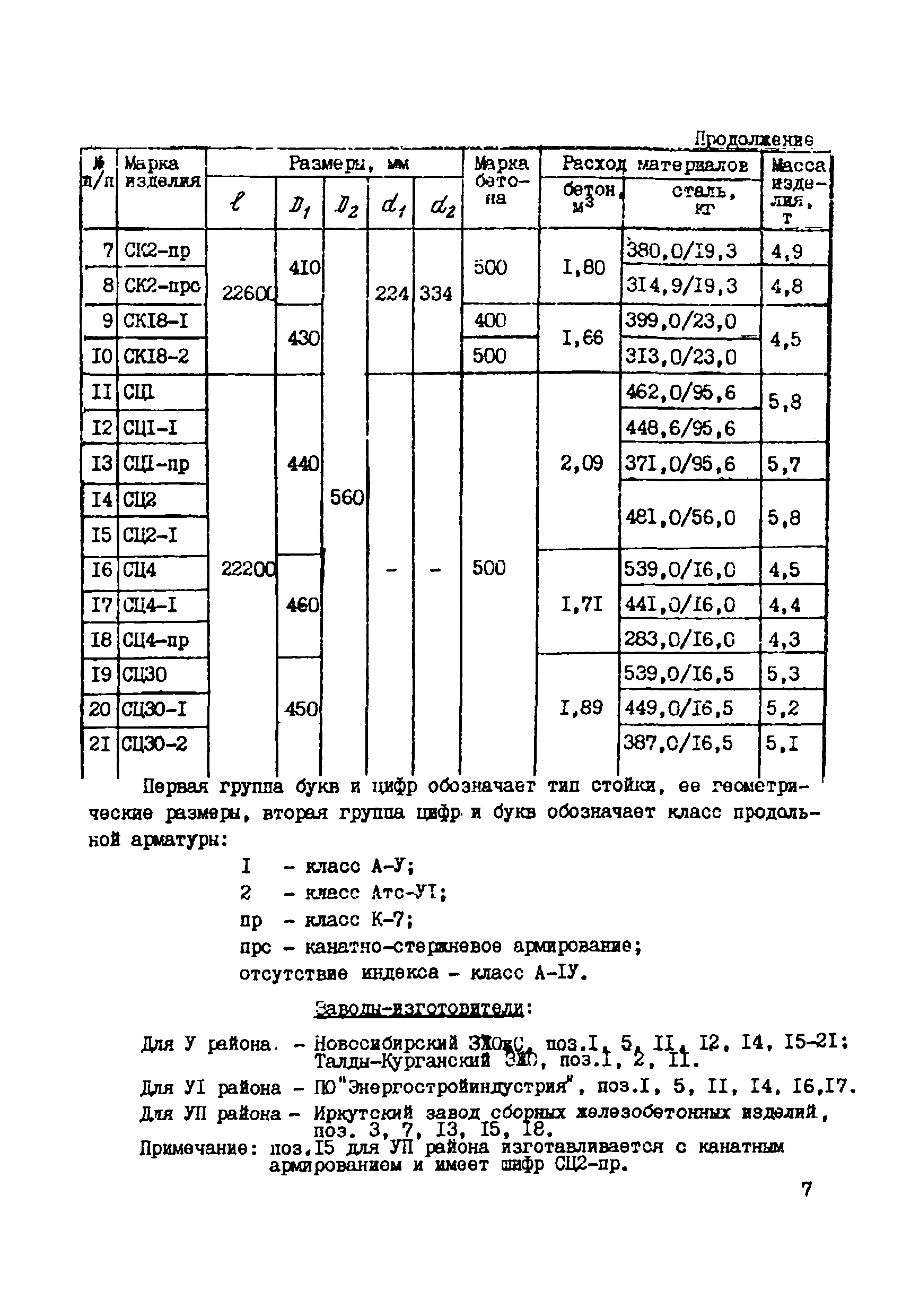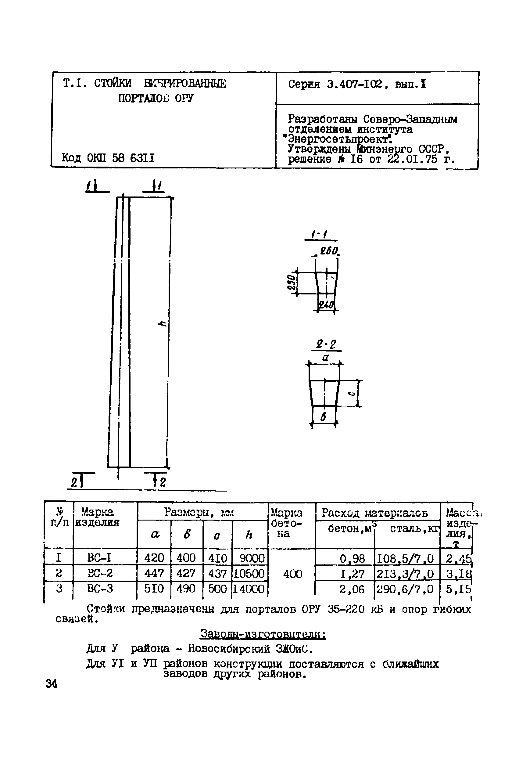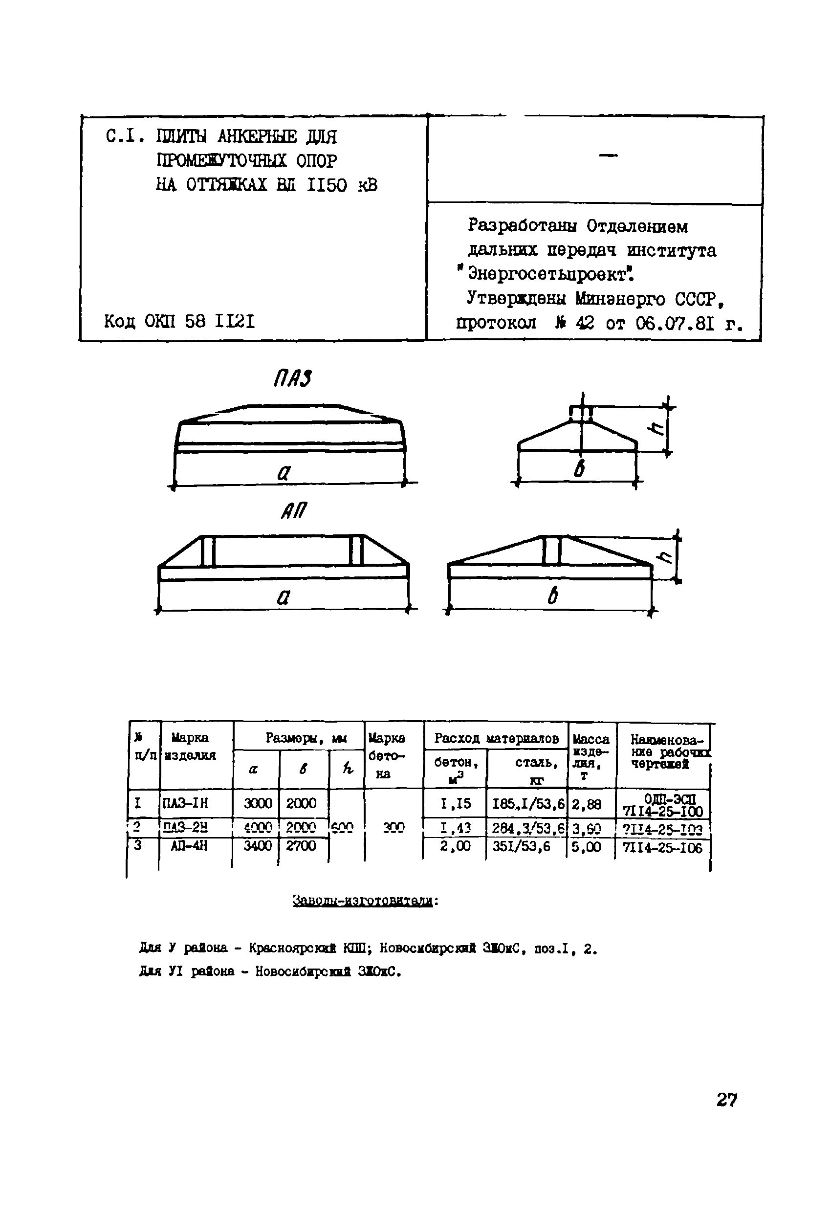 | Оглавление: | I. Стойки опор ВЛ Стойки центрифугированные опор ВЛ 35-500 кВ Стойки центрифугированные опор ВЛ 35-750 кВ II. Фундаменты опор ВЛ Фундаменты промежуточных опор ВЛ 35-330 кВ Фундаменты анкерно-угловых опор ВЛ 35-330 кВ Плиты анкерные для крепления оттяжек Ригели фундаментные Балка пригрузочная Подпятники Плиты опорные и плита подкладная Сваи квадратного сечения 35х35 см Сваи-звенья ЦФ диаметром 560 мм Балки грузовые поверхностных фундаментов Фундаменты составные Фундаменты под промежуточные опоры на оттяжках ВЛ 500 кВ Фундаменты анкерно-угловых опор ВЛ 500 кВ Фундамент под анкерно-угловую опору ВЛ 1150 кВ Плиты анкерные для промежуточных опор на оттяжках ВЛ 1150 кВ Плита подкладная для фундаментов ВЛ 1150 кв Фундаменты под промежуточные опоры ВЛ 1500 кВ Плиты анкерные для промежуточных опор на оттяжках ВЛ 1500 кВ Фундамент под анкерно-угловые опоры ВЛ 1500 кВ III. Изделия для ОРУ подстанций Стойки центрифугированные порталов ОРУ Стойки вибрированные порталов ОРУ Стойки и фундамент под оборудование ОРУ Сваи под оборудование Элементы для кабельных лотков и плиты каналов Плиты и бруски для кабельных каналов Бруски кабельных каналов (для КТПБ) Плиты для КРУНов, ограждения маслосборников и огнезащитной стенки Плиты для укладки железнодорожных путей ОРУ и установки трансформаторов Плита для установки трансформаторов Брусья для перекатки трансформаторов Элементы конструкций КТПБ. Лежни Элементы ограды для подстанций IV. Изделия для быстромонтируемых зданий подстанций Секции быстромонтируемых зданий (БМЗ) Панели кровельные Панели стеновые Панели стеновые с проемами ворот Панели стеновые торца здания Панель карнизная Плита пола Колодцы сборные большого, среднего и малого типов Столбики замерные кабельные V. Изделия для строительства сельских линий и подстанций Стойки для опор ВЛ 0,38 кВ Стойки для опор ВЛ 0,38-10 кВ Стойки для опор ВЛ 6-10 и 35 кВ Приставки для деревянных опор ВЛ 0,38-10 кВ Плиты опорно-анкерные для ВЛ 0,38-10 кВ Анкер для опор ВЛ 10-35 кВ Фундамент под КТП 10/0,38 кВ Адреса заводов-изготовителей |