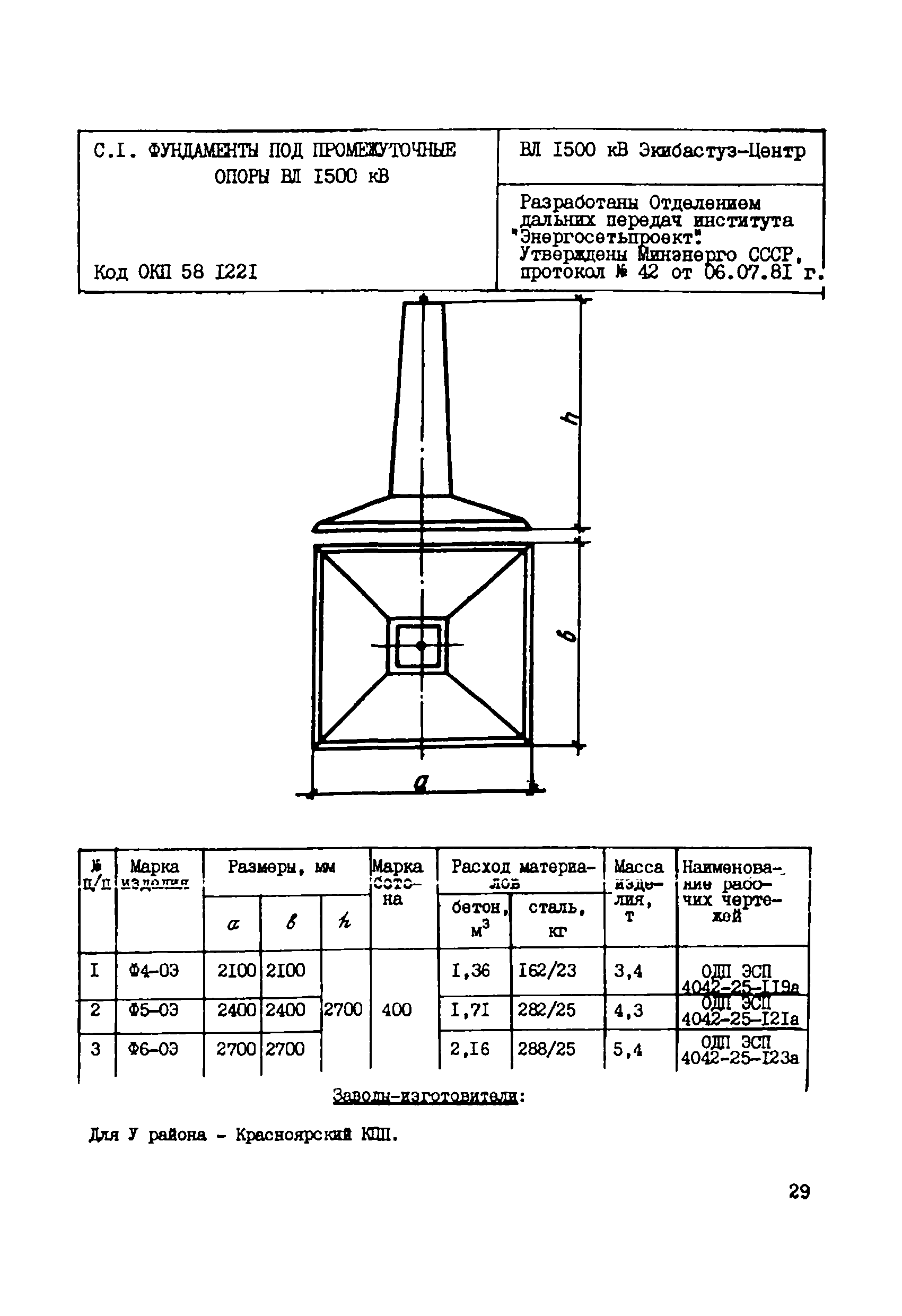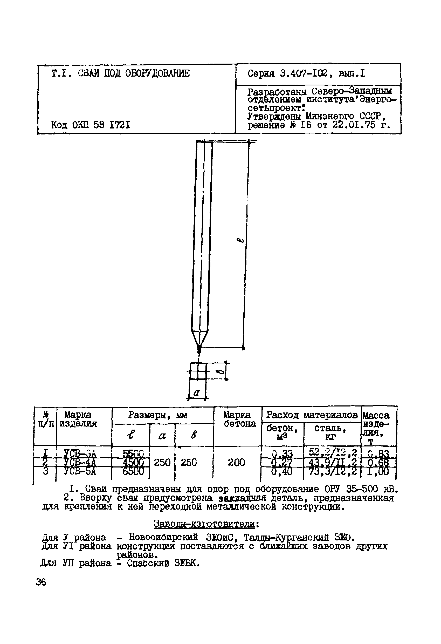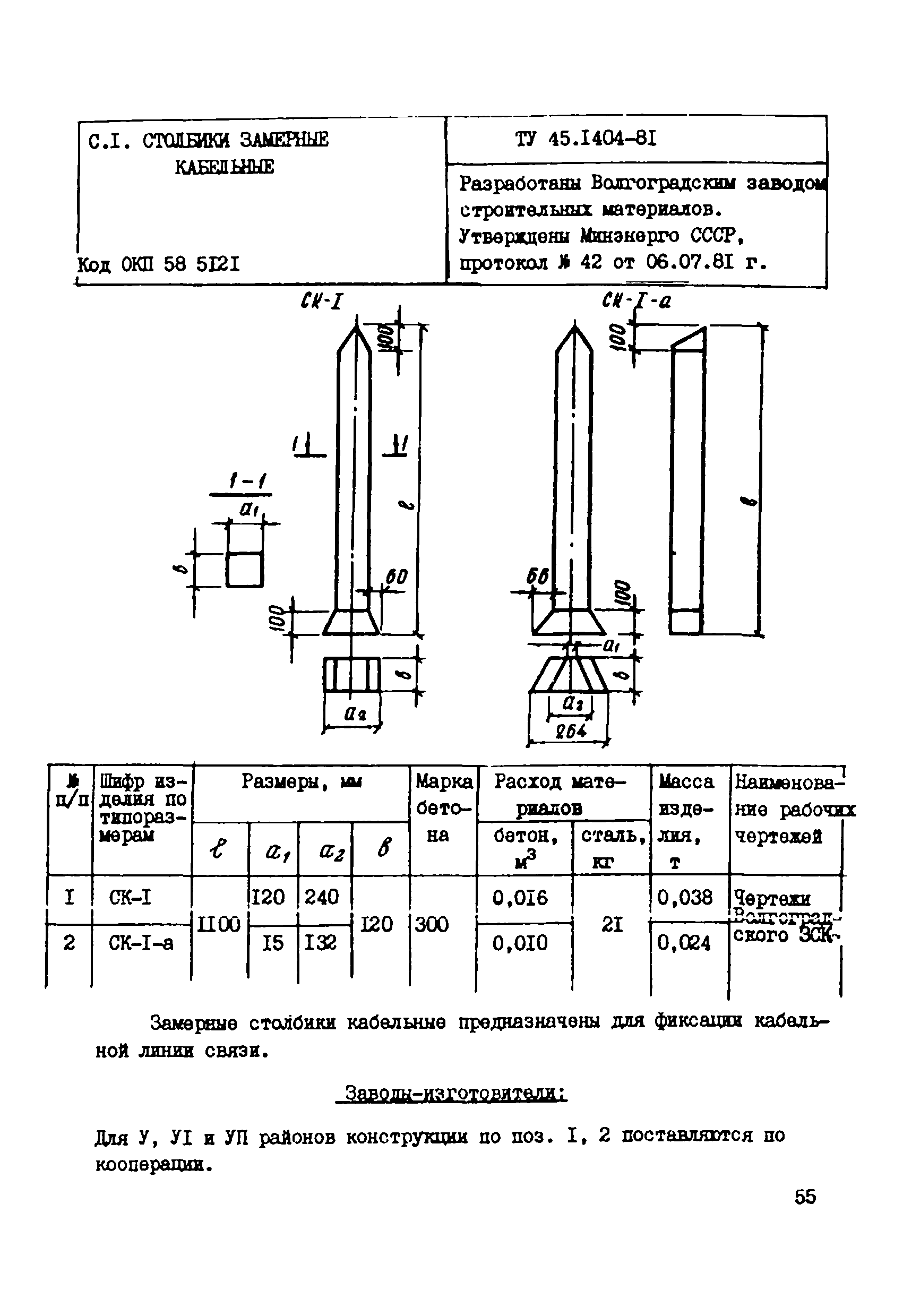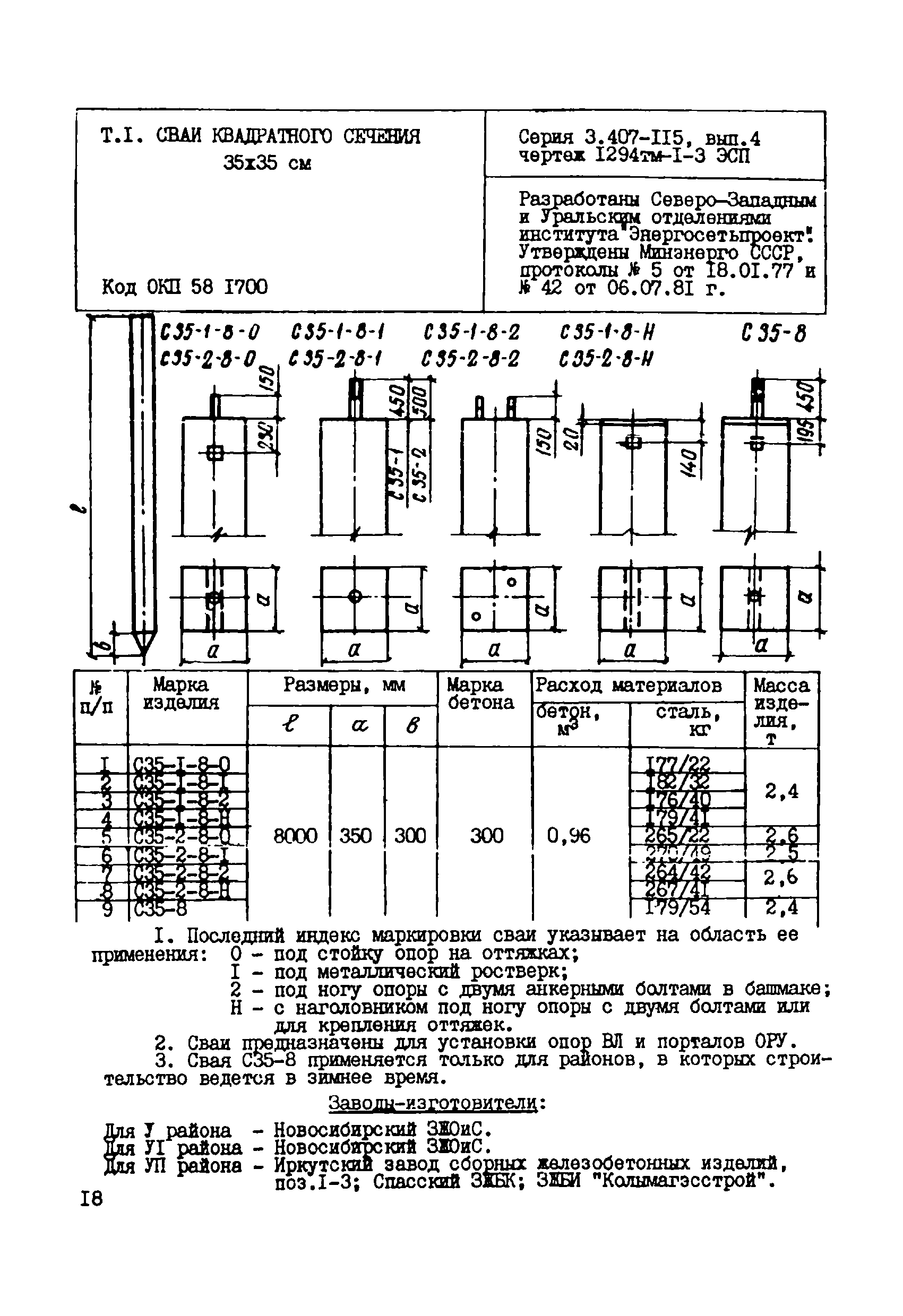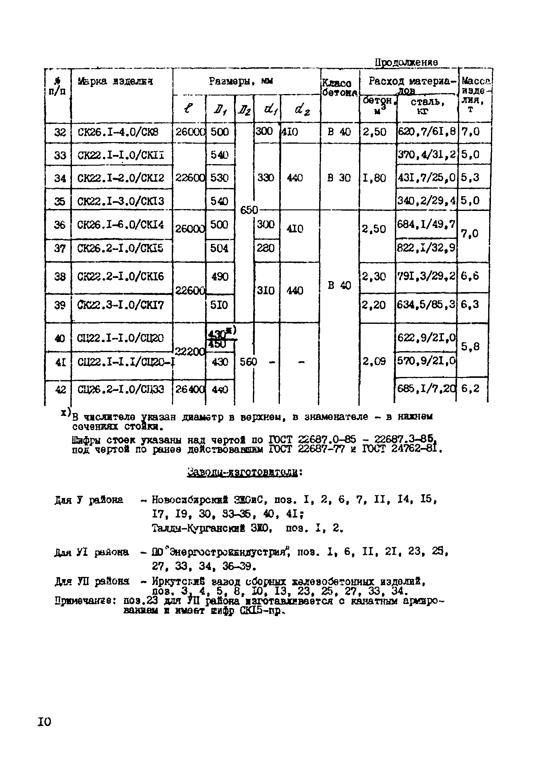 | Оглавление: | I. Стойки опор ВЛ Стойки центрифугированные опор ВЛ 35-500 кВ Стойки центрифугированные опор ВЛ 35-750 кВ II. Фундаменты опор ВЛ Фундаменты промежуточных опор ВЛ 35-330 кВ Фундаменты анкерно-угловых опор ВЛ 35-330 кВ Плиты анкерные для крепления оттяжек Ригели фундаментные Балка пригрузочная Подпятники Плиты опорные и плита подкладная Сваи квадратного сечения 35х35 см Сваи-звенья ЦФ диаметром 560 мм Балки грузовые поверхностных фундаментов Фундаменты составные Фундаменты под промежуточные опоры на оттяжках ВЛ 500 кВ Фундаменты анкерно-угловых опор ВЛ 500 кВ Фундамент под анкерно-угловую опору ВЛ 1150 кВ Плиты анкерные для промежуточных опор на оттяжках ВЛ 1150 кВ Плита подкладная для фундаментов ВЛ 1150 кв Фундаменты под промежуточные опоры ВЛ 1500 кВ Плиты анкерные для промежуточных опор на оттяжках ВЛ 1500 кВ Фундамент под анкерно-угловые опоры ВЛ 1500 кВ III. Изделия для ОРУ подстанций Стойки центрифугированные порталов ОРУ Стойки вибрированные порталов ОРУ Стойки и фундамент под оборудование ОРУ Сваи под оборудование Элементы для кабельных лотков и плиты каналов Плиты и бруски для кабельных каналов Бруски кабельных каналов (для КТПБ) Плиты для КРУНов, ограждения маслосборников и огнезащитной стенки Плиты для укладки железнодорожных путей ОРУ и установки трансформаторов Плита для установки трансформаторов Брусья для перекатки трансформаторов Элементы конструкций КТПБ. Лежни Элементы ограды для подстанций IV. Изделия для быстромонтируемых зданий подстанций Секции быстромонтируемых зданий (БМЗ) Панели кровельные Панели стеновые Панели стеновые с проемами ворот Панели стеновые торца здания Панель карнизная Плита пола Колодцы сборные большого, среднего и малого типов Столбики замерные кабельные V. Изделия для строительства сельских линий и подстанций Стойки для опор ВЛ 0,38 кВ Стойки для опор ВЛ 0,38-10 кВ Стойки для опор ВЛ 6-10 и 35 кВ Приставки для деревянных опор ВЛ 0,38-10 кВ Плиты опорно-анкерные для ВЛ 0,38-10 кВ Анкер для опор ВЛ 10-35 кВ Фундамент под КТП 10/0,38 кВ Адреса заводов-изготовителей |