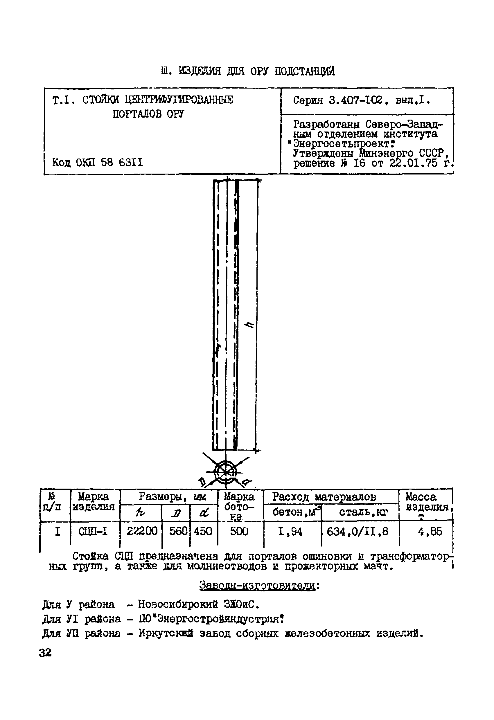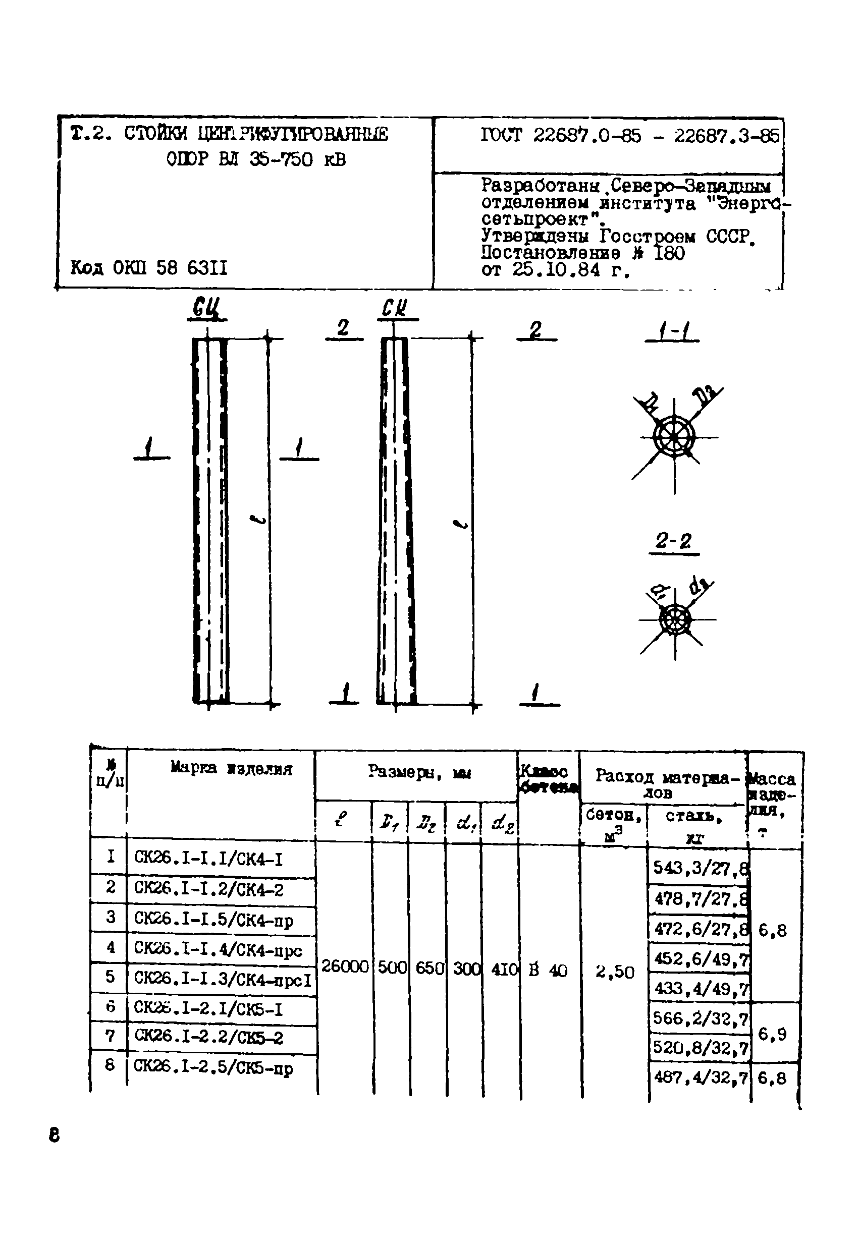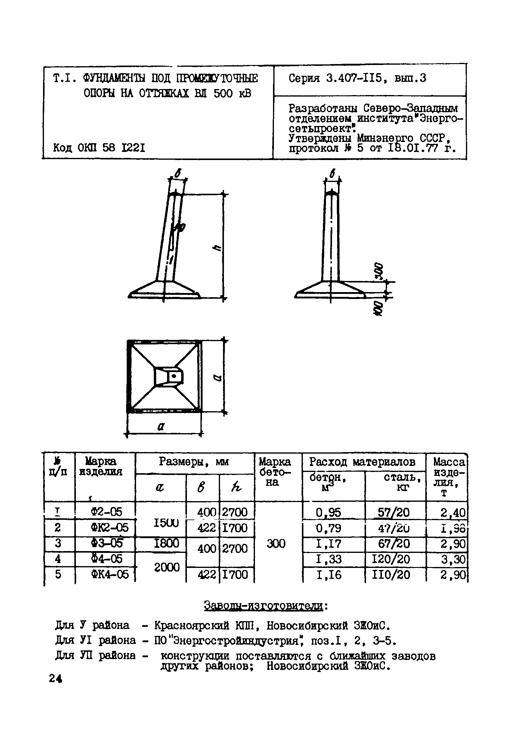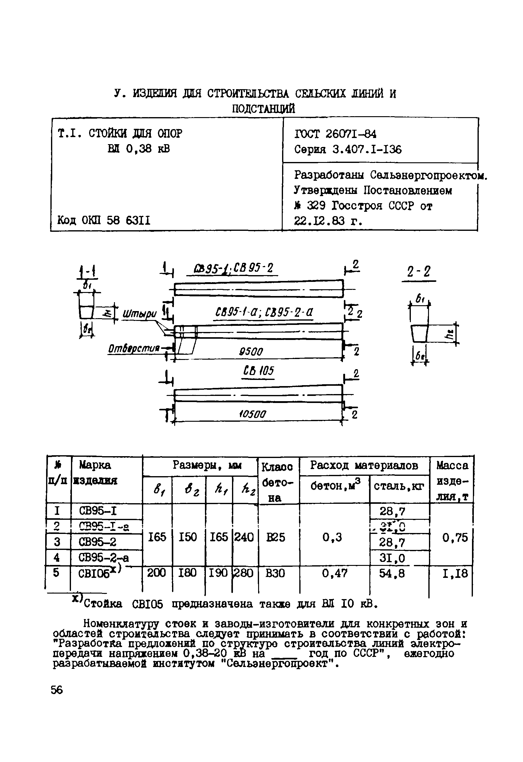 | Оглавление: | I. Стойки опор ВЛ Стойки центрифугированные опор ВЛ 35-500 кВ Стойки центрифугированные опор ВЛ 35-750 кВ II. Фундаменты опор ВЛ Фундаменты промежуточных опор ВЛ 35-330 кВ Фундаменты анкерно-угловых опор ВЛ 35-330 кВ Плиты анкерные для крепления оттяжек Ригели фундаментные Балка пригрузочная Подпятники Плиты опорные и плита подкладная Сваи квадратного сечения 35х35 см Сваи-звенья ЦФ диаметром 560 мм Балки грузовые поверхностных фундаментов Фундаменты составные Фундаменты под промежуточные опоры на оттяжках ВЛ 500 кВ Фундаменты анкерно-угловых опор ВЛ 500 кВ Фундамент под анкерно-угловую опору ВЛ 1150 кВ Плиты анкерные для промежуточных опор на оттяжках ВЛ 1150 кВ Плита подкладная для фундаментов ВЛ 1150 кв Фундаменты под промежуточные опоры ВЛ 1500 кВ Плиты анкерные для промежуточных опор на оттяжках ВЛ 1500 кВ Фундамент под анкерно-угловые опоры ВЛ 1500 кВ III. Изделия для ОРУ подстанций Стойки центрифугированные порталов ОРУ Стойки вибрированные порталов ОРУ Стойки и фундамент под оборудование ОРУ Сваи под оборудование Элементы для кабельных лотков и плиты каналов Плиты и бруски для кабельных каналов Бруски кабельных каналов (для КТПБ) Плиты для КРУНов, ограждения маслосборников и огнезащитной стенки Плиты для укладки железнодорожных путей ОРУ и установки трансформаторов Плита для установки трансформаторов Брусья для перекатки трансформаторов Элементы конструкций КТПБ. Лежни Элементы ограды для подстанций IV. Изделия для быстромонтируемых зданий подстанций Секции быстромонтируемых зданий (БМЗ) Панели кровельные Панели стеновые Панели стеновые с проемами ворот Панели стеновые торца здания Панель карнизная Плита пола Колодцы сборные большого, среднего и малого типов Столбики замерные кабельные V. Изделия для строительства сельских линий и подстанций Стойки для опор ВЛ 0,38 кВ Стойки для опор ВЛ 0,38-10 кВ Стойки для опор ВЛ 6-10 и 35 кВ Приставки для деревянных опор ВЛ 0,38-10 кВ Плиты опорно-анкерные для ВЛ 0,38-10 кВ Анкер для опор ВЛ 10-35 кВ Фундамент под КТП 10/0,38 кВ Адреса заводов-изготовителей |