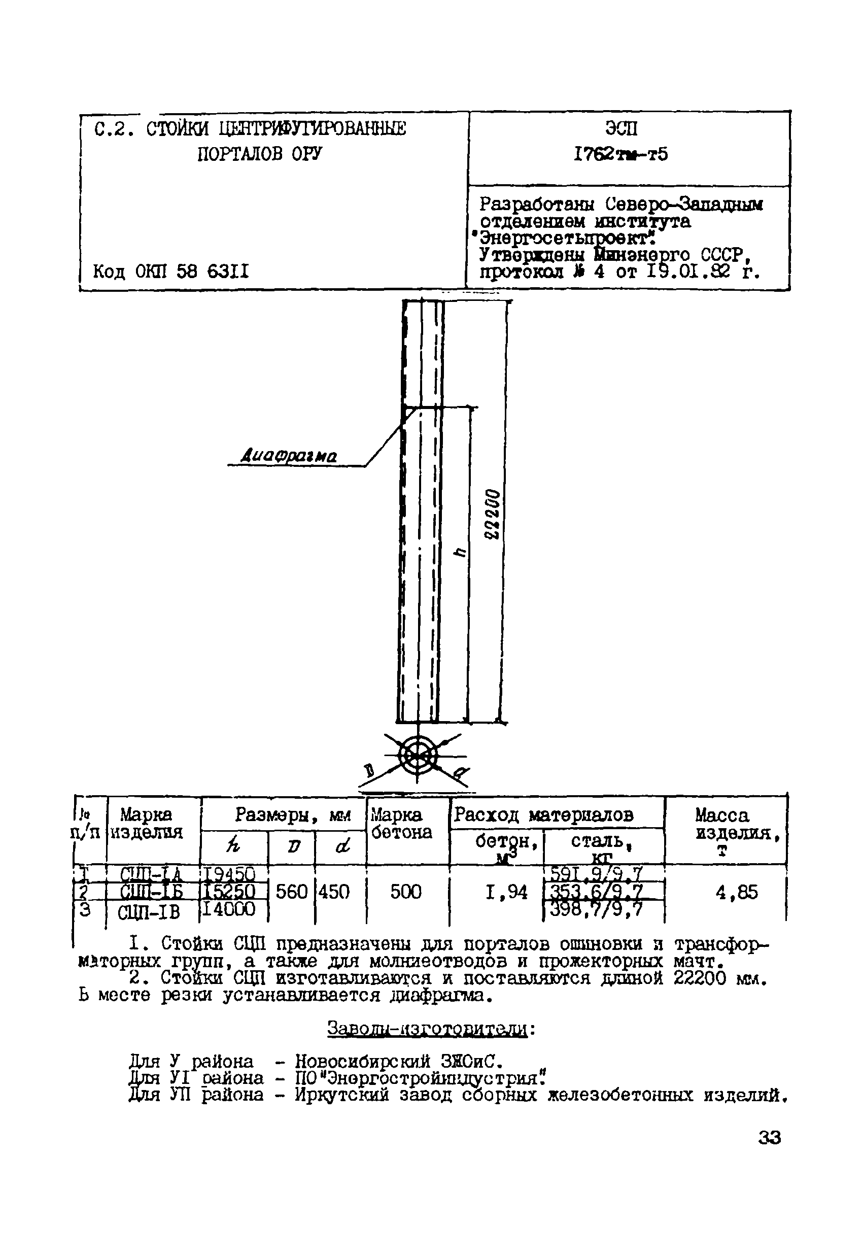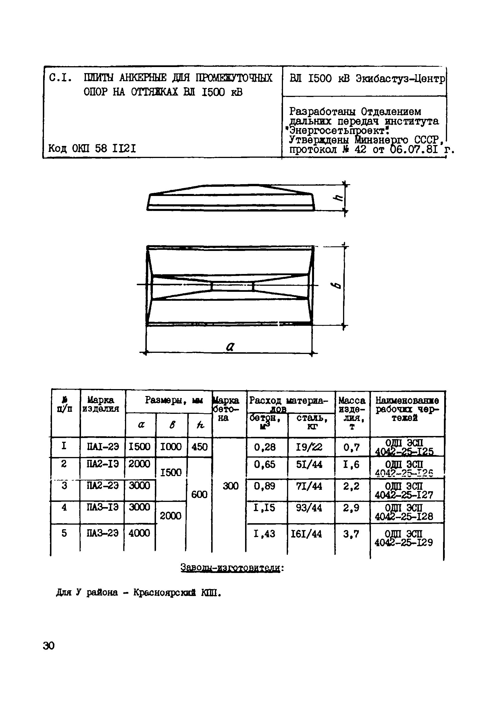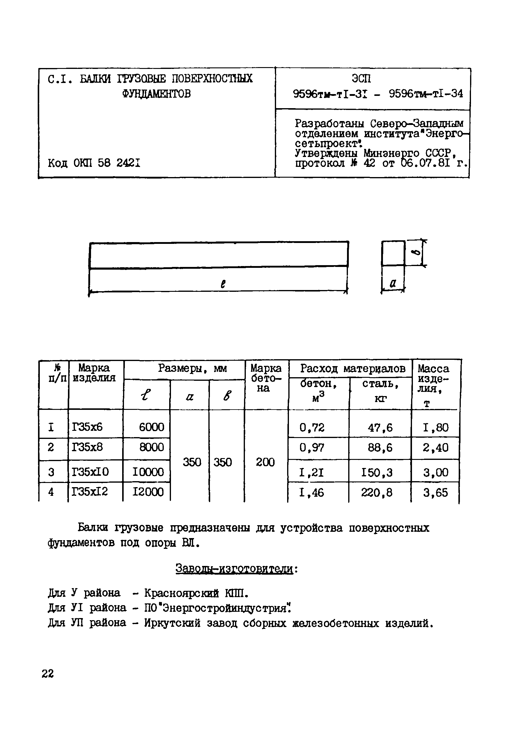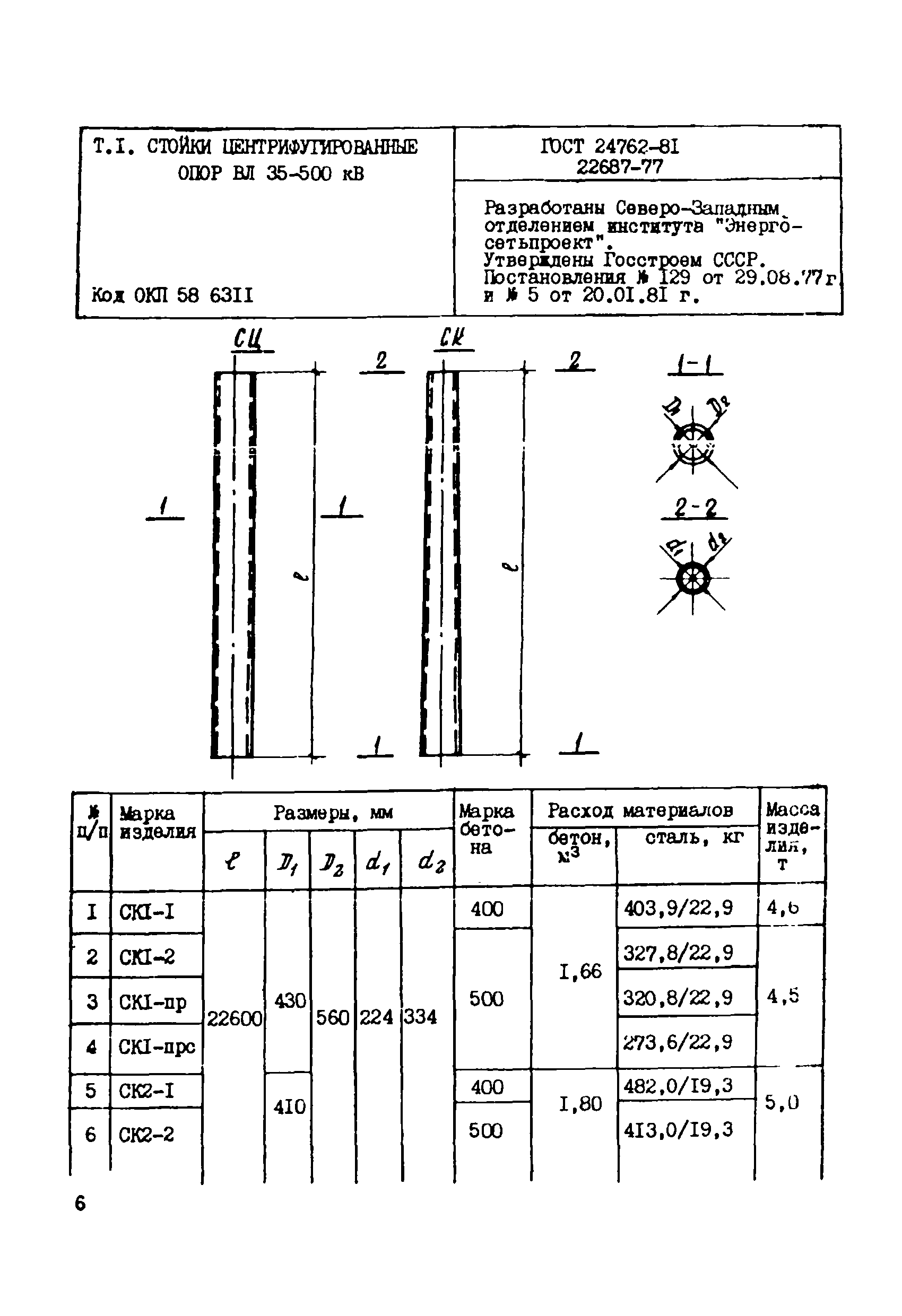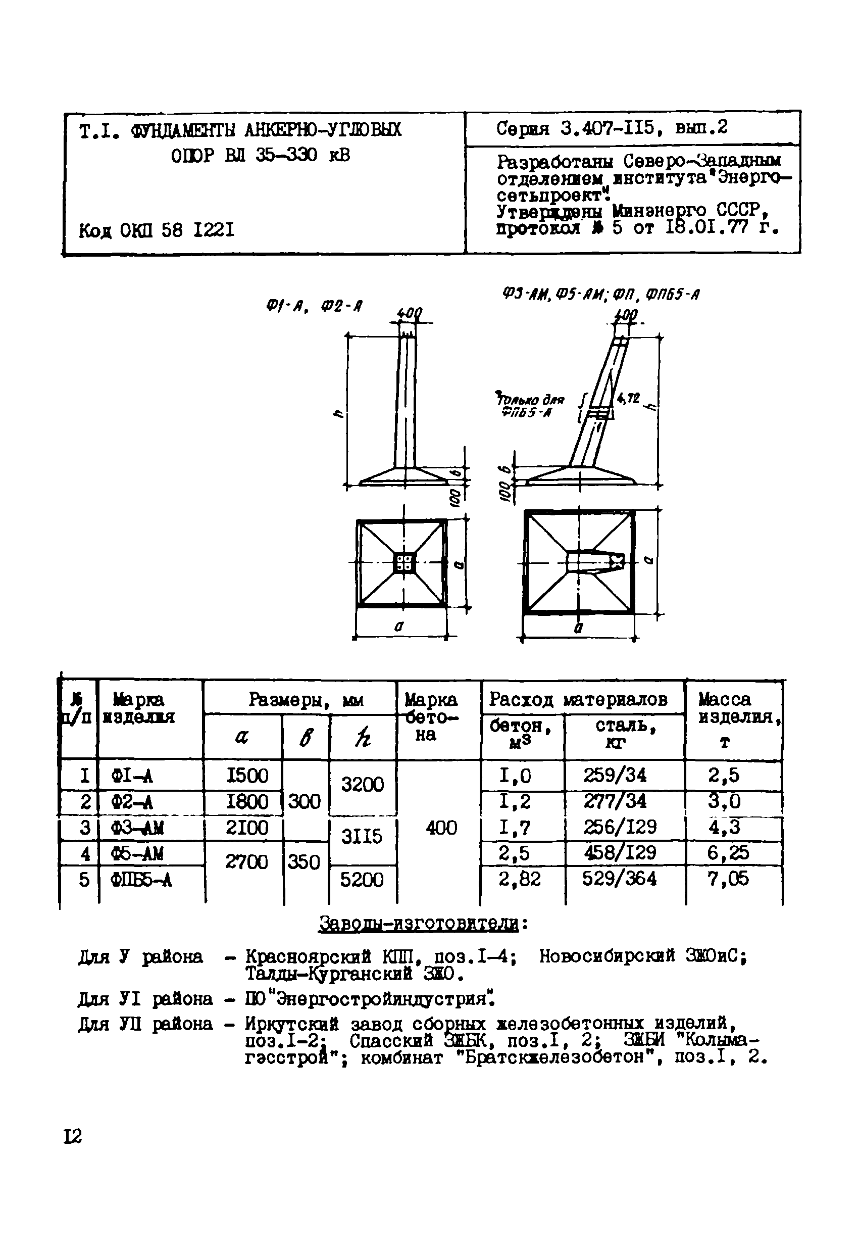 | Оглавление: | I. Стойки опор ВЛ Стойки центрифугированные опор ВЛ 35-500 кВ Стойки центрифугированные опор ВЛ 35-750 кВ II. Фундаменты опор ВЛ Фундаменты промежуточных опор ВЛ 35-330 кВ Фундаменты анкерно-угловых опор ВЛ 35-330 кВ Плиты анкерные для крепления оттяжек Ригели фундаментные Балка пригрузочная Подпятники Плиты опорные и плита подкладная Сваи квадратного сечения 35х35 см Сваи-звенья ЦФ диаметром 560 мм Балки грузовые поверхностных фундаментов Фундаменты составные Фундаменты под промежуточные опоры на оттяжках ВЛ 500 кВ Фундаменты анкерно-угловых опор ВЛ 500 кВ Фундамент под анкерно-угловую опору ВЛ 1150 кВ Плиты анкерные для промежуточных опор на оттяжках ВЛ 1150 кВ Плита подкладная для фундаментов ВЛ 1150 кв Фундаменты под промежуточные опоры ВЛ 1500 кВ Плиты анкерные для промежуточных опор на оттяжках ВЛ 1500 кВ Фундамент под анкерно-угловые опоры ВЛ 1500 кВ III. Изделия для ОРУ подстанций Стойки центрифугированные порталов ОРУ Стойки вибрированные порталов ОРУ Стойки и фундамент под оборудование ОРУ Сваи под оборудование Элементы для кабельных лотков и плиты каналов Плиты и бруски для кабельных каналов Бруски кабельных каналов (для КТПБ) Плиты для КРУНов, ограждения маслосборников и огнезащитной стенки Плиты для укладки железнодорожных путей ОРУ и установки трансформаторов Плита для установки трансформаторов Брусья для перекатки трансформаторов Элементы конструкций КТПБ. Лежни Элементы ограды для подстанций IV. Изделия для быстромонтируемых зданий подстанций Секции быстромонтируемых зданий (БМЗ) Панели кровельные Панели стеновые Панели стеновые с проемами ворот Панели стеновые торца здания Панель карнизная Плита пола Колодцы сборные большого, среднего и малого типов Столбики замерные кабельные V. Изделия для строительства сельских линий и подстанций Стойки для опор ВЛ 0,38 кВ Стойки для опор ВЛ 0,38-10 кВ Стойки для опор ВЛ 6-10 и 35 кВ Приставки для деревянных опор ВЛ 0,38-10 кВ Плиты опорно-анкерные для ВЛ 0,38-10 кВ Анкер для опор ВЛ 10-35 кВ Фундамент под КТП 10/0,38 кВ Адреса заводов-изготовителей |