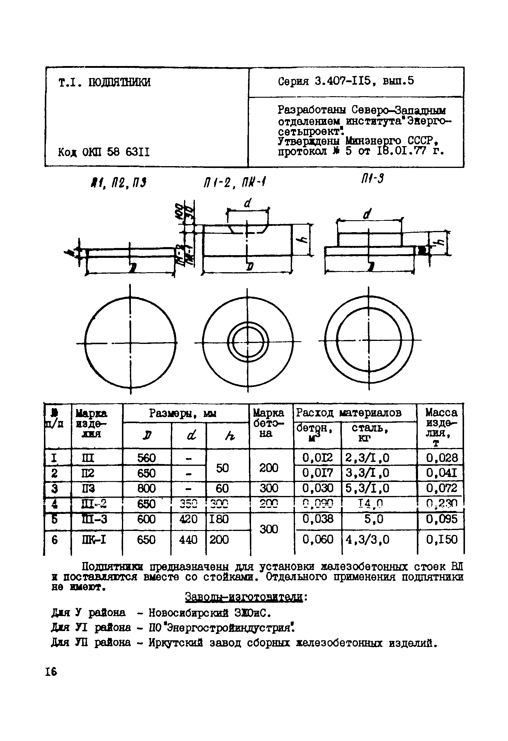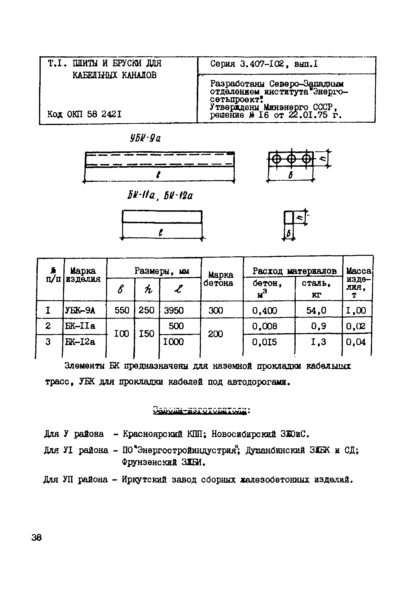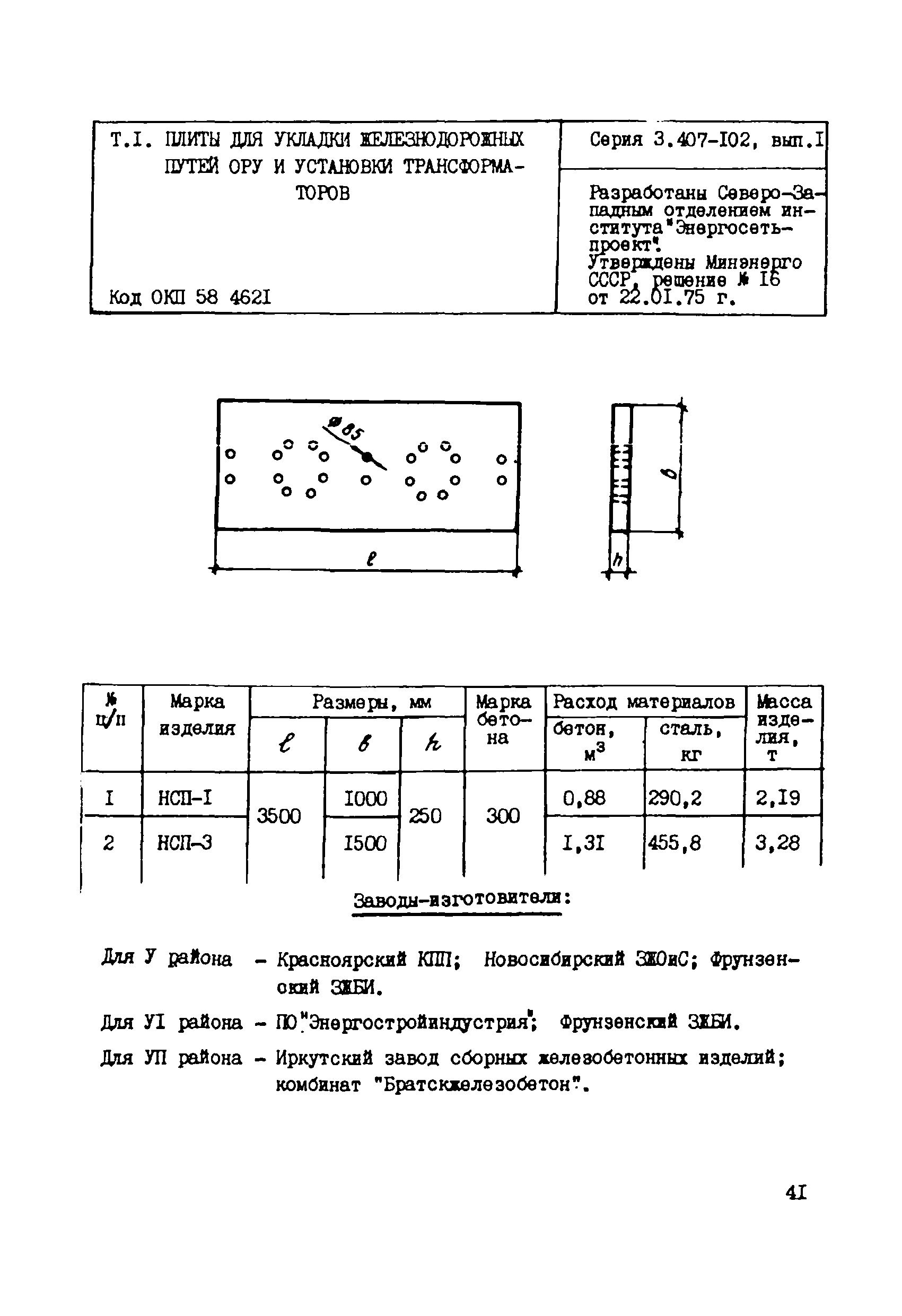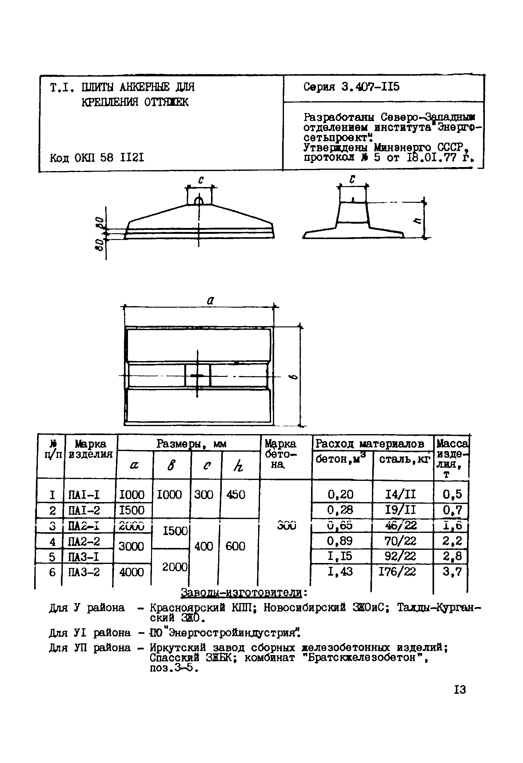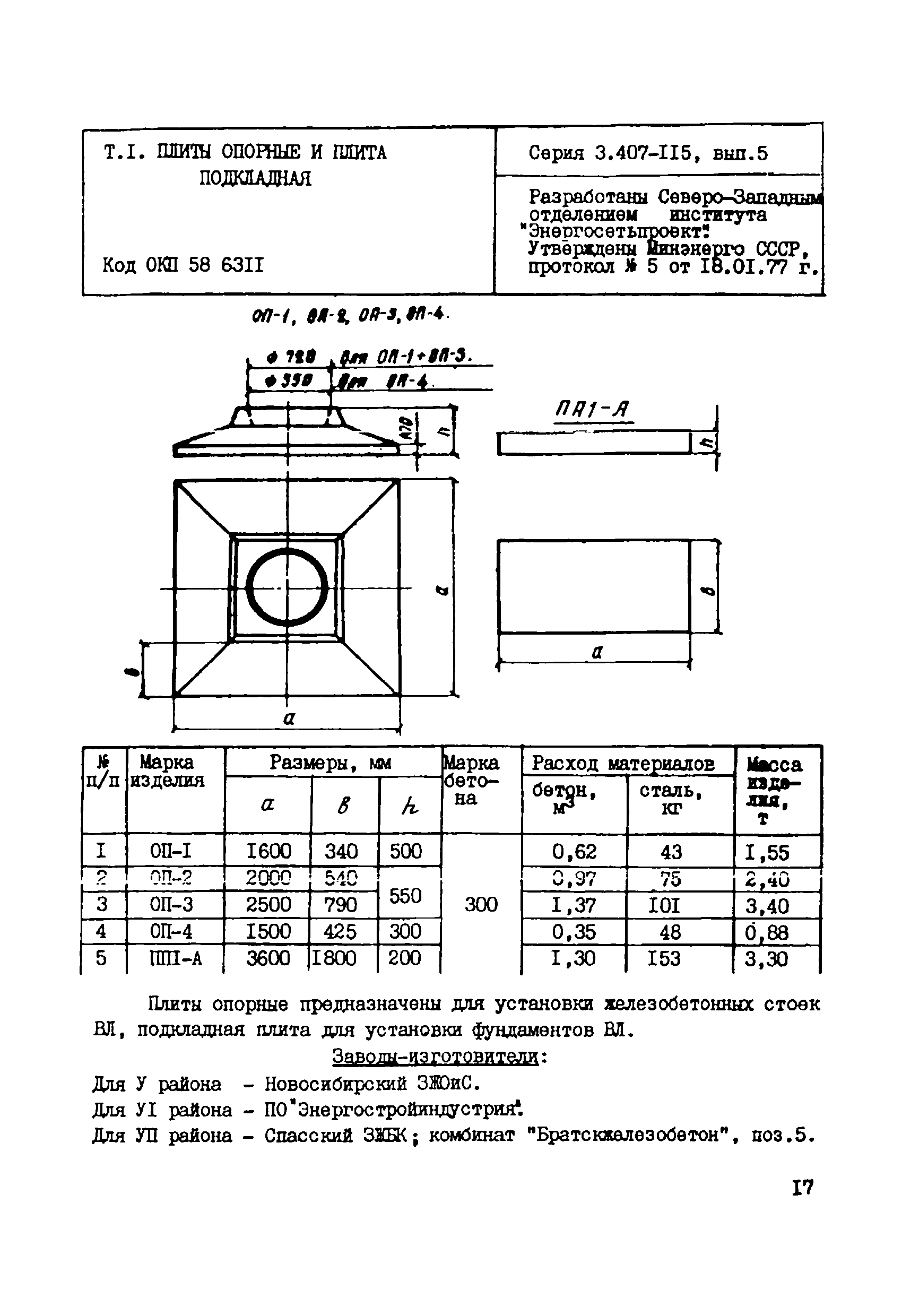 | Оглавление: | I. Стойки опор ВЛ Стойки центрифугированные опор ВЛ 35-500 кВ Стойки центрифугированные опор ВЛ 35-750 кВ II. Фундаменты опор ВЛ Фундаменты промежуточных опор ВЛ 35-330 кВ Фундаменты анкерно-угловых опор ВЛ 35-330 кВ Плиты анкерные для крепления оттяжек Ригели фундаментные Балка пригрузочная Подпятники Плиты опорные и плита подкладная Сваи квадратного сечения 35х35 см Сваи-звенья ЦФ диаметром 560 мм Балки грузовые поверхностных фундаментов Фундаменты составные Фундаменты под промежуточные опоры на оттяжках ВЛ 500 кВ Фундаменты анкерно-угловых опор ВЛ 500 кВ Фундамент под анкерно-угловую опору ВЛ 1150 кВ Плиты анкерные для промежуточных опор на оттяжках ВЛ 1150 кВ Плита подкладная для фундаментов ВЛ 1150 кв Фундаменты под промежуточные опоры ВЛ 1500 кВ Плиты анкерные для промежуточных опор на оттяжках ВЛ 1500 кВ Фундамент под анкерно-угловые опоры ВЛ 1500 кВ III. Изделия для ОРУ подстанций Стойки центрифугированные порталов ОРУ Стойки вибрированные порталов ОРУ Стойки и фундамент под оборудование ОРУ Сваи под оборудование Элементы для кабельных лотков и плиты каналов Плиты и бруски для кабельных каналов Бруски кабельных каналов (для КТПБ) Плиты для КРУНов, ограждения маслосборников и огнезащитной стенки Плиты для укладки железнодорожных путей ОРУ и установки трансформаторов Плита для установки трансформаторов Брусья для перекатки трансформаторов Элементы конструкций КТПБ. Лежни Элементы ограды для подстанций IV. Изделия для быстромонтируемых зданий подстанций Секции быстромонтируемых зданий (БМЗ) Панели кровельные Панели стеновые Панели стеновые с проемами ворот Панели стеновые торца здания Панель карнизная Плита пола Колодцы сборные большого, среднего и малого типов Столбики замерные кабельные V. Изделия для строительства сельских линий и подстанций Стойки для опор ВЛ 0,38 кВ Стойки для опор ВЛ 0,38-10 кВ Стойки для опор ВЛ 6-10 и 35 кВ Приставки для деревянных опор ВЛ 0,38-10 кВ Плиты опорно-анкерные для ВЛ 0,38-10 кВ Анкер для опор ВЛ 10-35 кВ Фундамент под КТП 10/0,38 кВ Адреса заводов-изготовителей |