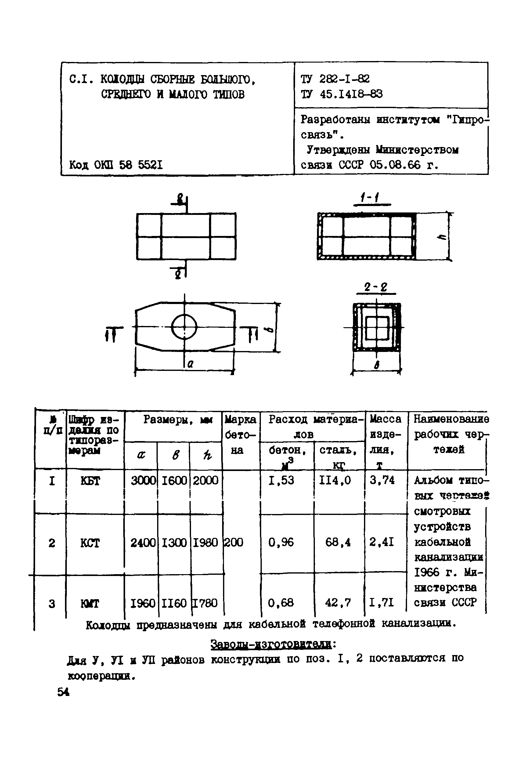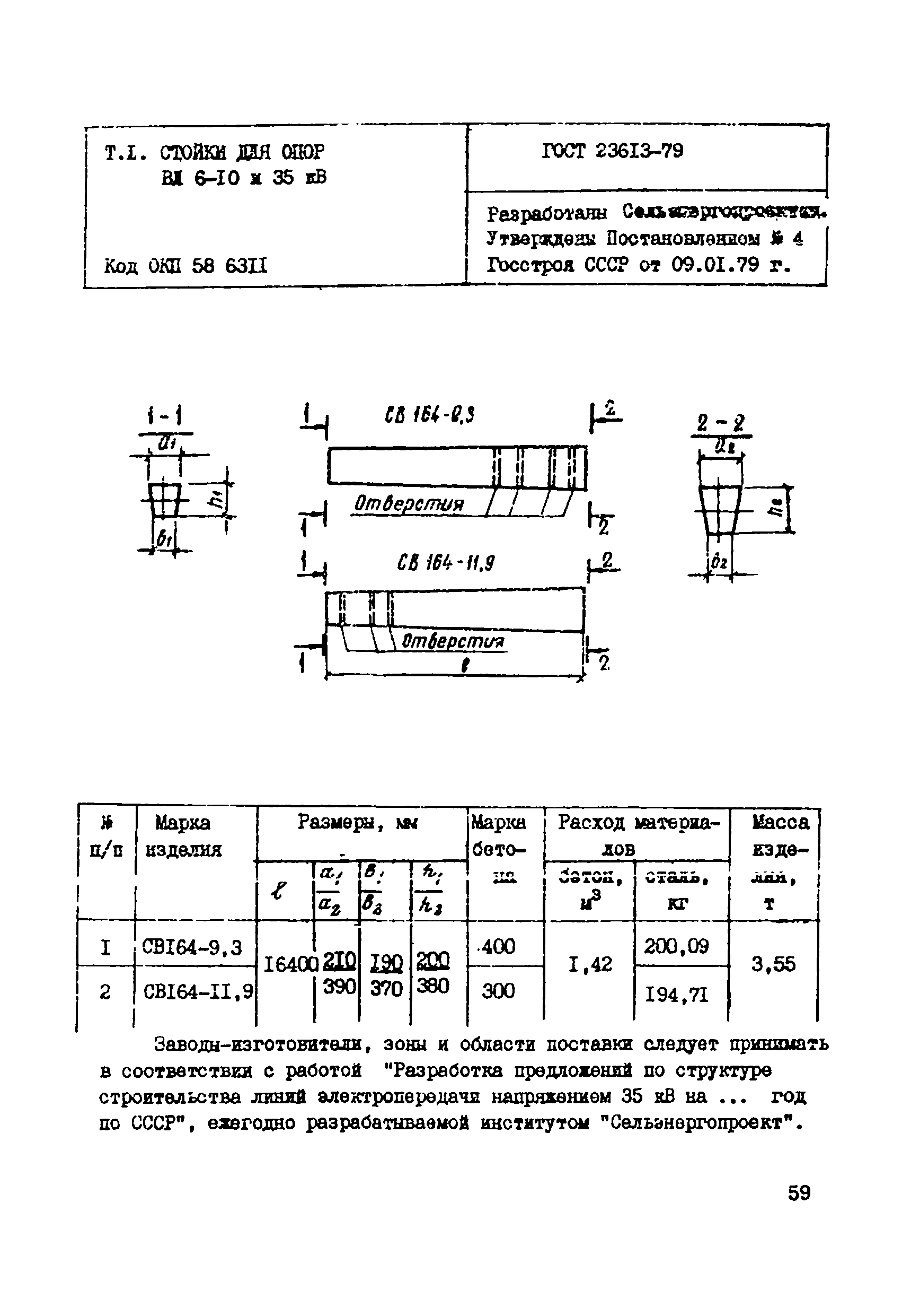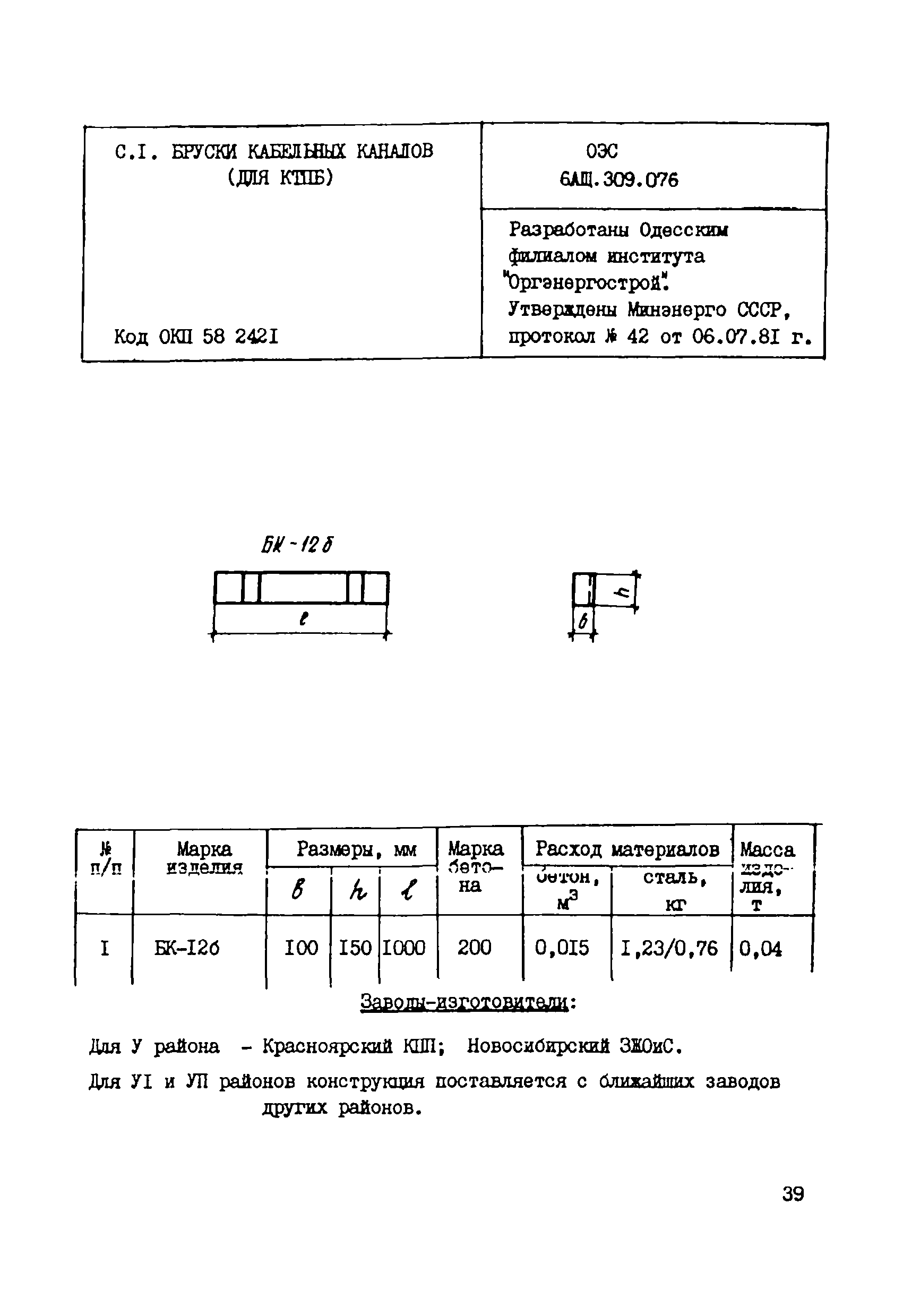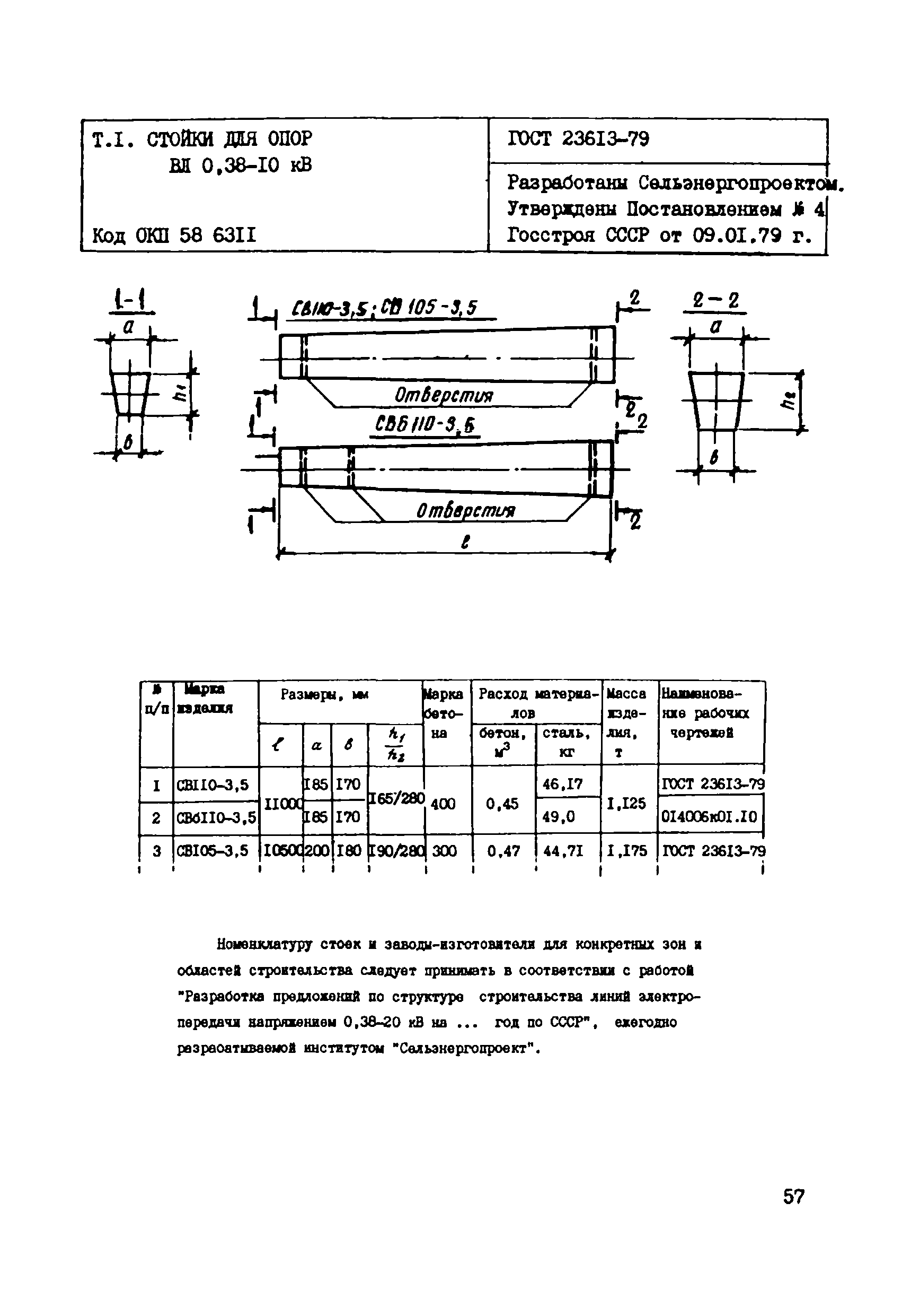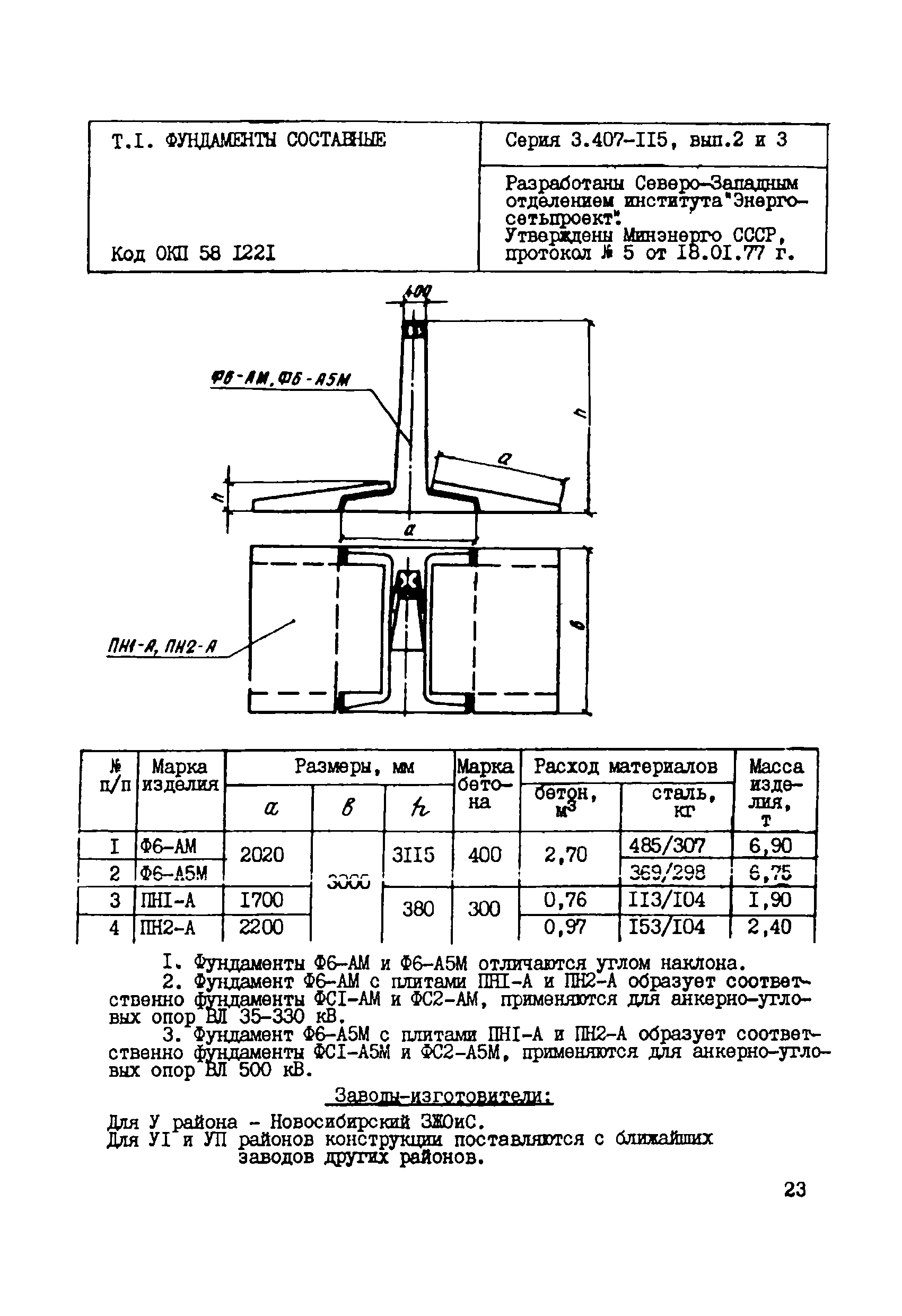| Оглавление: | I. Стойки опор ВЛ Стойки центрифугированные опор ВЛ 35-500 кВ Стойки центрифугированные опор ВЛ 35-750 кВ II. Фундаменты опор ВЛ Фундаменты промежуточных опор ВЛ 35-330 кВ Фундаменты анкерно-угловых опор ВЛ 35-330 кВ Плиты анкерные для крепления оттяжек Ригели фундаментные Балка пригрузочная Подпятники Плиты опорные и плита подкладная Сваи квадратного сечения 35х35 см Сваи-звенья ЦФ диаметром 560 мм Балки грузовые поверхностных фундаментов Фундаменты составные Фундаменты под промежуточные опоры на оттяжках ВЛ 500 кВ Фундаменты анкерно-угловых опор ВЛ 500 кВ Фундамент под анкерно-угловую опору ВЛ 1150 кВ Плиты анкерные для промежуточных опор на оттяжках ВЛ 1150 кВ Плита подкладная для фундаментов ВЛ 1150 кв Фундаменты под промежуточные опоры ВЛ 1500 кВ Плиты анкерные для промежуточных опор на оттяжках ВЛ 1500 кВ Фундамент под анкерно-угловые опоры ВЛ 1500 кВ III. Изделия для ОРУ подстанций Стойки центрифугированные порталов ОРУ Стойки вибрированные порталов ОРУ Стойки и фундамент под оборудование ОРУ Сваи под оборудование Элементы для кабельных лотков и плиты каналов Плиты и бруски для кабельных каналов Бруски кабельных каналов (для КТПБ) Плиты для КРУНов, ограждения маслосборников и огнезащитной стенки Плиты для укладки железнодорожных путей ОРУ и установки трансформаторов Плита для установки трансформаторов Брусья для перекатки трансформаторов Элементы конструкций КТПБ. Лежни Элементы ограды для подстанций IV. Изделия для быстромонтируемых зданий подстанций Секции быстромонтируемых зданий (БМЗ) Панели кровельные Панели стеновые Панели стеновые с проемами ворот Панели стеновые торца здания Панель карнизная Плита пола Колодцы сборные большого, среднего и малого типов Столбики замерные кабельные V. Изделия для строительства сельских линий и подстанций Стойки для опор ВЛ 0,38 кВ Стойки для опор ВЛ 0,38-10 кВ Стойки для опор ВЛ 6-10 и 35 кВ Приставки для деревянных опор ВЛ 0,38-10 кВ Плиты опорно-анкерные для ВЛ 0,38-10 кВ Анкер для опор ВЛ 10-35 кВ Фундамент под КТП 10/0,38 кВ Адреса заводов-изготовителей |