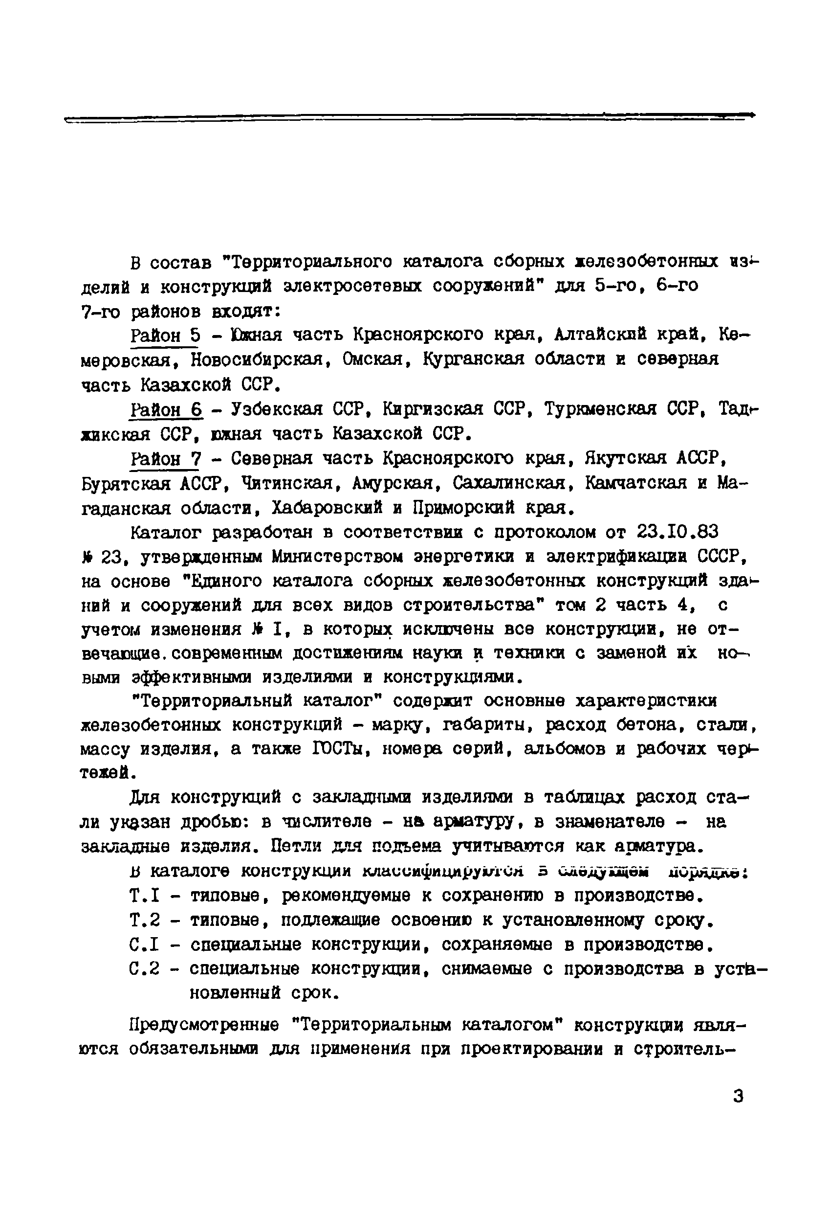 | Область применения: | Территориальный каталог содержит основные характеристики железобетонных конструкций: марку, габариты, расход бетона, стали, массу изделия, а также ГОСТы, номера серий, альбомов и рабочих чертежей. Предусмотренные "Территориальным каталогом" конструкции являются обязательными для применения при проектировании и строительстве линий электропередачи и подстанций, возводимых подрядными организациями Минэнерго СССР, в указанных районах. |