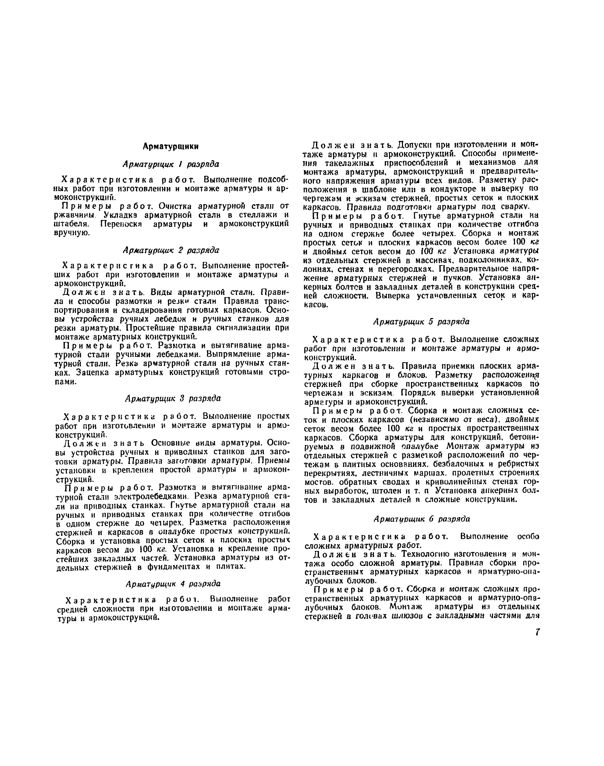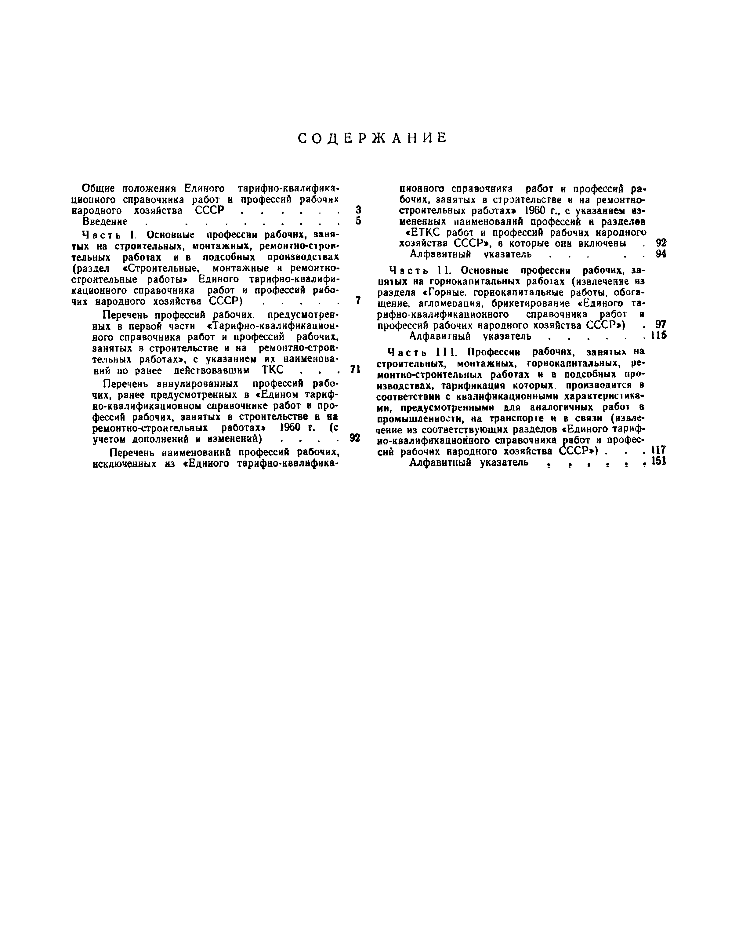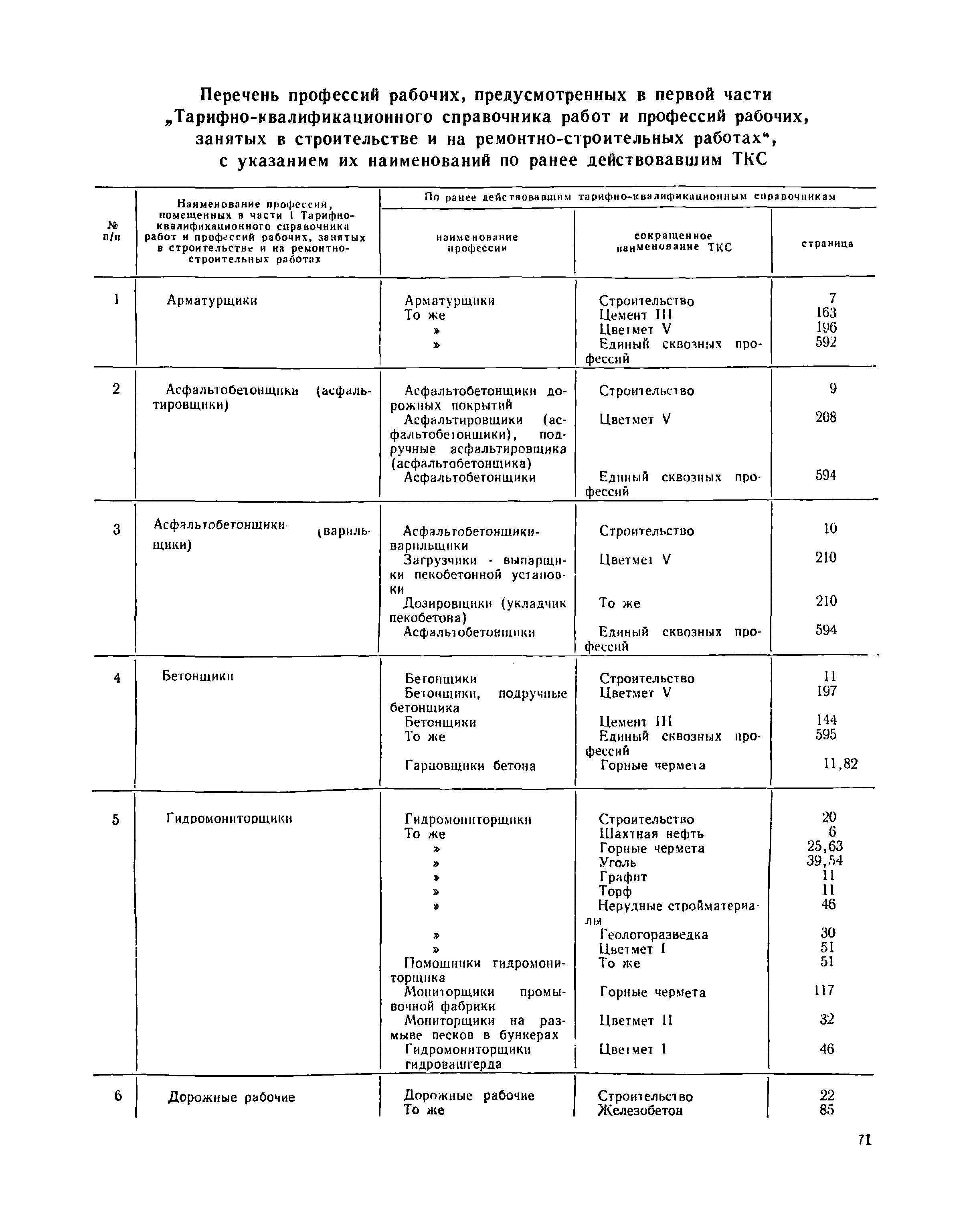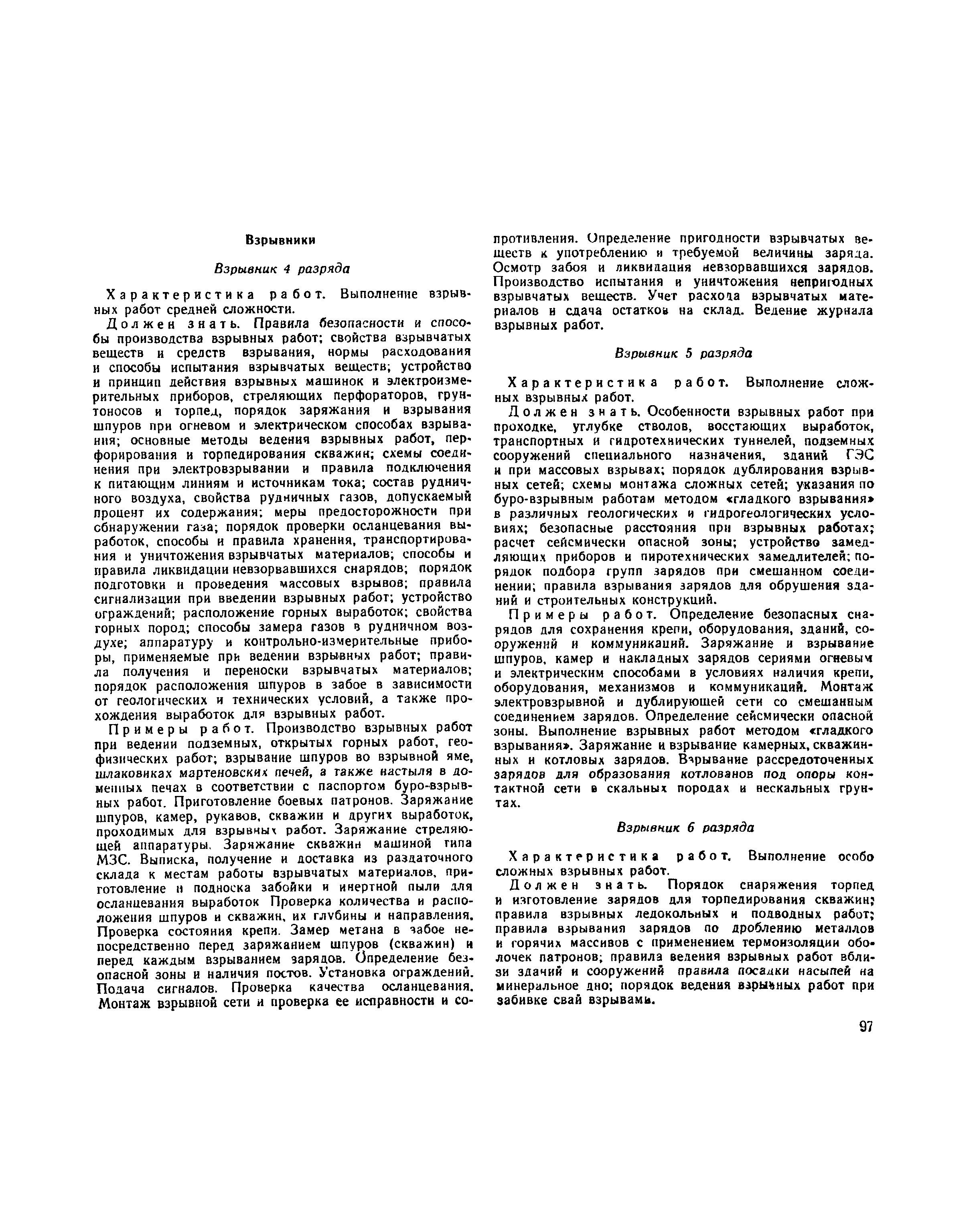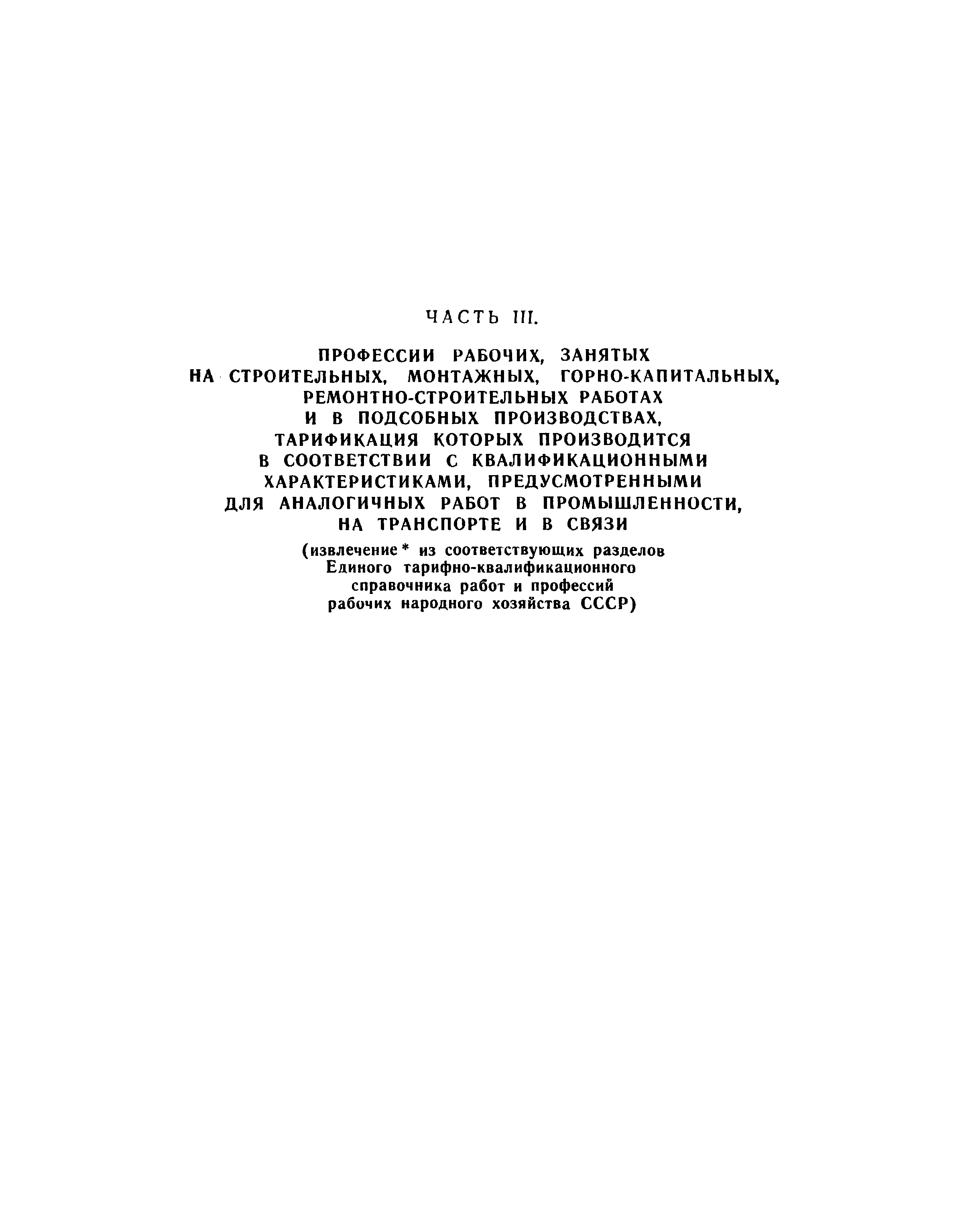 Тарифно-квалификационный справочник работ и профессий рабочих, занятых в строительстве и на ремонтно-строительных работах| Статус: | не действует | | Название рус.: | Тарифно-квалификационный справочник работ и профессий рабочих, занятых в строительстве и на ремонтно-строительных работах | | Дата добавления в базу: | 01.09.2013 | | Дата актуализации: | 01.01.2021 | | Область применения: | Единый тарифно-квалификационный справочник работ и профессий рабочих (ЕТКС) обязателен для применения на предприятиях и в организациях всех отраслей народного хозяйства СССР. Единый тарифно-квалификационный справочник содержит тарифно-квалификационные характеристики профессий рабочих (за исключением профессий рабочих, труд которых оплачивается исходя из месячных окладов), сгруппированные в разделы по производствам и видам работ, независимо от того, на предприятиях (в организациях) какого министерства (ведомства) эти производства или виды работ имеются. | | Оглавление: | Общие положения Единого тарифно-квалификационного справочника работ и профессий рабочих народного хозяйства СССР Введение Часть 1. Основные профессии рабочих, занятых на строительных, монтажных, ремонтно-строительных работах и в подсобных производствах (раздел «Строительные, монтажные и ремонтно-строительные работы») Единого тарифно-квалификационного справочника работ и профессий рабочих народного хозяйства СССР) Перечень профессий рабочих, предусмотренных в первой части «Тарифно-квалификационного справочника работ и профессий рабочих, занятых в строительстве и на ремонтно-строительных работах, с указанием их наименований по ранее действовавшим ТКС Перечень аннулированных профессий рабочих, ранее предусмотренных в «Едином тарифно-квалификационном справочнике работ и профессий рабочих, занятых в строительстве и на ремонтно-строительных работах» 1960 г. (с учетом дополнений и изменений) Перечень наименований профессий рабочих, исключенных из «Единого тарифно-квалификационного справочника работ и профессий рабочих, занятых в строительстве и на ремонтно-строительных работах» 1960 г., с указанием измененных наименований профессий и разделов «ЕТКС работ и профессий рабочих народного хозяйства СССР», в которые они включены Алфавитный указатель Часть II. Основные профессии рабочих, занятых на горнокапитальных работах (извлечение из раздела «Горные, горнокапитальные работы, обогащение, агломерация, брикетирование «Единого тарифно-квалификационного справочника работ и профессий рабочих народного хозяйства СССР») Алфавитный указатель Часть III. Профессии рабочих, занятых на строительных, монтажных, горнокапитальных, ремонтно-строительных работах и в подсобных производствах, тарификация которых, производится в соответствии с квалификационными характеристиками, предусмотренными для аналогичных работ промышленности, на транспорте и в связи (извлечение из соответствующих разделов «Единого тарифно-квалификационного справочника работ и профессий рабочих народного хозяйства СССР») Алфавитный указатель | | Утверждён: | 19.09.1968 Государственный комитет Совета Министров СССР по вопросам труда и заработной платы (300/27)
