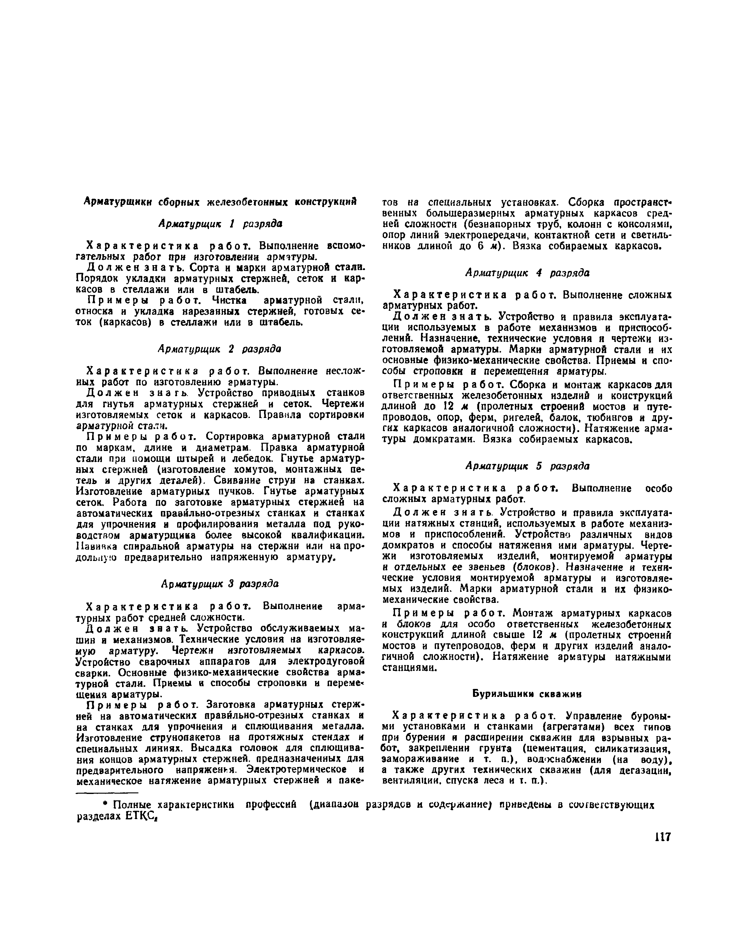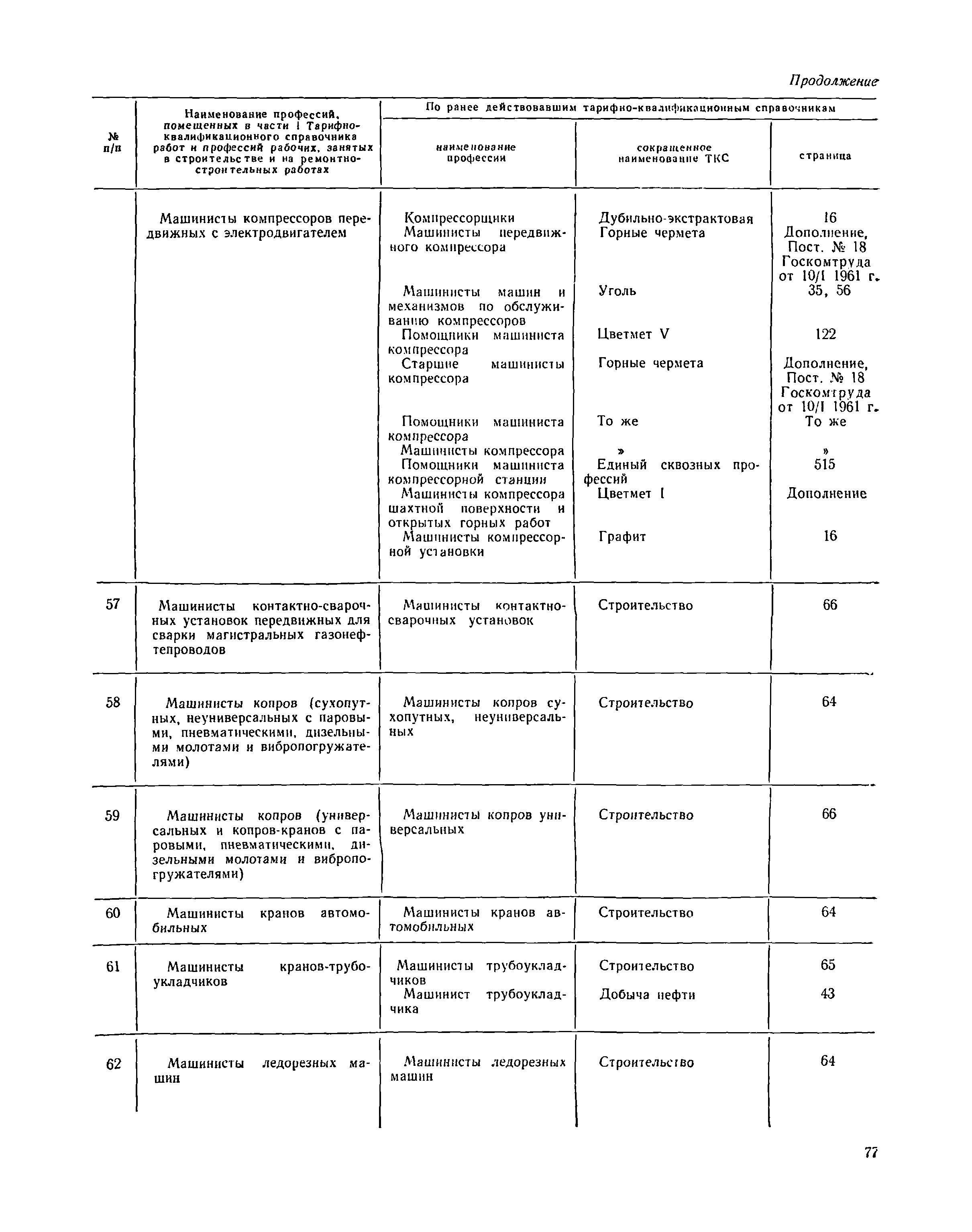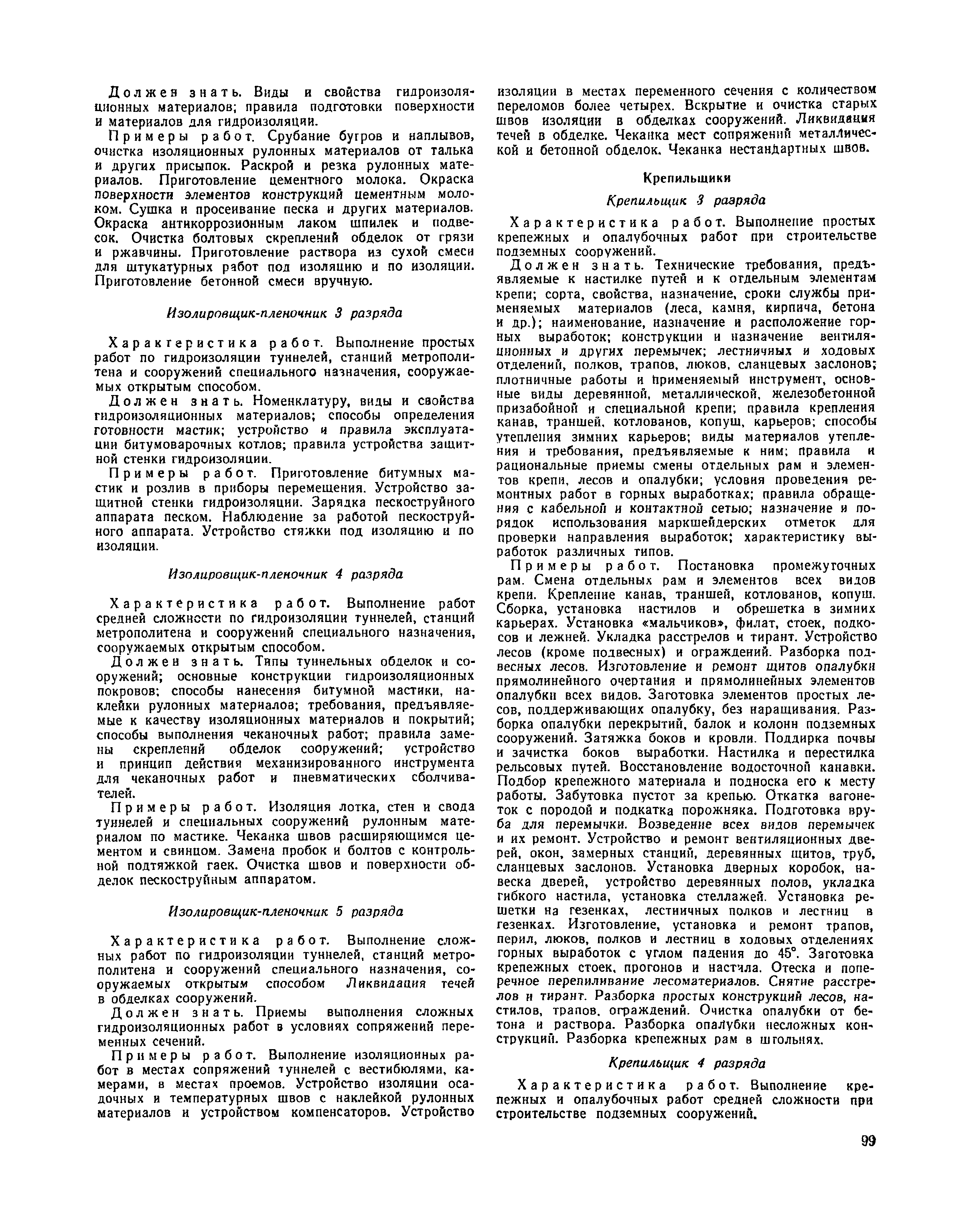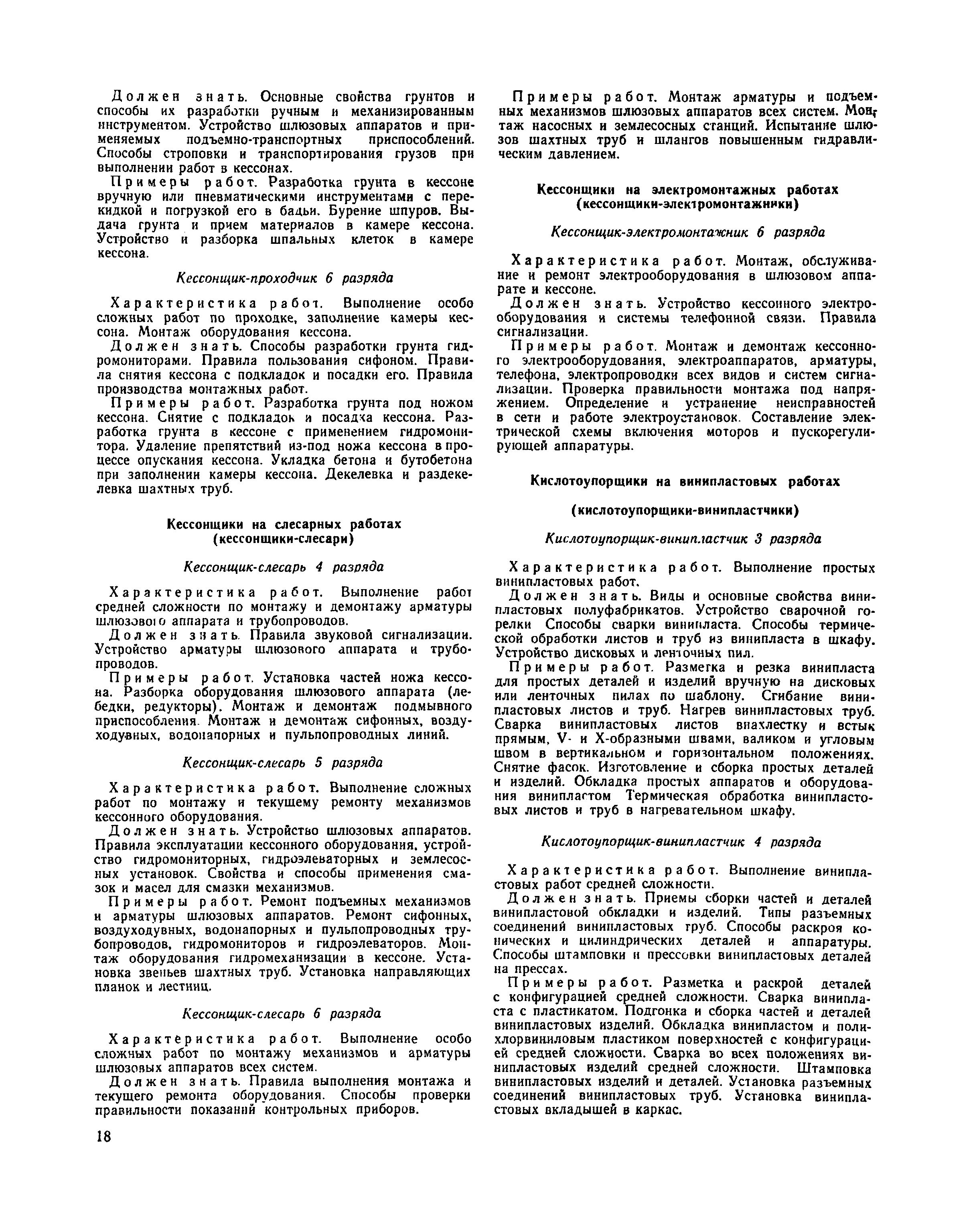 Тарифно-квалификационный справочник работ и профессий рабочих, занятых в строительстве и на ремонтно-строительных работах| Статус: | не действует | | Название рус.: | Тарифно-квалификационный справочник работ и профессий рабочих, занятых в строительстве и на ремонтно-строительных работах | | Дата добавления в базу: | 01.09.2013 | | Дата актуализации: | 01.01.2021 | | Область применения: | Единый тарифно-квалификационный справочник работ и профессий рабочих (ЕТКС) обязателен для применения на предприятиях и в организациях всех отраслей народного хозяйства СССР. Единый тарифно-квалификационный справочник содержит тарифно-квалификационные характеристики профессий рабочих (за исключением профессий рабочих, труд которых оплачивается исходя из месячных окладов), сгруппированные в разделы по производствам и видам работ, независимо от того, на предприятиях (в организациях) какого министерства (ведомства) эти производства или виды работ имеются. | | Оглавление: | Общие положения Единого тарифно-квалификационного справочника работ и профессий рабочих народного хозяйства СССР Введение Часть 1. Основные профессии рабочих, занятых на строительных, монтажных, ремонтно-строительных работах и в подсобных производствах (раздел «Строительные, монтажные и ремонтно-строительные работы») Единого тарифно-квалификационного справочника работ и профессий рабочих народного хозяйства СССР) Перечень профессий рабочих, предусмотренных в первой части «Тарифно-квалификационного справочника работ и профессий рабочих, занятых в строительстве и на ремонтно-строительных работах, с указанием их наименований по ранее действовавшим ТКС Перечень аннулированных профессий рабочих, ранее предусмотренных в «Едином тарифно-квалификационном справочнике работ и профессий рабочих, занятых в строительстве и на ремонтно-строительных работах» 1960 г. (с учетом дополнений и изменений) Перечень наименований профессий рабочих, исключенных из «Единого тарифно-квалификационного справочника работ и профессий рабочих, занятых в строительстве и на ремонтно-строительных работах» 1960 г., с указанием измененных наименований профессий и разделов «ЕТКС работ и профессий рабочих народного хозяйства СССР», в которые они включены Алфавитный указатель Часть II. Основные профессии рабочих, занятых на горнокапитальных работах (извлечение из раздела «Горные, горнокапитальные работы, обогащение, агломерация, брикетирование «Единого тарифно-квалификационного справочника работ и профессий рабочих народного хозяйства СССР») Алфавитный указатель Часть III. Профессии рабочих, занятых на строительных, монтажных, горнокапитальных, ремонтно-строительных работах и в подсобных производствах, тарификация которых, производится в соответствии с квалификационными характеристиками, предусмотренными для аналогичных работ промышленности, на транспорте и в связи (извлечение из соответствующих разделов «Единого тарифно-квалификационного справочника работ и профессий рабочих народного хозяйства СССР») Алфавитный указатель | | Утверждён: | 19.09.1968 Государственный комитет Совета Министров СССР по вопросам труда и заработной платы (300/27)