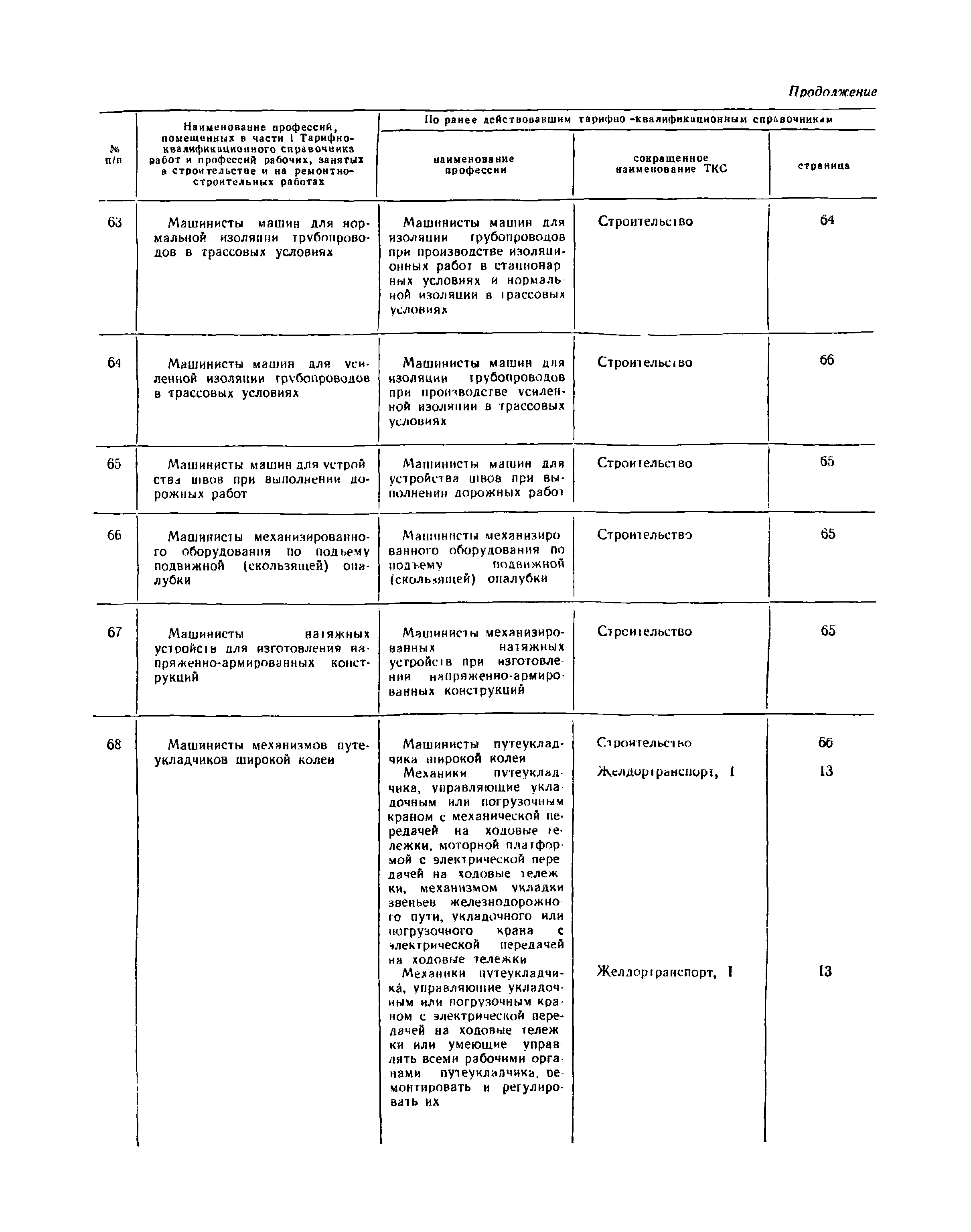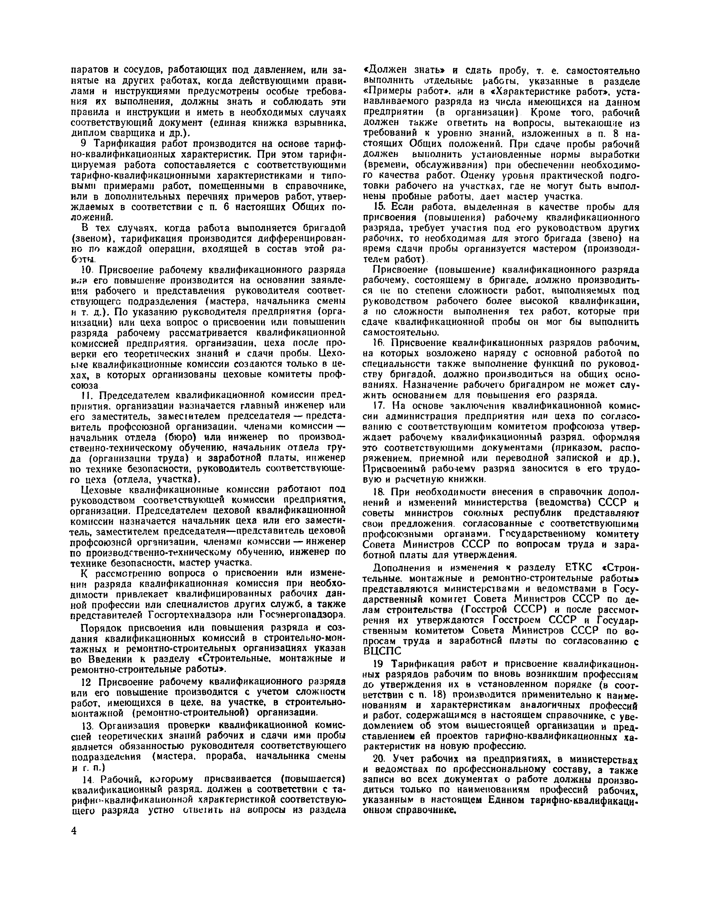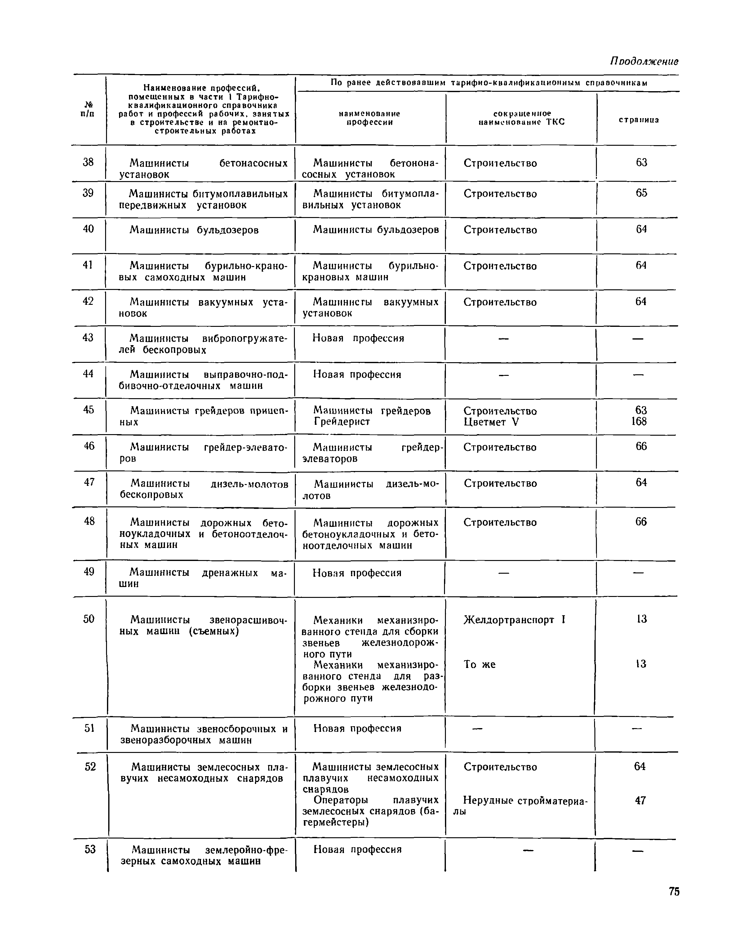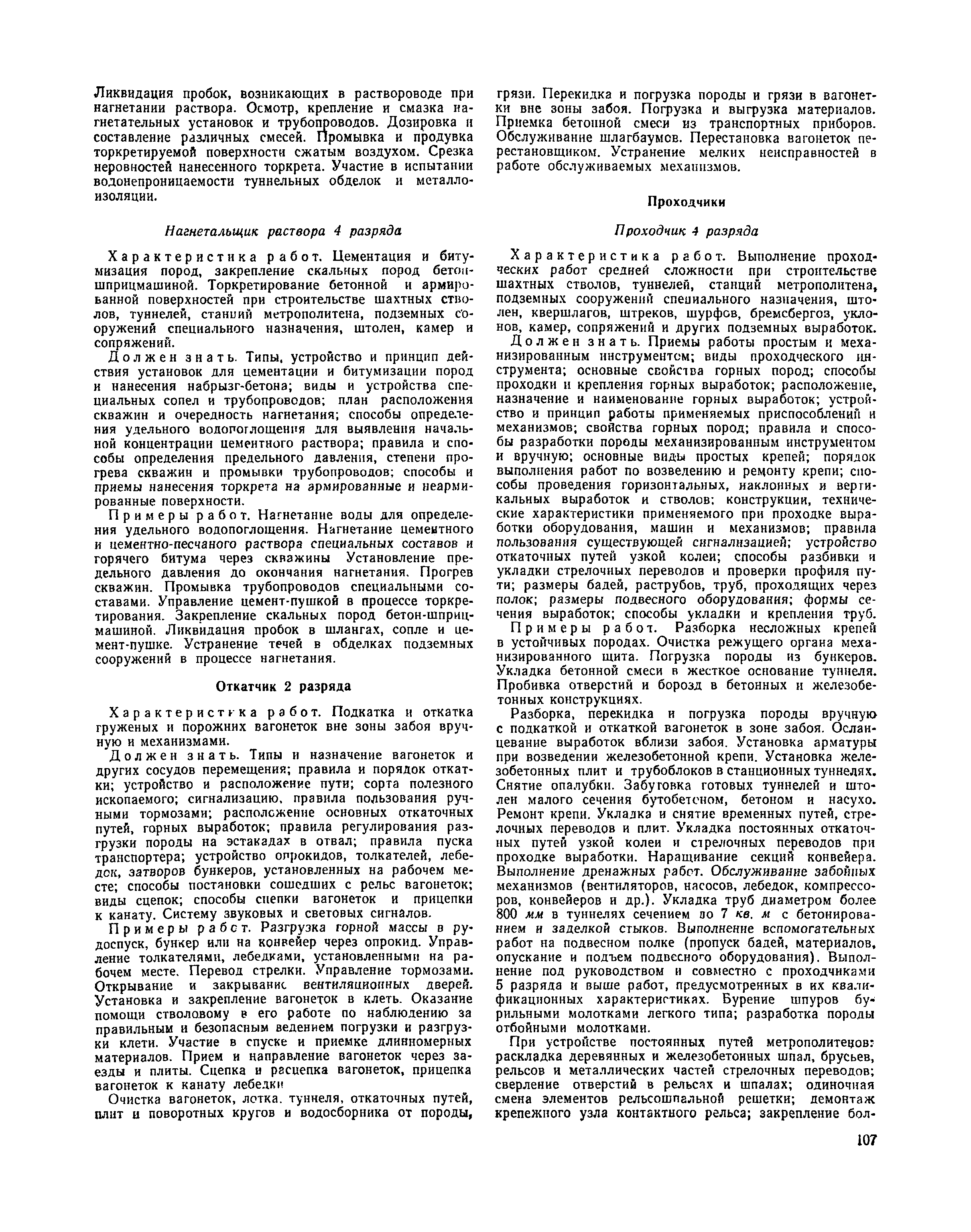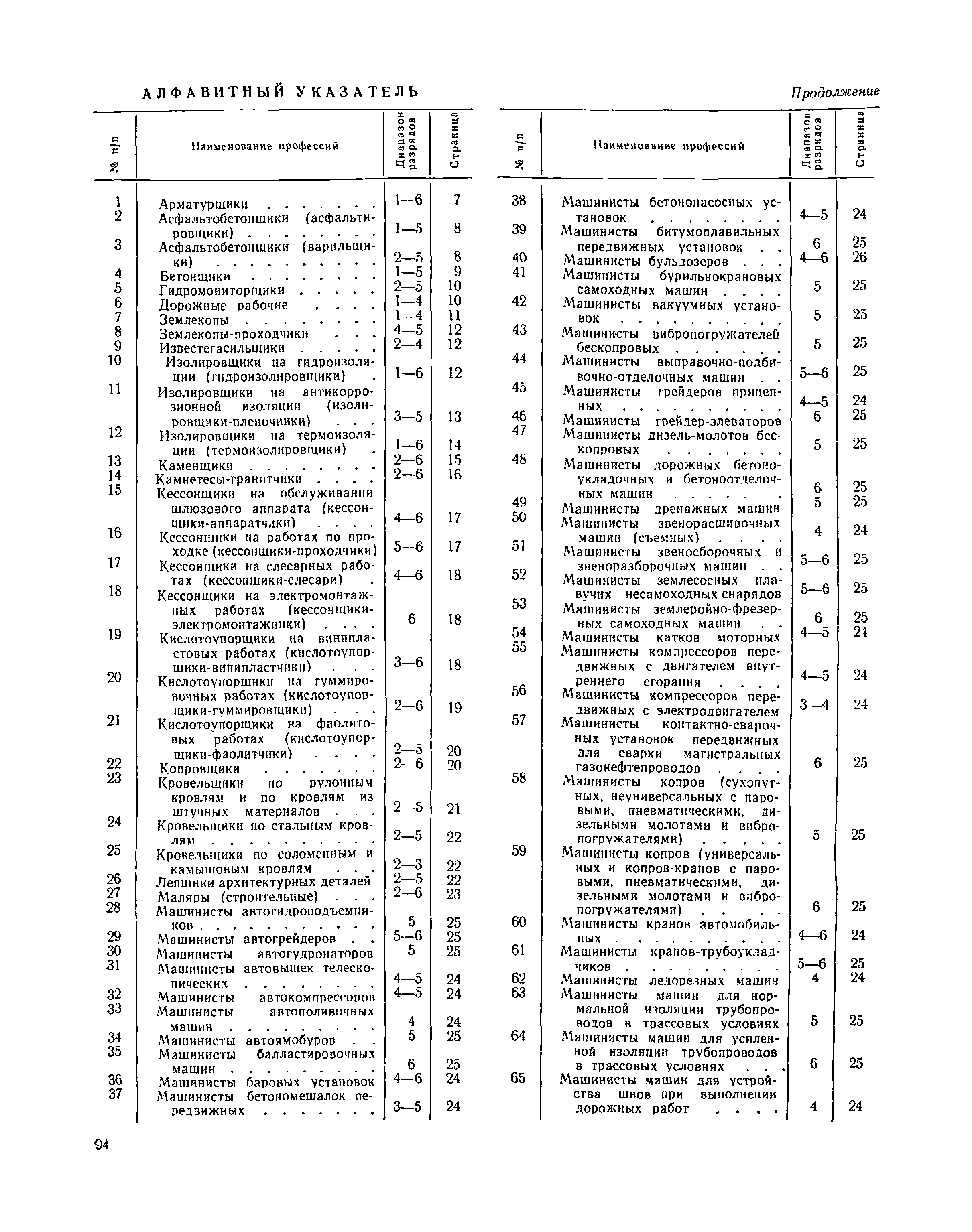 Тарифно-квалификационный справочник работ и профессий рабочих, занятых в строительстве и на ремонтно-строительных работах| Статус: | не действует | | Название рус.: | Тарифно-квалификационный справочник работ и профессий рабочих, занятых в строительстве и на ремонтно-строительных работах | | Дата добавления в базу: | 01.09.2013 | | Дата актуализации: | 01.01.2021 | | Область применения: | Единый тарифно-квалификационный справочник работ и профессий рабочих (ЕТКС) обязателен для применения на предприятиях и в организациях всех отраслей народного хозяйства СССР. Единый тарифно-квалификационный справочник содержит тарифно-квалификационные характеристики профессий рабочих (за исключением профессий рабочих, труд которых оплачивается исходя из месячных окладов), сгруппированные в разделы по производствам и видам работ, независимо от того, на предприятиях (в организациях) какого министерства (ведомства) эти производства или виды работ имеются. | | Оглавление: | Общие положения Единого тарифно-квалификационного справочника работ и профессий рабочих народного хозяйства СССР Введение Часть 1. Основные профессии рабочих, занятых на строительных, монтажных, ремонтно-строительных работах и в подсобных производствах (раздел «Строительные, монтажные и ремонтно-строительные работы») Единого тарифно-квалификационного справочника работ и профессий рабочих народного хозяйства СССР) Перечень профессий рабочих, предусмотренных в первой части «Тарифно-квалификационного справочника работ и профессий рабочих, занятых в строительстве и на ремонтно-строительных работах, с указанием их наименований по ранее действовавшим ТКС Перечень аннулированных профессий рабочих, ранее предусмотренных в «Едином тарифно-квалификационном справочнике работ и профессий рабочих, занятых в строительстве и на ремонтно-строительных работах» 1960 г. (с учетом дополнений и изменений) Перечень наименований профессий рабочих, исключенных из «Единого тарифно-квалификационного справочника работ и профессий рабочих, занятых в строительстве и на ремонтно-строительных работах» 1960 г., с указанием измененных наименований профессий и разделов «ЕТКС работ и профессий рабочих народного хозяйства СССР», в которые они включены Алфавитный указатель Часть II. Основные профессии рабочих, занятых на горнокапитальных работах (извлечение из раздела «Горные, горнокапитальные работы, обогащение, агломерация, брикетирование «Единого тарифно-квалификационного справочника работ и профессий рабочих народного хозяйства СССР») Алфавитный указатель Часть III. Профессии рабочих, занятых на строительных, монтажных, горнокапитальных, ремонтно-строительных работах и в подсобных производствах, тарификация которых, производится в соответствии с квалификационными характеристиками, предусмотренными для аналогичных работ промышленности, на транспорте и в связи (извлечение из соответствующих разделов «Единого тарифно-квалификационного справочника работ и профессий рабочих народного хозяйства СССР») Алфавитный указатель | | Утверждён: | 19.09.1968 Государственный комитет Совета Министров СССР по вопросам труда и заработной платы (300/27)