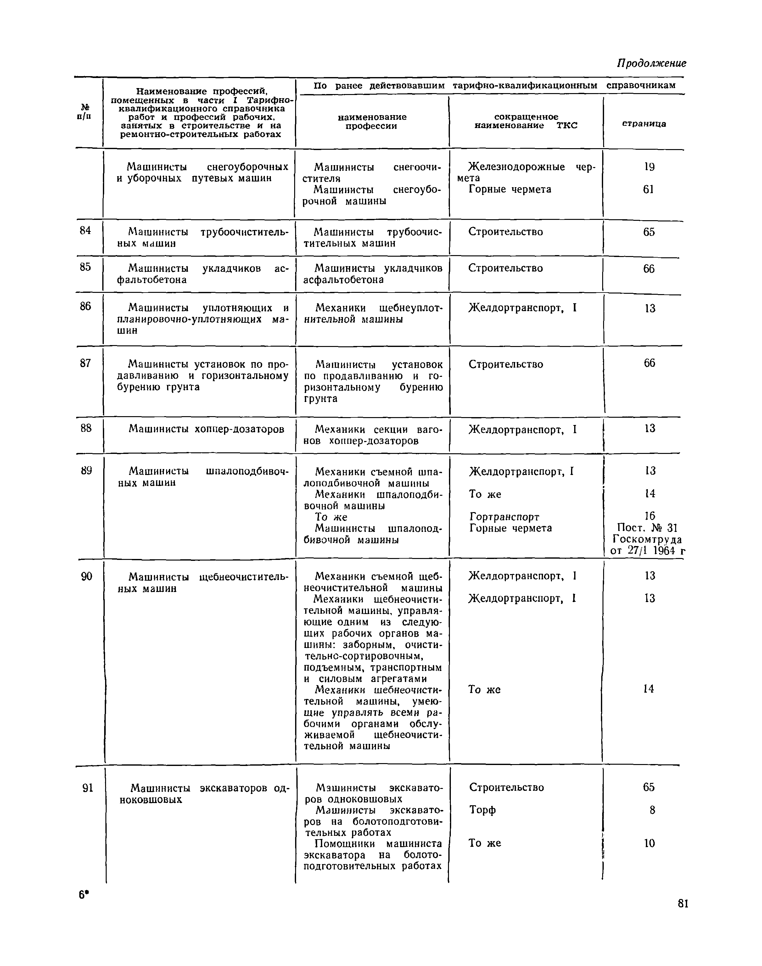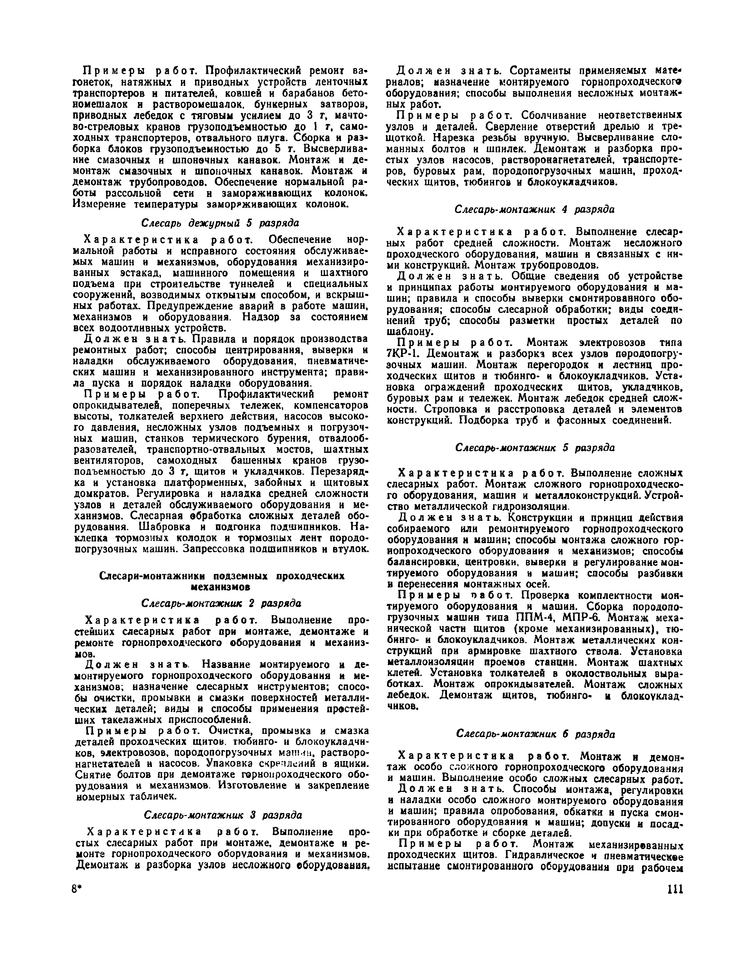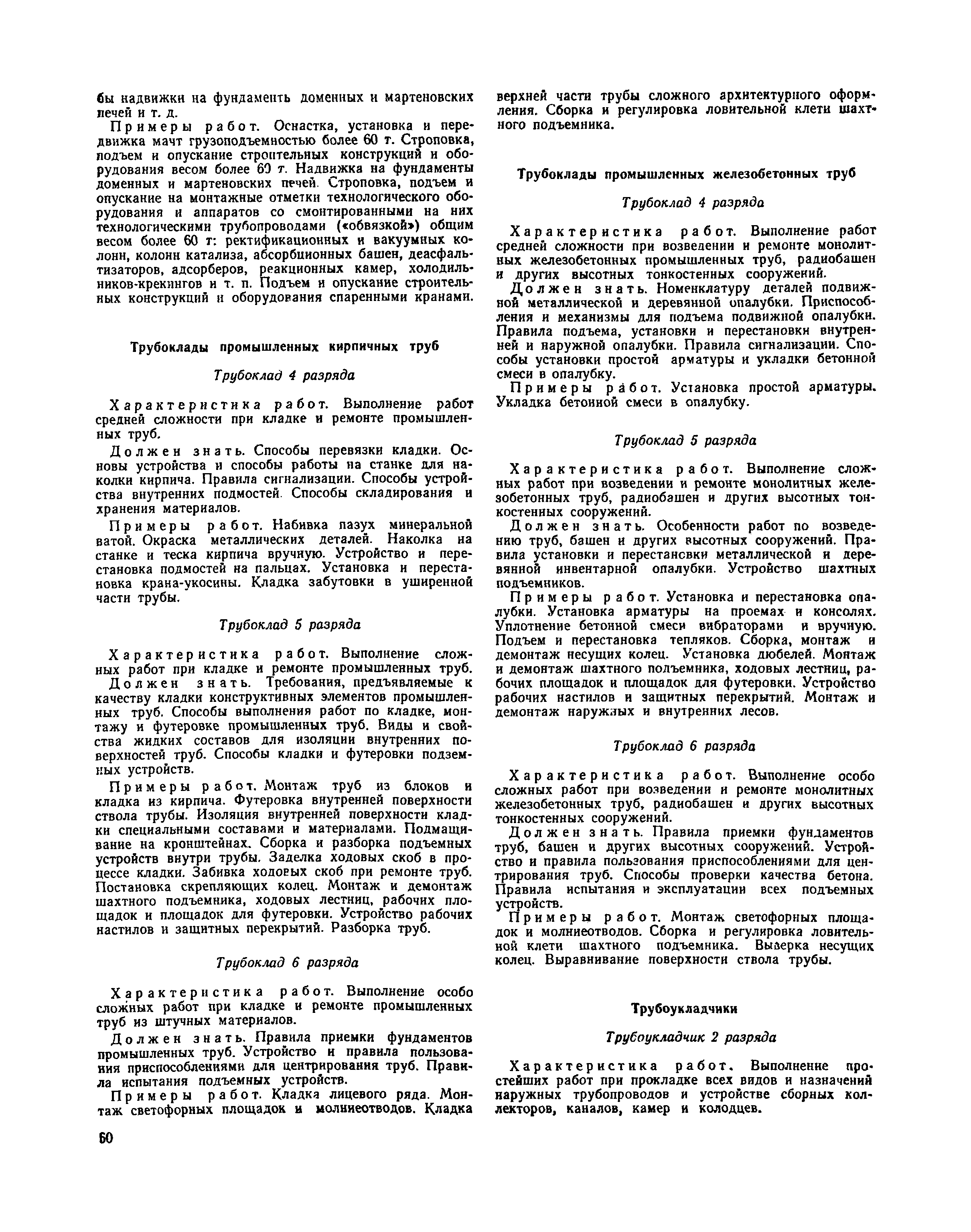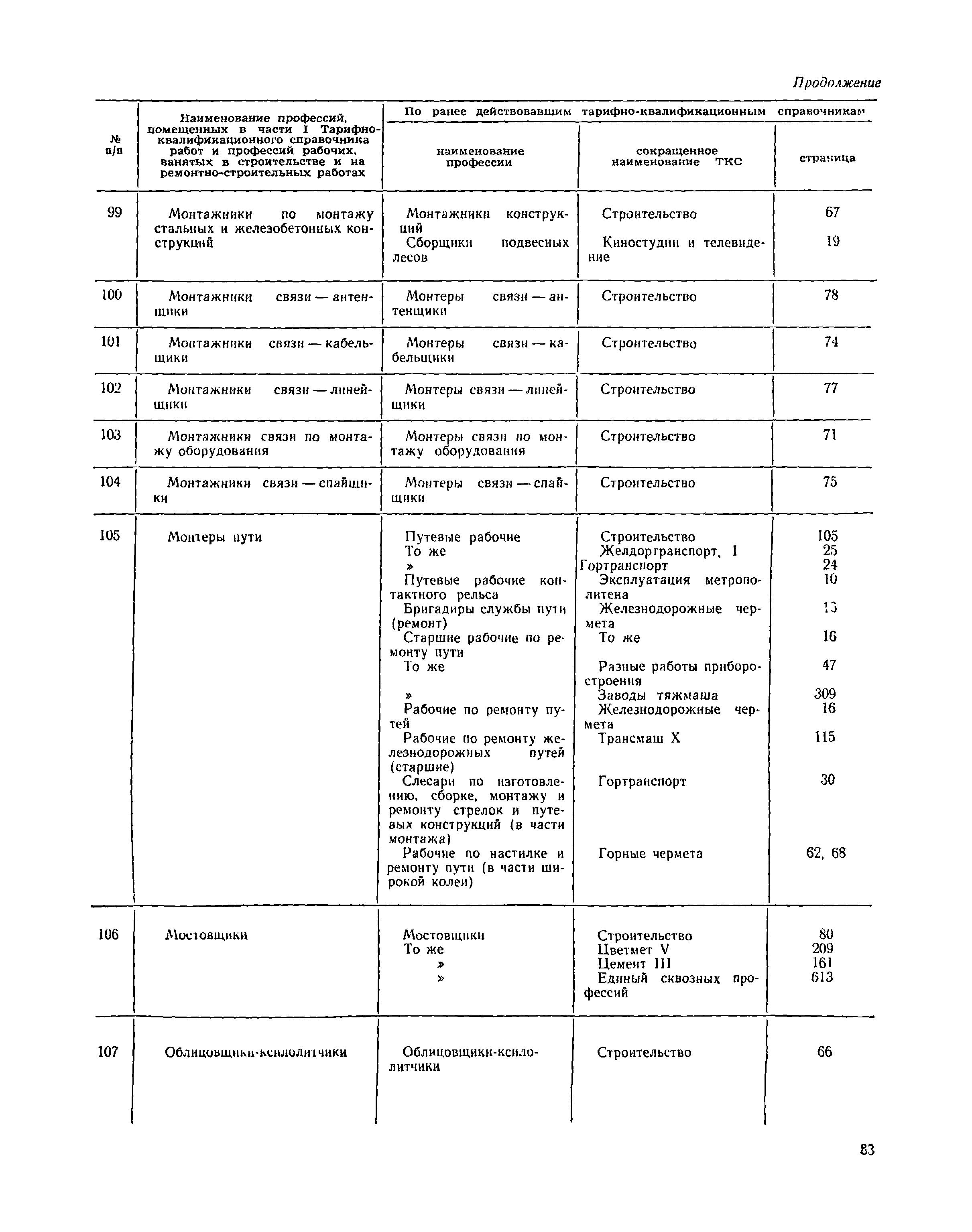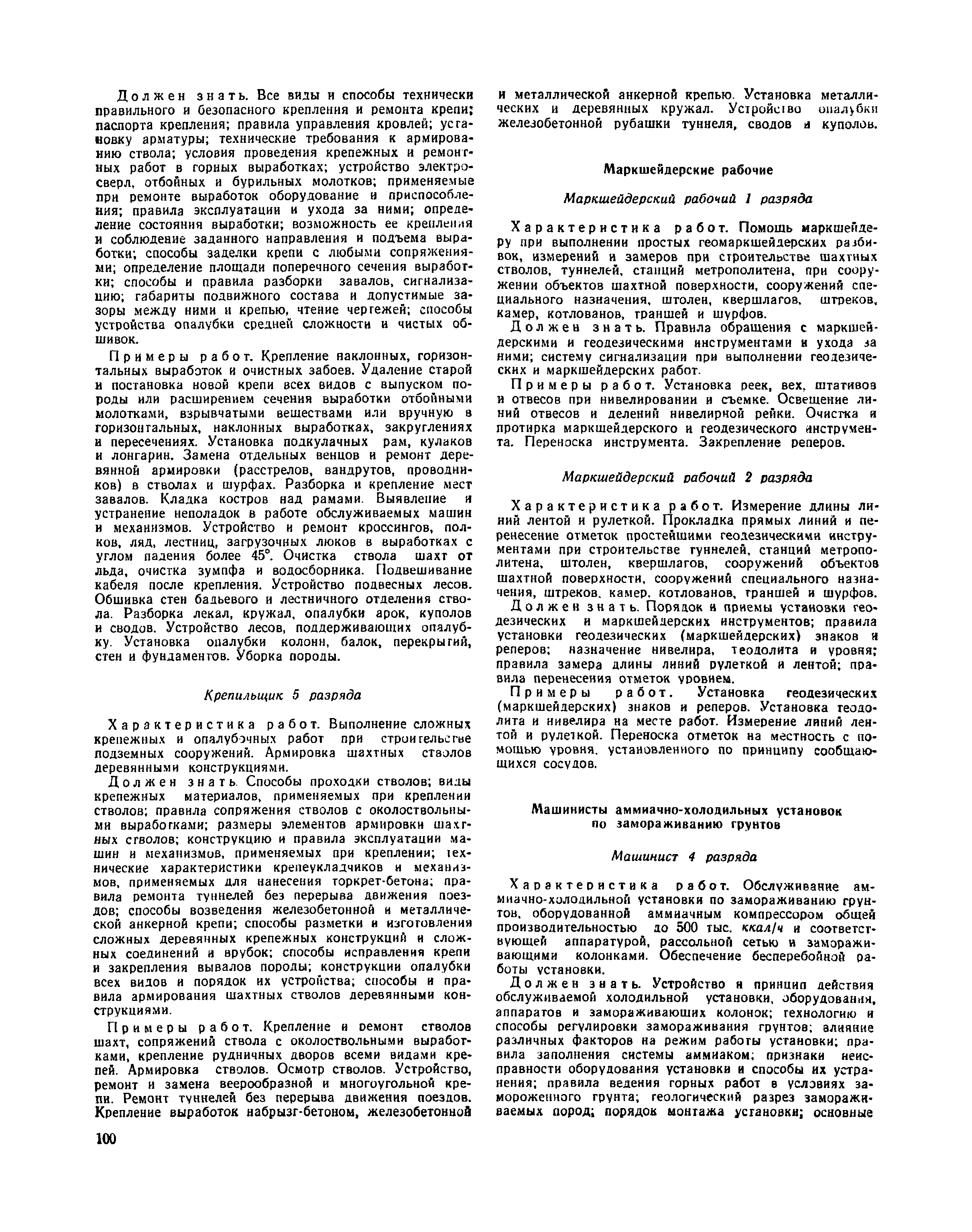 Тарифно-квалификационный справочник работ и профессий рабочих, занятых в строительстве и на ремонтно-строительных работах| Статус: | не действует | | Название рус.: | Тарифно-квалификационный справочник работ и профессий рабочих, занятых в строительстве и на ремонтно-строительных работах | | Дата добавления в базу: | 01.09.2013 | | Дата актуализации: | 01.01.2021 | | Область применения: | Единый тарифно-квалификационный справочник работ и профессий рабочих (ЕТКС) обязателен для применения на предприятиях и в организациях всех отраслей народного хозяйства СССР. Единый тарифно-квалификационный справочник содержит тарифно-квалификационные характеристики профессий рабочих (за исключением профессий рабочих, труд которых оплачивается исходя из месячных окладов), сгруппированные в разделы по производствам и видам работ, независимо от того, на предприятиях (в организациях) какого министерства (ведомства) эти производства или виды работ имеются. | | Оглавление: | Общие положения Единого тарифно-квалификационного справочника работ и профессий рабочих народного хозяйства СССР Введение Часть 1. Основные профессии рабочих, занятых на строительных, монтажных, ремонтно-строительных работах и в подсобных производствах (раздел «Строительные, монтажные и ремонтно-строительные работы») Единого тарифно-квалификационного справочника работ и профессий рабочих народного хозяйства СССР) Перечень профессий рабочих, предусмотренных в первой части «Тарифно-квалификационного справочника работ и профессий рабочих, занятых в строительстве и на ремонтно-строительных работах, с указанием их наименований по ранее действовавшим ТКС Перечень аннулированных профессий рабочих, ранее предусмотренных в «Едином тарифно-квалификационном справочнике работ и профессий рабочих, занятых в строительстве и на ремонтно-строительных работах» 1960 г. (с учетом дополнений и изменений) Перечень наименований профессий рабочих, исключенных из «Единого тарифно-квалификационного справочника работ и профессий рабочих, занятых в строительстве и на ремонтно-строительных работах» 1960 г., с указанием измененных наименований профессий и разделов «ЕТКС работ и профессий рабочих народного хозяйства СССР», в которые они включены Алфавитный указатель Часть II. Основные профессии рабочих, занятых на горнокапитальных работах (извлечение из раздела «Горные, горнокапитальные работы, обогащение, агломерация, брикетирование «Единого тарифно-квалификационного справочника работ и профессий рабочих народного хозяйства СССР») Алфавитный указатель Часть III. Профессии рабочих, занятых на строительных, монтажных, горнокапитальных, ремонтно-строительных работах и в подсобных производствах, тарификация которых, производится в соответствии с квалификационными характеристиками, предусмотренными для аналогичных работ промышленности, на транспорте и в связи (извлечение из соответствующих разделов «Единого тарифно-квалификационного справочника работ и профессий рабочих народного хозяйства СССР») Алфавитный указатель | | Утверждён: | 19.09.1968 Государственный комитет Совета Министров СССР по вопросам труда и заработной платы (300/27)