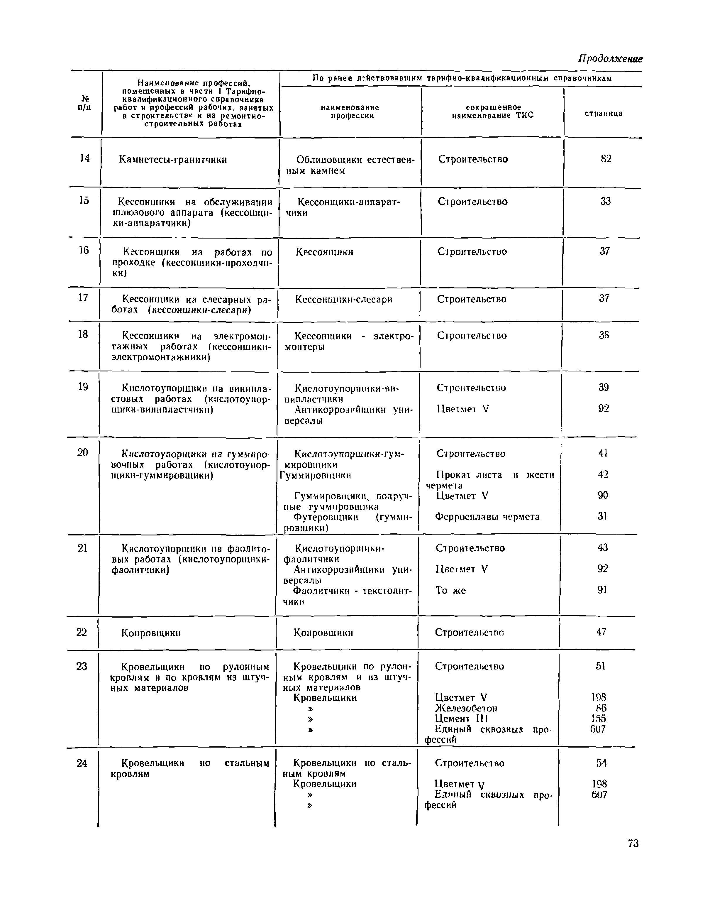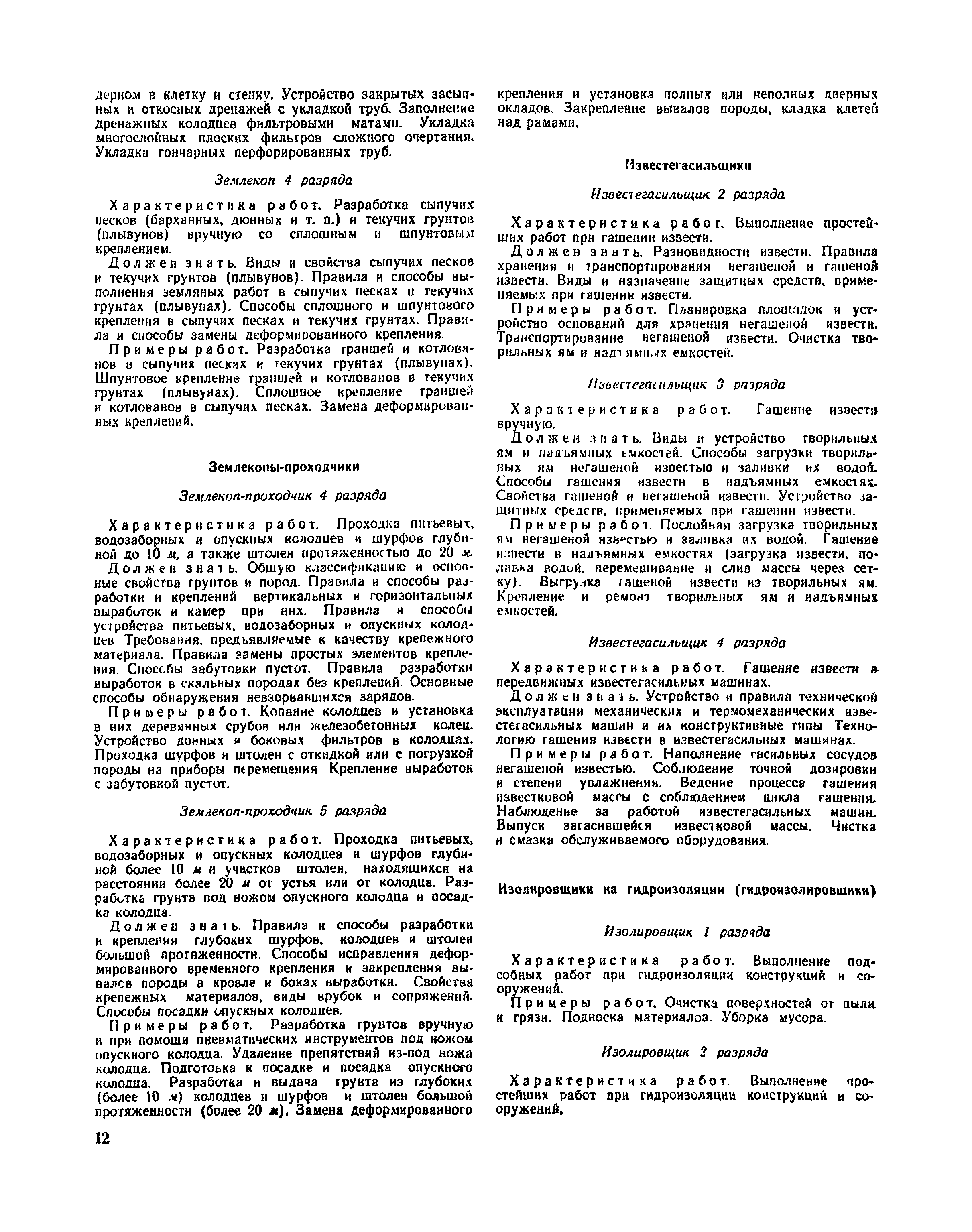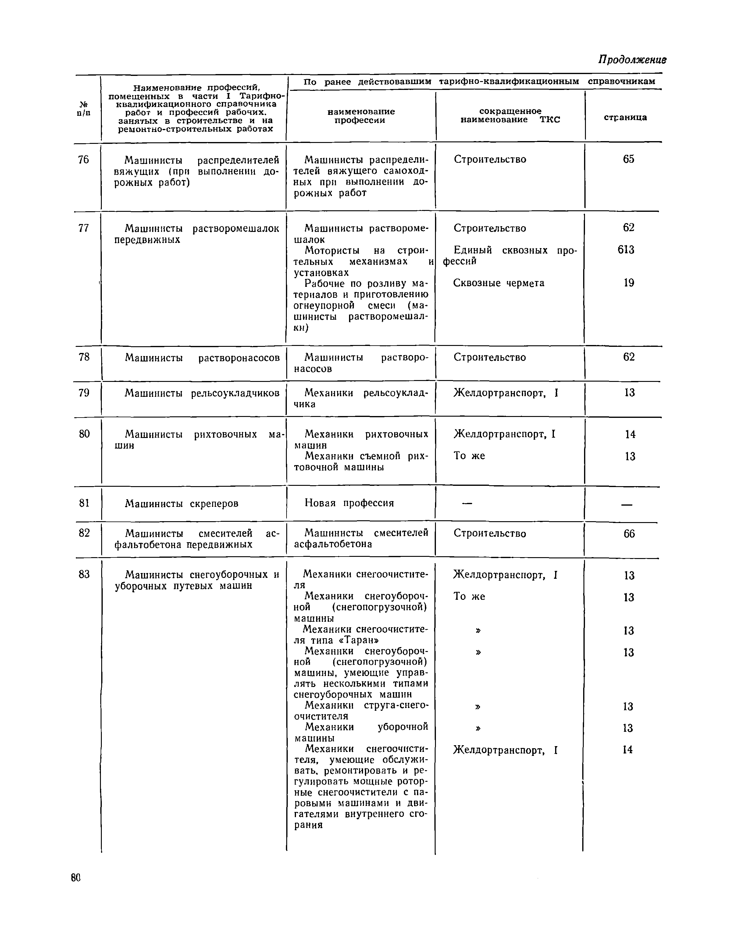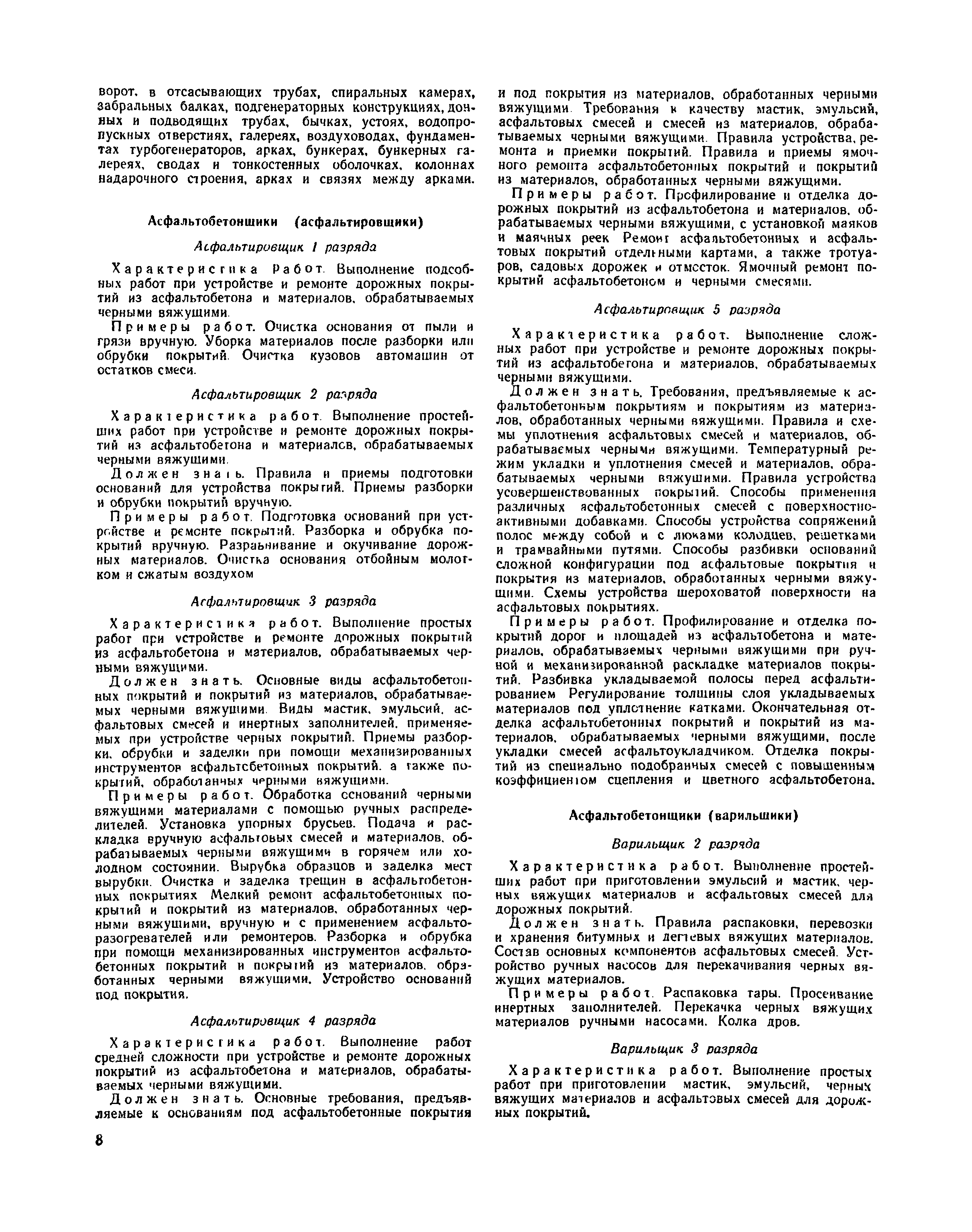 Тарифно-квалификационный справочник работ и профессий рабочих, занятых в строительстве и на ремонтно-строительных работах| Статус: | не действует | | Название рус.: | Тарифно-квалификационный справочник работ и профессий рабочих, занятых в строительстве и на ремонтно-строительных работах | | Дата добавления в базу: | 01.09.2013 | | Дата актуализации: | 01.01.2021 | | Область применения: | Единый тарифно-квалификационный справочник работ и профессий рабочих (ЕТКС) обязателен для применения на предприятиях и в организациях всех отраслей народного хозяйства СССР. Единый тарифно-квалификационный справочник содержит тарифно-квалификационные характеристики профессий рабочих (за исключением профессий рабочих, труд которых оплачивается исходя из месячных окладов), сгруппированные в разделы по производствам и видам работ, независимо от того, на предприятиях (в организациях) какого министерства (ведомства) эти производства или виды работ имеются. | | Оглавление: | Общие положения Единого тарифно-квалификационного справочника работ и профессий рабочих народного хозяйства СССР Введение Часть 1. Основные профессии рабочих, занятых на строительных, монтажных, ремонтно-строительных работах и в подсобных производствах (раздел «Строительные, монтажные и ремонтно-строительные работы») Единого тарифно-квалификационного справочника работ и профессий рабочих народного хозяйства СССР) Перечень профессий рабочих, предусмотренных в первой части «Тарифно-квалификационного справочника работ и профессий рабочих, занятых в строительстве и на ремонтно-строительных работах, с указанием их наименований по ранее действовавшим ТКС Перечень аннулированных профессий рабочих, ранее предусмотренных в «Едином тарифно-квалификационном справочнике работ и профессий рабочих, занятых в строительстве и на ремонтно-строительных работах» 1960 г. (с учетом дополнений и изменений) Перечень наименований профессий рабочих, исключенных из «Единого тарифно-квалификационного справочника работ и профессий рабочих, занятых в строительстве и на ремонтно-строительных работах» 1960 г., с указанием измененных наименований профессий и разделов «ЕТКС работ и профессий рабочих народного хозяйства СССР», в которые они включены Алфавитный указатель Часть II. Основные профессии рабочих, занятых на горнокапитальных работах (извлечение из раздела «Горные, горнокапитальные работы, обогащение, агломерация, брикетирование «Единого тарифно-квалификационного справочника работ и профессий рабочих народного хозяйства СССР») Алфавитный указатель Часть III. Профессии рабочих, занятых на строительных, монтажных, горнокапитальных, ремонтно-строительных работах и в подсобных производствах, тарификация которых, производится в соответствии с квалификационными характеристиками, предусмотренными для аналогичных работ промышленности, на транспорте и в связи (извлечение из соответствующих разделов «Единого тарифно-квалификационного справочника работ и профессий рабочих народного хозяйства СССР») Алфавитный указатель | | Утверждён: | 19.09.1968 Государственный комитет Совета Министров СССР по вопросам труда и заработной платы (300/27)