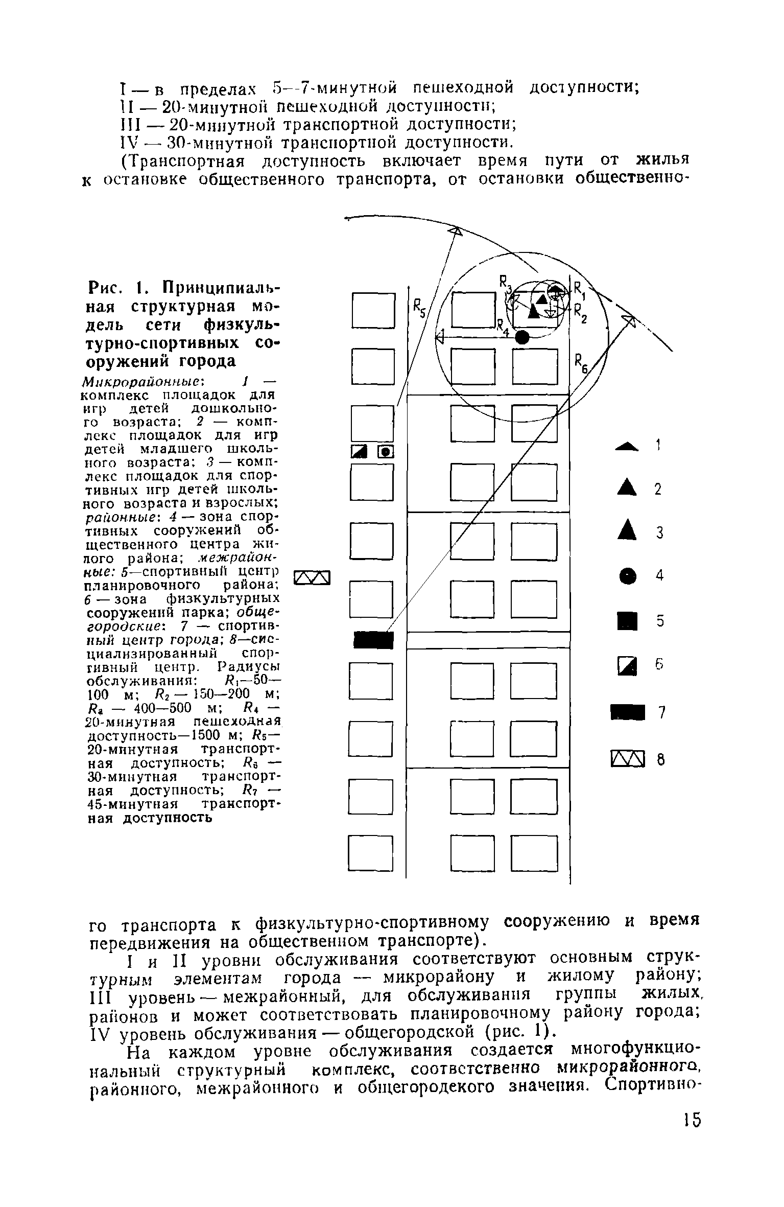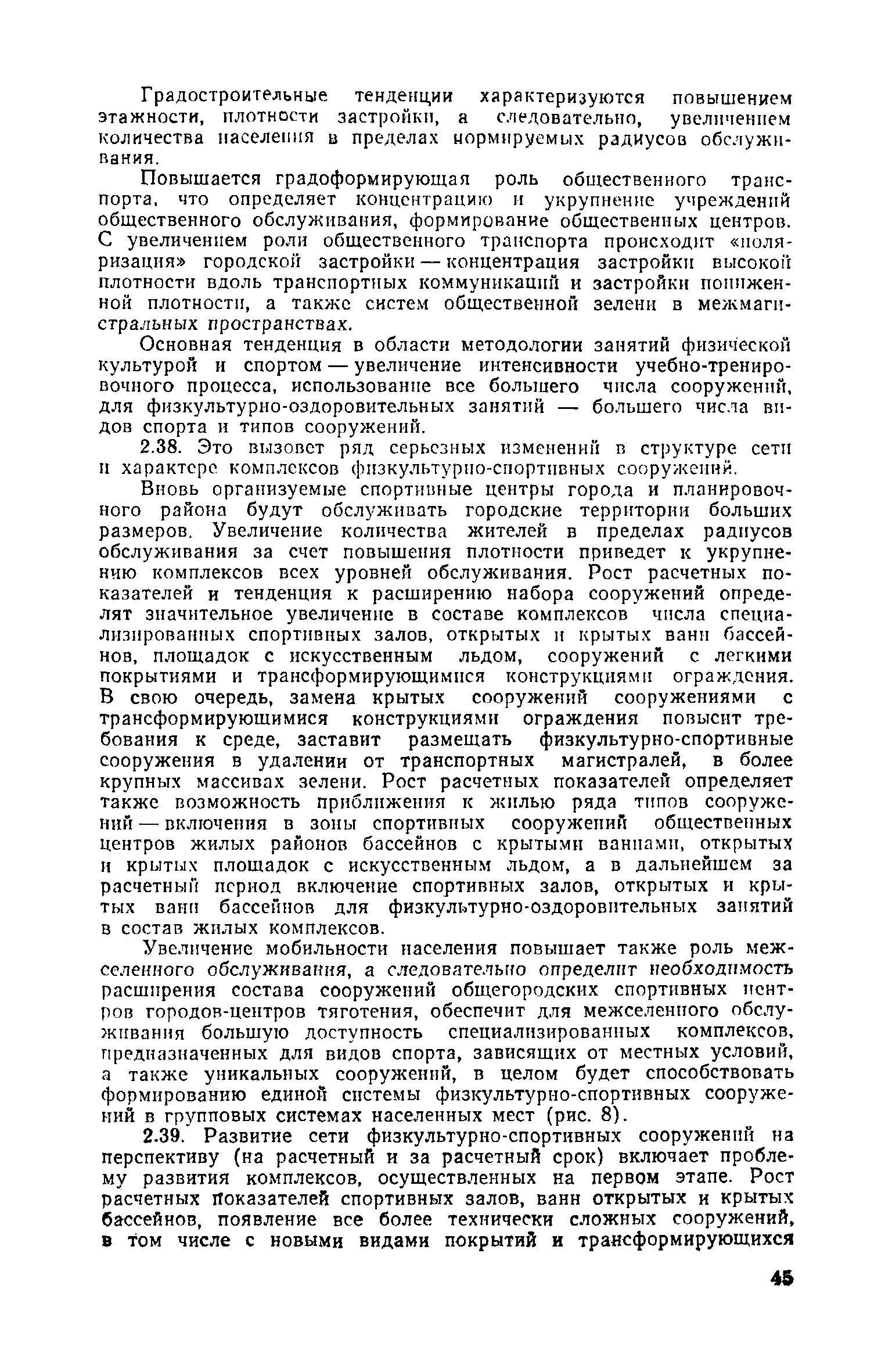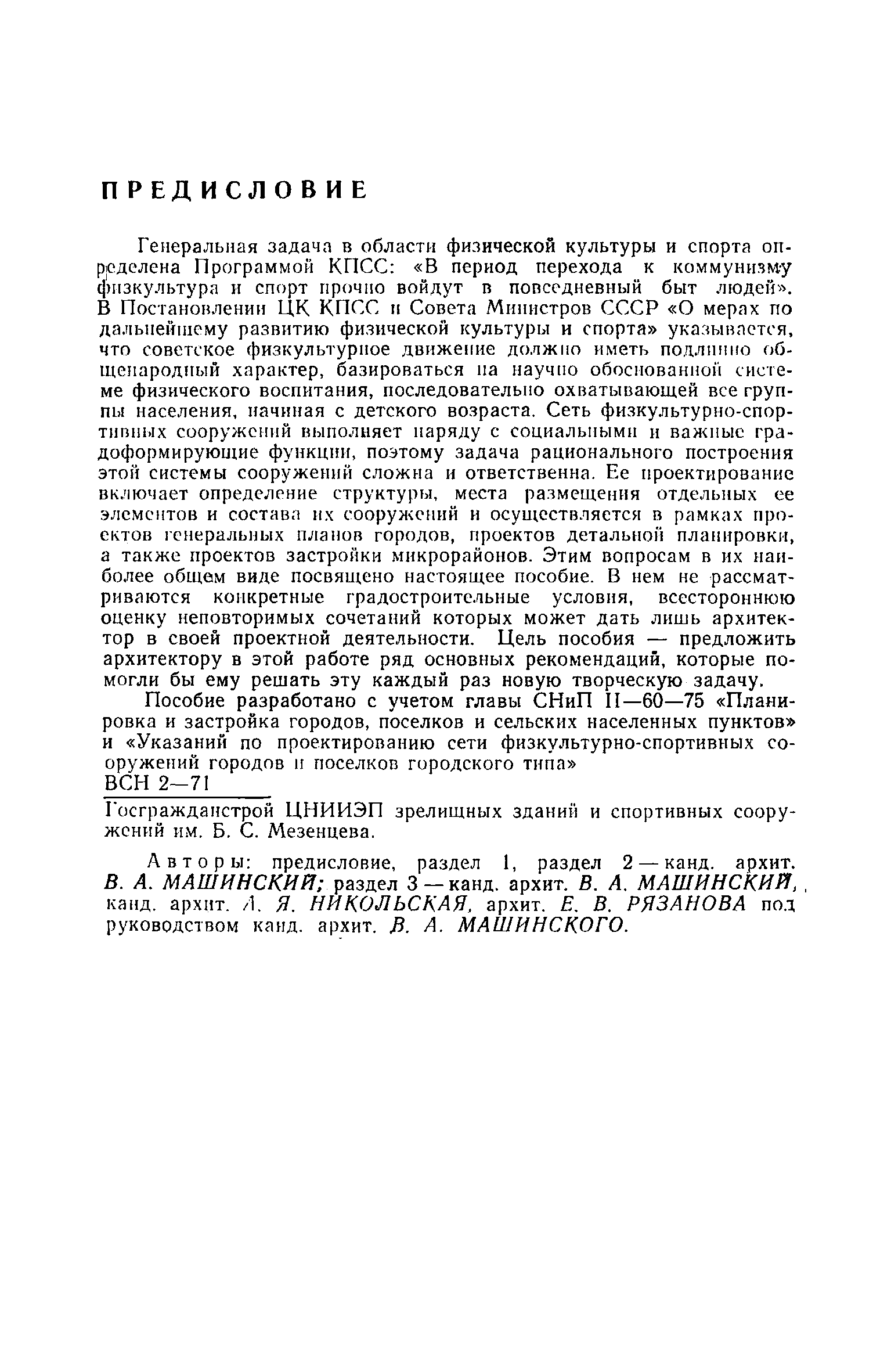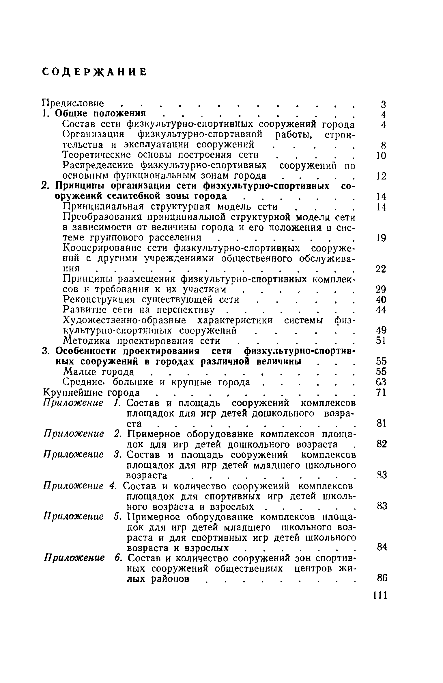 | Оглавление: | Предисловие 1. Общие положения Состав сети физкультурно-спортивных сооружений города Организация физкультурно-спортивной работы, строительства н эксплуатации сооружений Теоретические основы построения сети Распределение физкультурно-спортивных сооружений по основным функциональным зонам города 2. Принципы организации сети физкультурно-спортивных сооружений селитебной зоны города Принципиальная структурная модель сети Преобразования принципиальной структурной модели сети в зависимости от величины города и его положения в системе группового расселения Кооперированные сети физкультурно-спортивных сооружений с другими учреждениями общественного обслуживания Принципы размещения физкультурно-спортивных комплексов и требования к их участкам Реконструкции существующей сети Развитие сети на перспективу Художественно-образные характеристики системы физкультурно-спортивных сооружений Методика проектирования сети 3. Особенности проектирования сети физкультурно-спортивных сооружений в городах различной величины Малые города Средние. Большие и крупные города Крупнейшие города Приложение 1. Состав и площадь сооружений комплексов площадок для игр детей дошкольного возраста Приложение 2. Примерное оборудование комплексов площадок для игр детей дошкольного возраста - Приложение 3. Состав и площадь сооружений комплексов площадок для игр детей младшего школьного возраста Приложение 4. Состав и количество сооружений комплексов площадок для спортивных игр детей школьного возраста и взрослых Приложение 5. Примерное оборудование комплексов площадок для игр детей младшего школьного возраста и для спортивных игр детей школьного возраста и взрослых Приложение 6. Состав и количество сооружений зон спортивных сооружений общественных центров жилых районов Приложение 7. Состав и количество сооружений спортивных центров планировочных районов и зон физкультурных сооружений парков культуры и отдыха Приложение 8. Состав и количество сооружений общегородского спортивного центра Приложение 9. Нормы расчета на 1000 жителей Приложение 10. Состав и площадь участков общегородских физкультурно-спортивных сооружений, устраиваемых в зависимости от местных условий Приложение 11. Количество мест для зрителей на трибунах Приложение 12. Состав сооружений физкультурно-спортивных комплексов на 1-ю очередь и расчетный срок Приложение 13. Расчет количества сооружений и размеров земельных участков физкультурно-спортивных комплексов Приложение 14. Рекомендуемый состав сооружений общегородского спортивного центра на первую очередь строительства Приложение 15. Показатели пропускной способности единицы территории открытых плоскостных сооружений Список литературы |