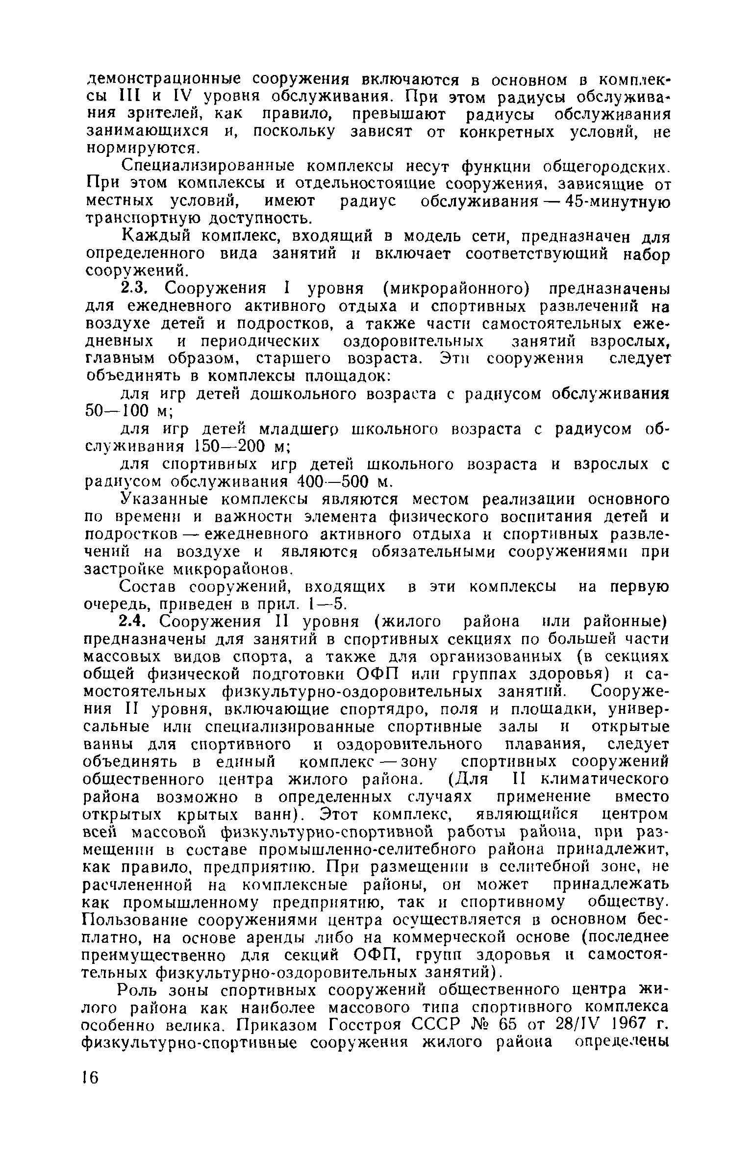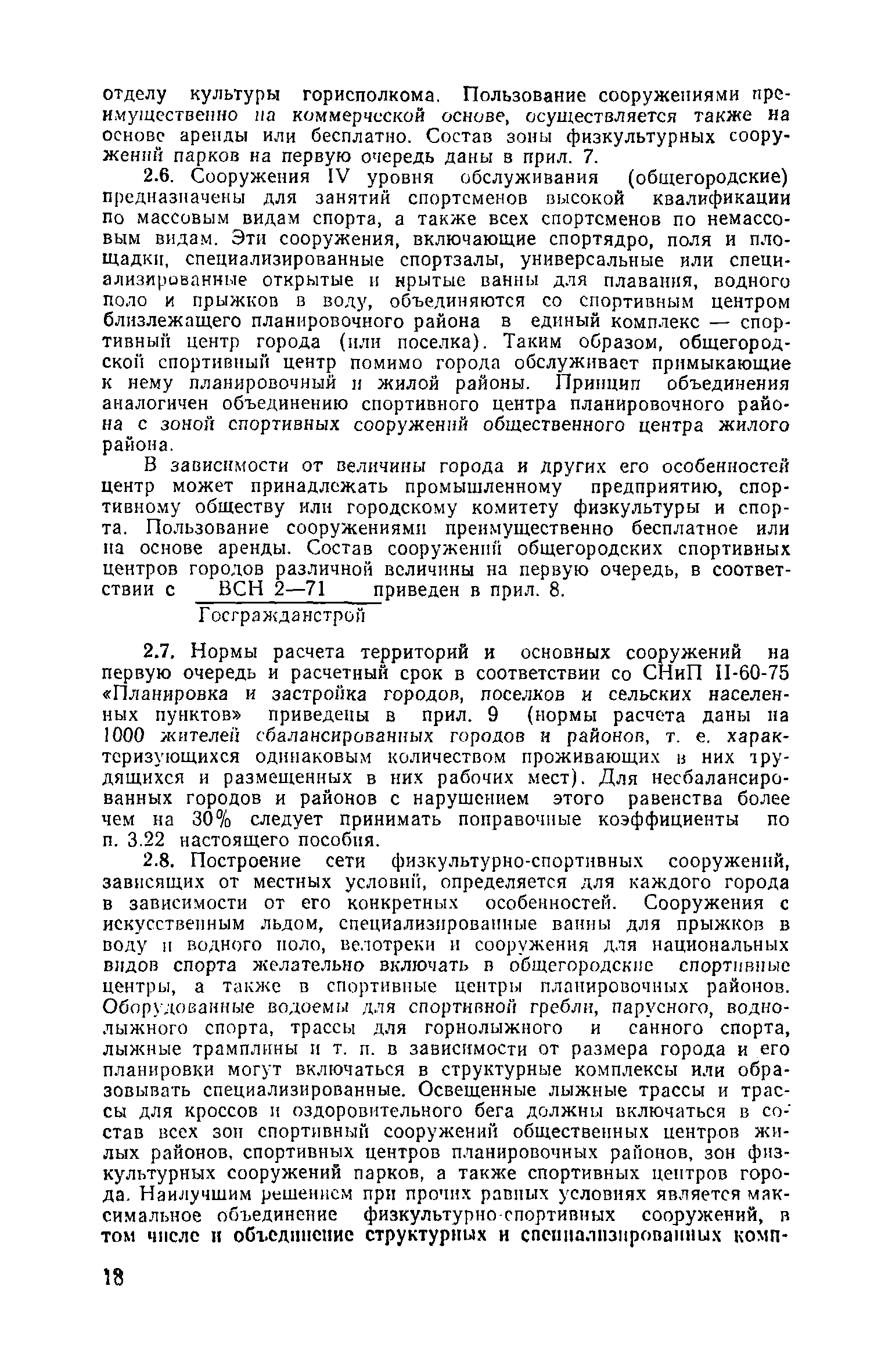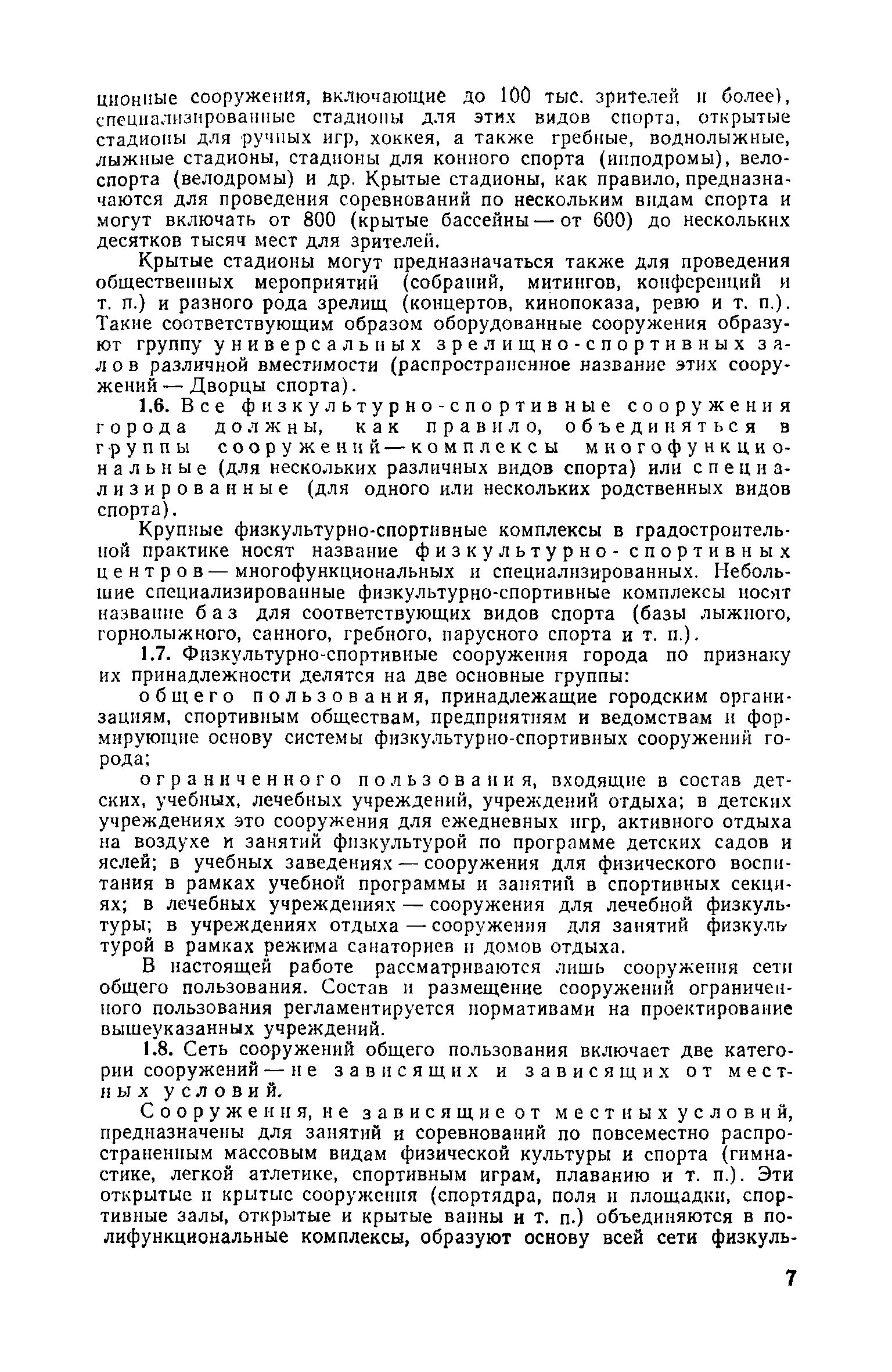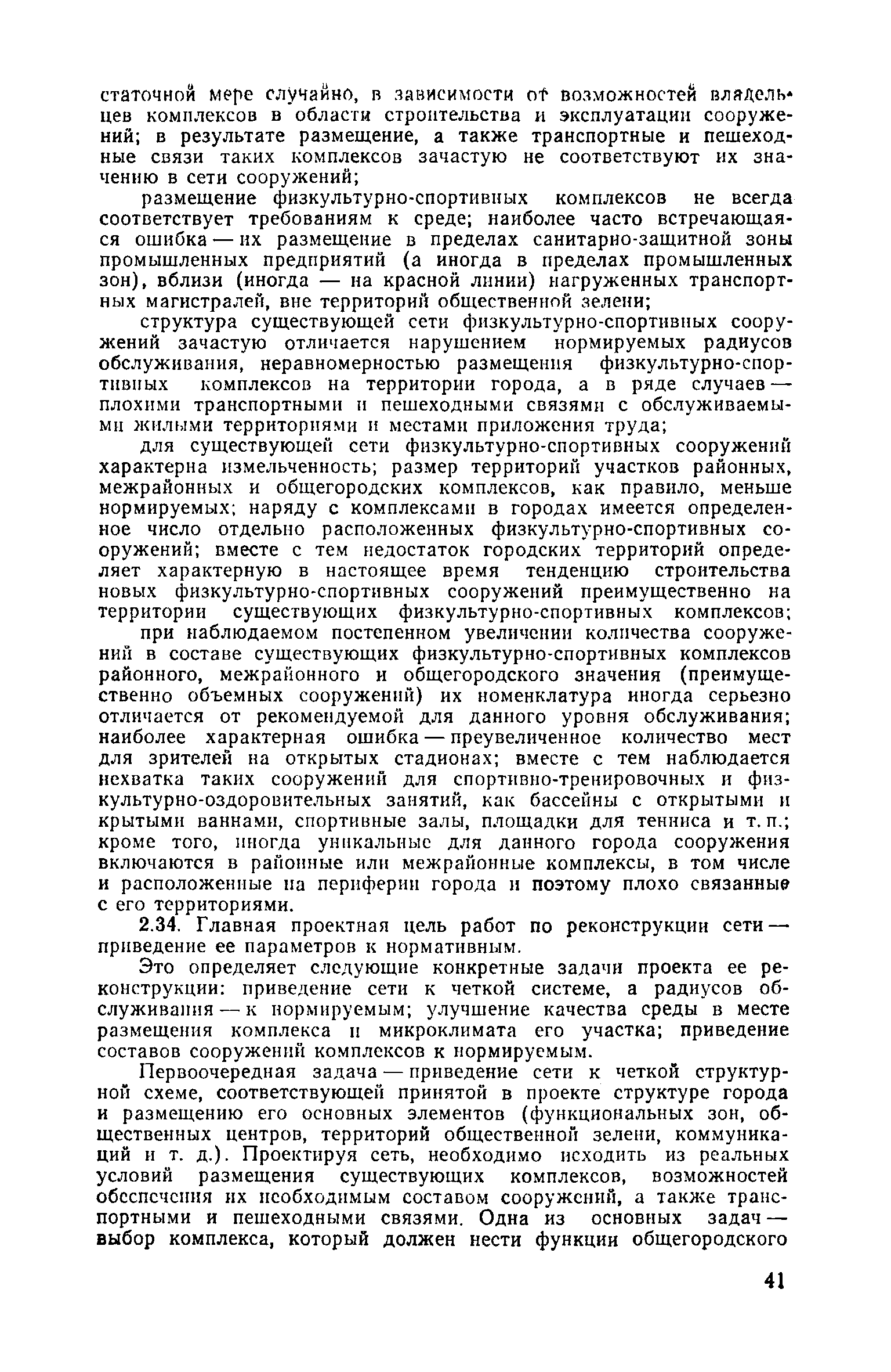| Оглавление: | Предисловие 1. Общие положения Состав сети физкультурно-спортивных сооружений города Организация физкультурно-спортивной работы, строительства н эксплуатации сооружений Теоретические основы построения сети Распределение физкультурно-спортивных сооружений по основным функциональным зонам города 2. Принципы организации сети физкультурно-спортивных сооружений селитебной зоны города Принципиальная структурная модель сети Преобразования принципиальной структурной модели сети в зависимости от величины города и его положения в системе группового расселения Кооперированные сети физкультурно-спортивных сооружений с другими учреждениями общественного обслуживания Принципы размещения физкультурно-спортивных комплексов и требования к их участкам Реконструкции существующей сети Развитие сети на перспективу Художественно-образные характеристики системы физкультурно-спортивных сооружений Методика проектирования сети 3. Особенности проектирования сети физкультурно-спортивных сооружений в городах различной величины Малые города Средние. Большие и крупные города Крупнейшие города Приложение 1. Состав и площадь сооружений комплексов площадок для игр детей дошкольного возраста Приложение 2. Примерное оборудование комплексов площадок для игр детей дошкольного возраста - Приложение 3. Состав и площадь сооружений комплексов площадок для игр детей младшего школьного возраста Приложение 4. Состав и количество сооружений комплексов площадок для спортивных игр детей школьного возраста и взрослых Приложение 5. Примерное оборудование комплексов площадок для игр детей младшего школьного возраста и для спортивных игр детей школьного возраста и взрослых Приложение 6. Состав и количество сооружений зон спортивных сооружений общественных центров жилых районов Приложение 7. Состав и количество сооружений спортивных центров планировочных районов и зон физкультурных сооружений парков культуры и отдыха Приложение 8. Состав и количество сооружений общегородского спортивного центра Приложение 9. Нормы расчета на 1000 жителей Приложение 10. Состав и площадь участков общегородских физкультурно-спортивных сооружений, устраиваемых в зависимости от местных условий Приложение 11. Количество мест для зрителей на трибунах Приложение 12. Состав сооружений физкультурно-спортивных комплексов на 1-ю очередь и расчетный срок Приложение 13. Расчет количества сооружений и размеров земельных участков физкультурно-спортивных комплексов Приложение 14. Рекомендуемый состав сооружений общегородского спортивного центра на первую очередь строительства Приложение 15. Показатели пропускной способности единицы территории открытых плоскостных сооружений Список литературы |