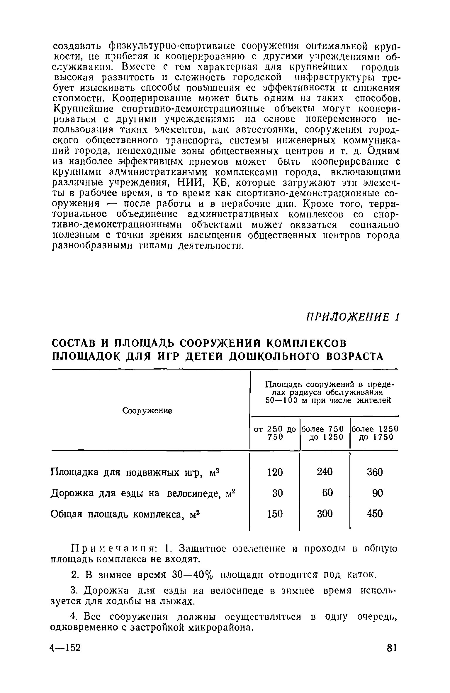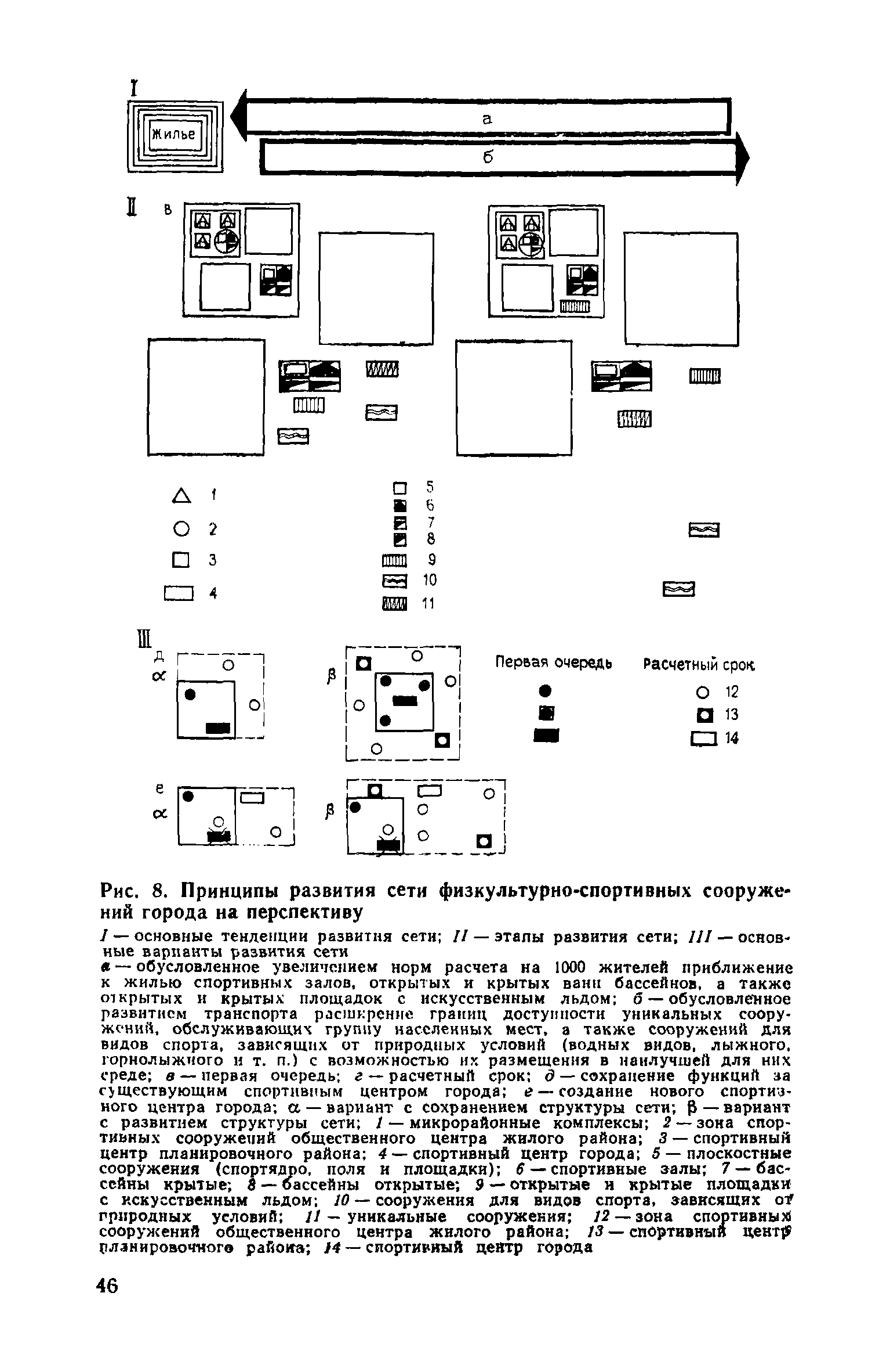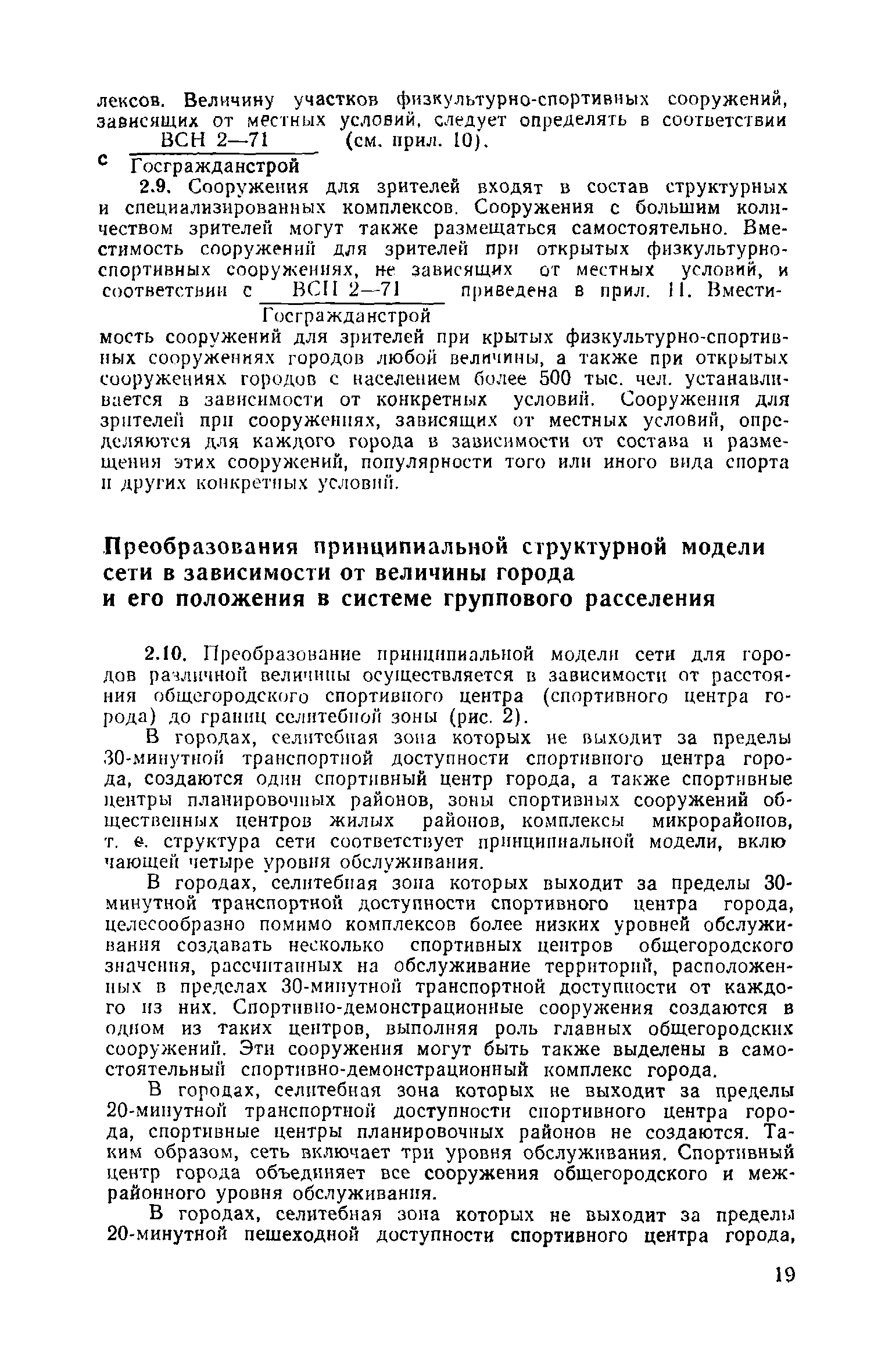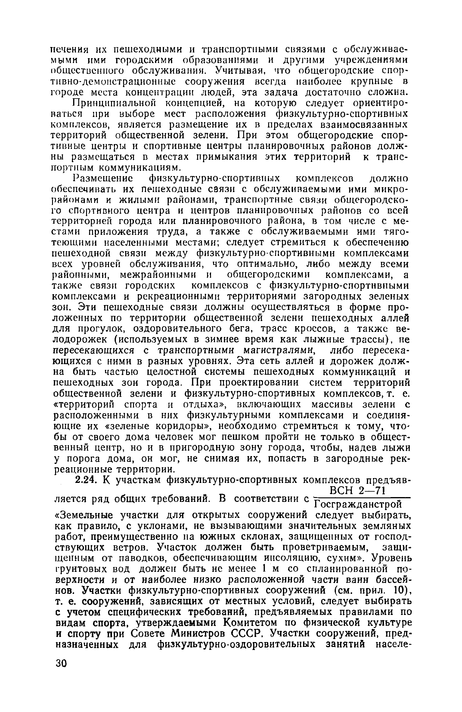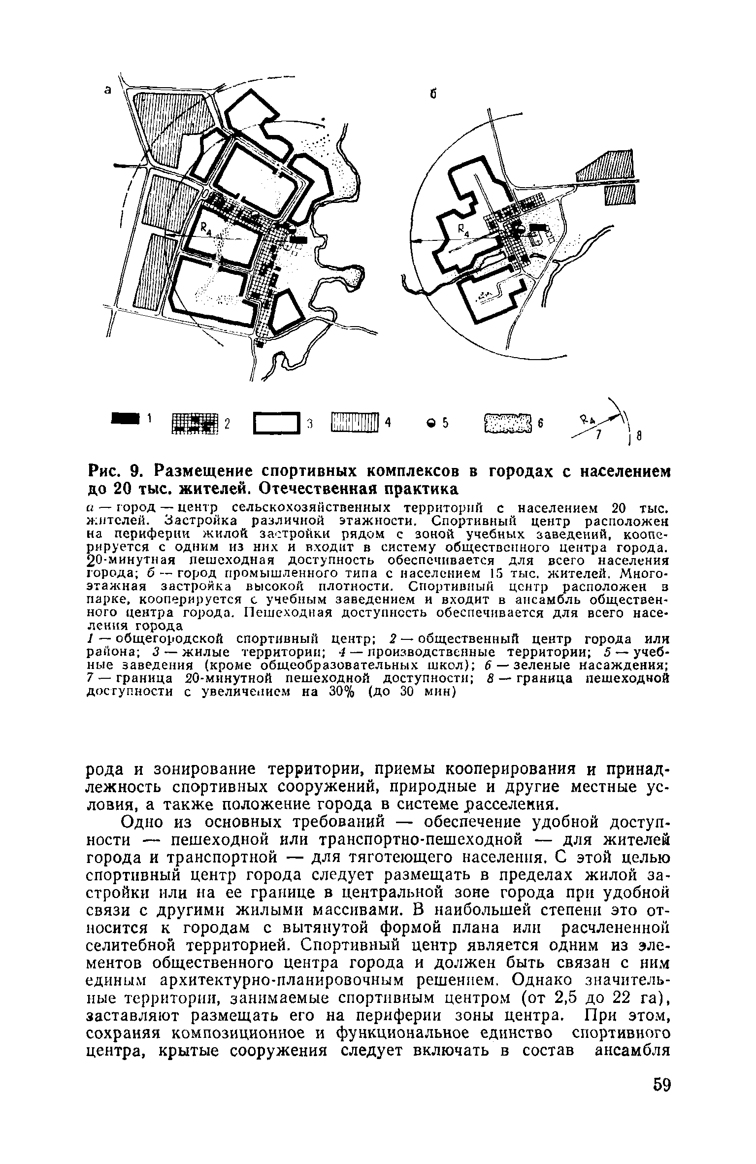 | Оглавление: | Предисловие 1. Общие положения Состав сети физкультурно-спортивных сооружений города Организация физкультурно-спортивной работы, строительства н эксплуатации сооружений Теоретические основы построения сети Распределение физкультурно-спортивных сооружений по основным функциональным зонам города 2. Принципы организации сети физкультурно-спортивных сооружений селитебной зоны города Принципиальная структурная модель сети Преобразования принципиальной структурной модели сети в зависимости от величины города и его положения в системе группового расселения Кооперированные сети физкультурно-спортивных сооружений с другими учреждениями общественного обслуживания Принципы размещения физкультурно-спортивных комплексов и требования к их участкам Реконструкции существующей сети Развитие сети на перспективу Художественно-образные характеристики системы физкультурно-спортивных сооружений Методика проектирования сети 3. Особенности проектирования сети физкультурно-спортивных сооружений в городах различной величины Малые города Средние. Большие и крупные города Крупнейшие города Приложение 1. Состав и площадь сооружений комплексов площадок для игр детей дошкольного возраста Приложение 2. Примерное оборудование комплексов площадок для игр детей дошкольного возраста - Приложение 3. Состав и площадь сооружений комплексов площадок для игр детей младшего школьного возраста Приложение 4. Состав и количество сооружений комплексов площадок для спортивных игр детей школьного возраста и взрослых Приложение 5. Примерное оборудование комплексов площадок для игр детей младшего школьного возраста и для спортивных игр детей школьного возраста и взрослых Приложение 6. Состав и количество сооружений зон спортивных сооружений общественных центров жилых районов Приложение 7. Состав и количество сооружений спортивных центров планировочных районов и зон физкультурных сооружений парков культуры и отдыха Приложение 8. Состав и количество сооружений общегородского спортивного центра Приложение 9. Нормы расчета на 1000 жителей Приложение 10. Состав и площадь участков общегородских физкультурно-спортивных сооружений, устраиваемых в зависимости от местных условий Приложение 11. Количество мест для зрителей на трибунах Приложение 12. Состав сооружений физкультурно-спортивных комплексов на 1-ю очередь и расчетный срок Приложение 13. Расчет количества сооружений и размеров земельных участков физкультурно-спортивных комплексов Приложение 14. Рекомендуемый состав сооружений общегородского спортивного центра на первую очередь строительства Приложение 15. Показатели пропускной способности единицы территории открытых плоскостных сооружений Список литературы |