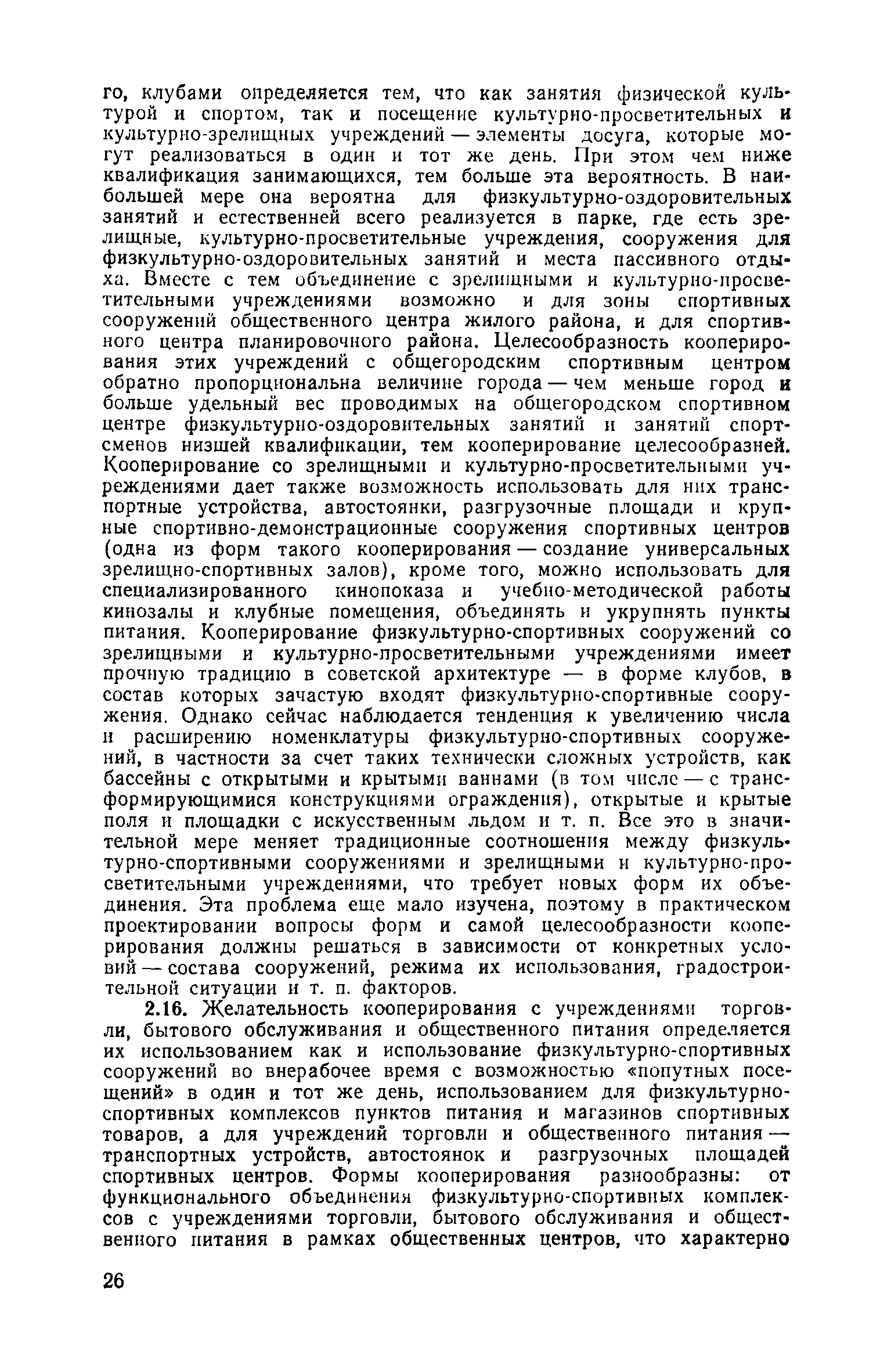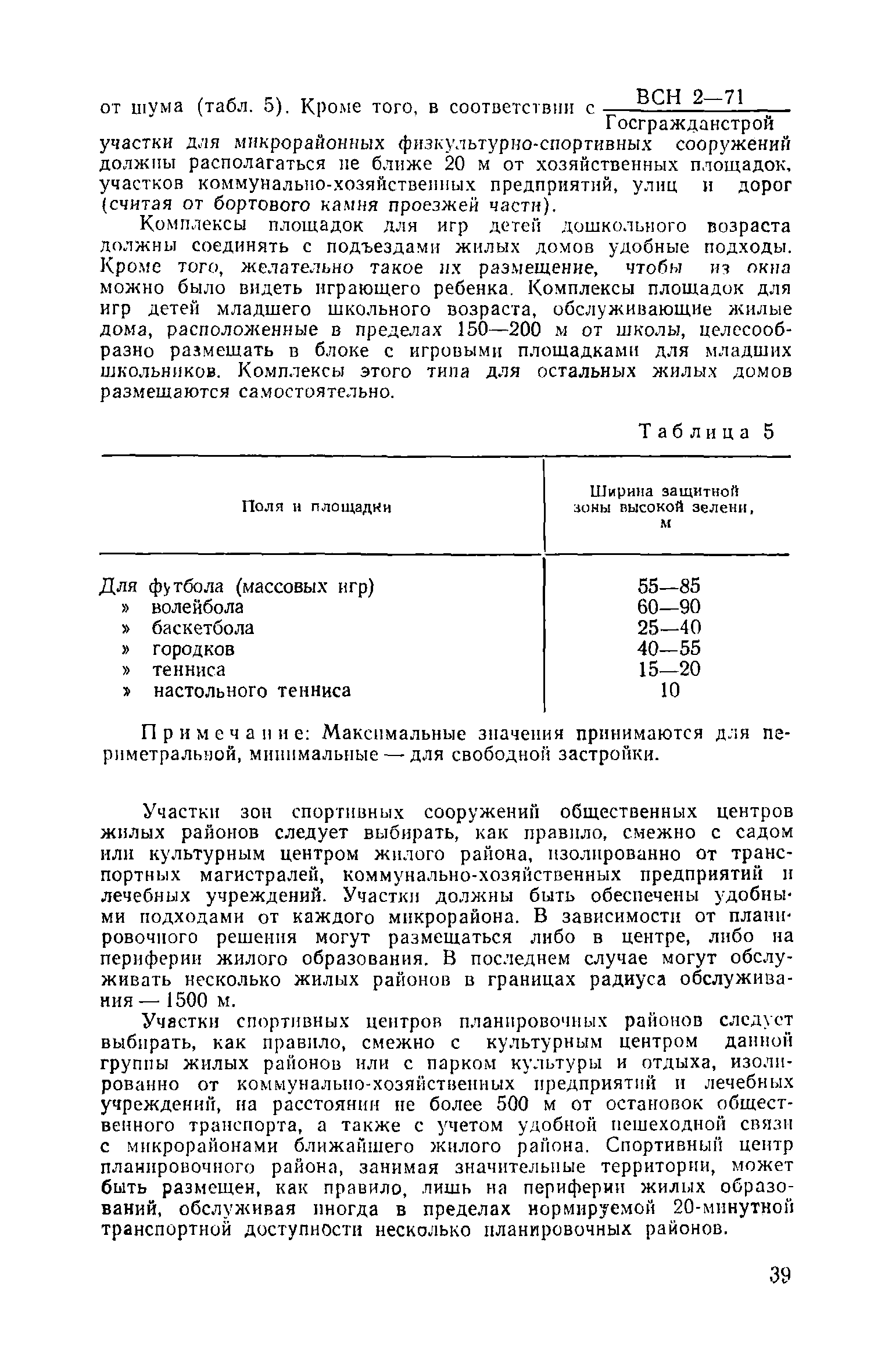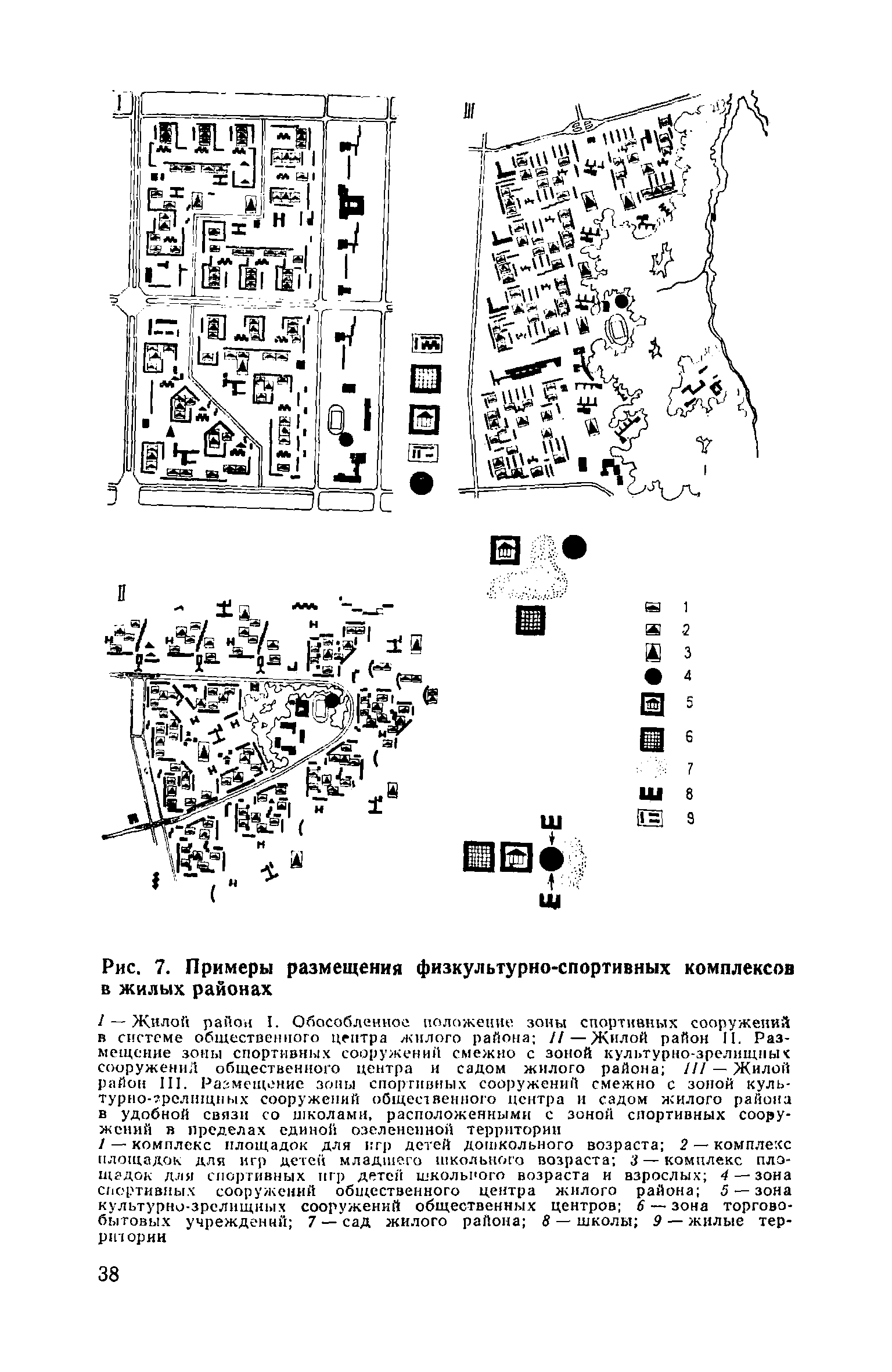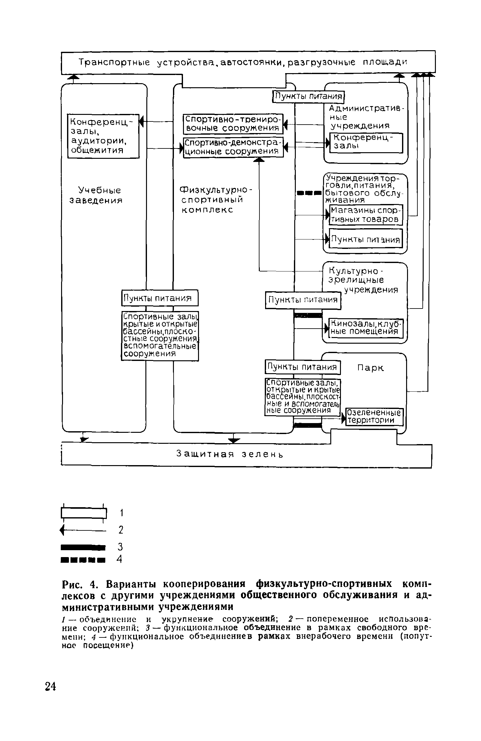 | Оглавление: | Предисловие 1. Общие положения Состав сети физкультурно-спортивных сооружений города Организация физкультурно-спортивной работы, строительства н эксплуатации сооружений Теоретические основы построения сети Распределение физкультурно-спортивных сооружений по основным функциональным зонам города 2. Принципы организации сети физкультурно-спортивных сооружений селитебной зоны города Принципиальная структурная модель сети Преобразования принципиальной структурной модели сети в зависимости от величины города и его положения в системе группового расселения Кооперированные сети физкультурно-спортивных сооружений с другими учреждениями общественного обслуживания Принципы размещения физкультурно-спортивных комплексов и требования к их участкам Реконструкции существующей сети Развитие сети на перспективу Художественно-образные характеристики системы физкультурно-спортивных сооружений Методика проектирования сети 3. Особенности проектирования сети физкультурно-спортивных сооружений в городах различной величины Малые города Средние. Большие и крупные города Крупнейшие города Приложение 1. Состав и площадь сооружений комплексов площадок для игр детей дошкольного возраста Приложение 2. Примерное оборудование комплексов площадок для игр детей дошкольного возраста - Приложение 3. Состав и площадь сооружений комплексов площадок для игр детей младшего школьного возраста Приложение 4. Состав и количество сооружений комплексов площадок для спортивных игр детей школьного возраста и взрослых Приложение 5. Примерное оборудование комплексов площадок для игр детей младшего школьного возраста и для спортивных игр детей школьного возраста и взрослых Приложение 6. Состав и количество сооружений зон спортивных сооружений общественных центров жилых районов Приложение 7. Состав и количество сооружений спортивных центров планировочных районов и зон физкультурных сооружений парков культуры и отдыха Приложение 8. Состав и количество сооружений общегородского спортивного центра Приложение 9. Нормы расчета на 1000 жителей Приложение 10. Состав и площадь участков общегородских физкультурно-спортивных сооружений, устраиваемых в зависимости от местных условий Приложение 11. Количество мест для зрителей на трибунах Приложение 12. Состав сооружений физкультурно-спортивных комплексов на 1-ю очередь и расчетный срок Приложение 13. Расчет количества сооружений и размеров земельных участков физкультурно-спортивных комплексов Приложение 14. Рекомендуемый состав сооружений общегородского спортивного центра на первую очередь строительства Приложение 15. Показатели пропускной способности единицы территории открытых плоскостных сооружений Список литературы |