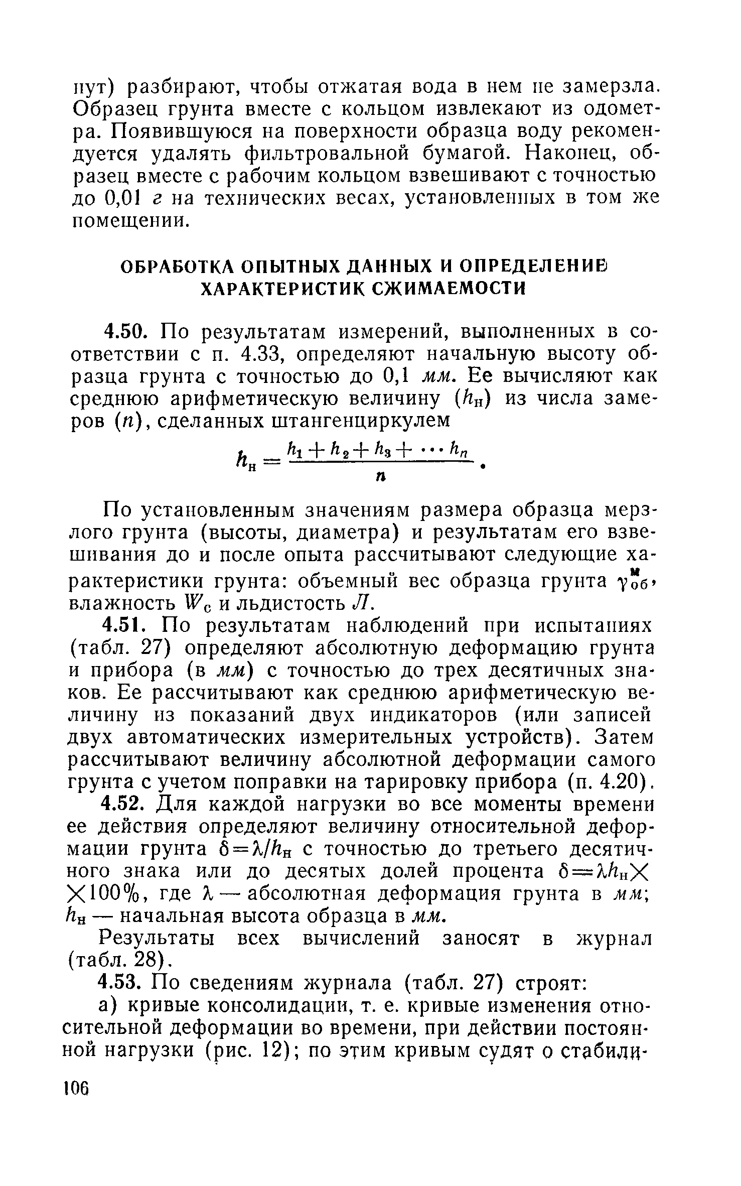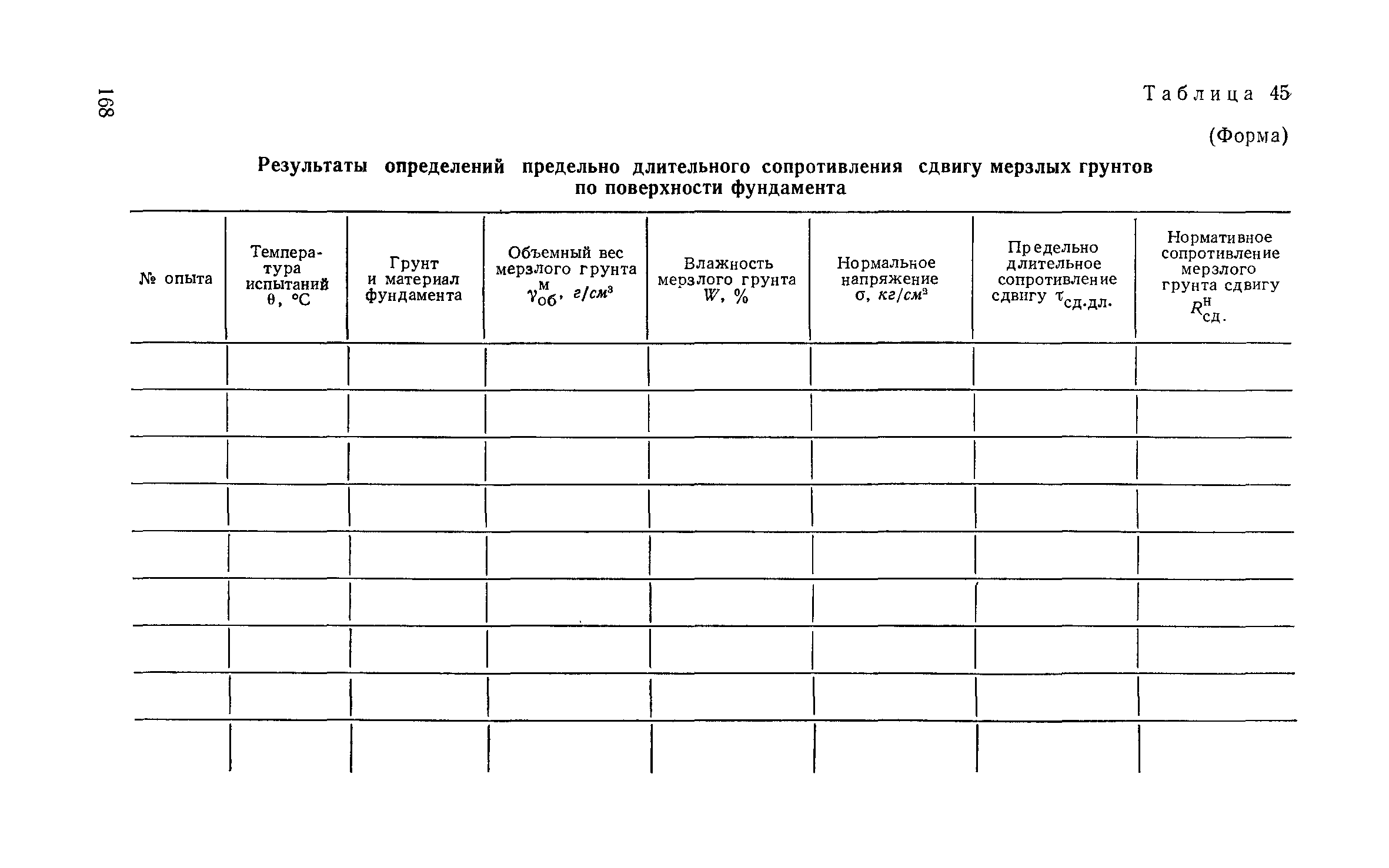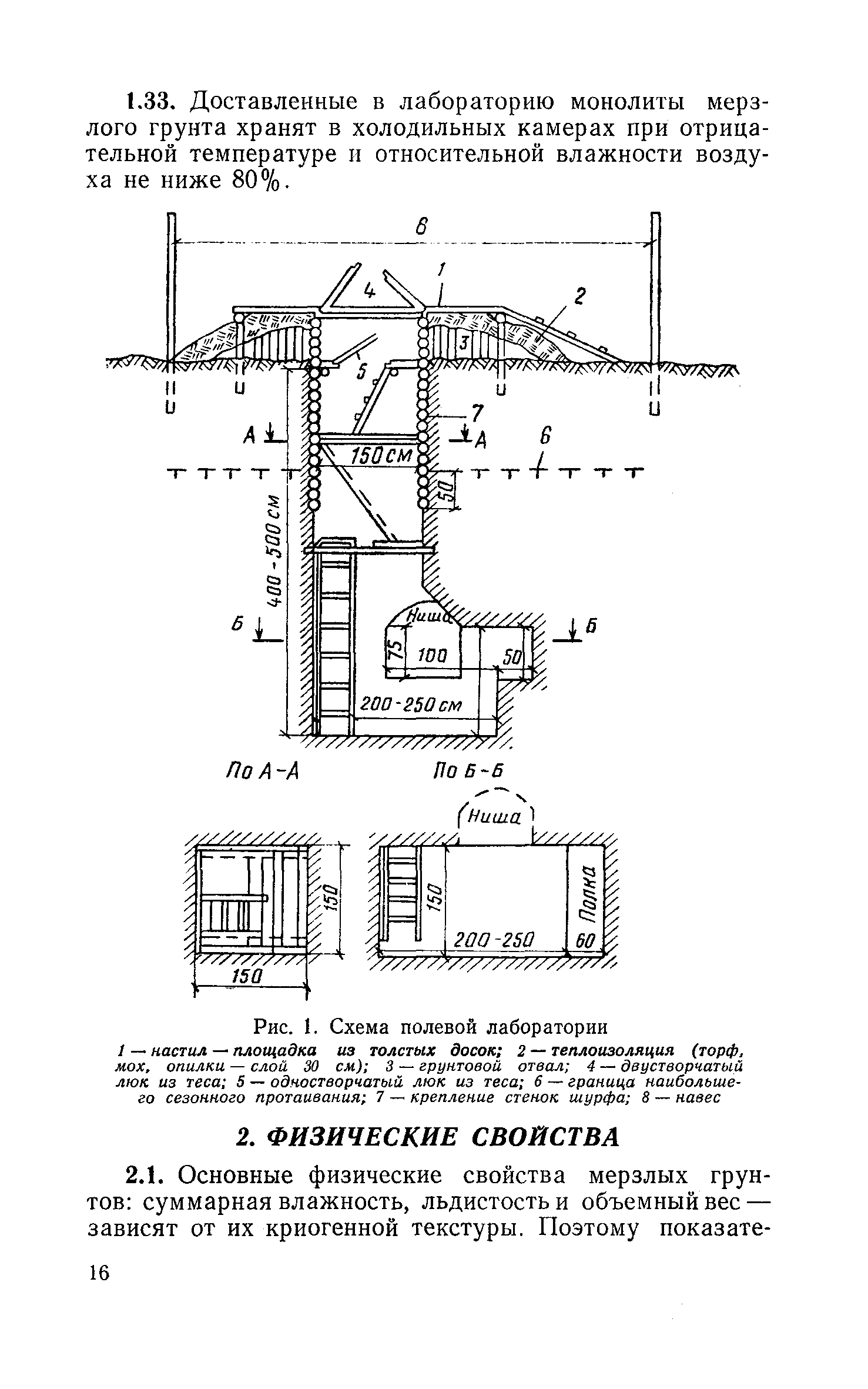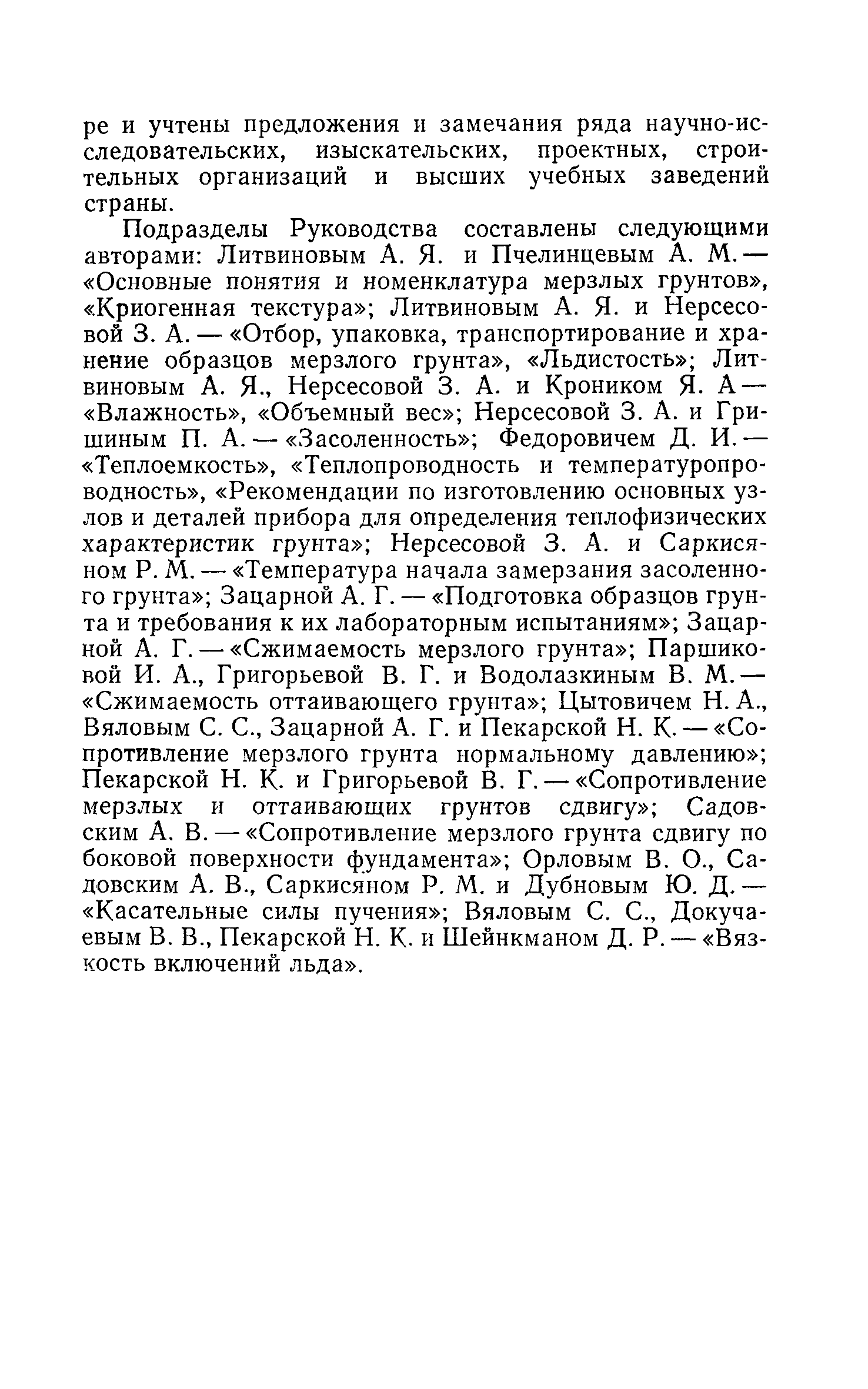 | Оглавление: | Предисловие 1. Общие положения Основные понятия и номенклатура мерзлых грунтов Криогенная текстура Отбор, упаковка, транспортирование н хранение образцов мерзлого грунта 2. Физические свойства Влажность Льдистость Объемный вес Засоленность 3. Теплофизические свойства Теплоемкость Теплопроводность и температуропроводность Температура начала замерзания засоленных грунтов Рекомендации по изготовлению основных узлов и деталей приборов для определения теплофизических характеристик 4. Механические свойства Подготовка образцов грунта и требования к их лабораторным испытаниям Сжимаемость мерзлых грунтов Сжимаемость оттаивающего грунта Сопротивление мерзлых грунтов нормальному давлению Сопротивление мерзлых и оттаявших грунтов сдвигу Сопротивление мерзлого грунта сдвигу по боковой поверхности фундамента Касательные силы пучения грунтов Вязкость включений льда |