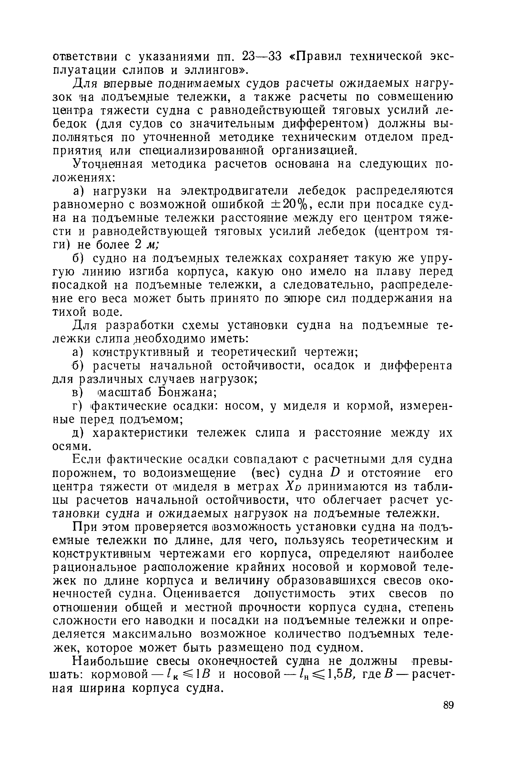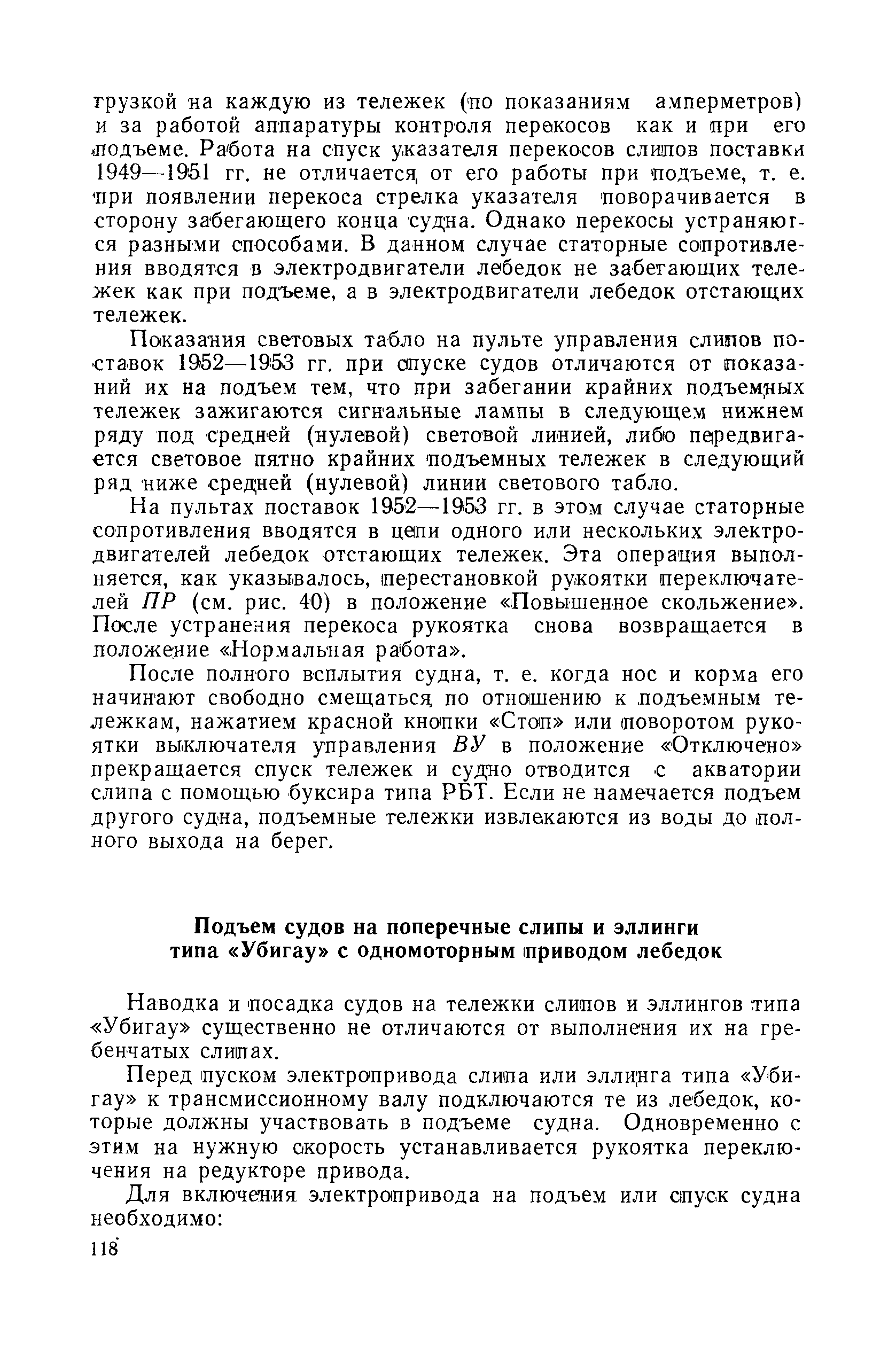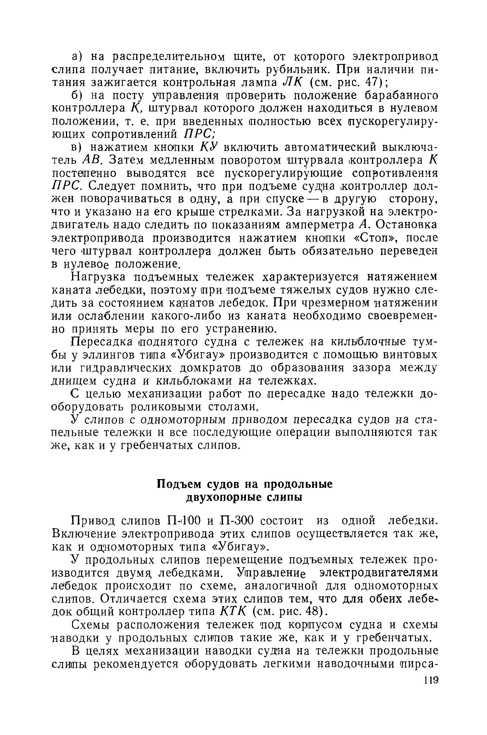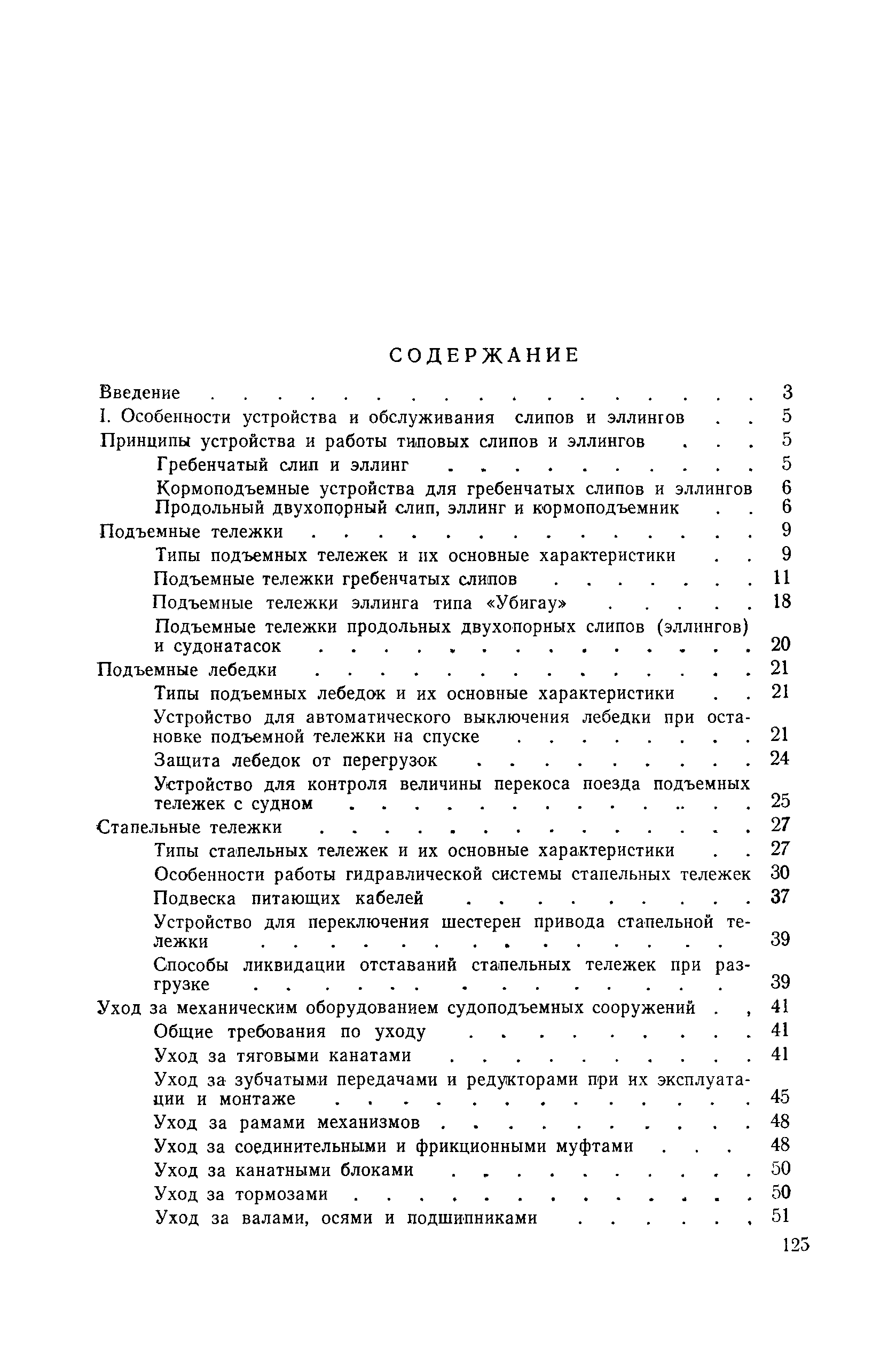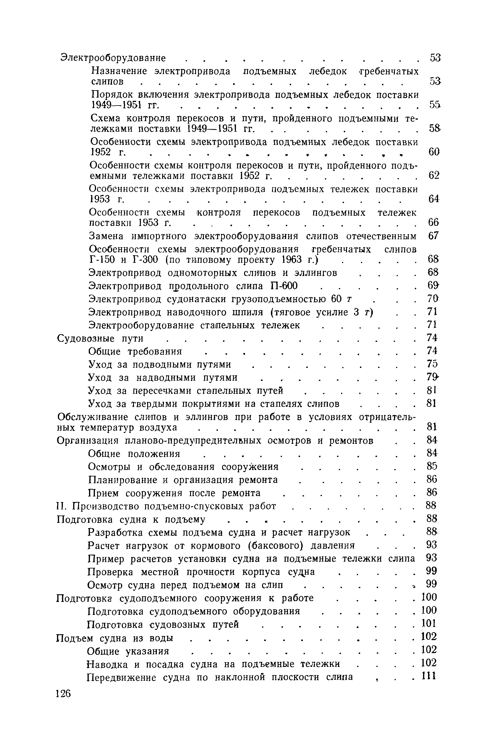 | Оглавление: | Введение 1. Особенности устройства и обслуживания слипов и эллингов Принципы устройства и работы типовых слипов и эллингов Гребенчатый слип и эллинг Кормоподъемные устройства для гребенчатых слипов и эллингов Продольный двухопорный слип, эллинг и кормоподъемник Подъемные тележки Типы подъемных тележек и их основные характеристики Подъемные тележки гребенчатых слипов Подъемные тележки эллинга типа "Убигау" Подъемные тележки продольных двухопорных слипов (эллингов) и судонатасок Подъемные лебедки Типы подъемных лебедок и их основные характеристики Устройство для автоматического выключения лебедки при остановке подъемной тележки на спуске Защита лебедок от перегрузок Устройство для контроля величины перекоса поезда подъемных тележек с судном Стапельные тележки Типы стапельных тележек и их основные характеристики Особенности работы гидравлической системы стапельных тележек Подвеска питающих кабелей Устройство для переключения шестерен привода стапельной тележки Способы ликвидации отставаний стапельных тележек при разгрузке Уход за механическим оборудованием судоподъемных сооружений Общие требования по уходу Уход за тяговыми канатами Уход за зубчатыми передачами и редукторами при их эксплуатации и монтаже Уход за рамами механизмов Уход за соединительными и фрикционными муфтами Уход за канатными блоками Уход за тормозами Уход за валами, осями и подшипниками Электрооборудование Назначение электропривода подъемных лебедок гребенчатых слипов Порядок включения электропривода подъемных лебедок поставки 1949-1951 гг. Схема контроля перекосов и пути, пройденного подъемными тележками поставки 1949-1951 гг. Особенности схемы электропривода подъемных лебедок поставки 1952 г Особенности схемы контроля перекосов и пути, пройденного подъемными тележками поставки 1952 г Особенности схемы электропривода подъемных тележек поставки 1953 г Особенности схемы контроля перекосов подъемных тележек поставки 1953 г Замена импортного электрооборудования слипов отечественным Особенности схемы электрооборудования гребенчатых слипов Г-150 и Г-300 (по типовому проекту 1963 г.) Электропривод одномоторных слипов и эллингов Электропривод продольного слипа П-600 Электропривод судонатаски грузоподъемностью 60 т Электропривод наводочного шпиля (тяговое усилие 3 т) Электрооборудование стапельных тележек Судовозные пути Общие требования Уход за подводными путями Уход за надводными путями Уход за пересечками стапельных путей Уход за твердыми покрытиями на стапелях слипов Обслуживание слипов и эллингов при работе в условиях отрицательных температур воздуха Организация планово-предупредительных осмотров и ремонтов Общие положения Осмотры и обследования сооружения Планирование и организация ремонта Прием сооружения после ремонта II. Производство подъемно-спусковых работ Подготовка судна к подъему Разработка схемы подъема судна и расчет нагрузок Расчет нагрузок от кормового (баксового) давления Пример расчетов установки судна на подъемные тележки слипа Проверка местной прочности корпусов судна Осмотр судна перед подъемом на слип Подготовка судоподъемного сооружения к работе Подготовка судоподъемного оборудования Подготовка судовозных путей Подъем судна из воды Общие указания Наводка и посадка судна на подъемные 