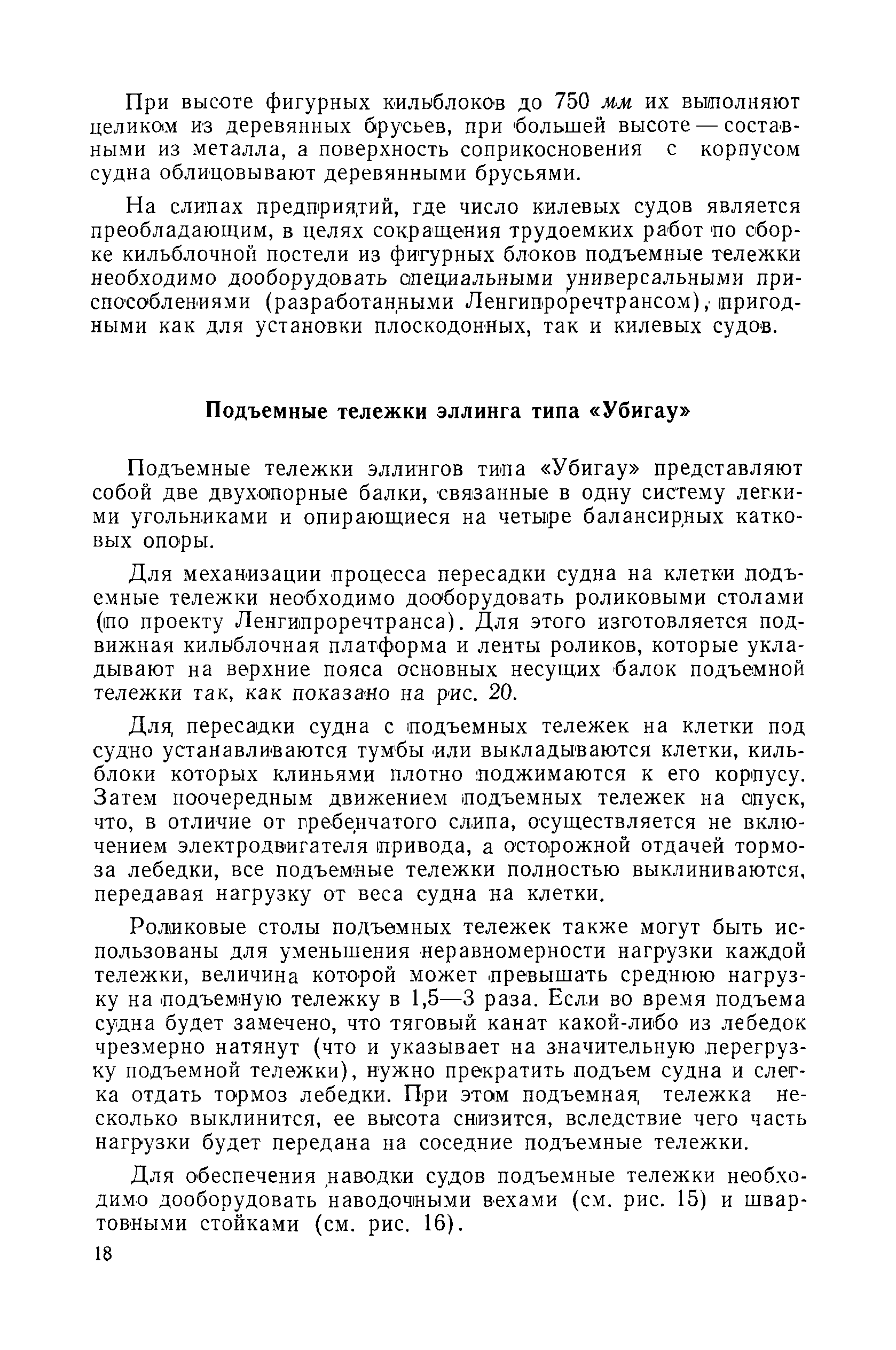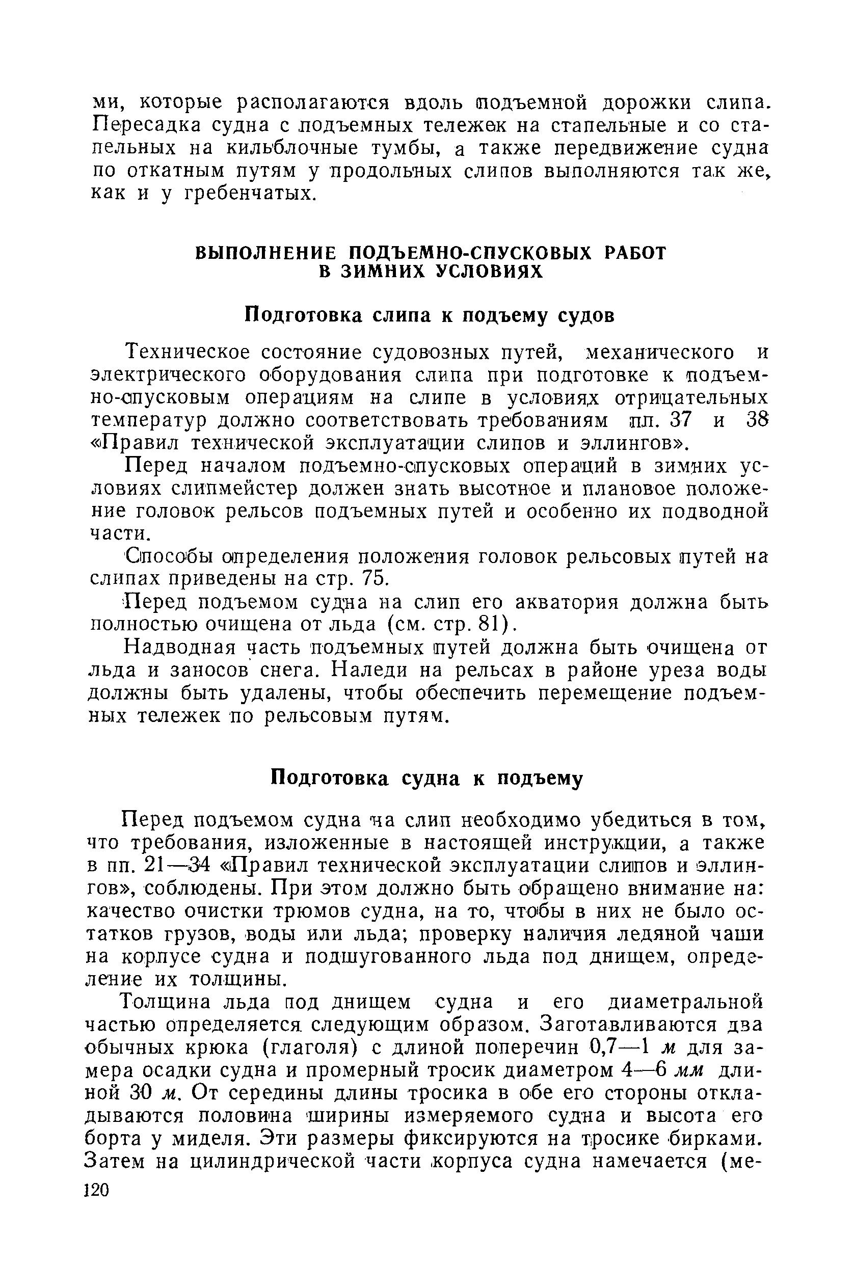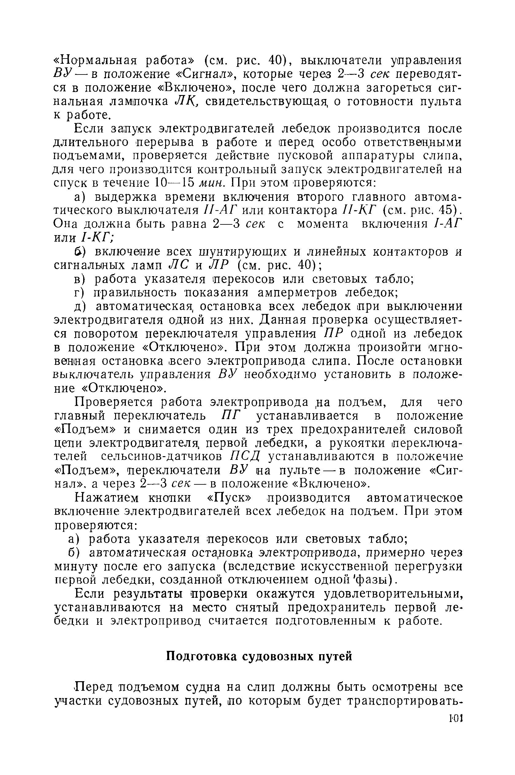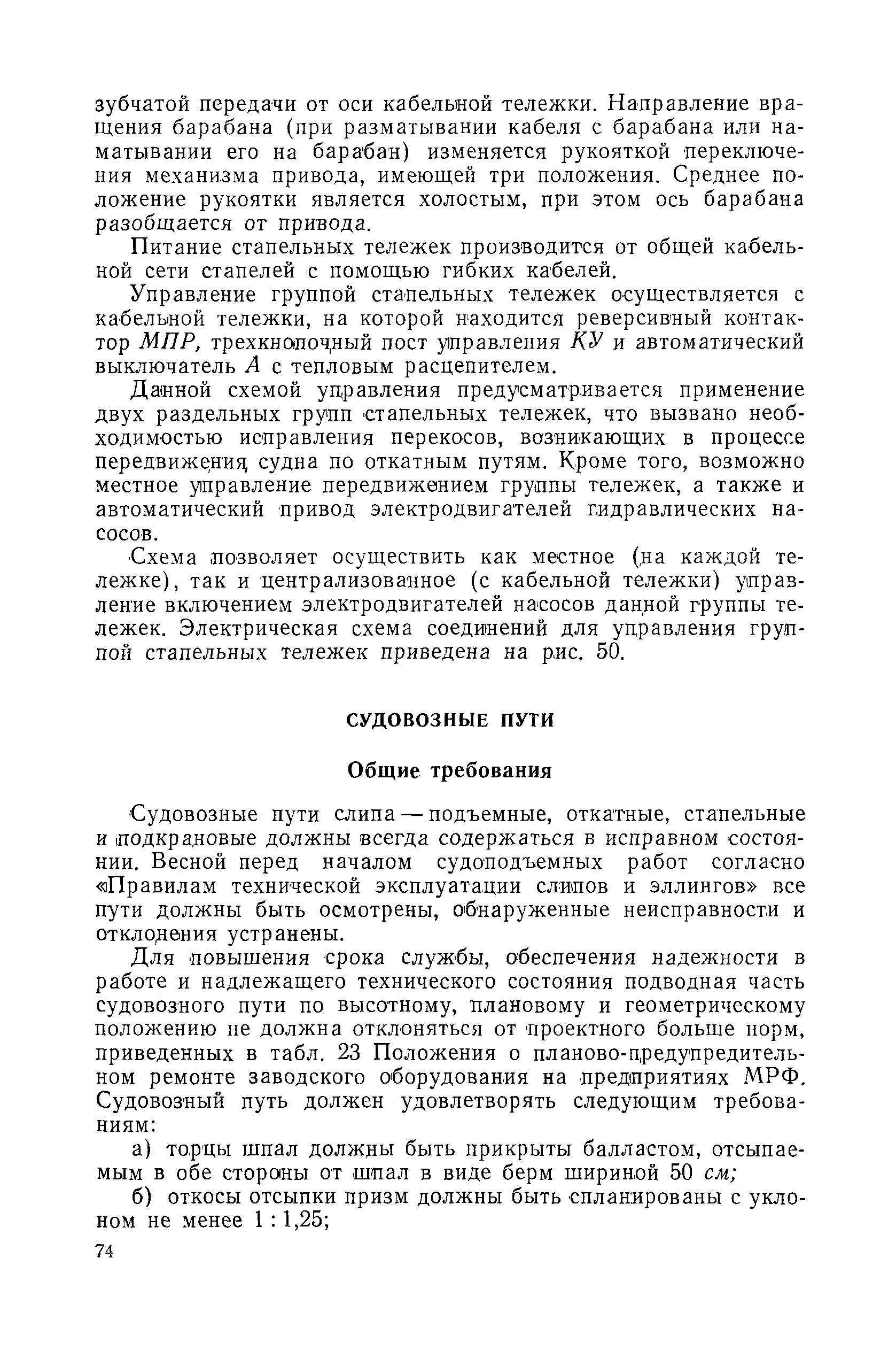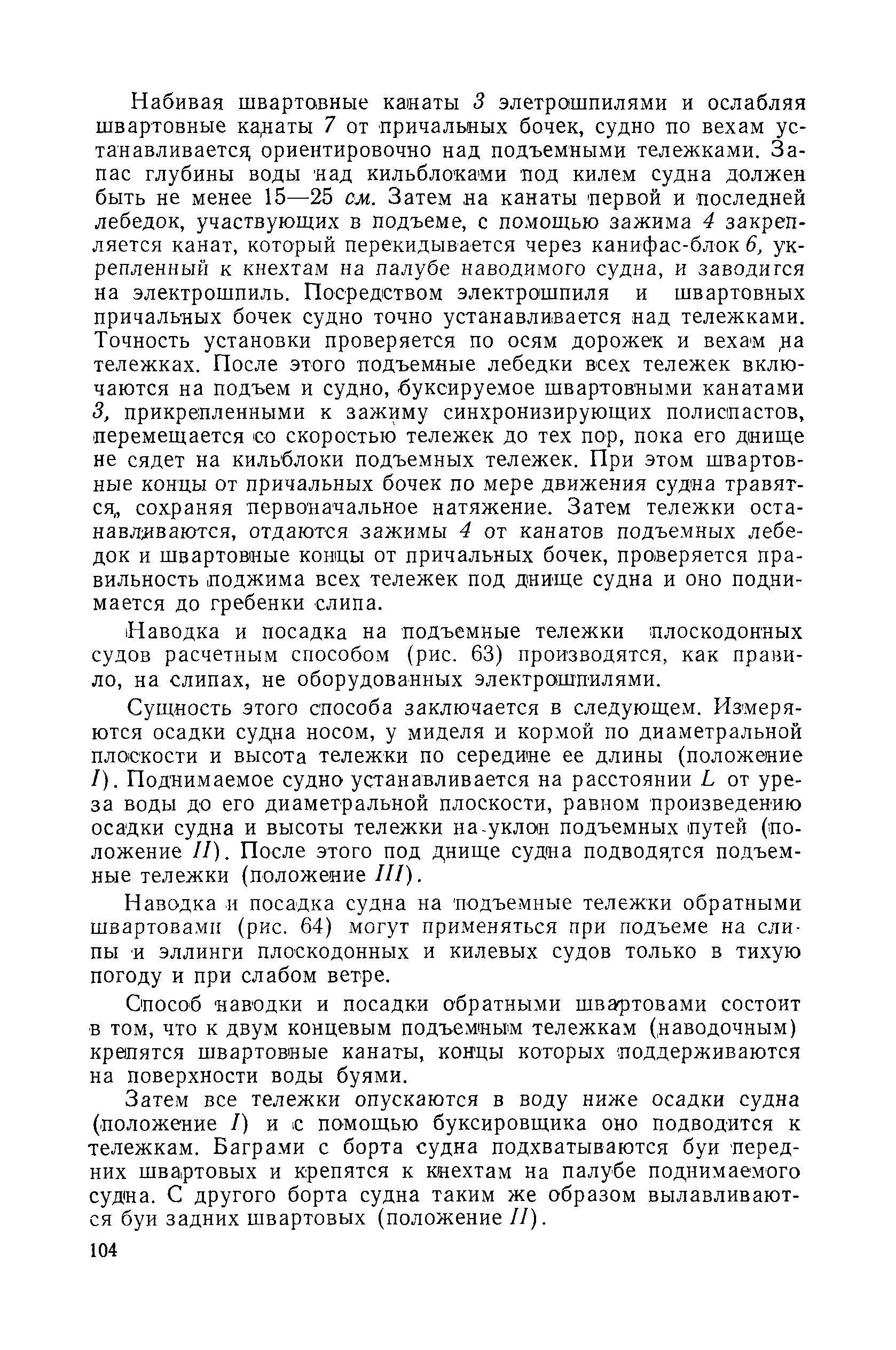 | Оглавление: | Введение 1. Особенности устройства и обслуживания слипов и эллингов Принципы устройства и работы типовых слипов и эллингов Гребенчатый слип и эллинг Кормоподъемные устройства для гребенчатых слипов и эллингов Продольный двухопорный слип, эллинг и кормоподъемник Подъемные тележки Типы подъемных тележек и их основные характеристики Подъемные тележки гребенчатых слипов Подъемные тележки эллинга типа "Убигау" Подъемные тележки продольных двухопорных слипов (эллингов) и судонатасок Подъемные лебедки Типы подъемных лебедок и их основные характеристики Устройство для автоматического выключения лебедки при остановке подъемной тележки на спуске Защита лебедок от перегрузок Устройство для контроля величины перекоса поезда подъемных тележек с судном Стапельные тележки Типы стапельных тележек и их основные характеристики Особенности работы гидравлической системы стапельных тележек Подвеска питающих кабелей Устройство для переключения шестерен привода стапельной тележки Способы ликвидации отставаний стапельных тележек при разгрузке Уход за механическим оборудованием судоподъемных сооружений Общие требования по уходу Уход за тяговыми канатами Уход за зубчатыми передачами и редукторами при их эксплуатации и монтаже Уход за рамами механизмов Уход за соединительными и фрикционными муфтами Уход за канатными блоками Уход за тормозами Уход за валами, осями и подшипниками Электрооборудование Назначение электропривода подъемных лебедок гребенчатых слипов Порядок включения электропривода подъемных лебедок поставки 1949-1951 гг. Схема контроля перекосов и пути, пройденного подъемными тележками поставки 1949-1951 гг. Особенности схемы электропривода подъемных лебедок поставки 1952 г Особенности схемы контроля перекосов и пути, пройденного подъемными тележками поставки 1952 г Особенности схемы электропривода подъемных тележек поставки 1953 г Особенности схемы контроля перекосов подъемных тележек поставки 1953 г Замена импортного электрооборудования слипов отечественным Особенности схемы электрооборудования гребенчатых слипов Г-150 и Г-300 (по типовому проекту 1963 г.) Электропривод одномоторных слипов и эллингов Электропривод продольного слипа П-600 Электропривод судонатаски грузоподъемностью 60 т Электропривод наводочного шпиля (тяговое усилие 3 т) Электрооборудование стапельных тележек Судовозные пути Общие требования Уход за подводными путями Уход за надводными путями Уход за пересечками стапельных путей Уход за твердыми покрытиями на стапелях слипов Обслуживание слипов и эллингов при работе в условиях отрицательных температур воздуха Организация планово-предупредительных осмотров и ремонтов Общие положения Осмотры и обследования сооружения Планирование и организация ремонта Прием сооружения после ремонта II. Производство подъемно-спусковых работ Подготовка судна к подъему Разработка схемы подъема судна и расчет нагрузок Расчет нагрузок от кормового (баксового) давления Пример расчетов установки судна на подъемные тележки слипа Проверка местной прочности корпусов судна Осмотр судна перед подъемом на слип Подготовка судоподъемного сооружения к работе Подготовка судоподъемного оборудования Подготовка судовозных путей Подъем судна из воды Общие указания Наводка и посадка судна на подъемные 