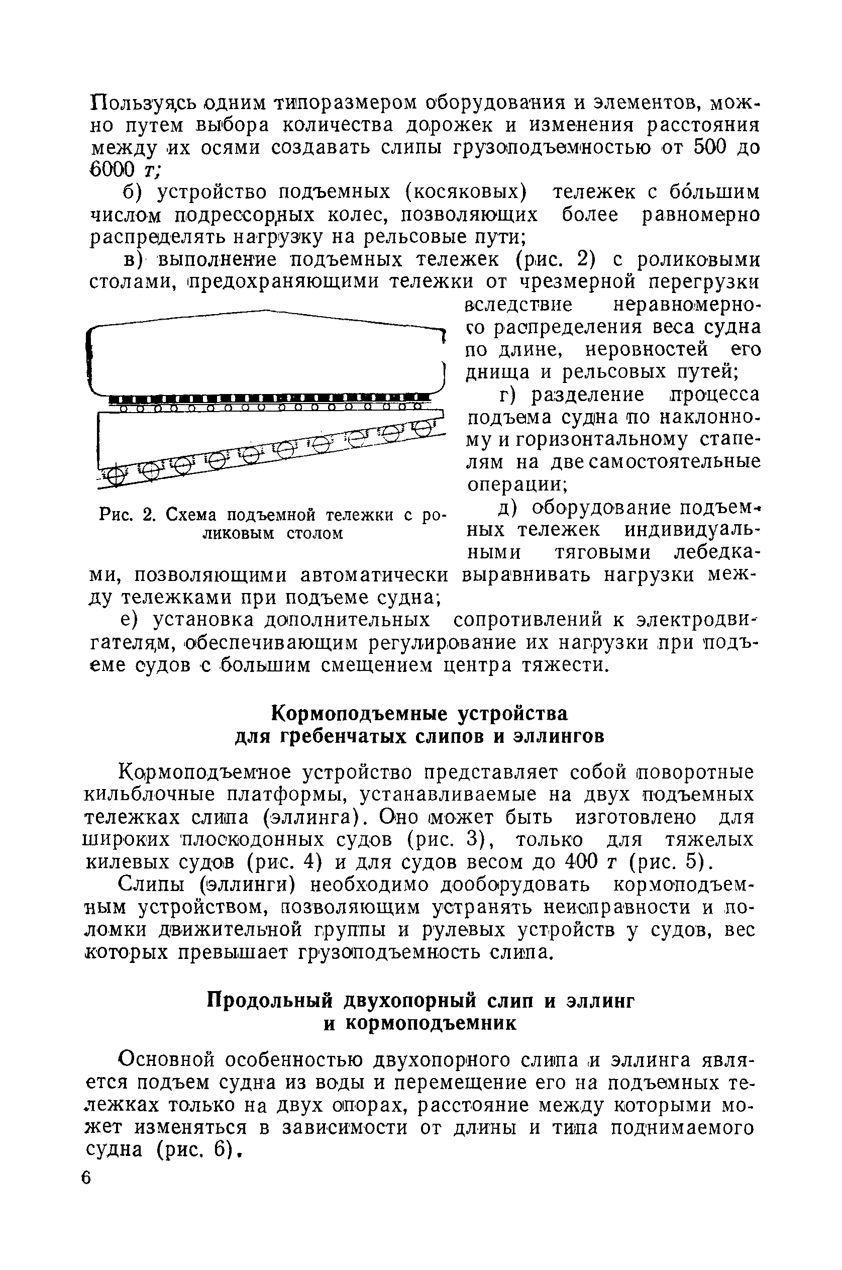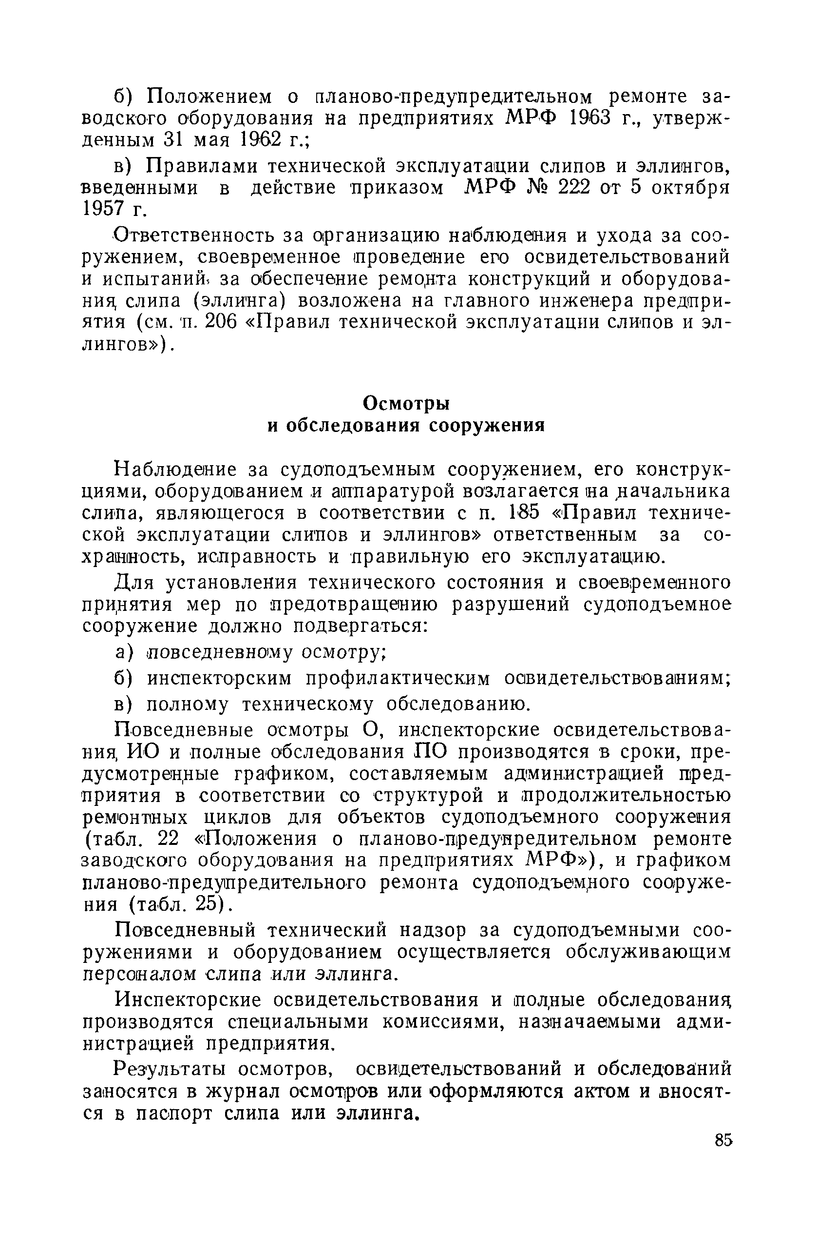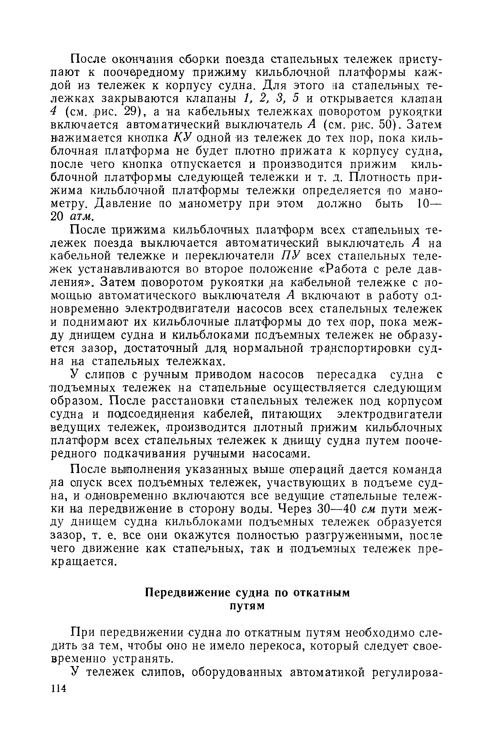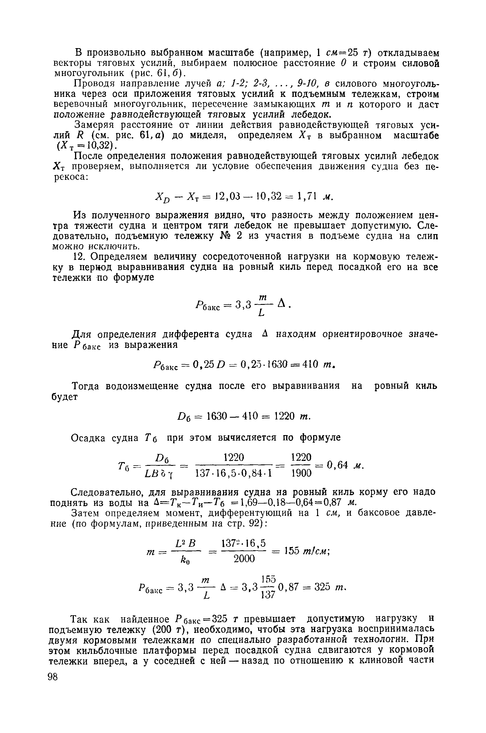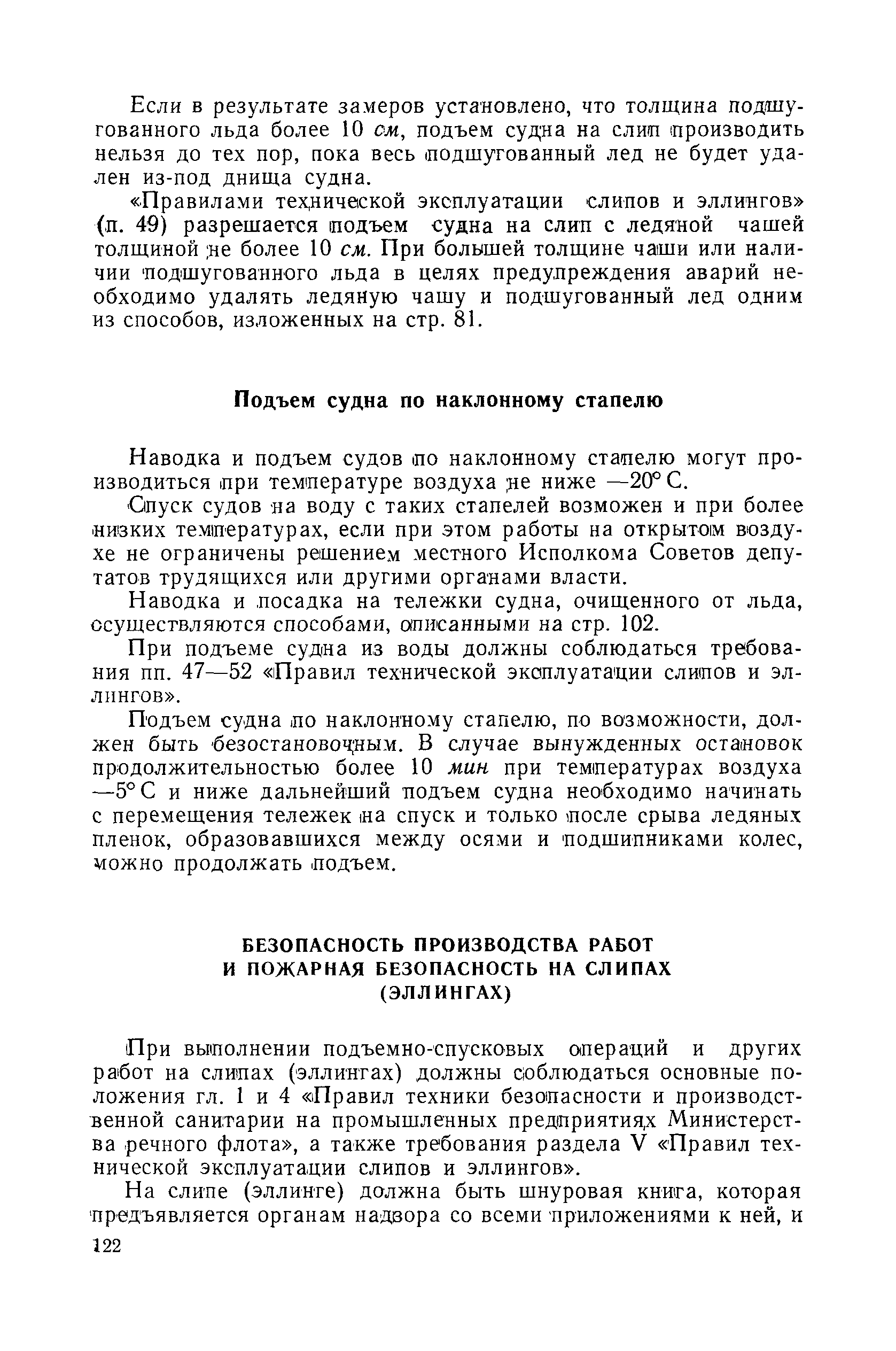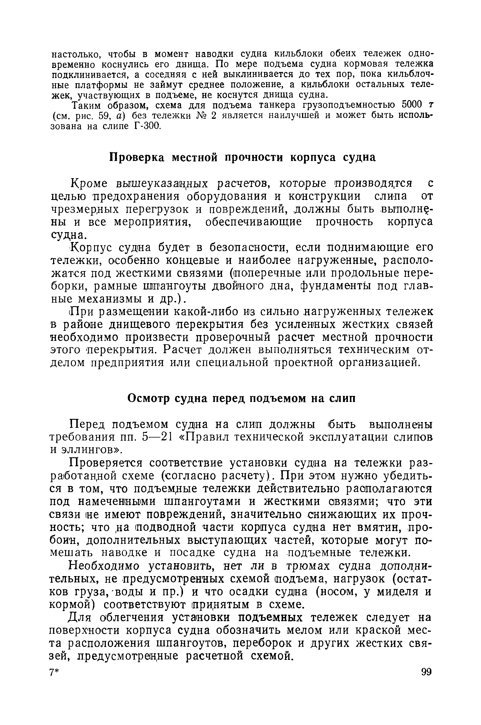 | Оглавление: | Введение 1. Особенности устройства и обслуживания слипов и эллингов Принципы устройства и работы типовых слипов и эллингов Гребенчатый слип и эллинг Кормоподъемные устройства для гребенчатых слипов и эллингов Продольный двухопорный слип, эллинг и кормоподъемник Подъемные тележки Типы подъемных тележек и их основные характеристики Подъемные тележки гребенчатых слипов Подъемные тележки эллинга типа "Убигау" Подъемные тележки продольных двухопорных слипов (эллингов) и судонатасок Подъемные лебедки Типы подъемных лебедок и их основные характеристики Устройство для автоматического выключения лебедки при остановке подъемной тележки на спуске Защита лебедок от перегрузок Устройство для контроля величины перекоса поезда подъемных тележек с судном Стапельные тележки Типы стапельных тележек и их основные характеристики Особенности работы гидравлической системы стапельных тележек Подвеска питающих кабелей Устройство для переключения шестерен привода стапельной тележки Способы ликвидации отставаний стапельных тележек при разгрузке Уход за механическим оборудованием судоподъемных сооружений Общие требования по уходу Уход за тяговыми канатами Уход за зубчатыми передачами и редукторами при их эксплуатации и монтаже Уход за рамами механизмов Уход за соединительными и фрикционными муфтами Уход за канатными блоками Уход за тормозами Уход за валами, осями и подшипниками Электрооборудование Назначение электропривода подъемных лебедок гребенчатых слипов Порядок включения электропривода подъемных лебедок поставки 1949-1951 гг. Схема контроля перекосов и пути, пройденного подъемными тележками поставки 1949-1951 гг. Особенности схемы электропривода подъемных лебедок поставки 1952 г Особенности схемы контроля перекосов и пути, пройденного подъемными тележками поставки 1952 г Особенности схемы электропривода подъемных тележек поставки 1953 г Особенности схемы контроля перекосов подъемных тележек поставки 1953 г Замена импортного электрооборудования слипов отечественным Особенности схемы электрооборудования гребенчатых слипов Г-150 и Г-300 (по типовому проекту 1963 г.) Электропривод одномоторных слипов и эллингов Электропривод продольного слипа П-600 Электропривод судонатаски грузоподъемностью 60 т Электропривод наводочного шпиля (тяговое усилие 3 т) Электрооборудование стапельных тележек Судовозные пути Общие требования Уход за подводными путями Уход за надводными путями Уход за пересечками стапельных путей Уход за твердыми покрытиями на стапелях слипов Обслуживание слипов и эллингов при работе в условиях отрицательных температур воздуха Организация планово-предупредительных осмотров и ремонтов Общие положения Осмотры и обследования сооружения Планирование и организация ремонта Прием сооружения после ремонта II. Производство подъемно-спусковых работ Подготовка судна к подъему Разработка схемы подъема судна и расчет нагрузок Расчет нагрузок от кормового (баксового) давления Пример расчетов установки судна на подъемные тележки слипа Проверка местной прочности корпусов судна Осмотр судна перед подъемом на слип Подготовка судоподъемного сооружения к работе Подготовка судоподъемного оборудования Подготовка судовозных путей Подъем судна из воды Общие указания Наводка и посадка судна на подъемные 